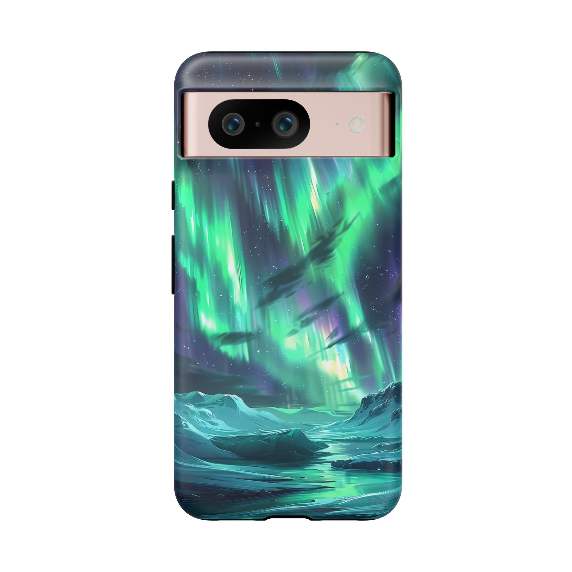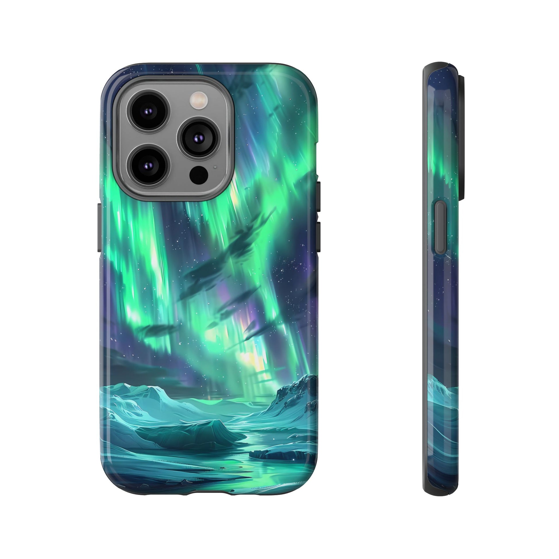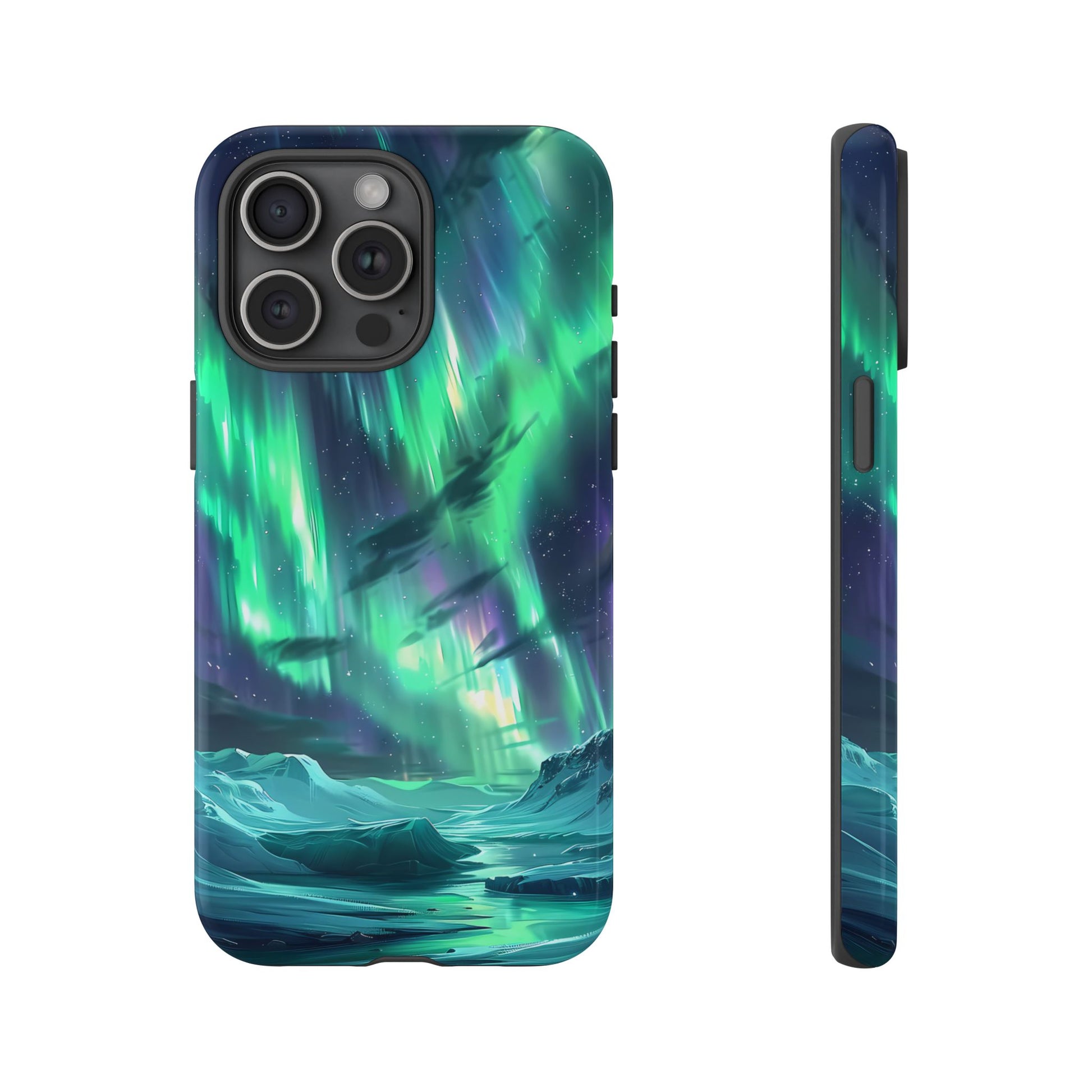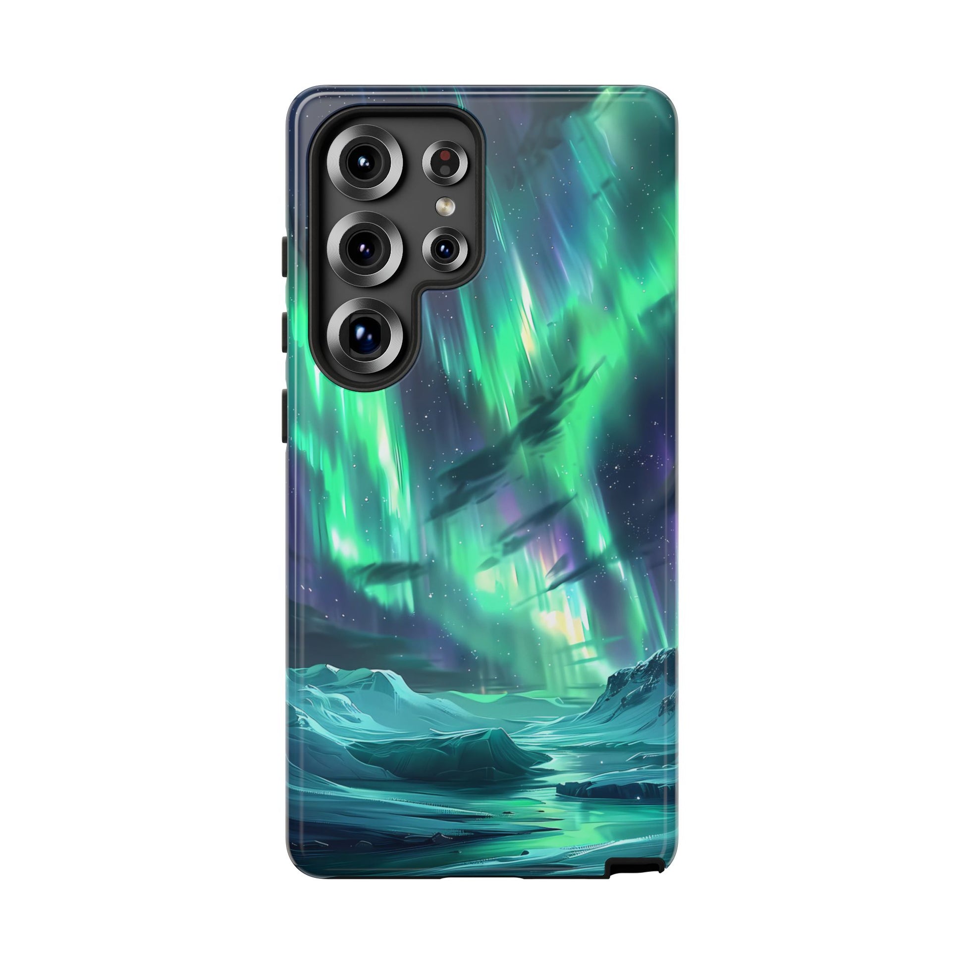 Delight in the wonder of the Northern Lights with this enchanting cell phone cover. Featuring a snowy Icelandic landscape bathed in the vibrant hues of the aurora, this design combines glowing greens and purples for a truly mesmerizing visual experience.