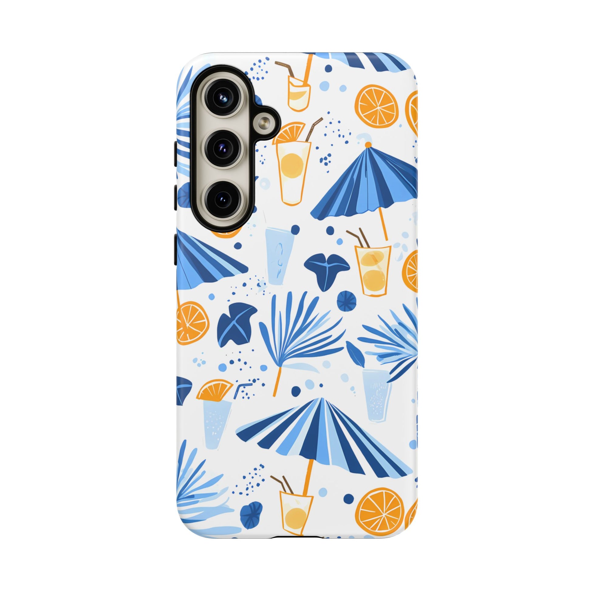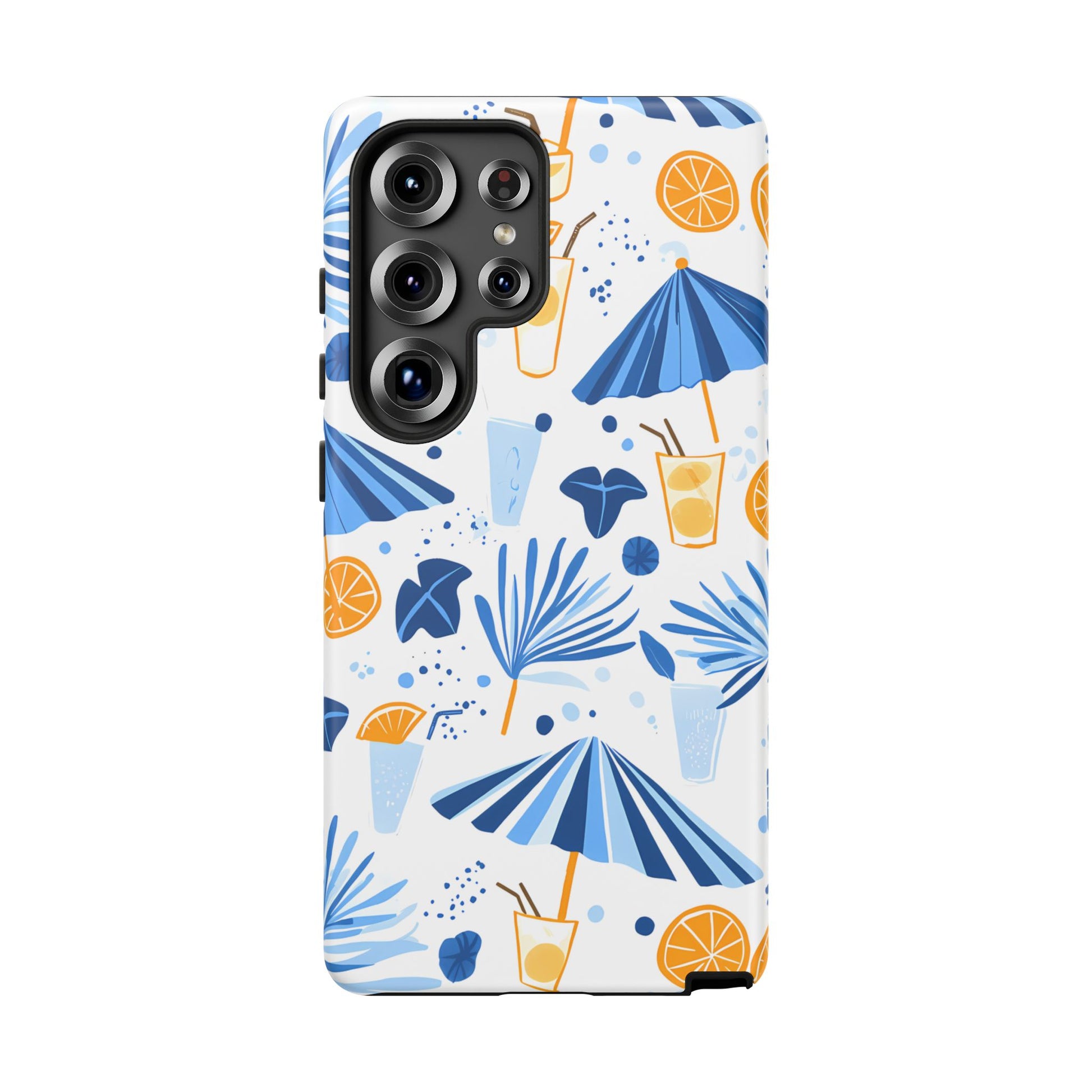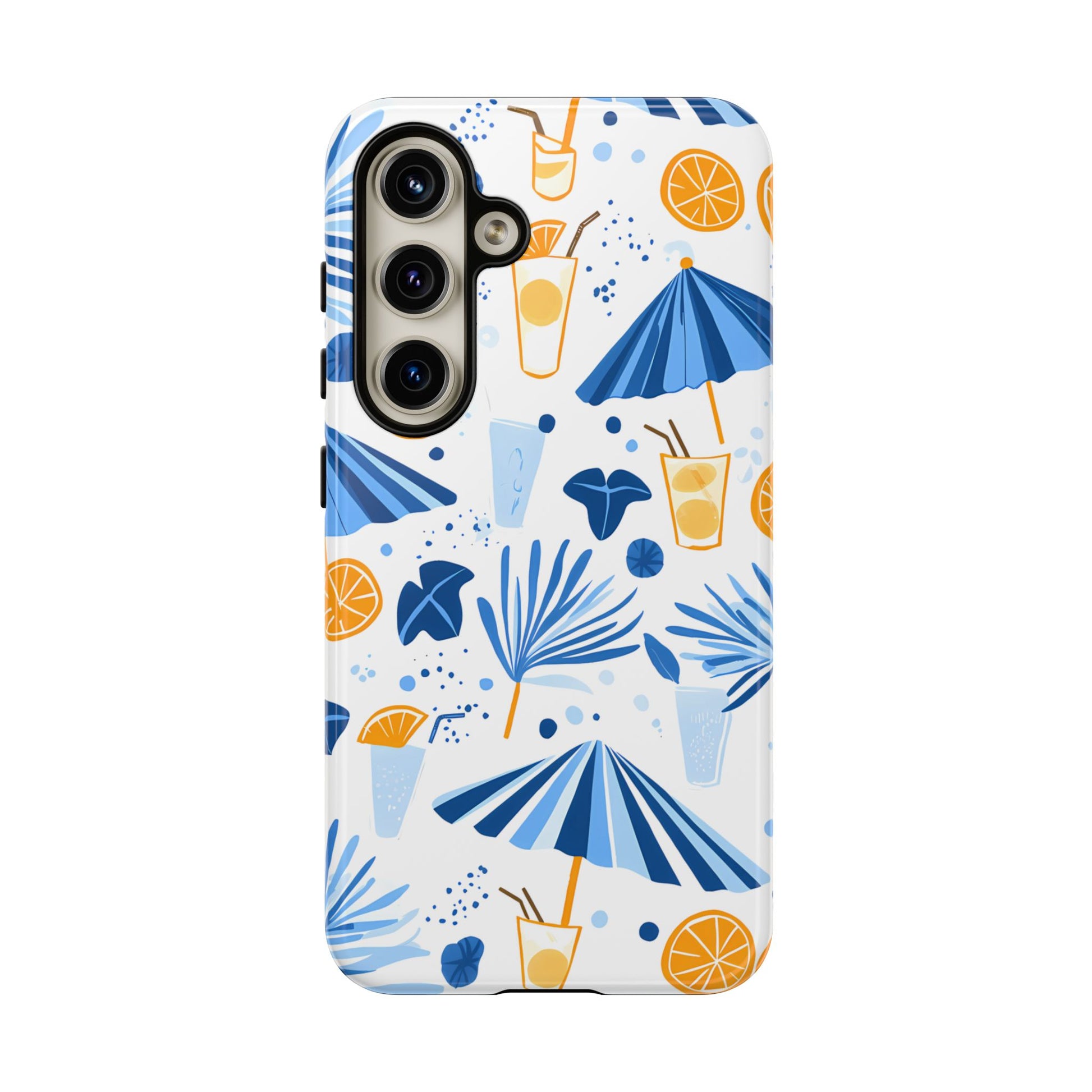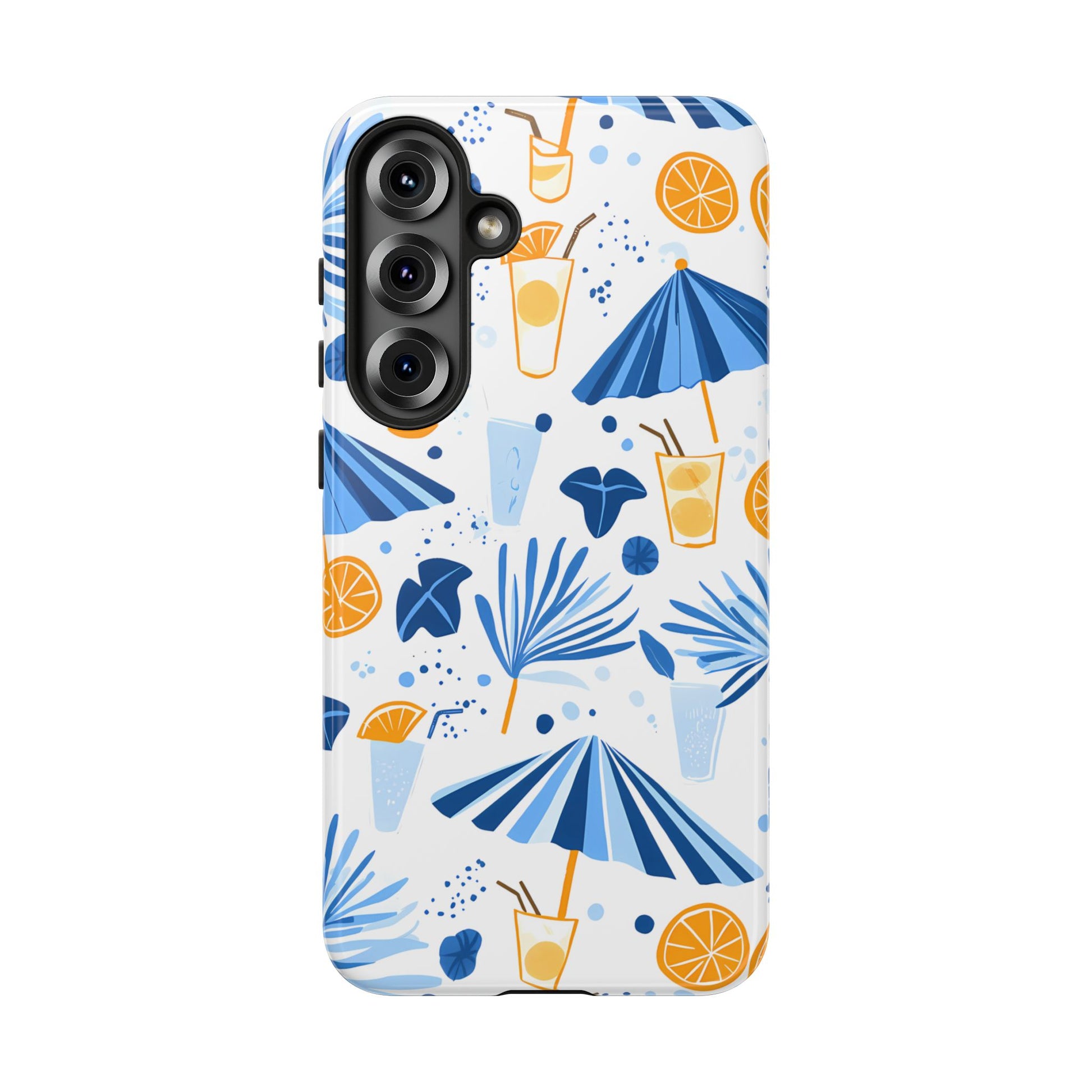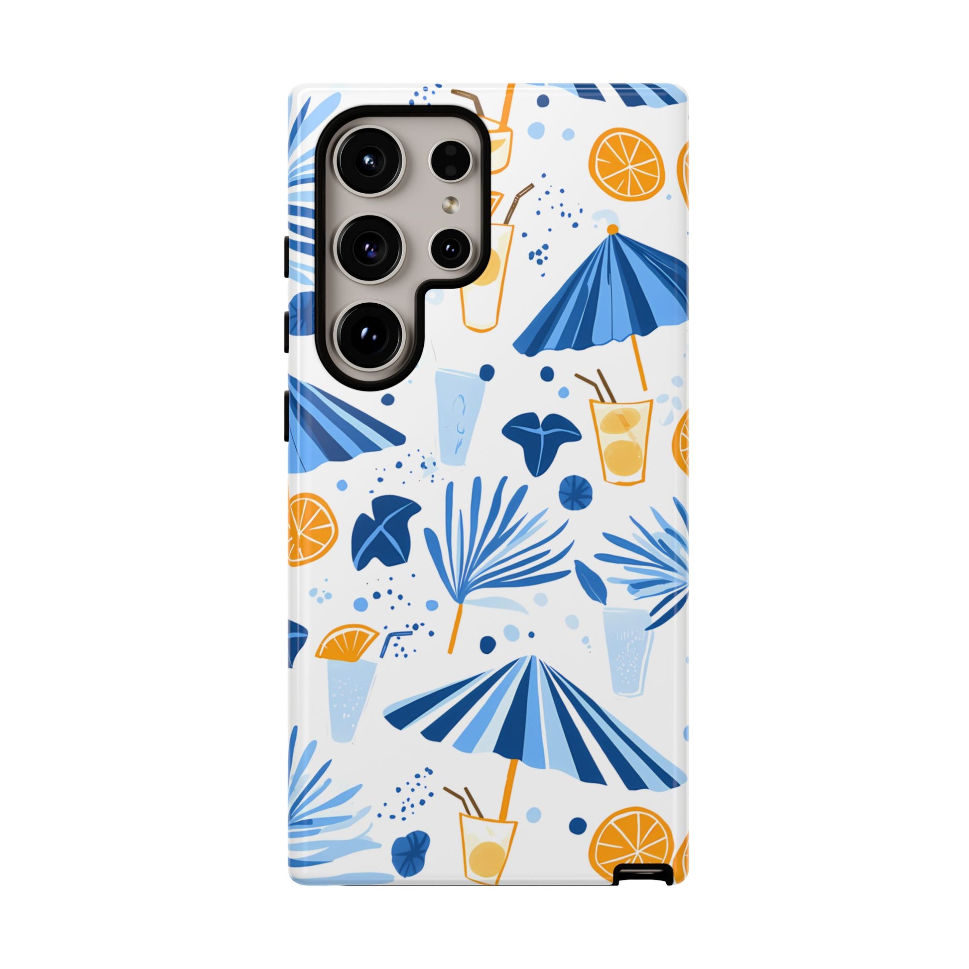 A light and cheerful seamless pattern featuring cute cartoon-style blue-and-white beach umbrellas, tiny cocktail glasses, and playful summer shapes on a crisp white background. Minimalistic and breezy, it captures a fresh Greek-island vibe in clean blue tones
