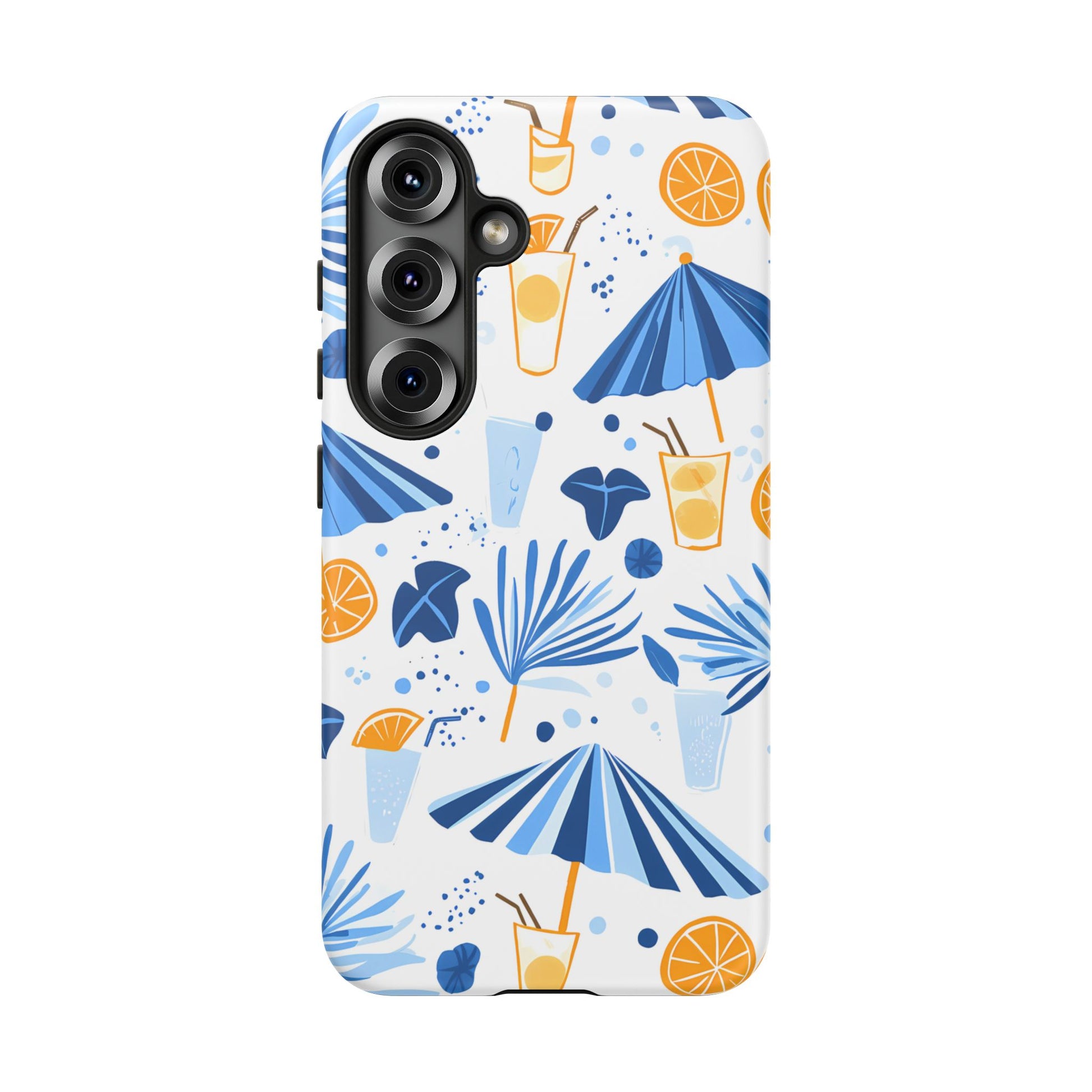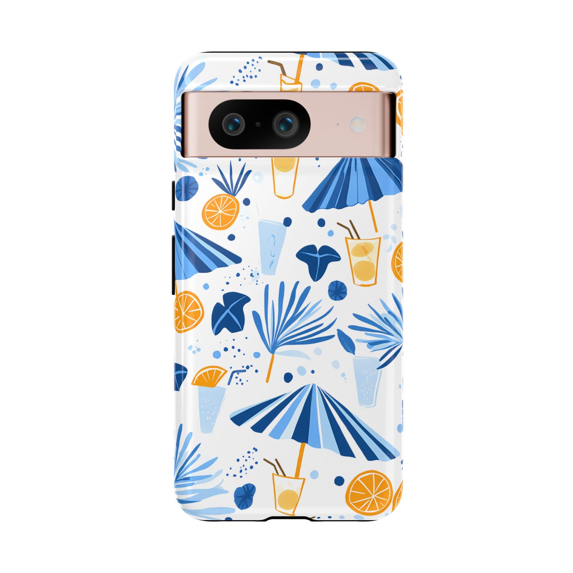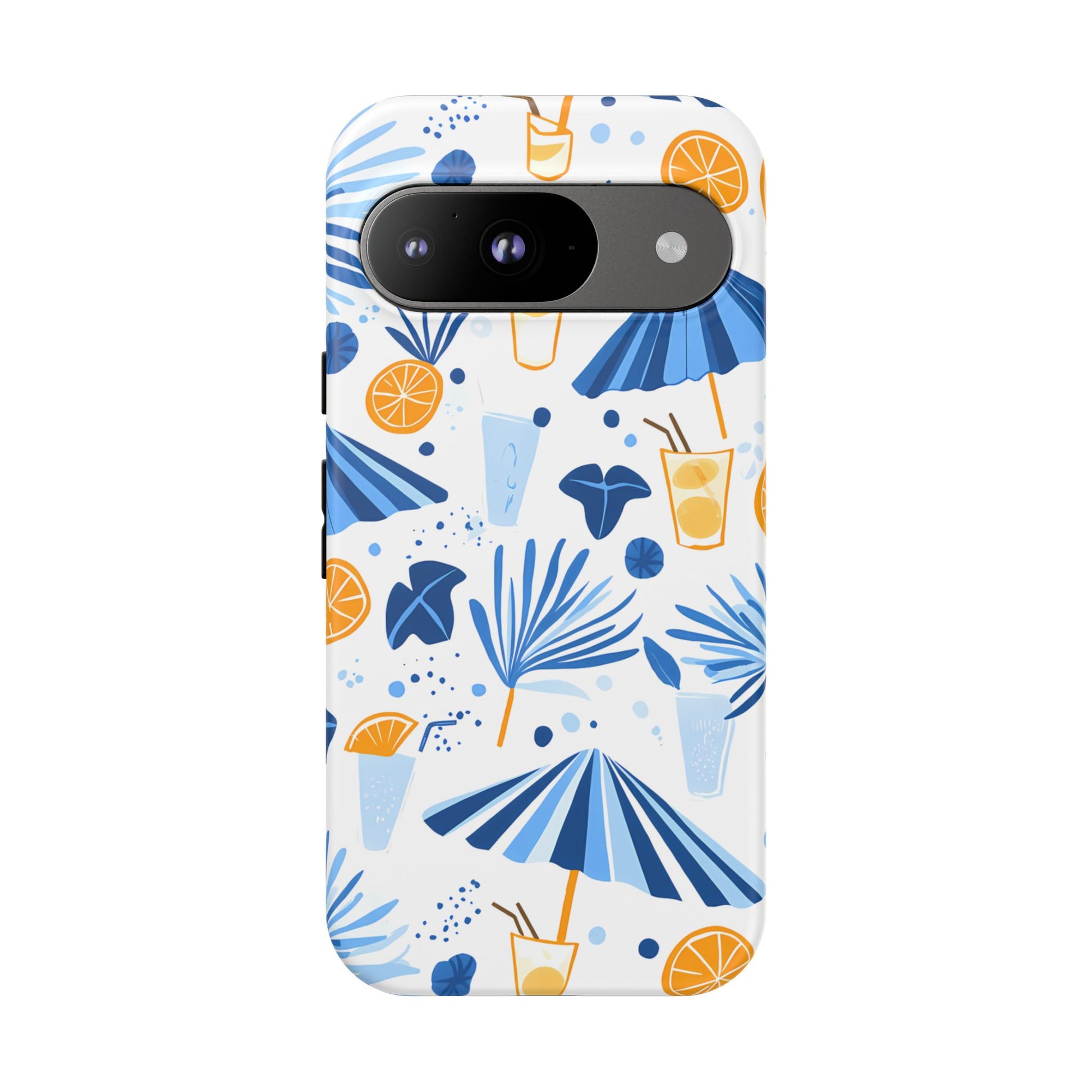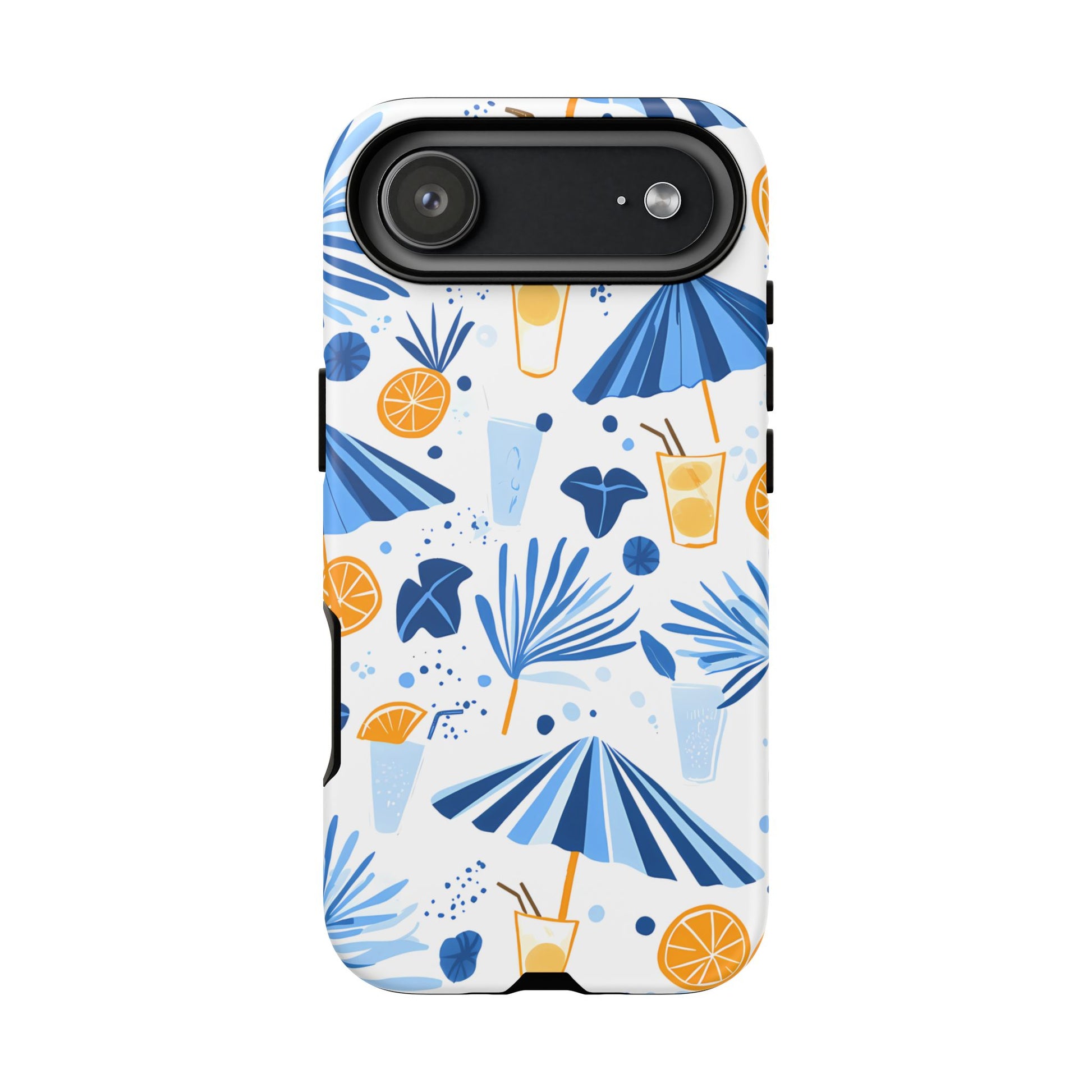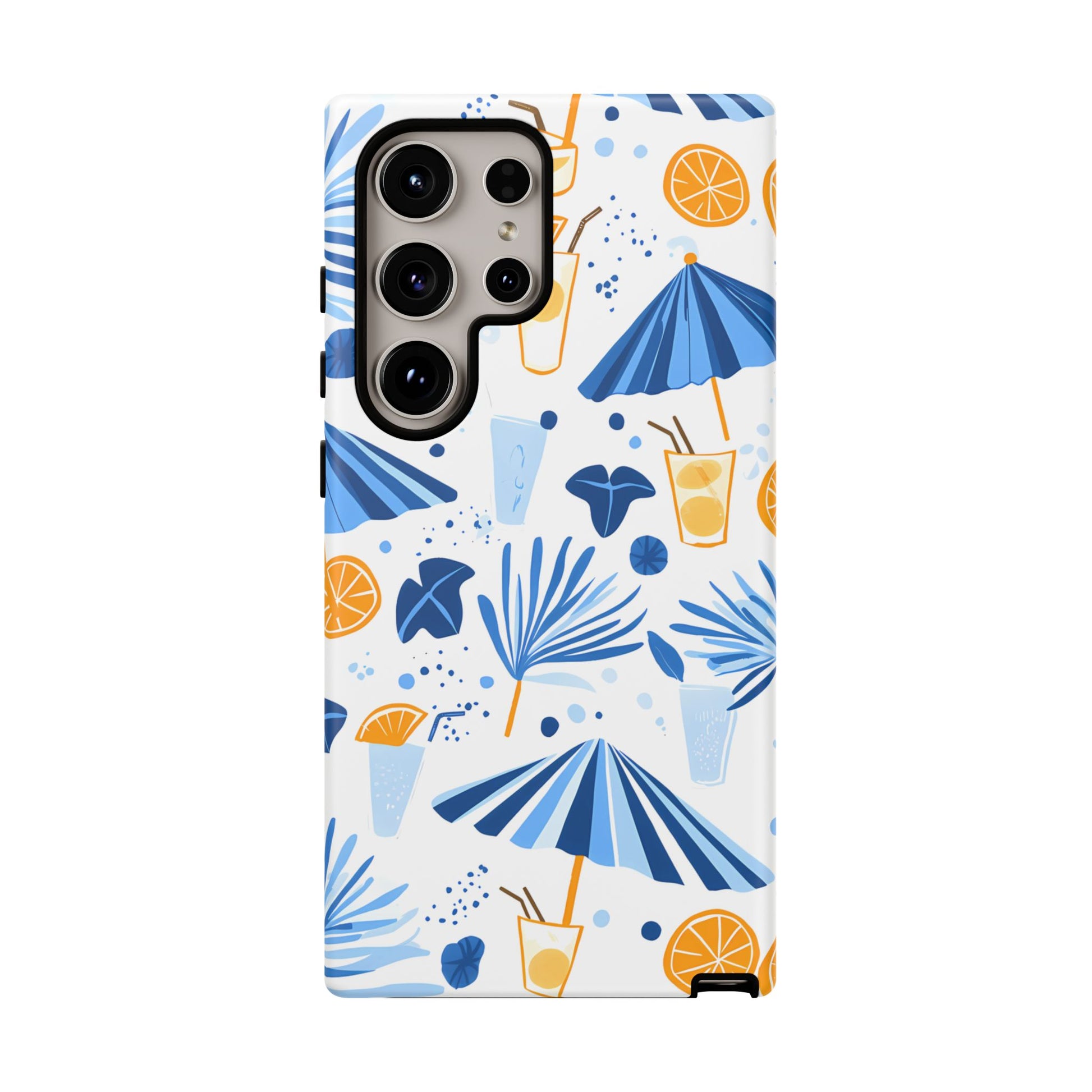 A light and cheerful seamless pattern featuring cute cartoon-style blue-and-white beach umbrellas, tiny cocktail glasses, and playful summer shapes on a crisp white background. Minimalistic and breezy, it captures a fresh Greek-island vibe in clean blue tones