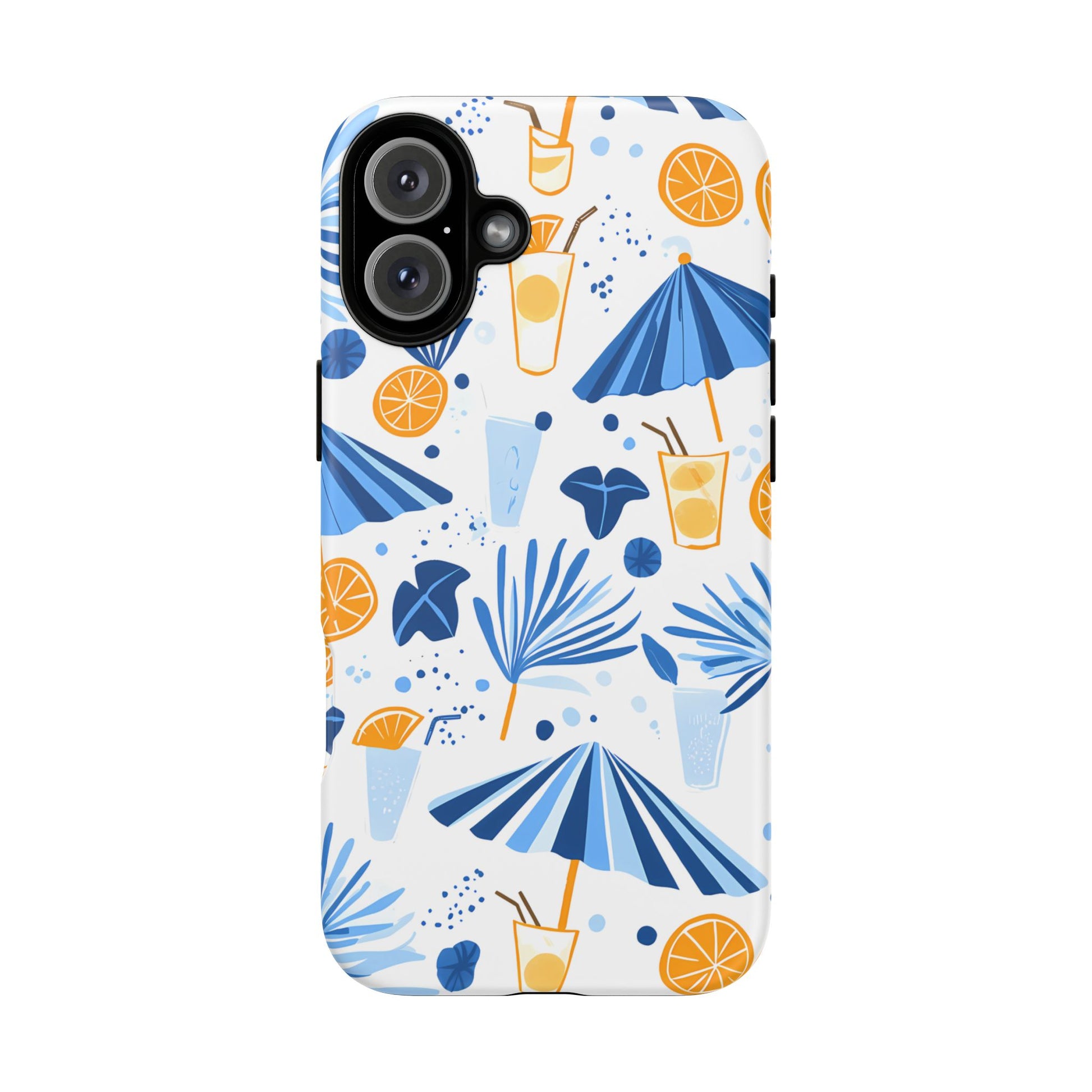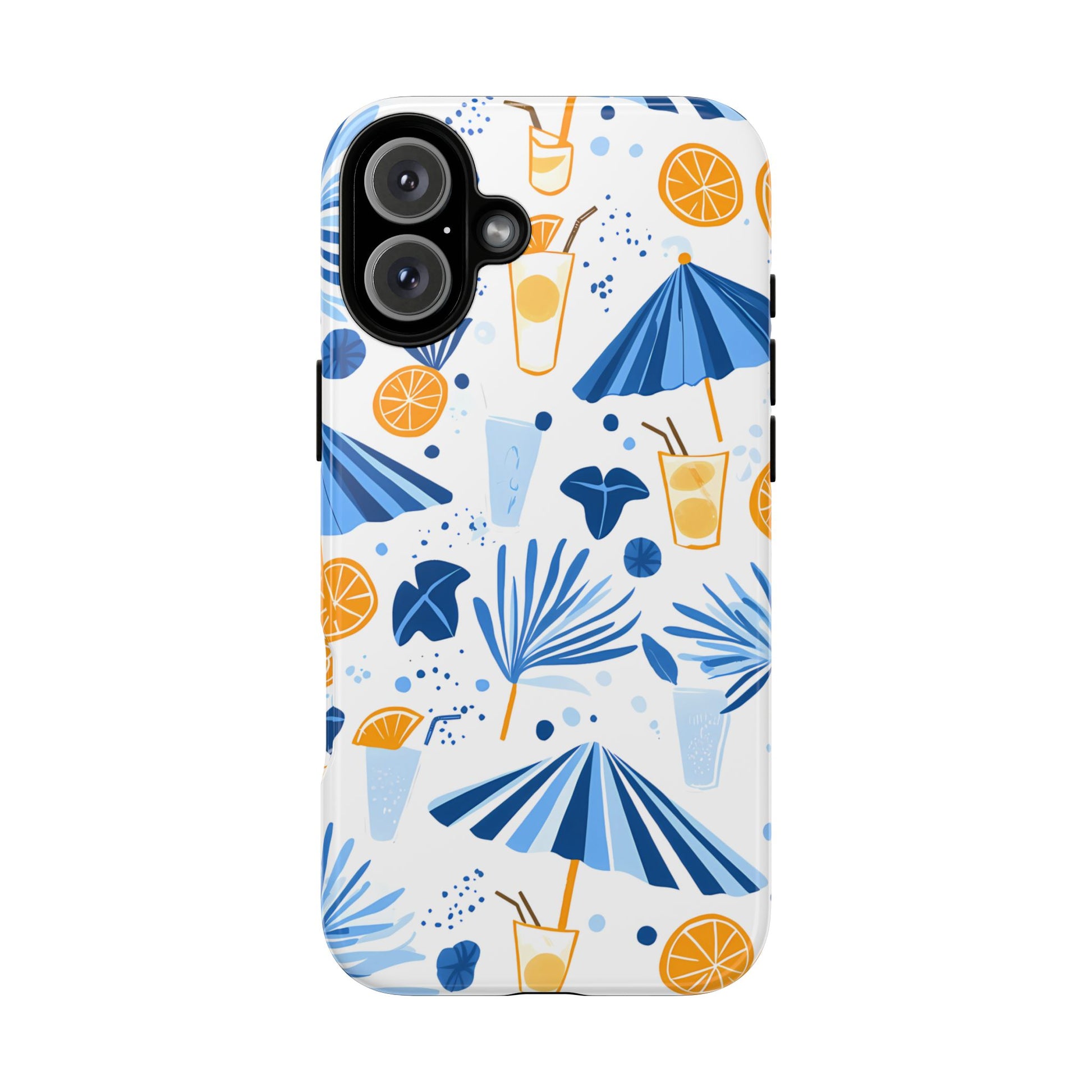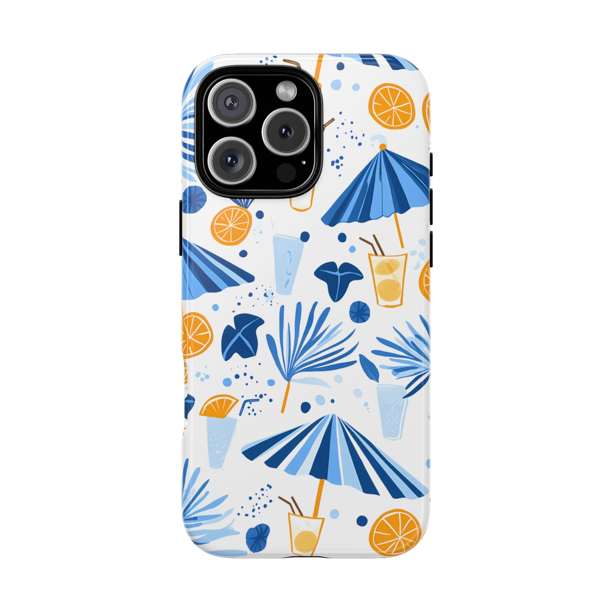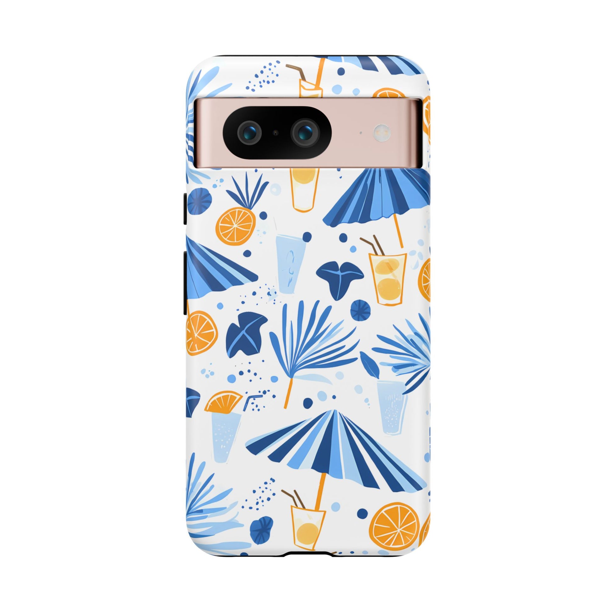 A light and cheerful seamless pattern featuring cute cartoon-style blue-and-white beach umbrellas, tiny cocktail glasses, and playful summer shapes on a crisp white background. Minimalistic and breezy, it captures a fresh Greek-island vibe in clean blue tones