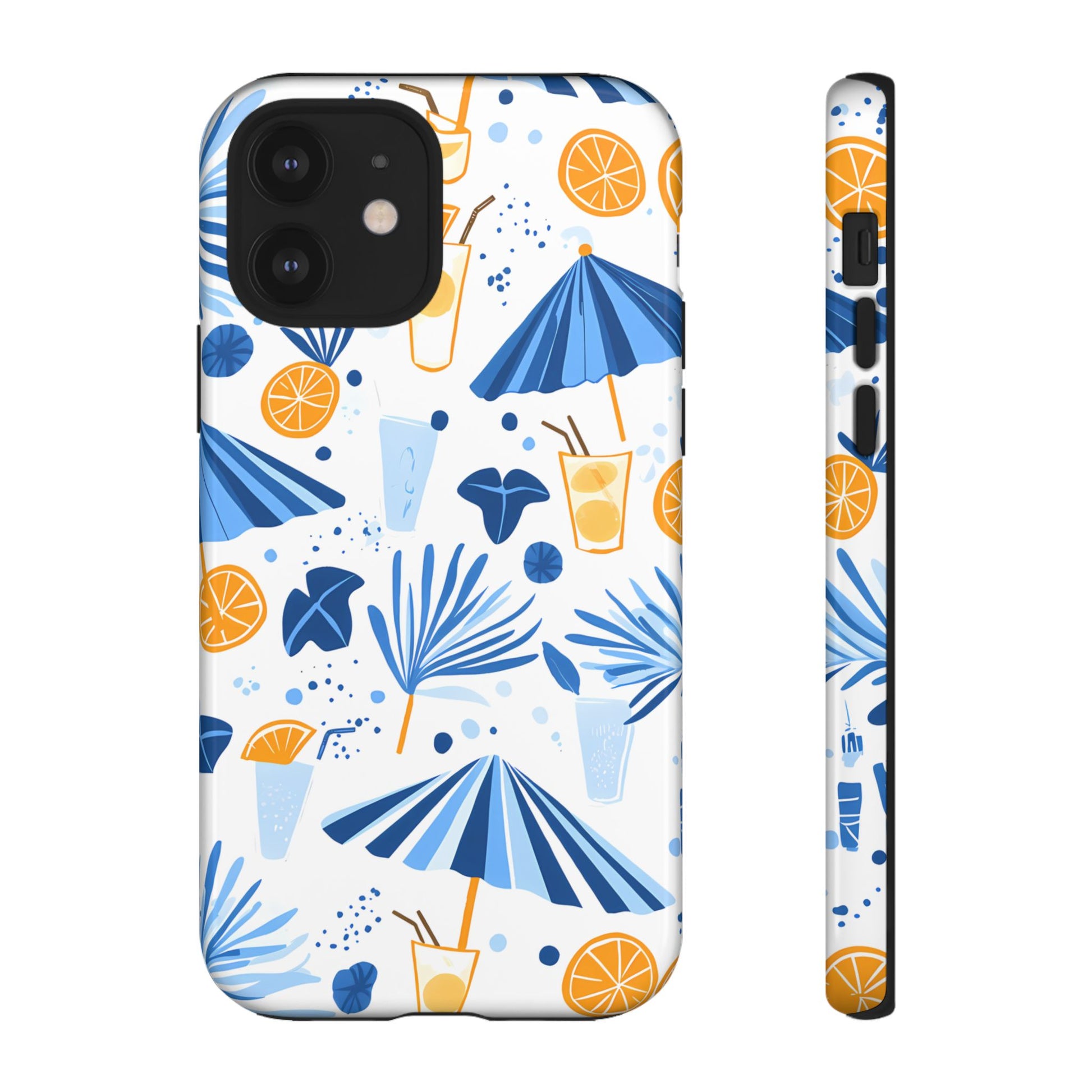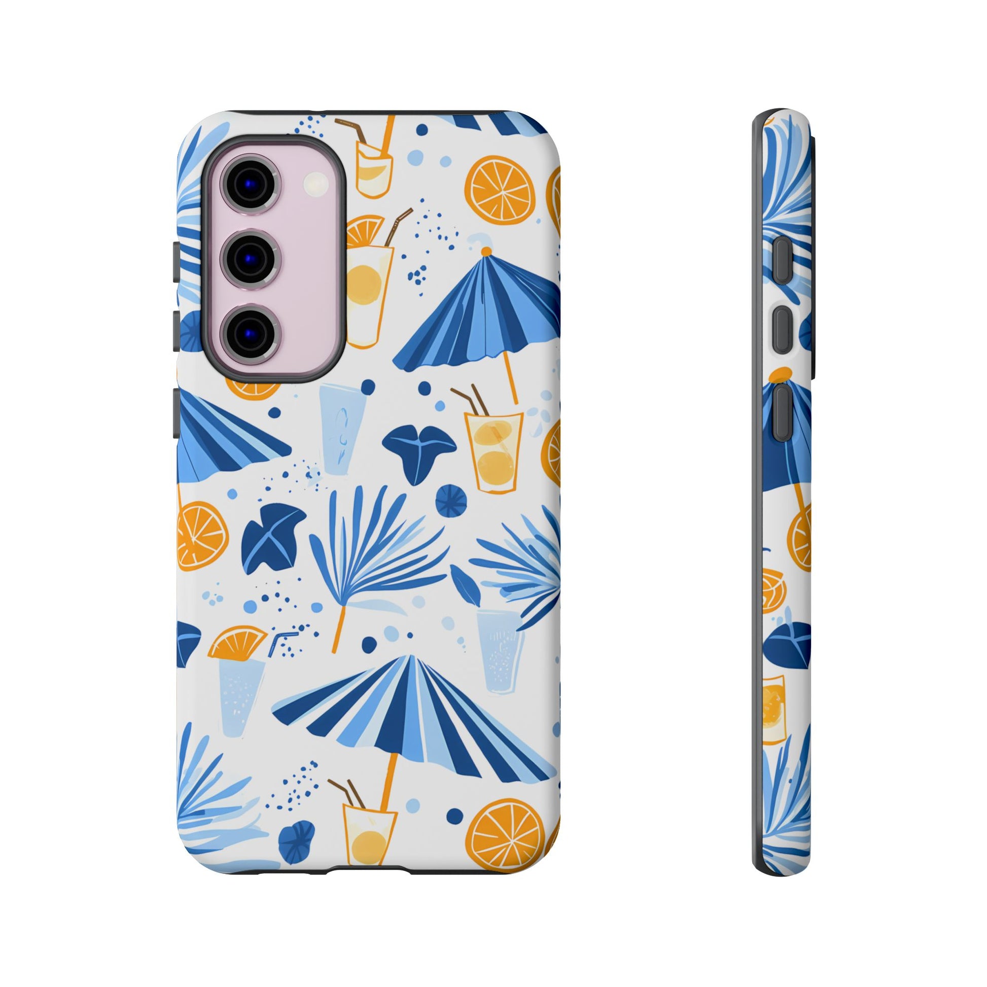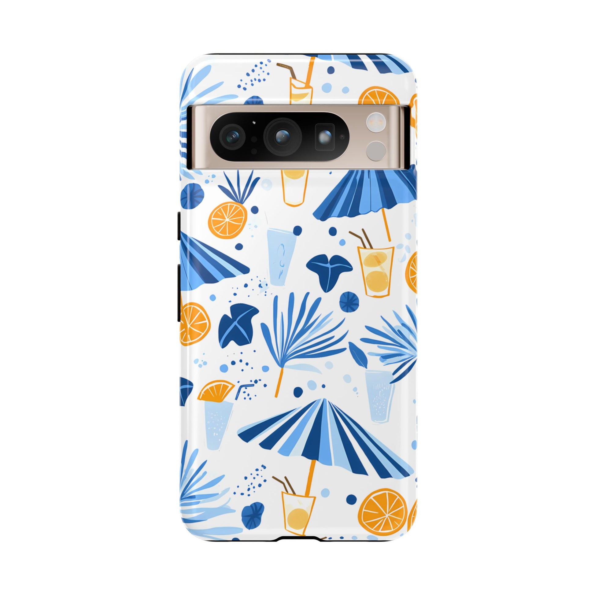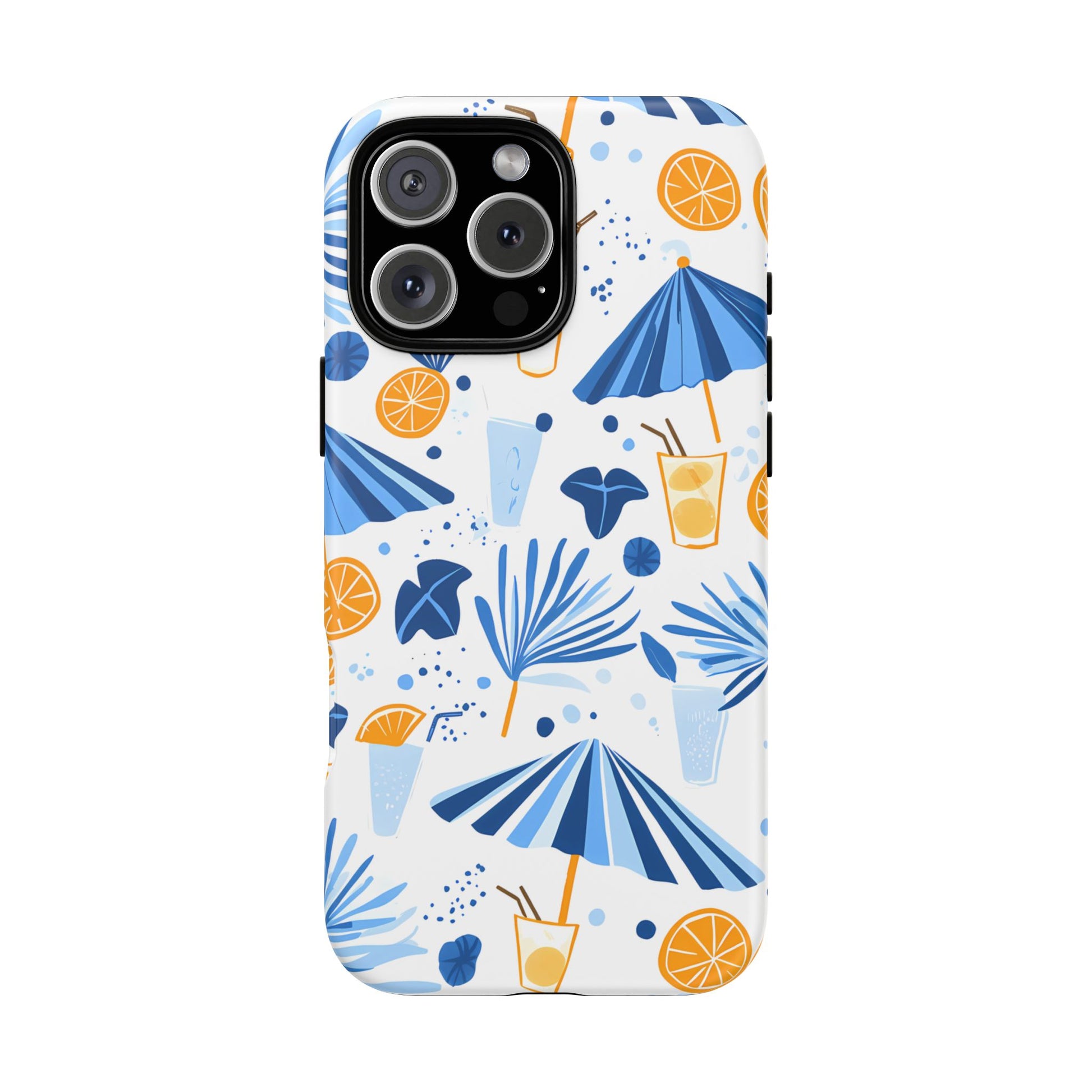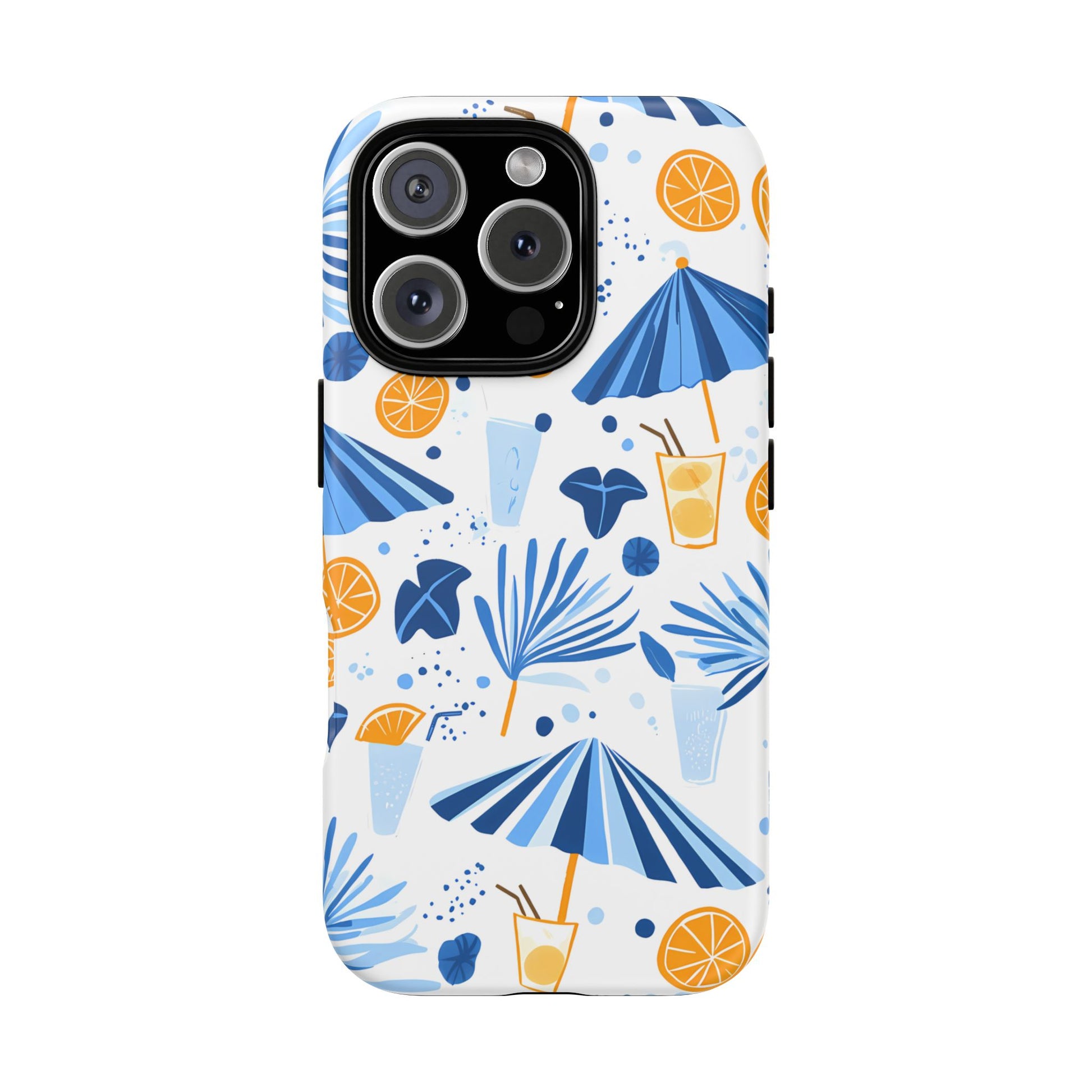 A light and cheerful seamless pattern featuring cute cartoon-style blue-and-white beach umbrellas, tiny cocktail glasses, and playful summer shapes on a crisp white background. Minimalistic and breezy, it captures a fresh Greek-island vibe in clean blue tones