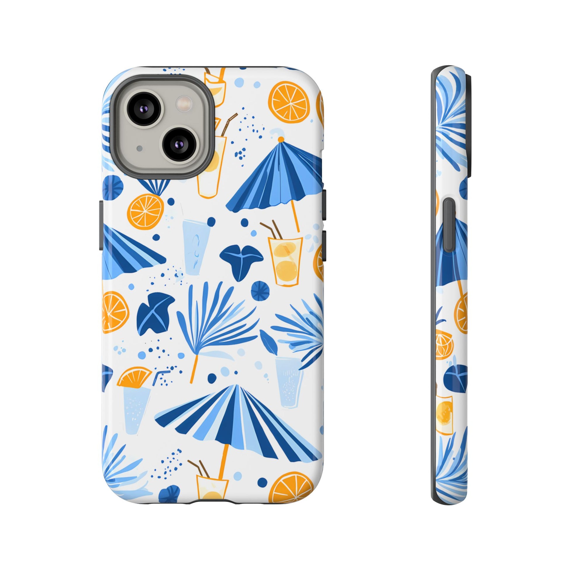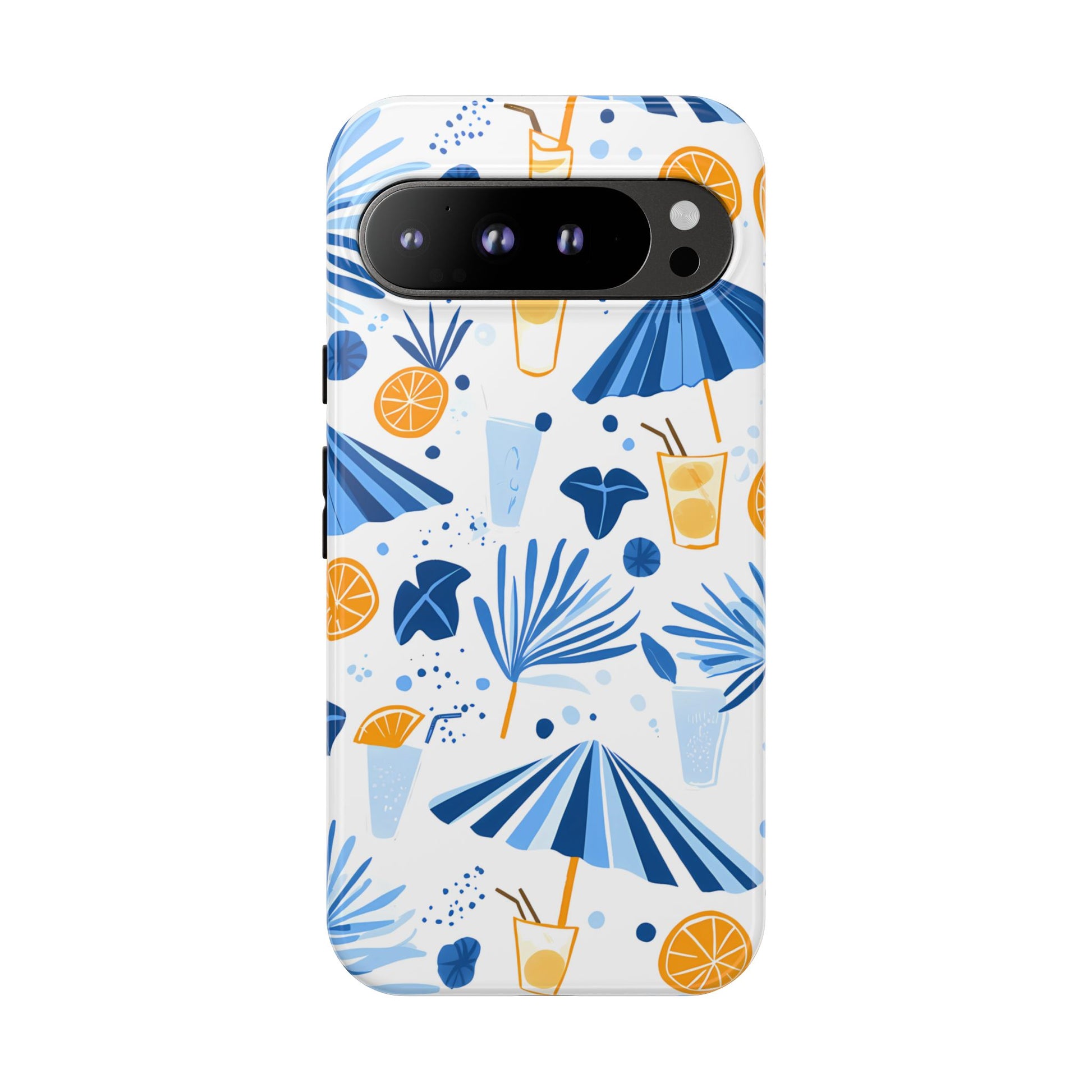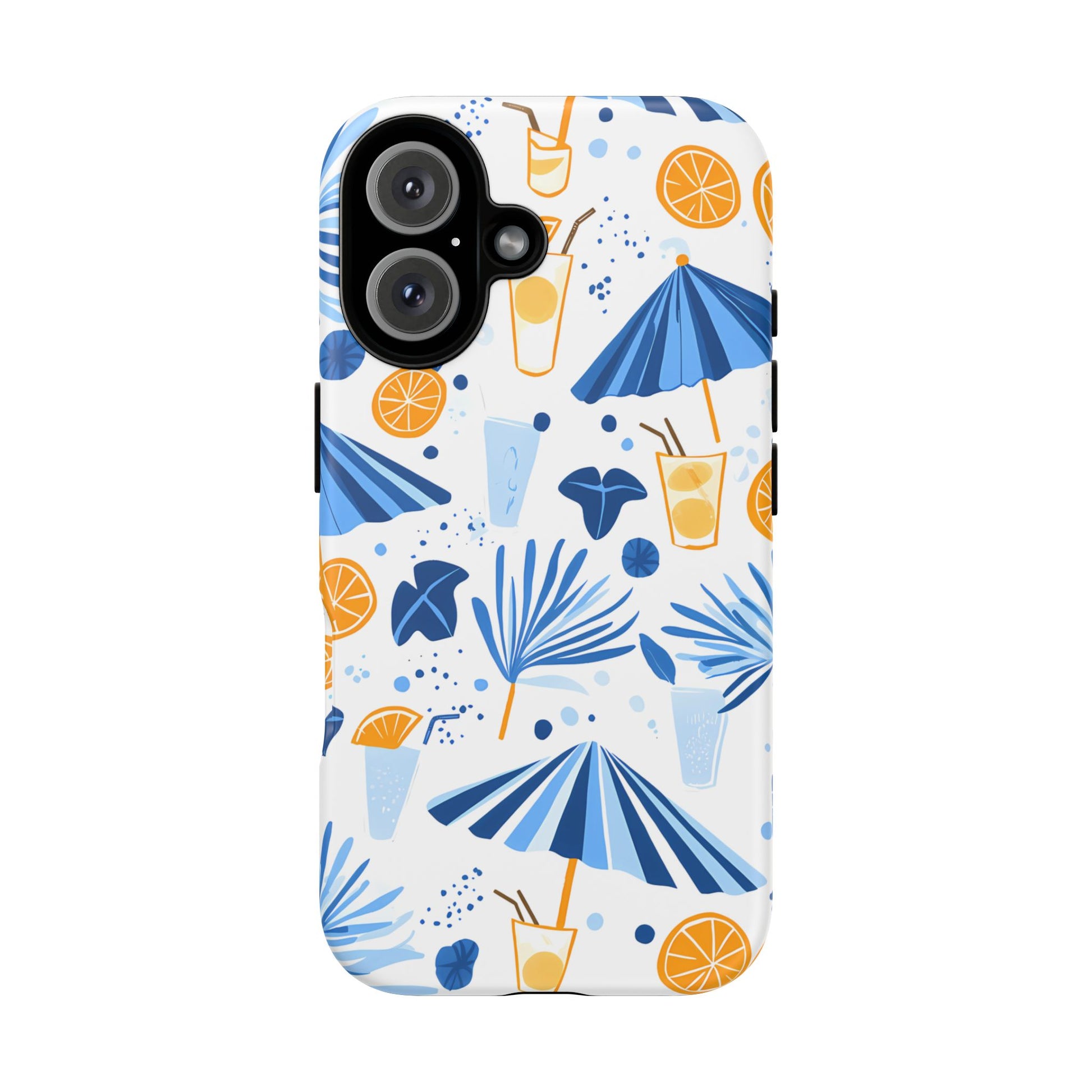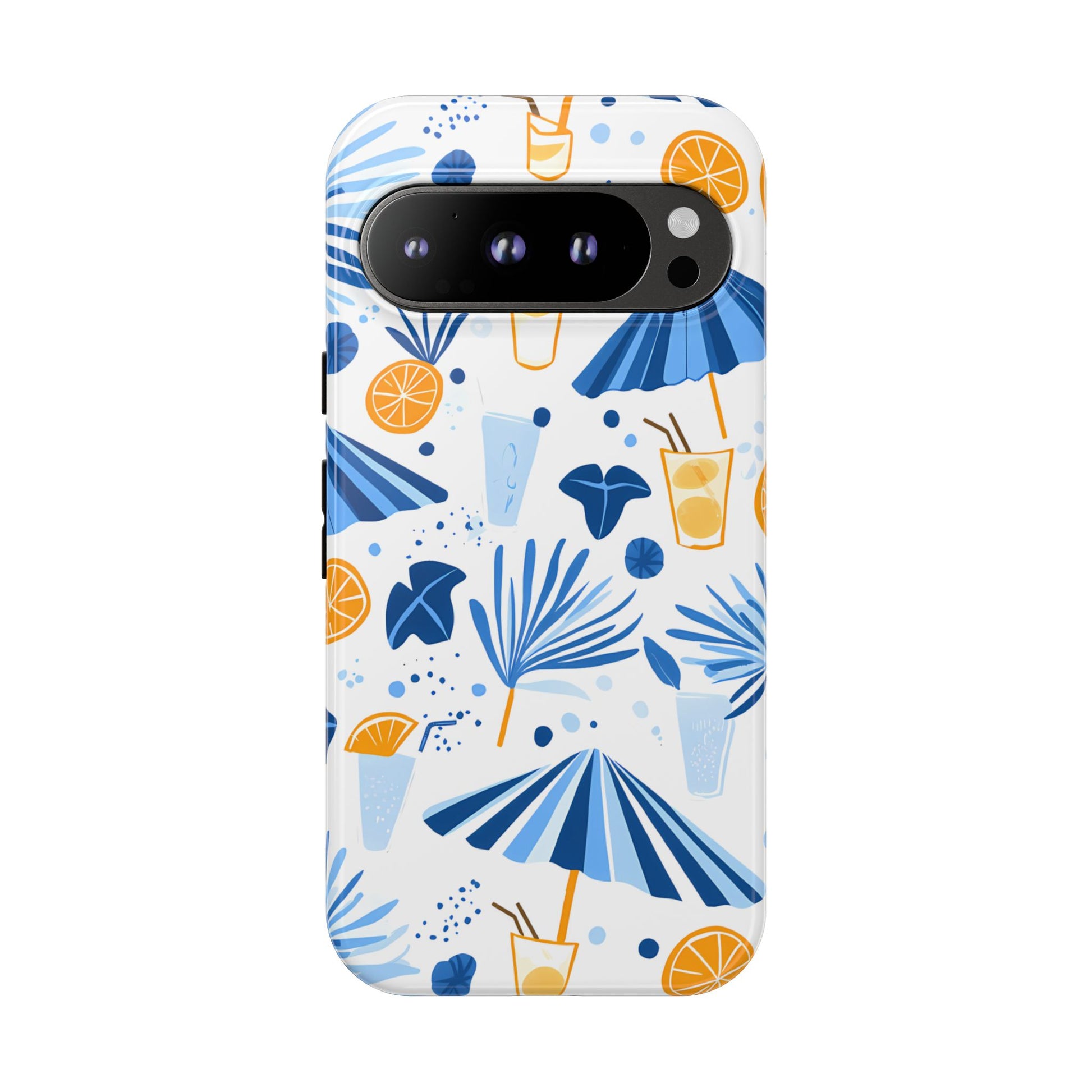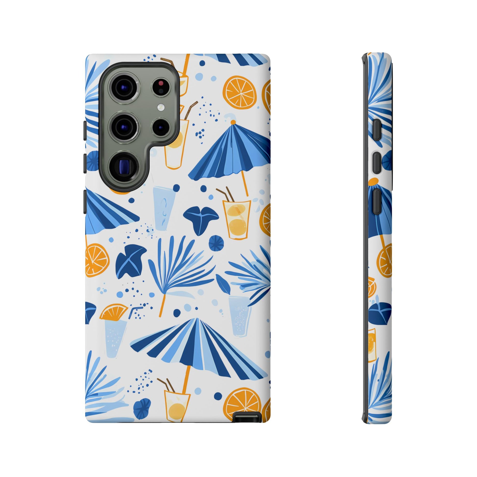 A light and cheerful seamless pattern featuring cute cartoon-style blue-and-white beach umbrellas, tiny cocktail glasses, and playful summer shapes on a crisp white background. Minimalistic and breezy, it captures a fresh Greek-island vibe in clean blue tones