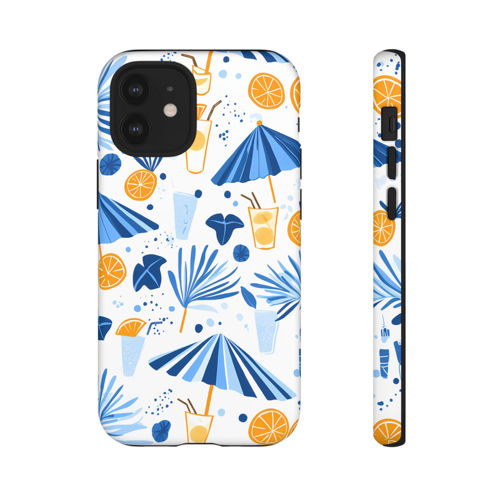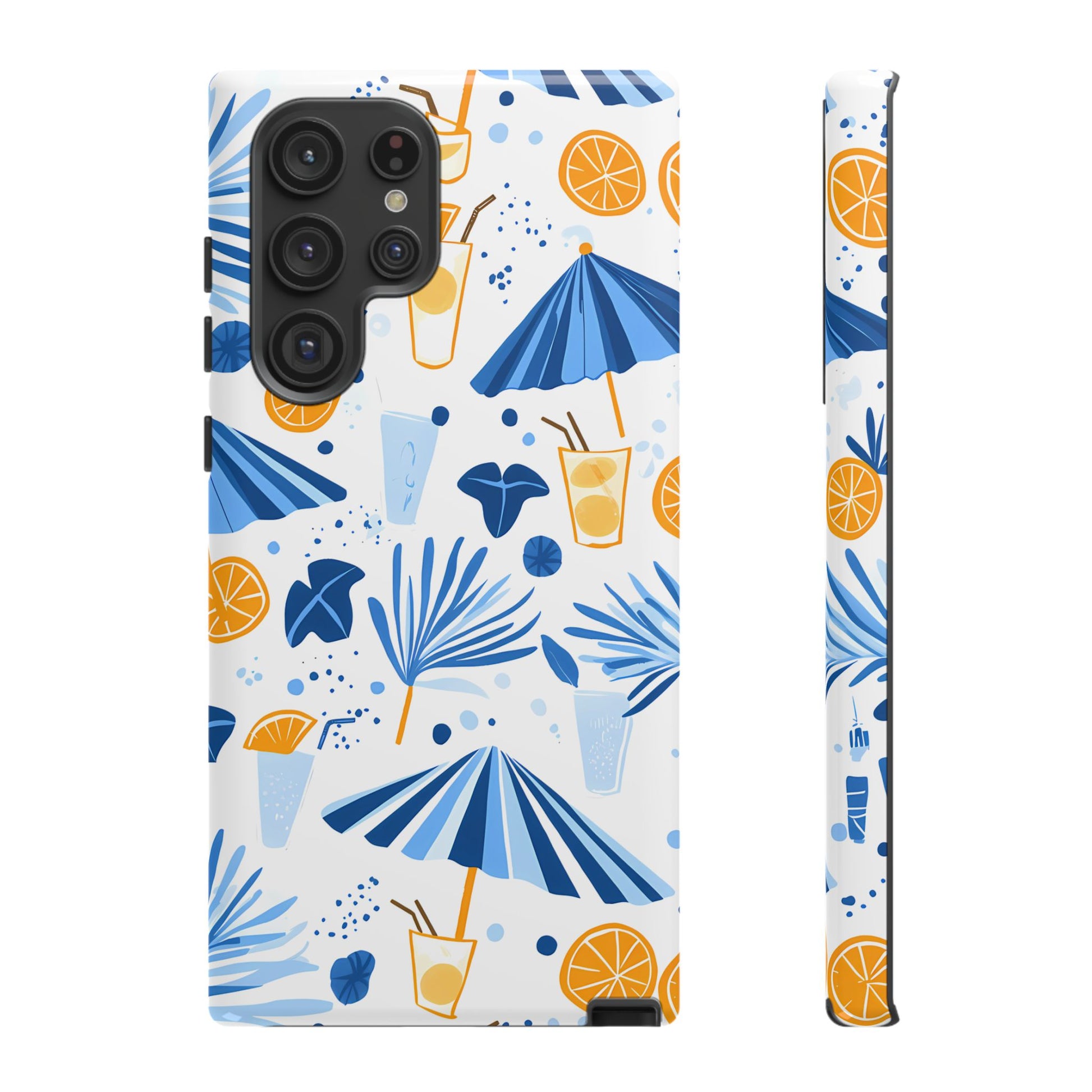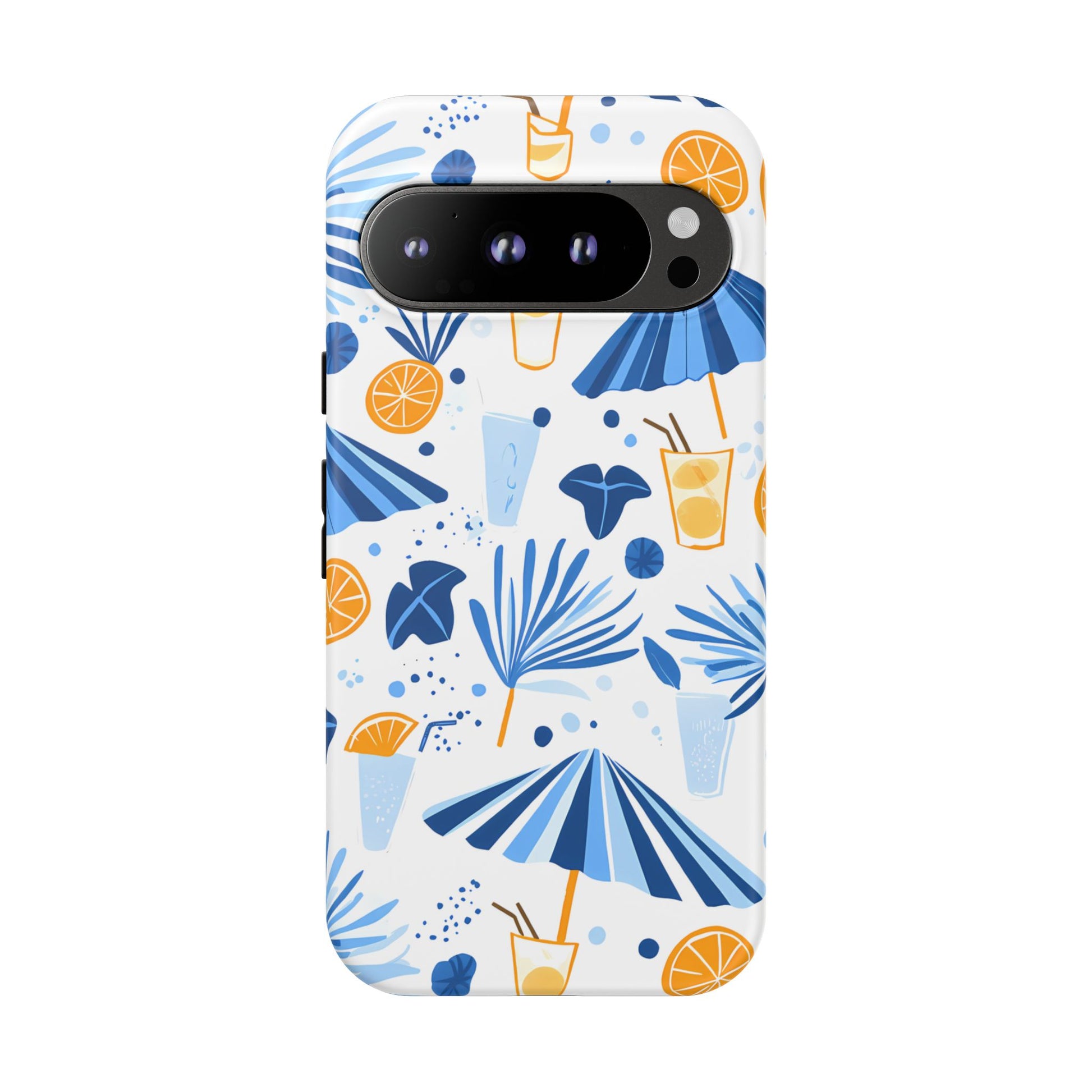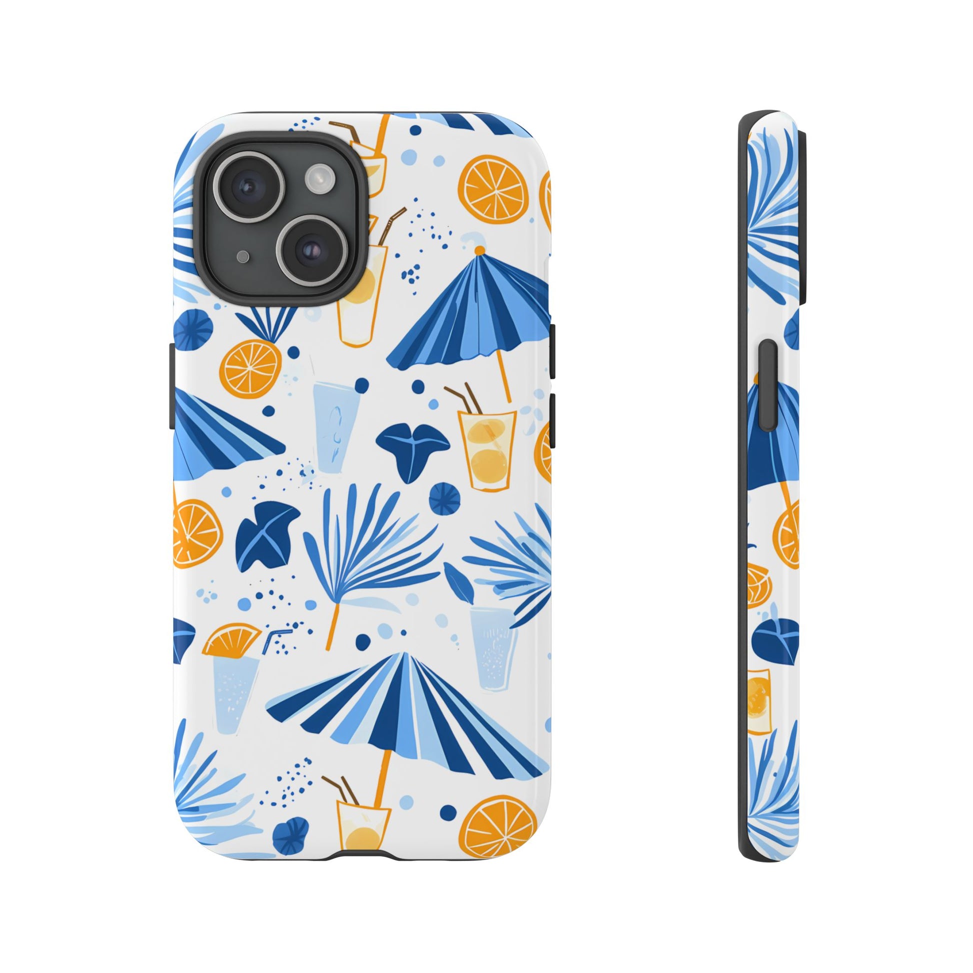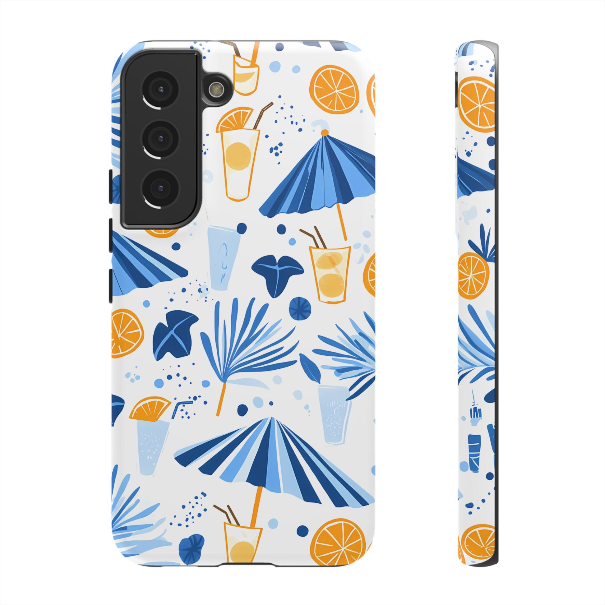 A light and cheerful seamless pattern featuring cute cartoon-style blue-and-white beach umbrellas, tiny cocktail glasses, and playful summer shapes on a crisp white background. Minimalistic and breezy, it captures a fresh Greek-island vibe in clean blue tones