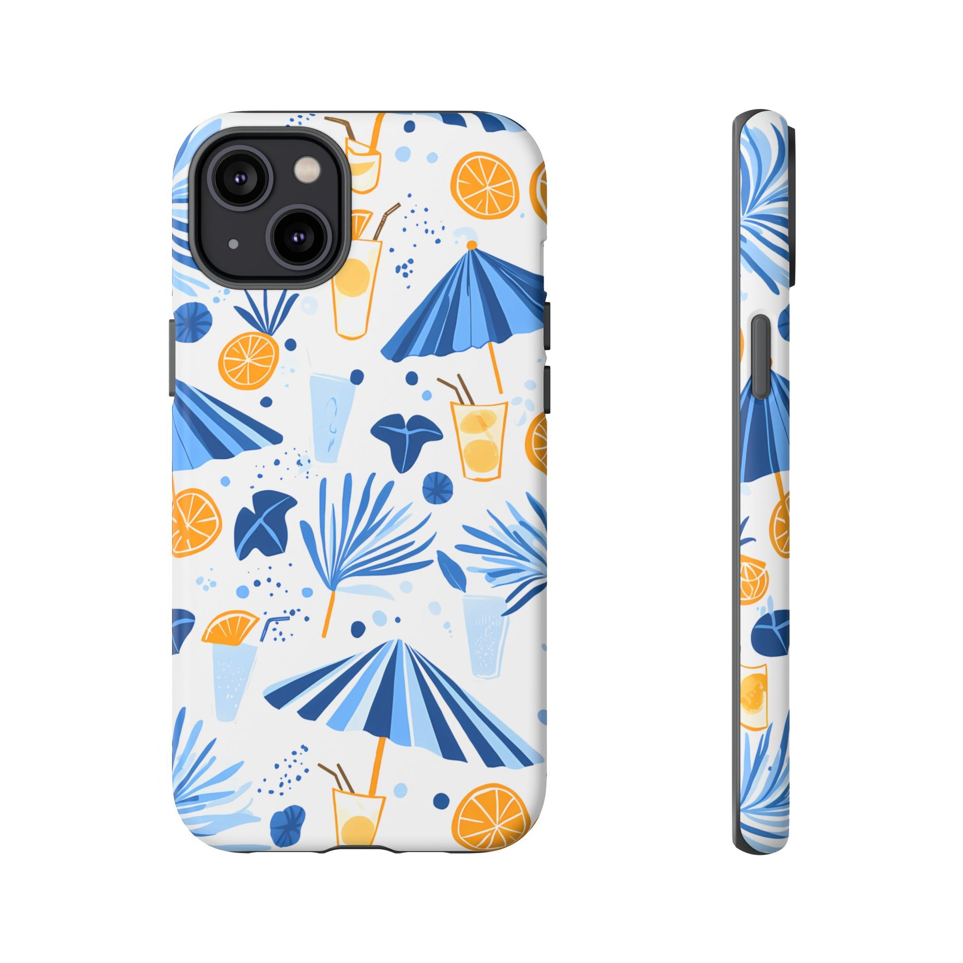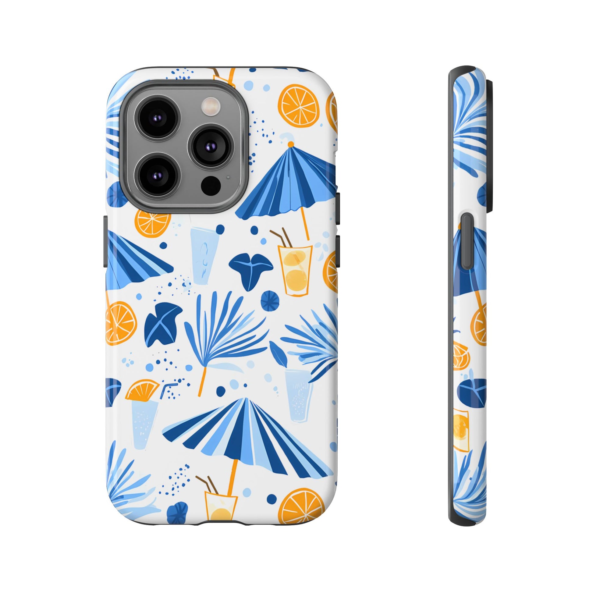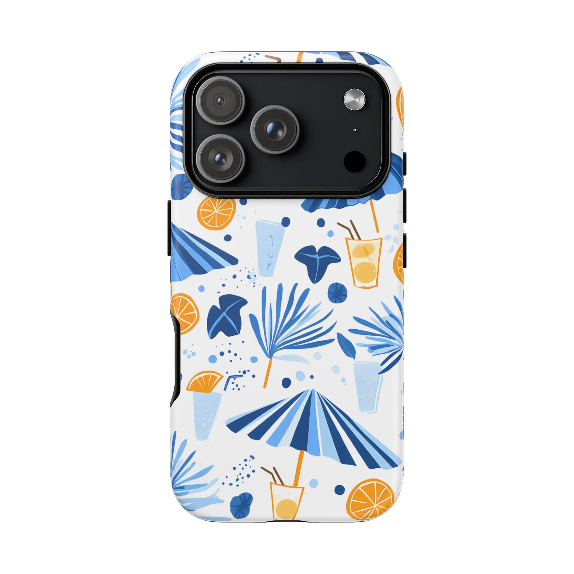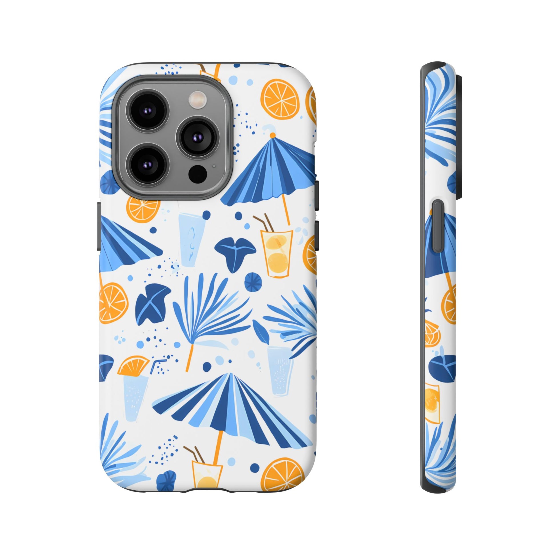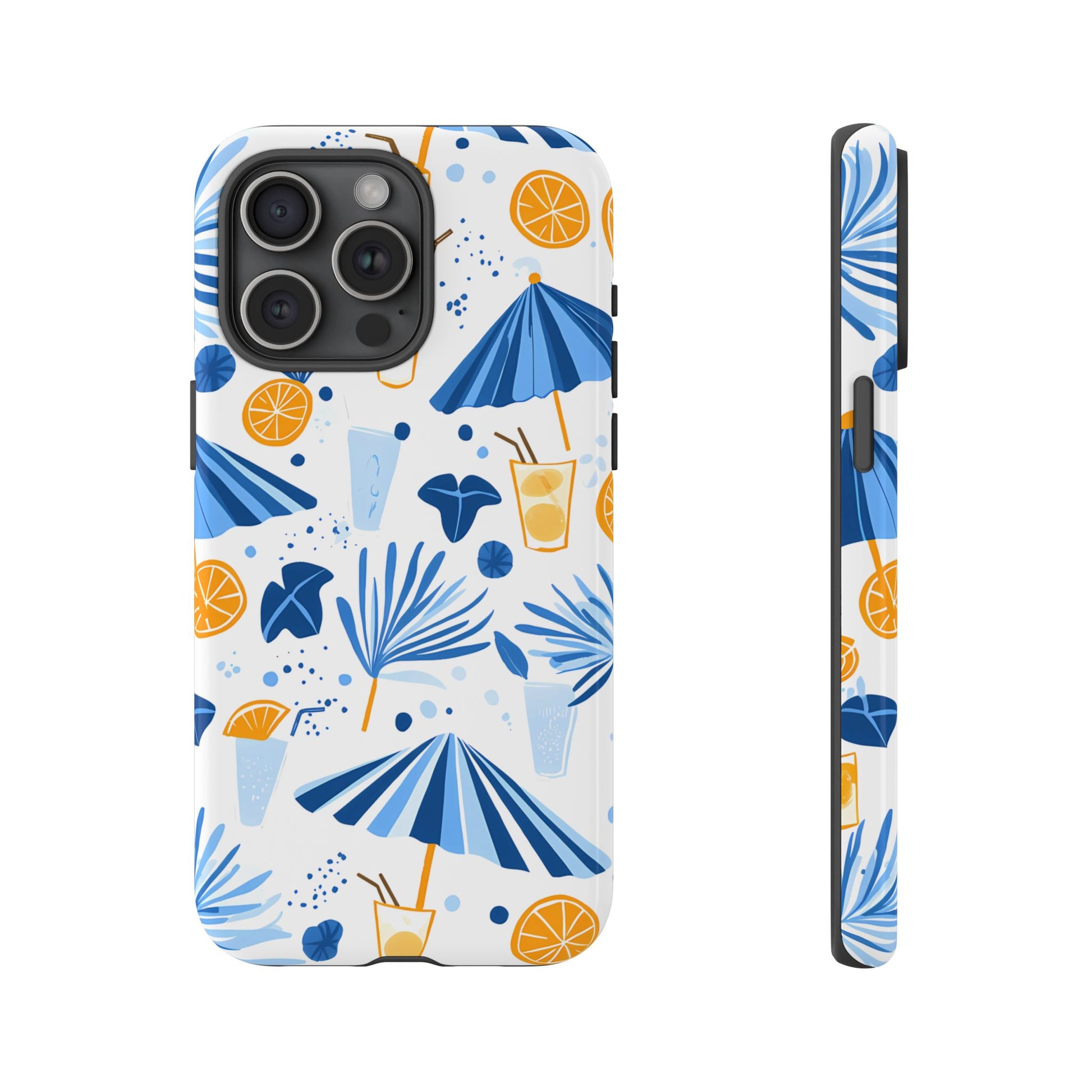 A light and cheerful seamless pattern featuring cute cartoon-style blue-and-white beach umbrellas, tiny cocktail glasses, and playful summer shapes on a crisp white background. Minimalistic and breezy, it captures a fresh Greek-island vibe in clean blue tones
