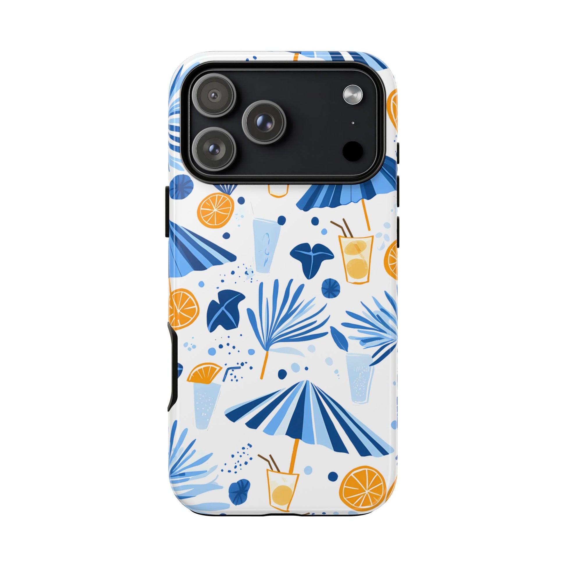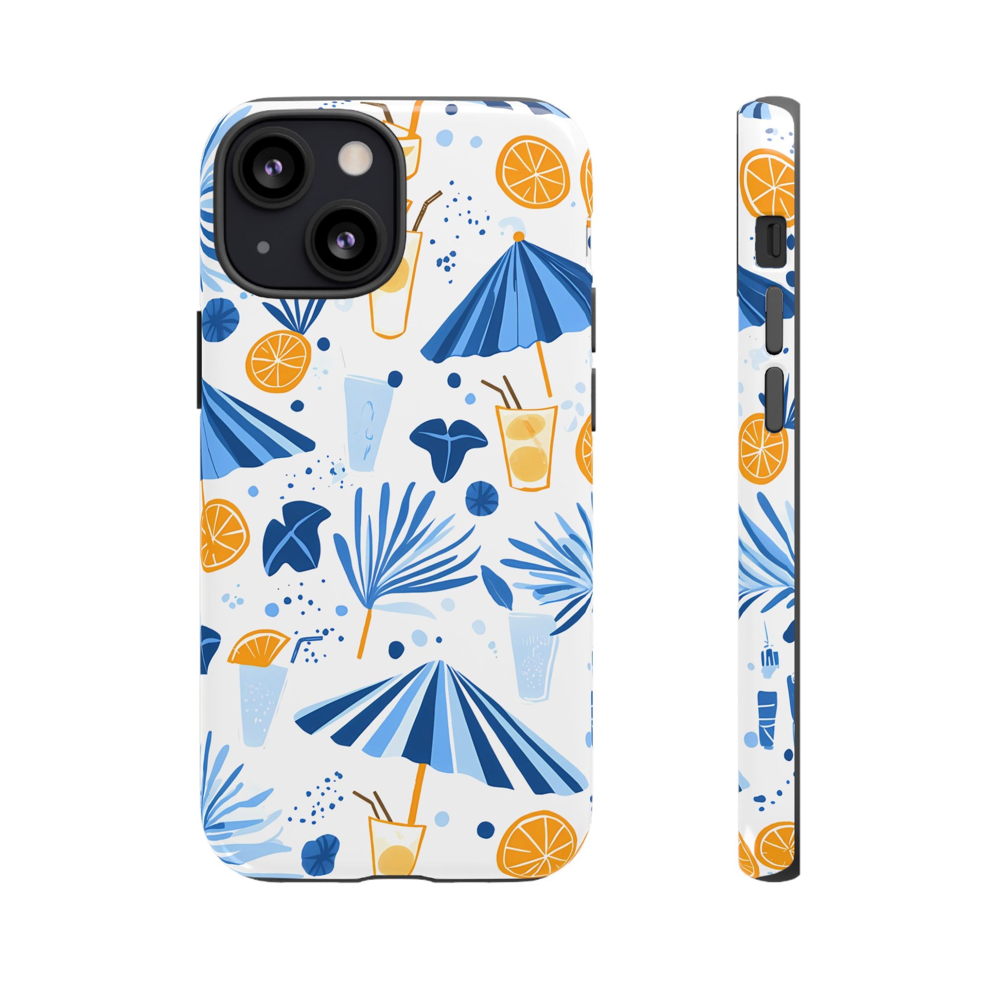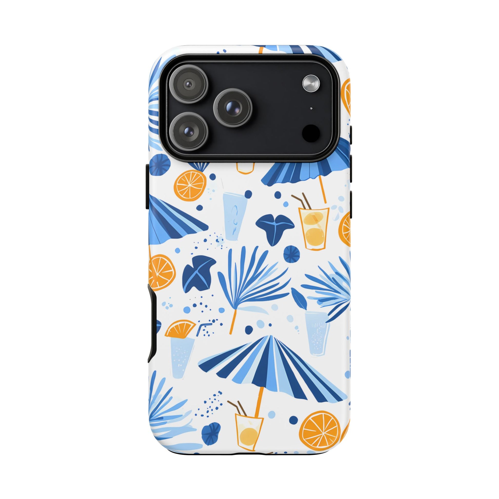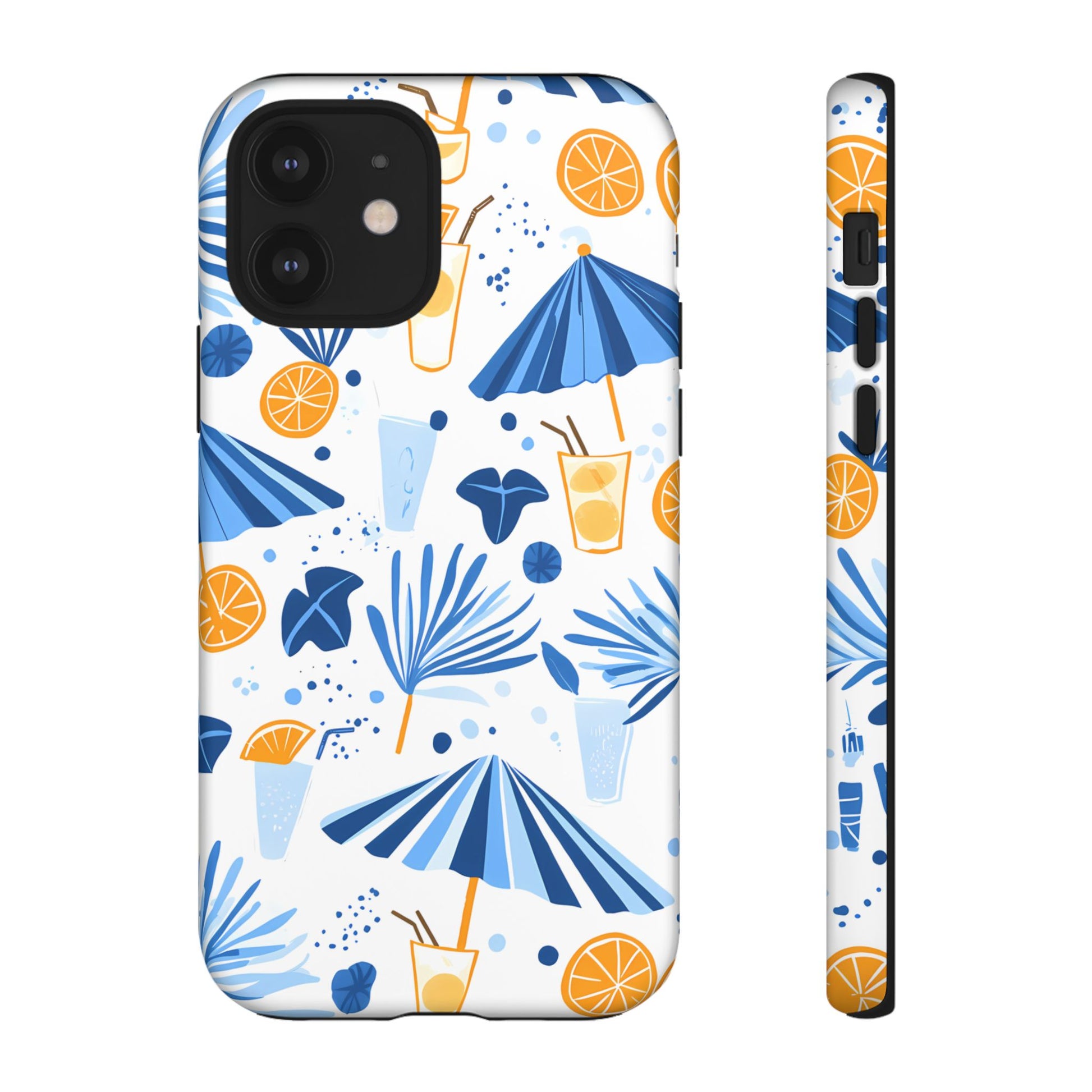 A light and cheerful seamless pattern featuring cute cartoon-style blue-and-white beach umbrellas, tiny cocktail glasses, and playful summer shapes on a crisp white background. Minimalistic and breezy, it captures a fresh Greek-island vibe in clean blue tones