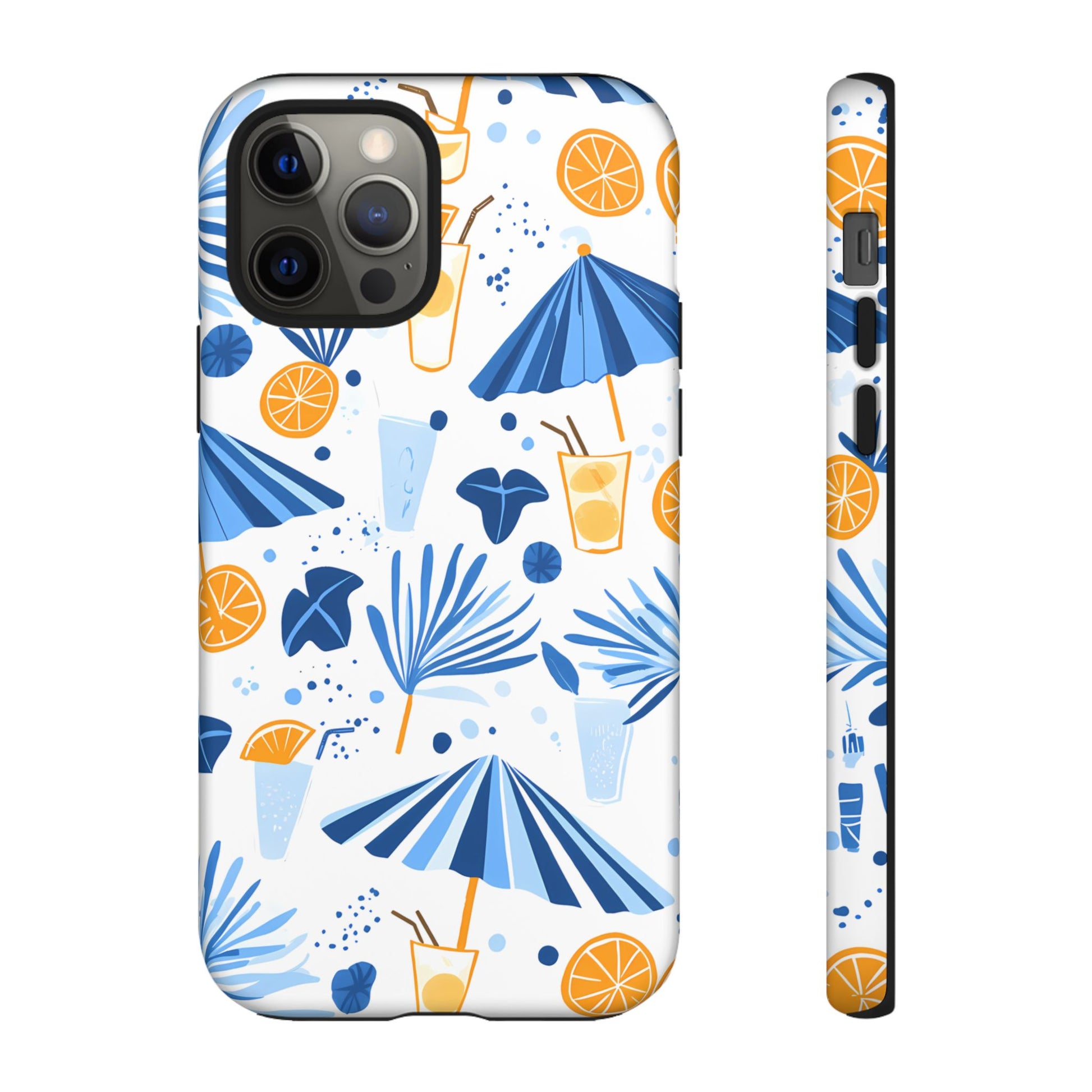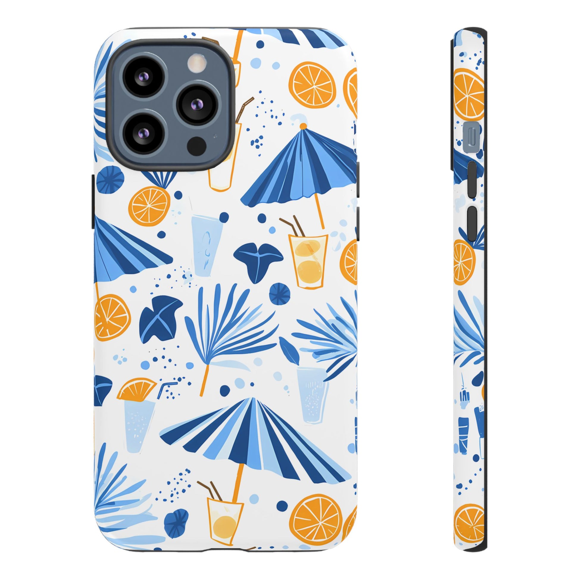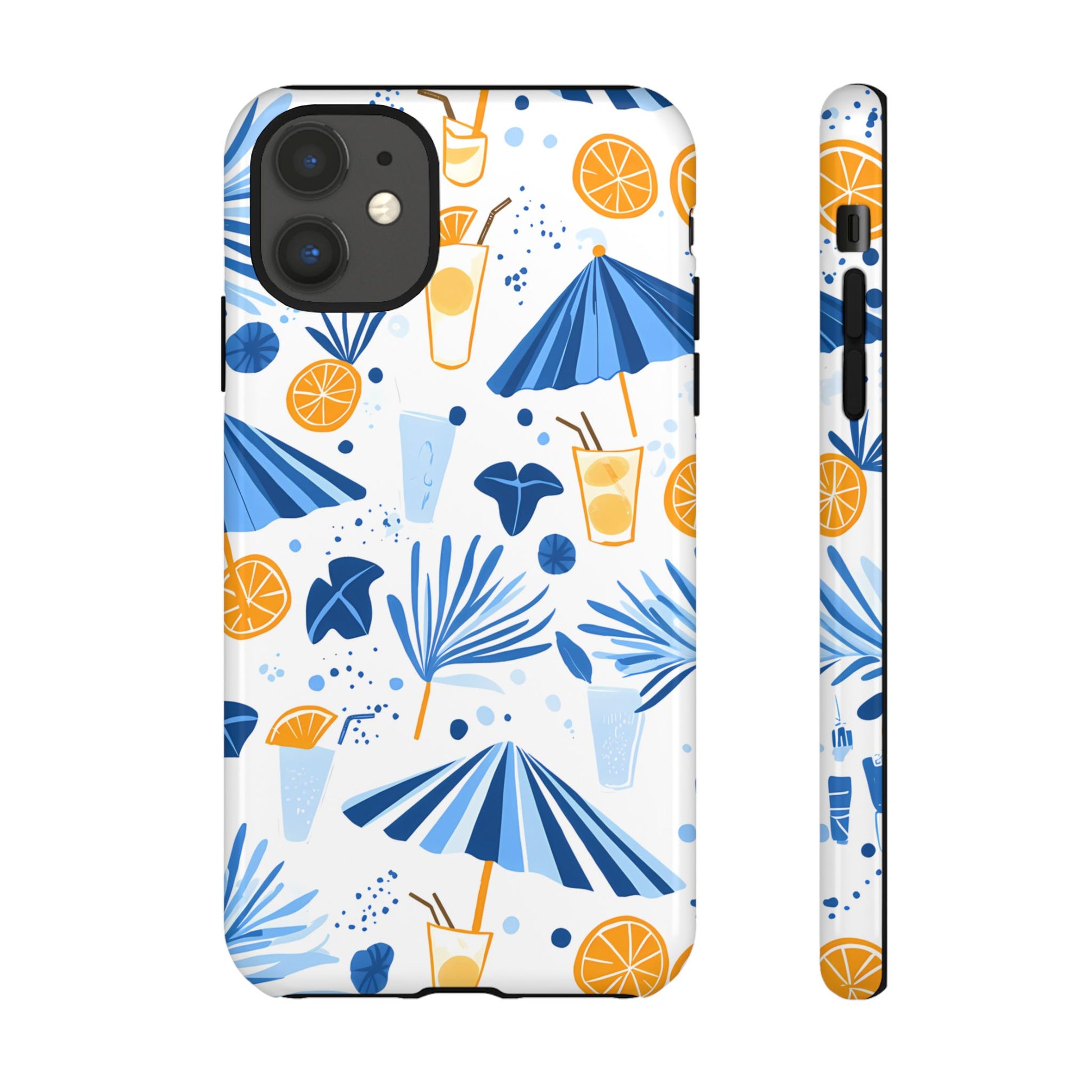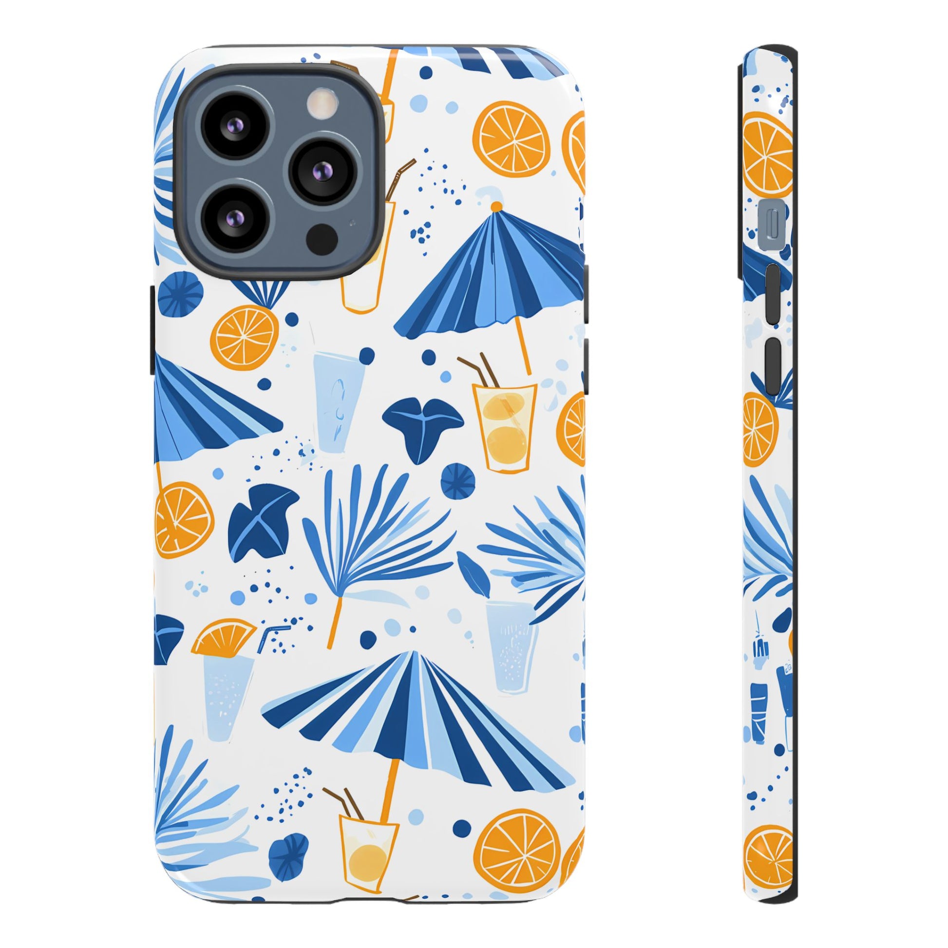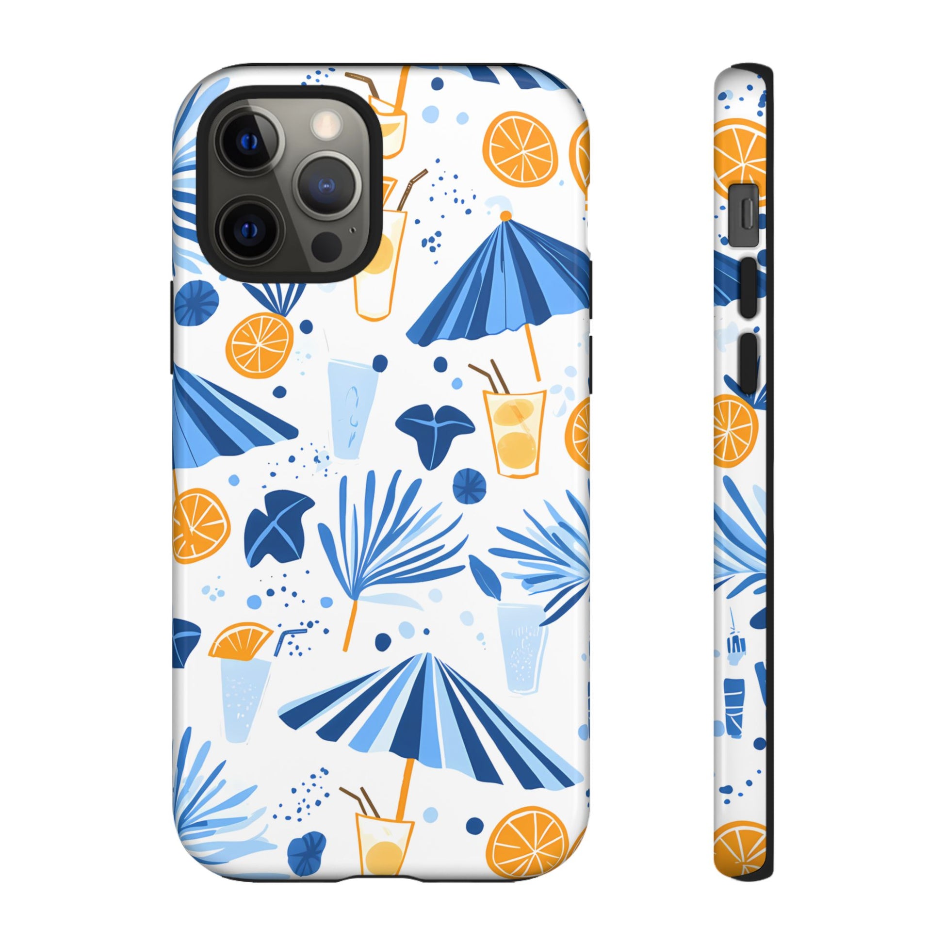 A light and cheerful seamless pattern featuring cute cartoon-style blue-and-white beach umbrellas, tiny cocktail glasses, and playful summer shapes on a crisp white background. Minimalistic and breezy, it captures a fresh Greek-island vibe in clean blue tones