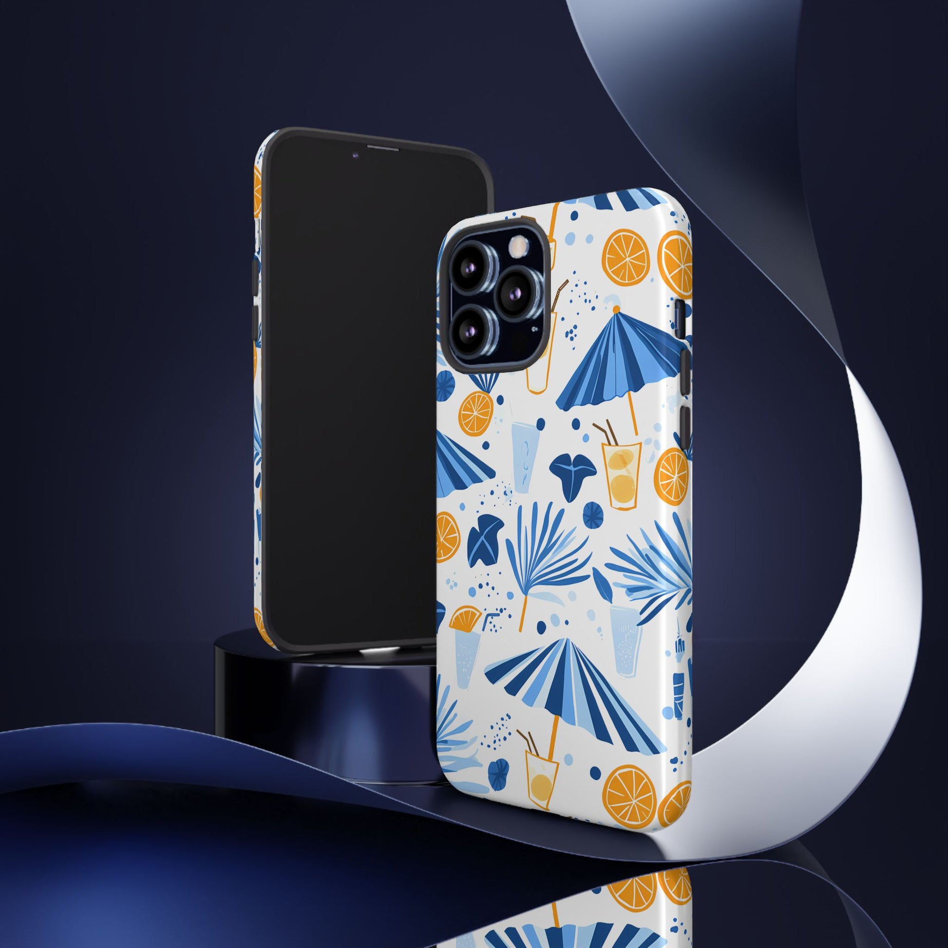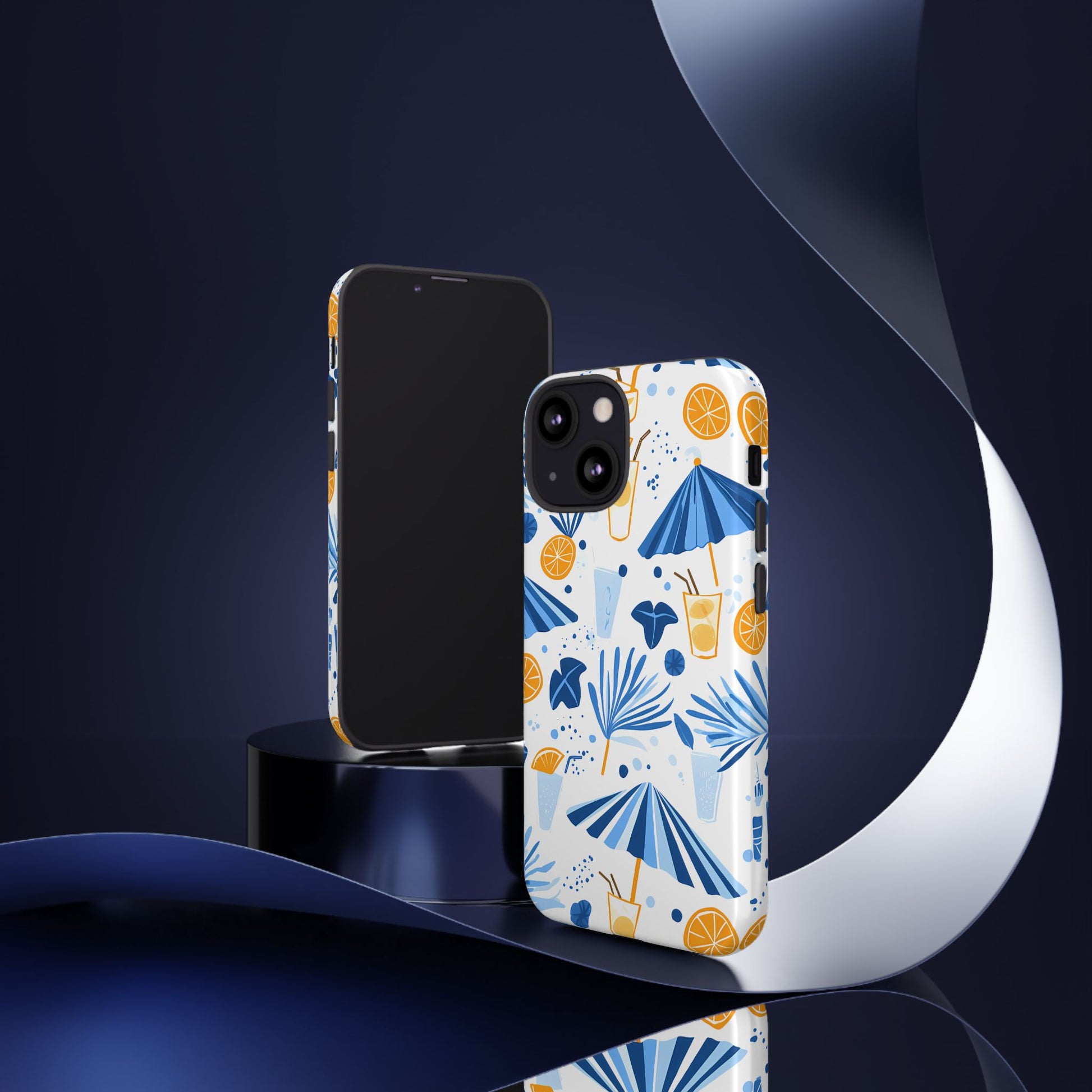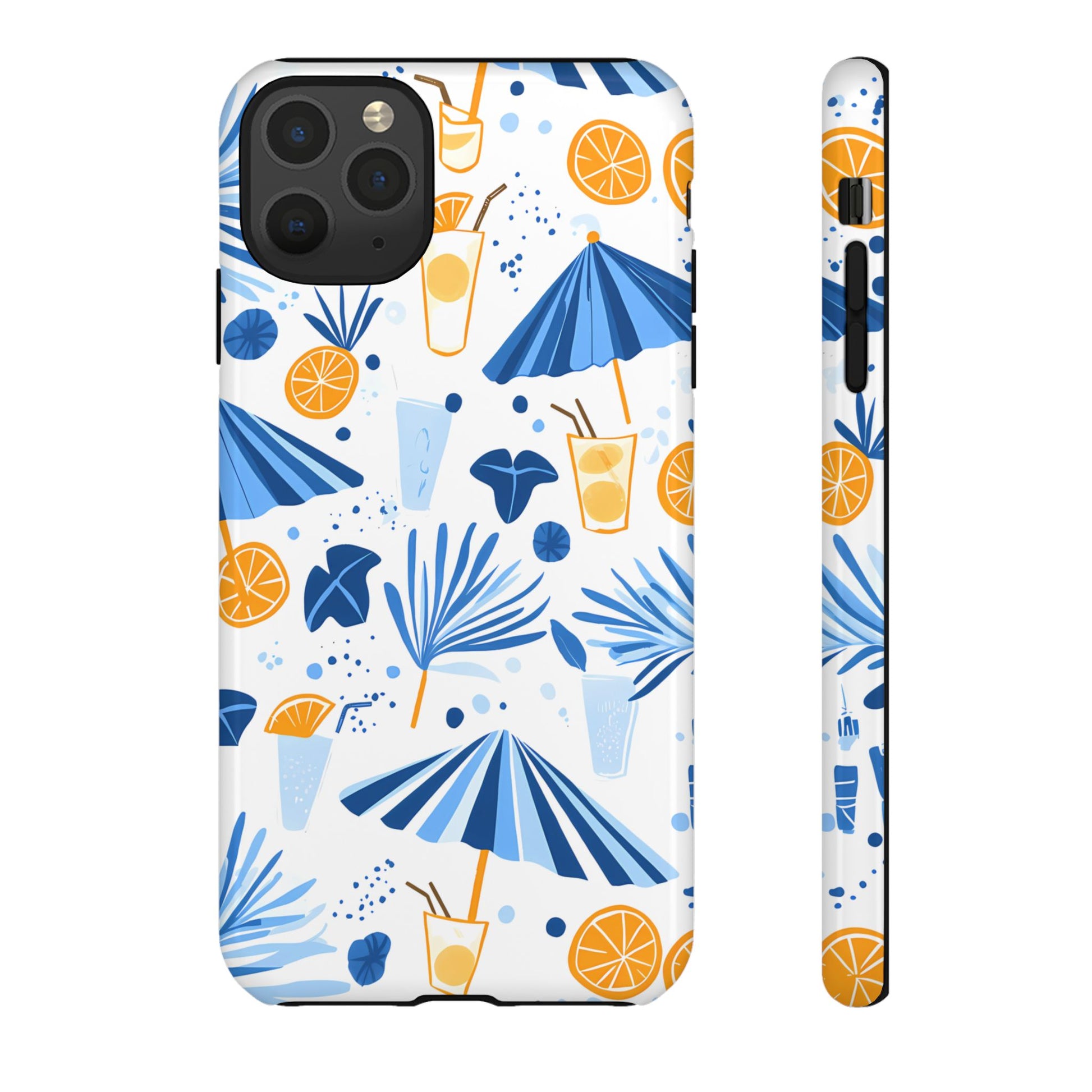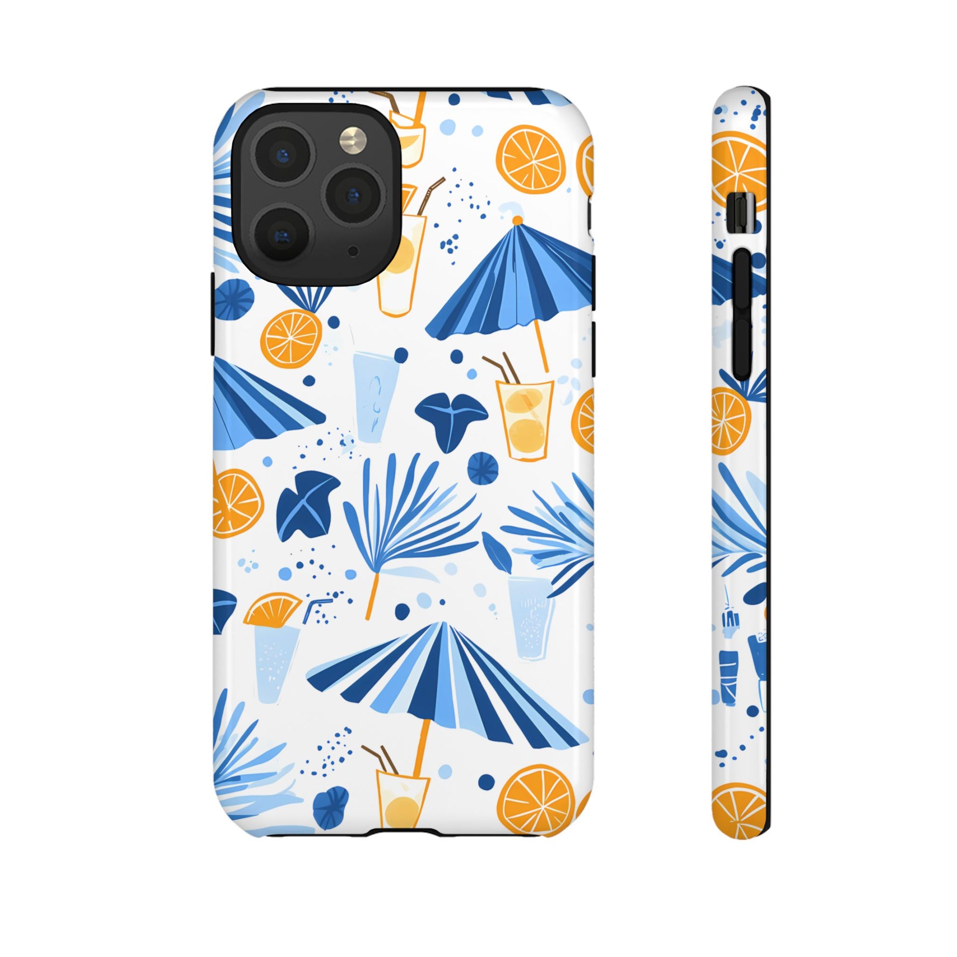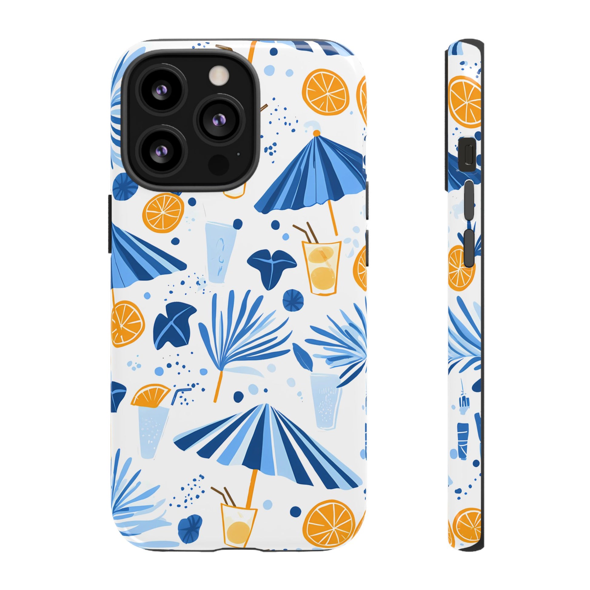 A light and cheerful seamless pattern featuring cute cartoon-style blue-and-white beach umbrellas, tiny cocktail glasses, and playful summer shapes on a crisp white background. Minimalistic and breezy, it captures a fresh Greek-island vibe in clean blue tones