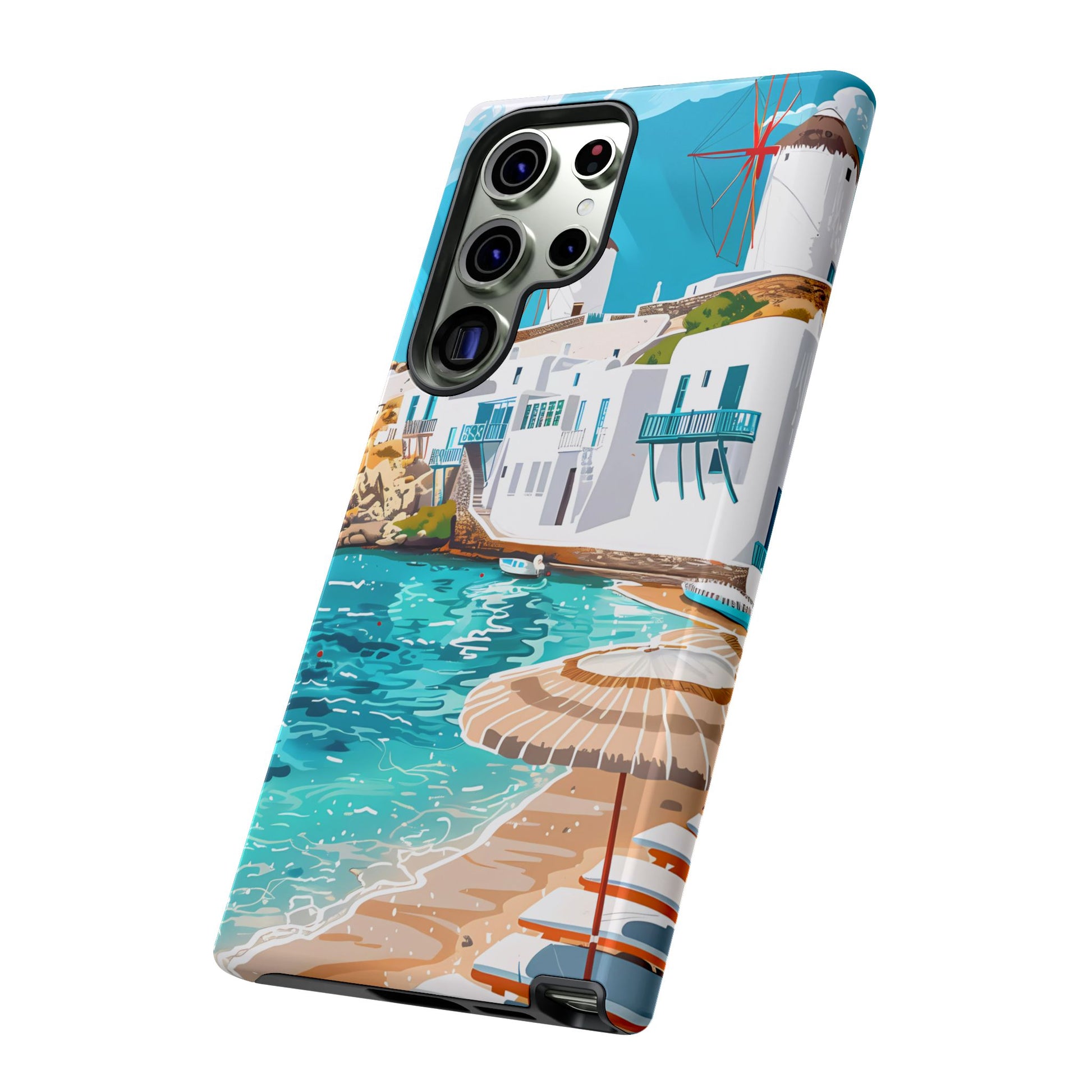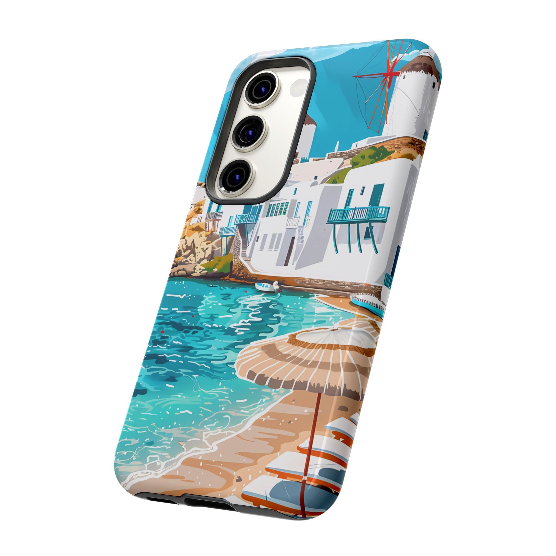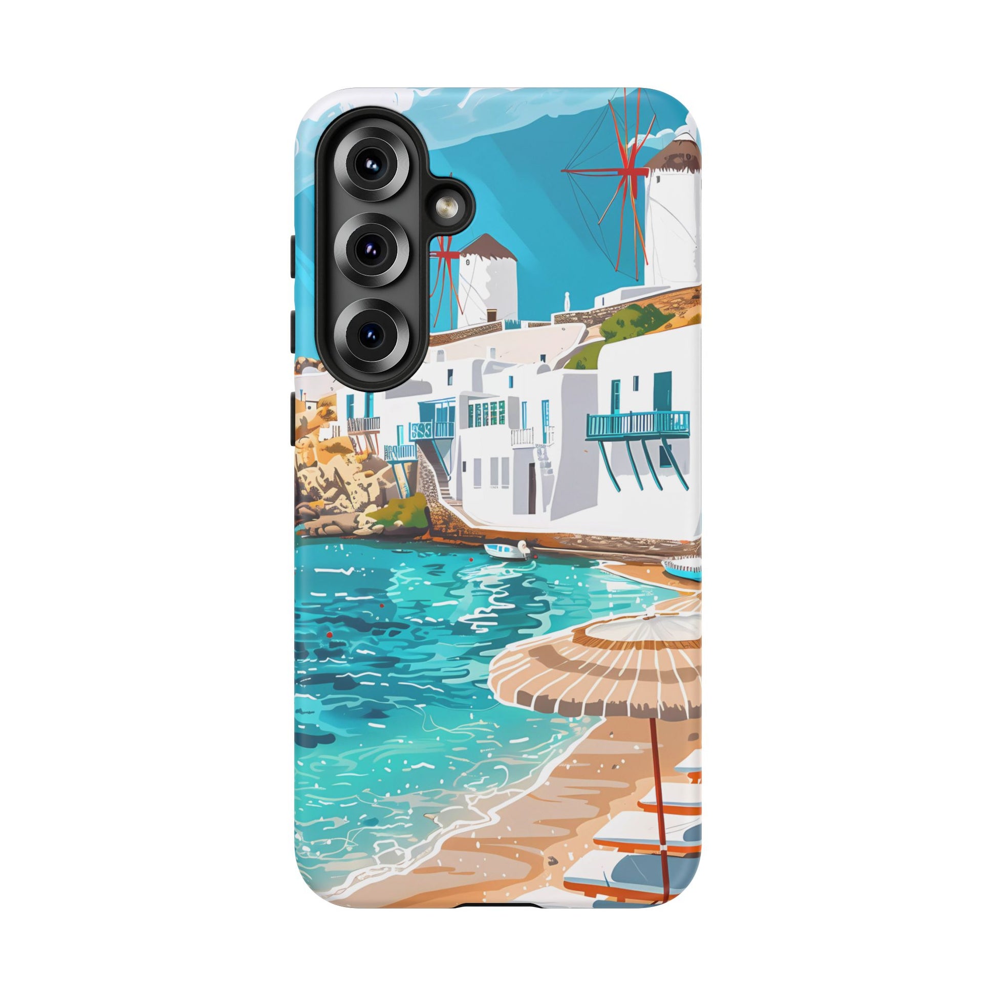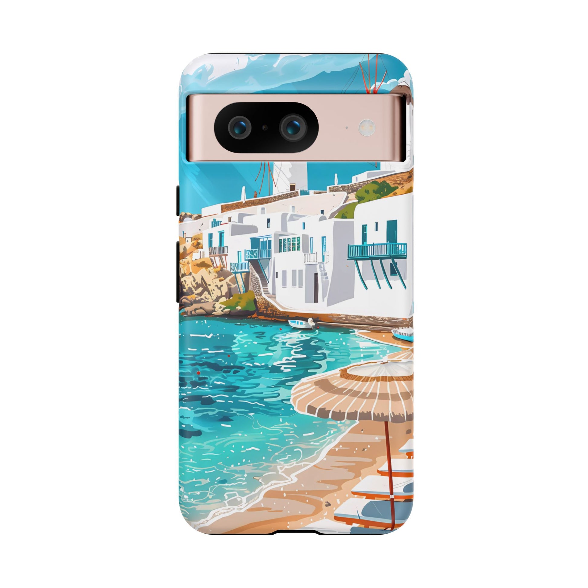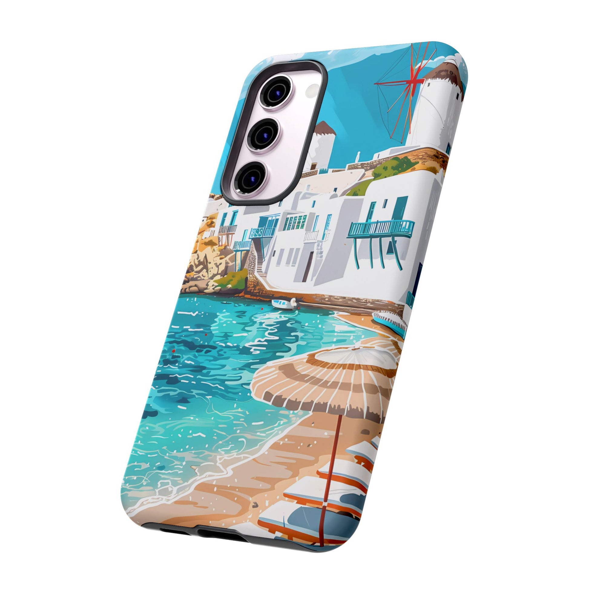 Capture the essence of Mykonos with this elegant phone case featuring white-washed buildings, iconic windmills, and vibrant turquoise waters. Perfect for those who love the stylish beach club atmosphere of Greece's most glamorous island.