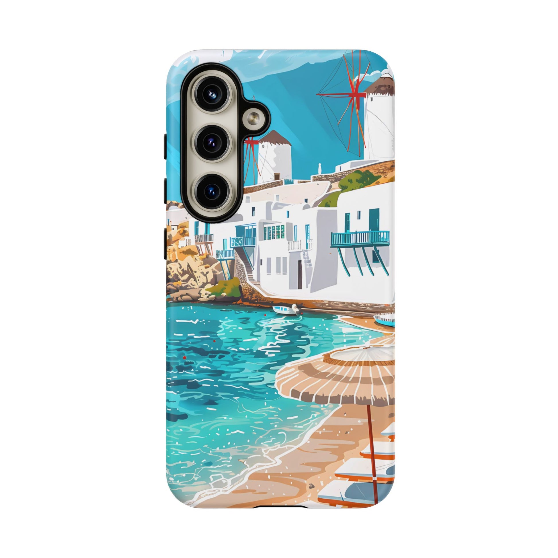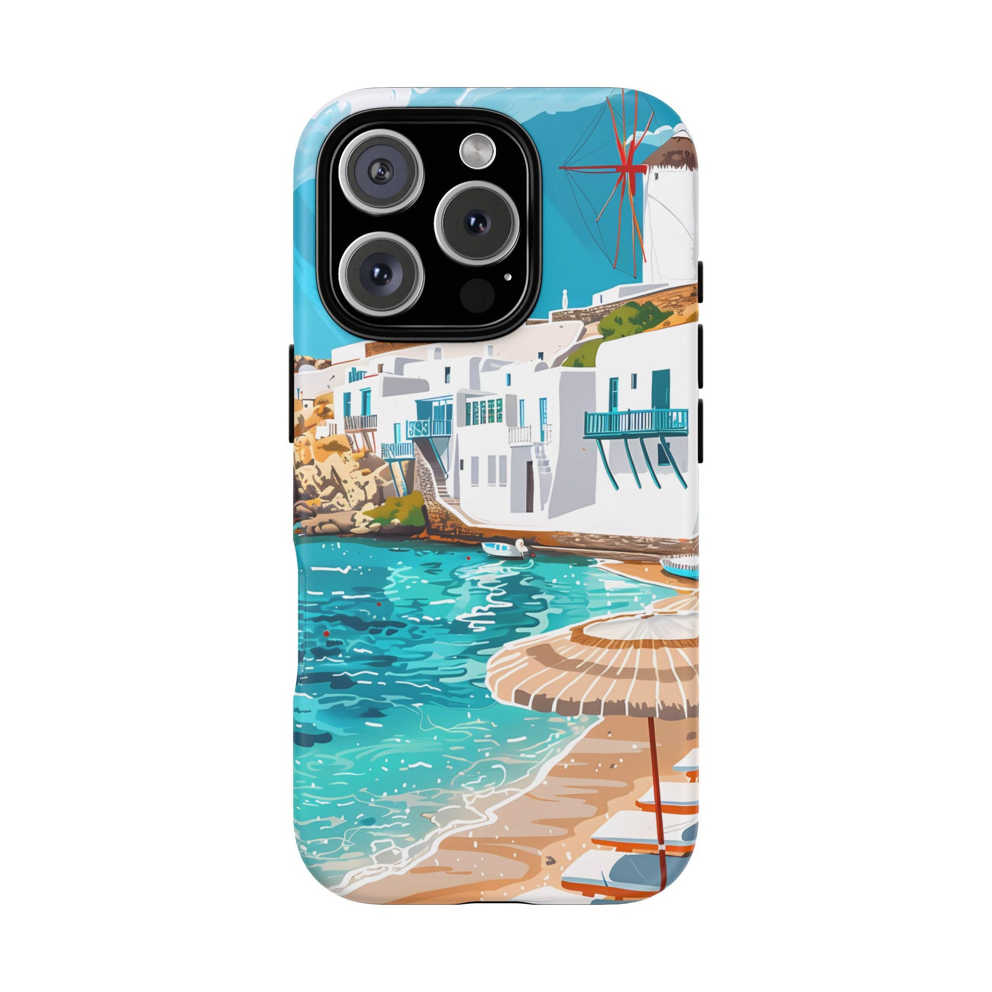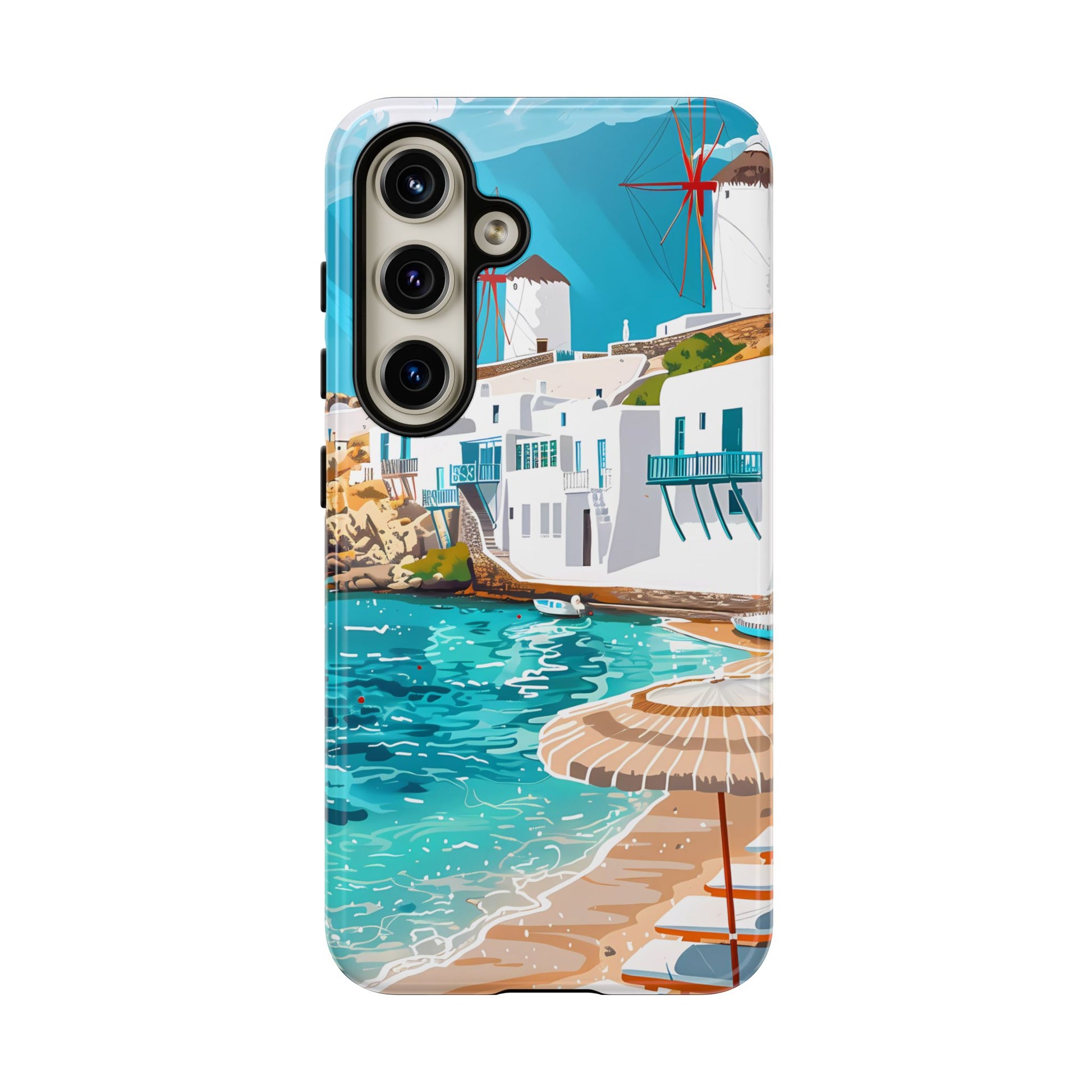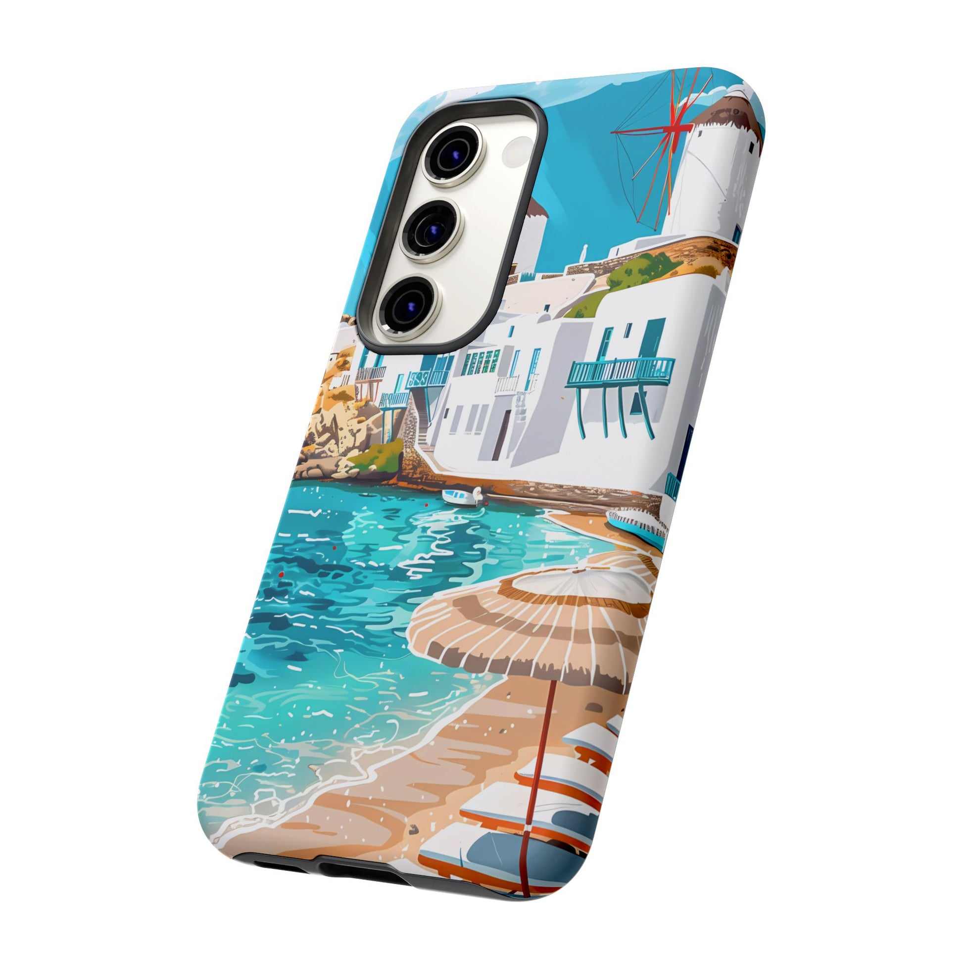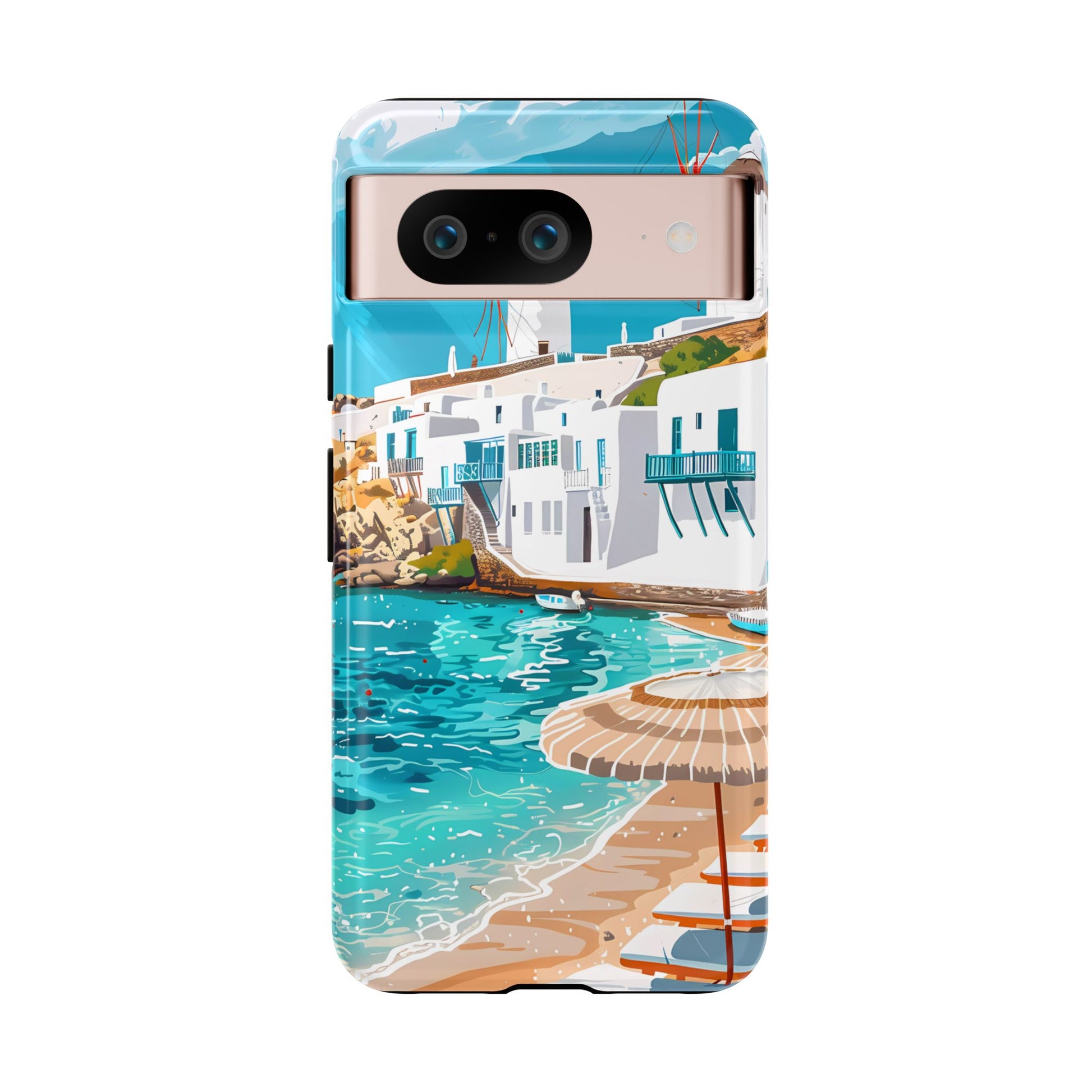 Capture the essence of Mykonos with this elegant phone case featuring white-washed buildings, iconic windmills, and vibrant turquoise waters. Perfect for those who love the stylish beach club atmosphere of Greece's most glamorous island.