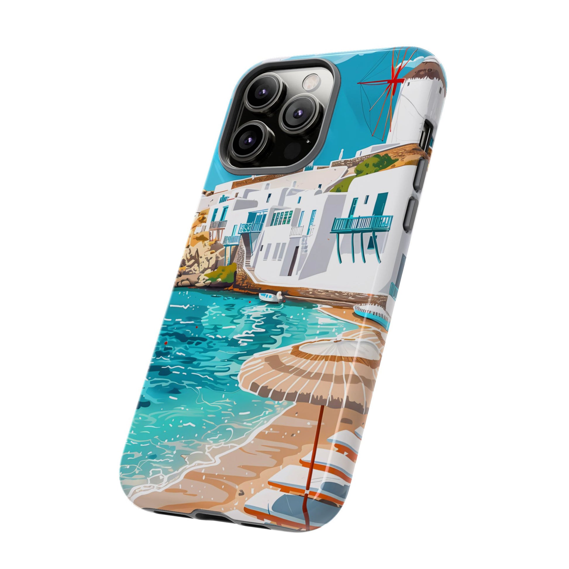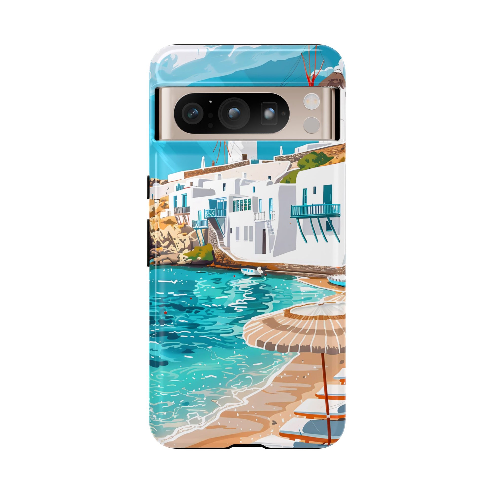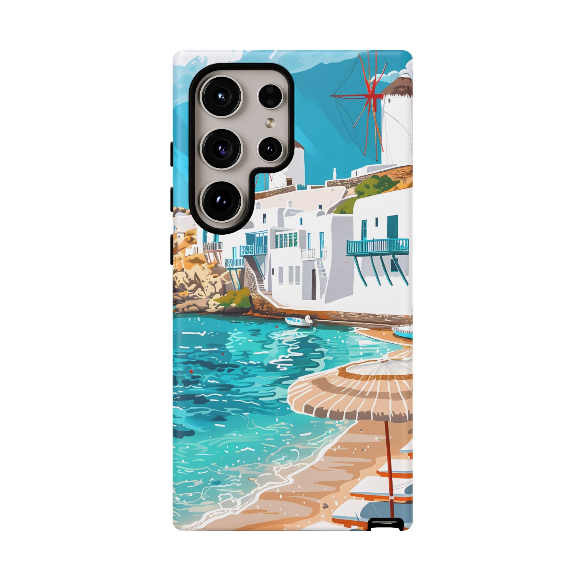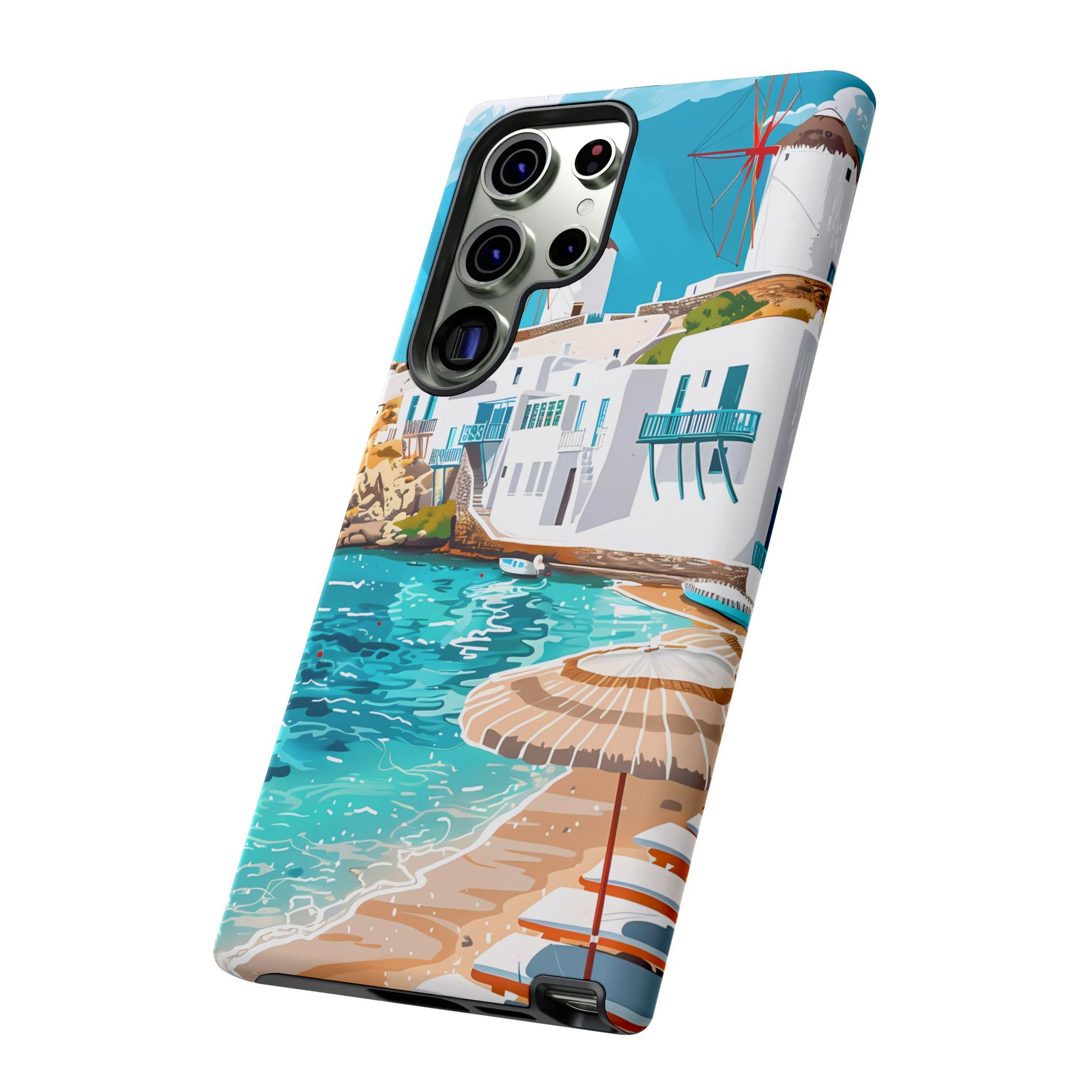 Capture the essence of Mykonos with this elegant phone case featuring white-washed buildings, iconic windmills, and vibrant turquoise waters. Perfect for those who love the stylish beach club atmosphere of Greece's most glamorous island.