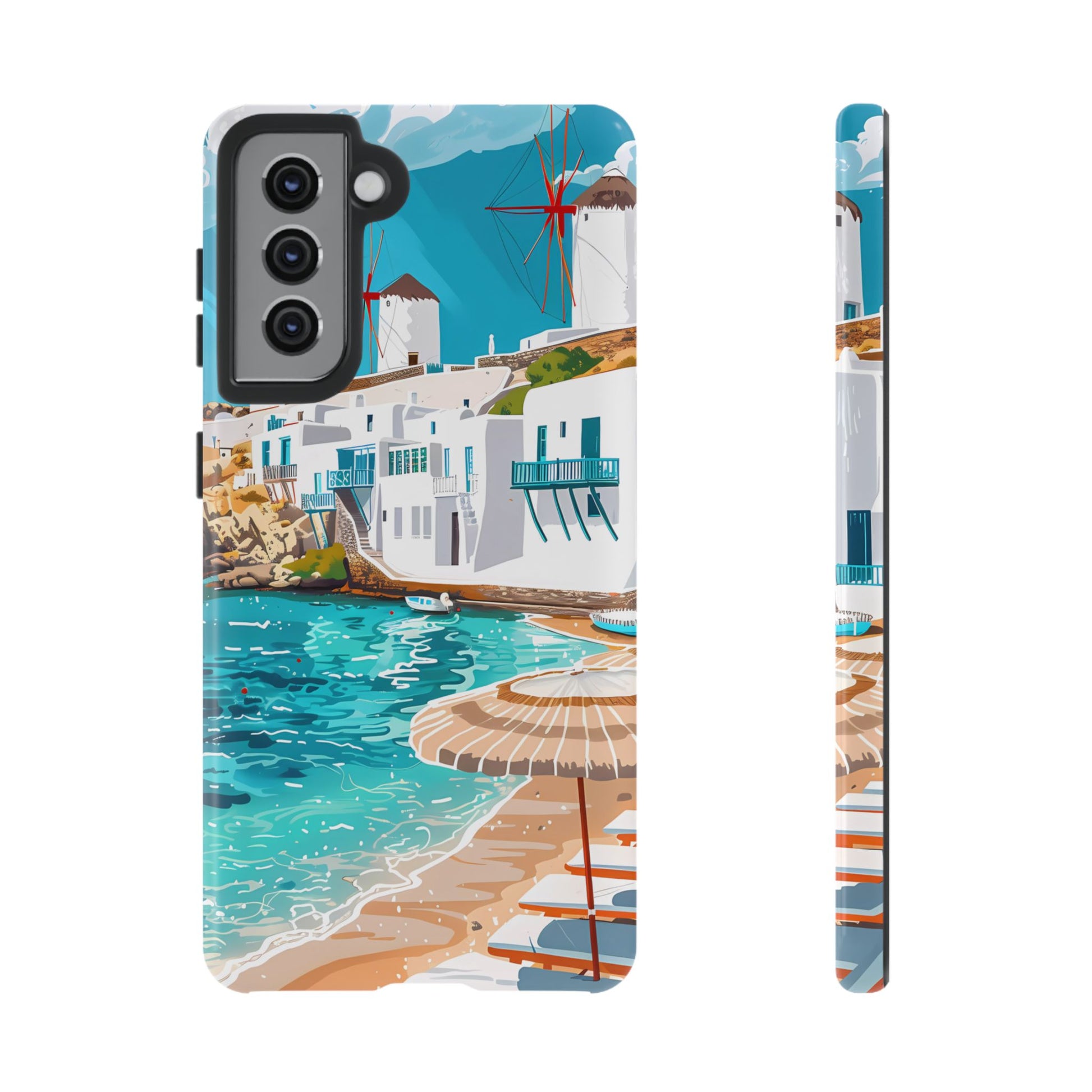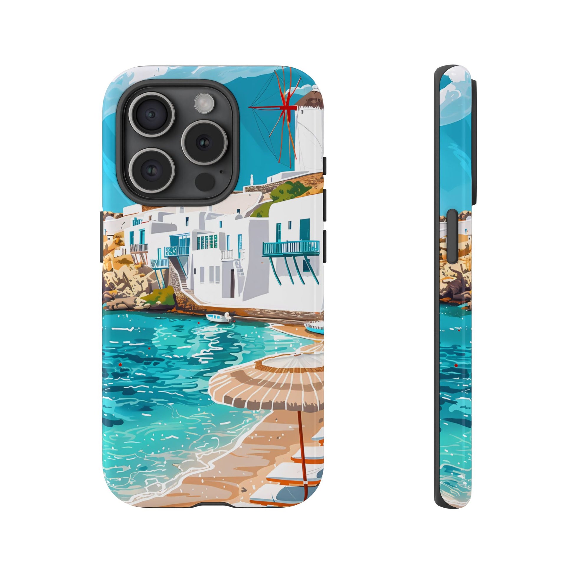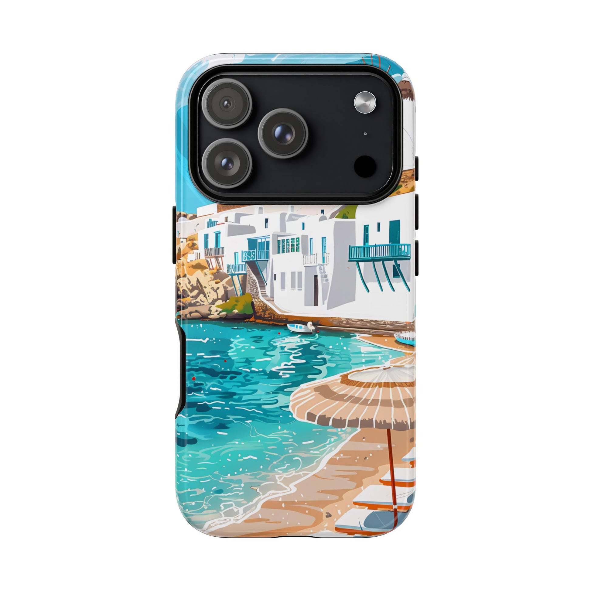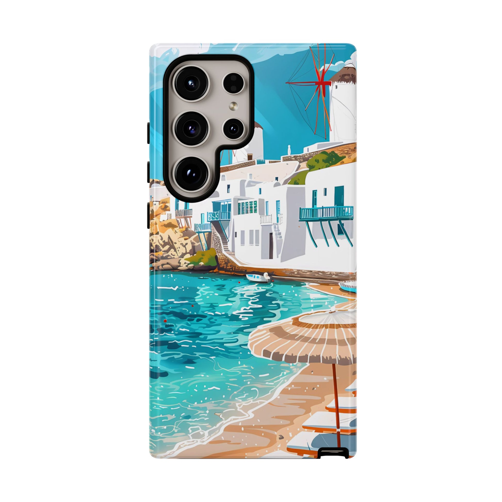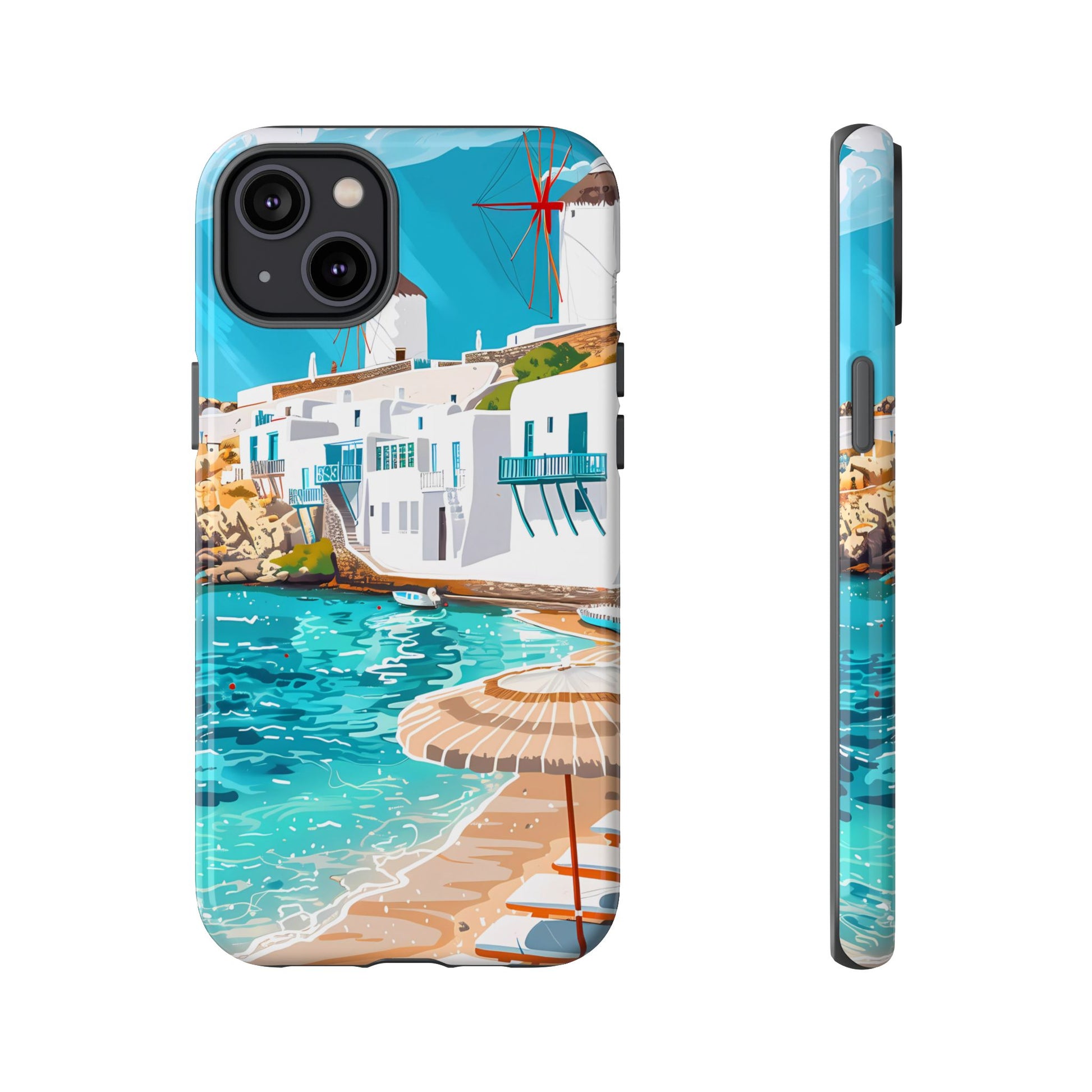 Capture the essence of Mykonos with this elegant phone case featuring white-washed buildings, iconic windmills, and vibrant turquoise waters. Perfect for those who love the stylish beach club atmosphere of Greece's most glamorous island.