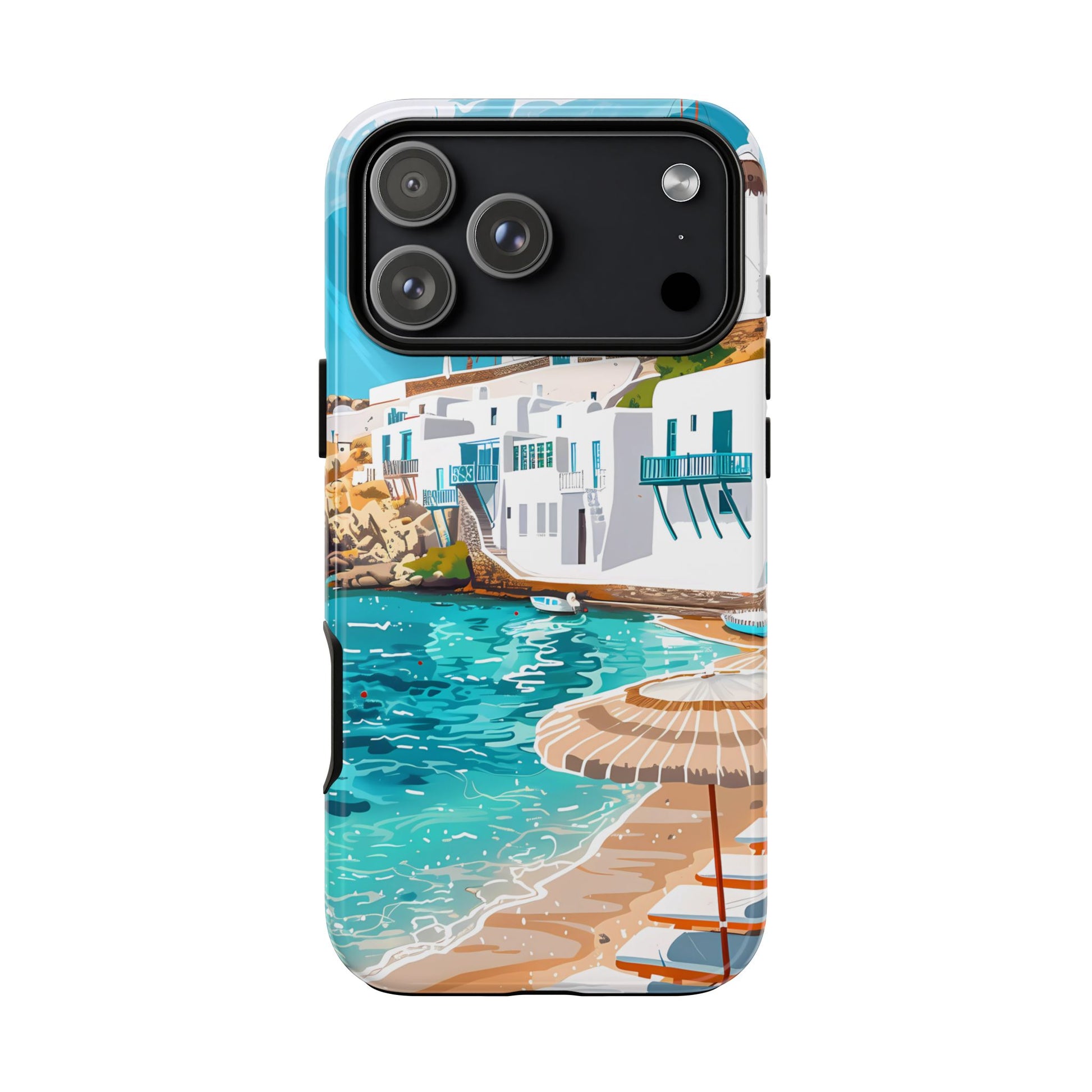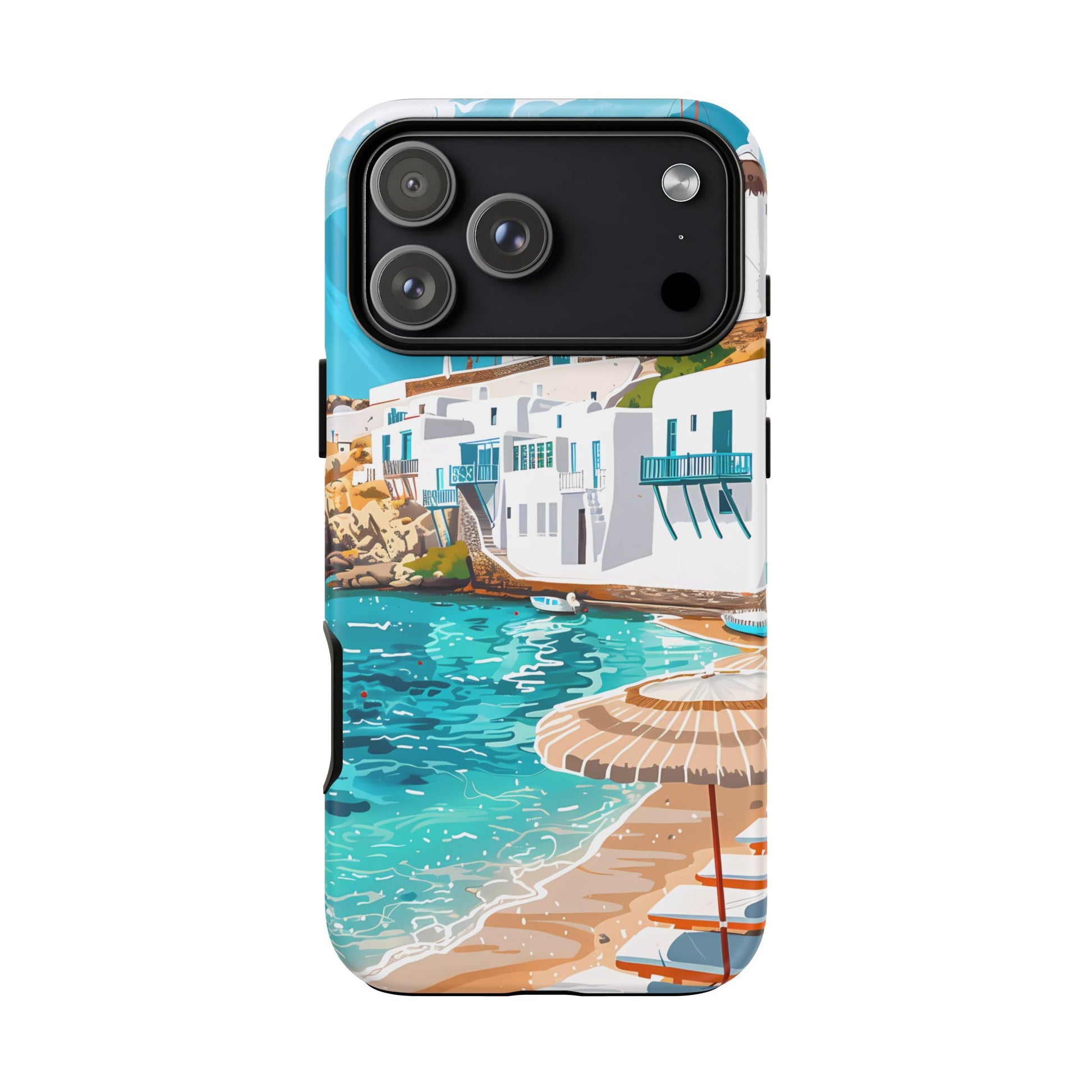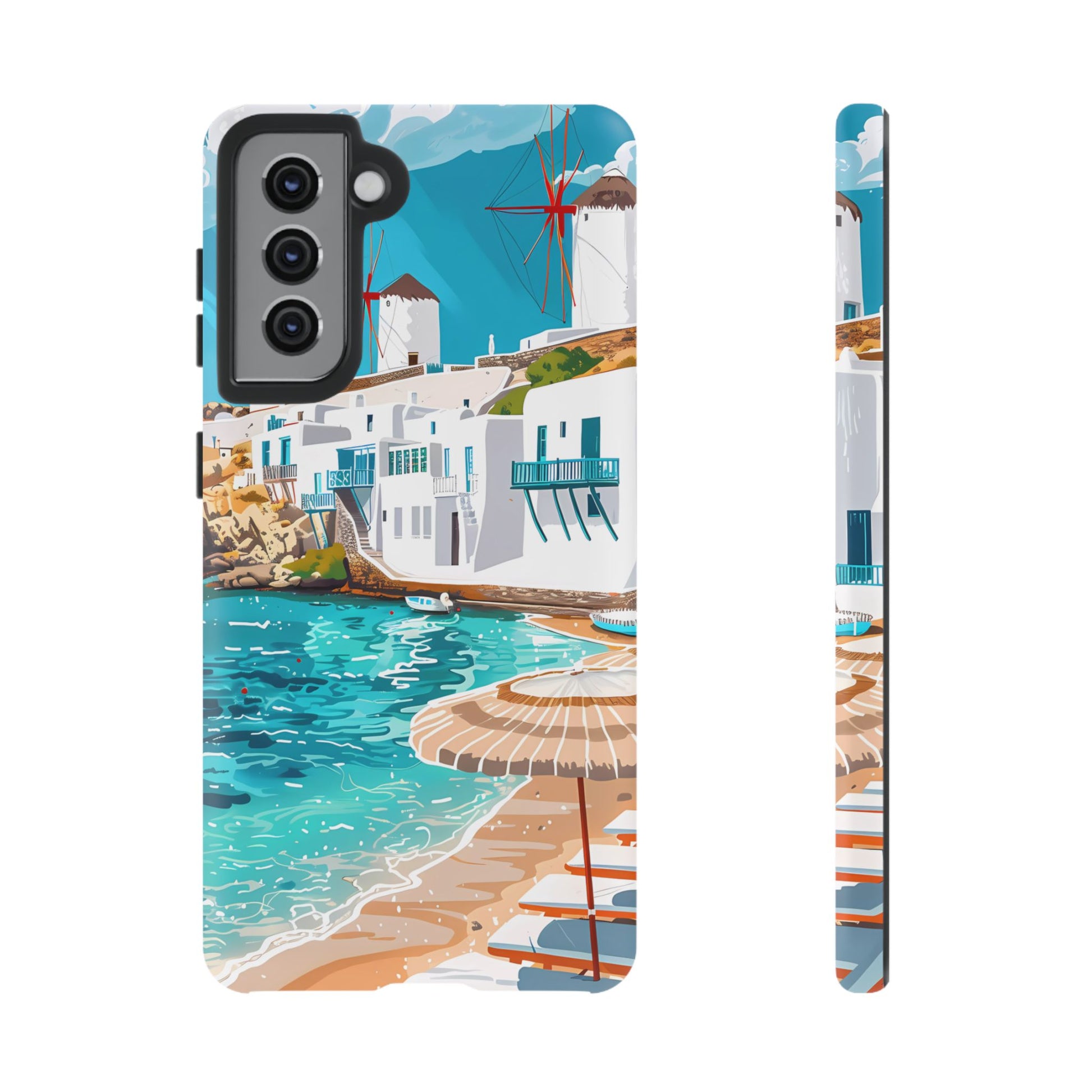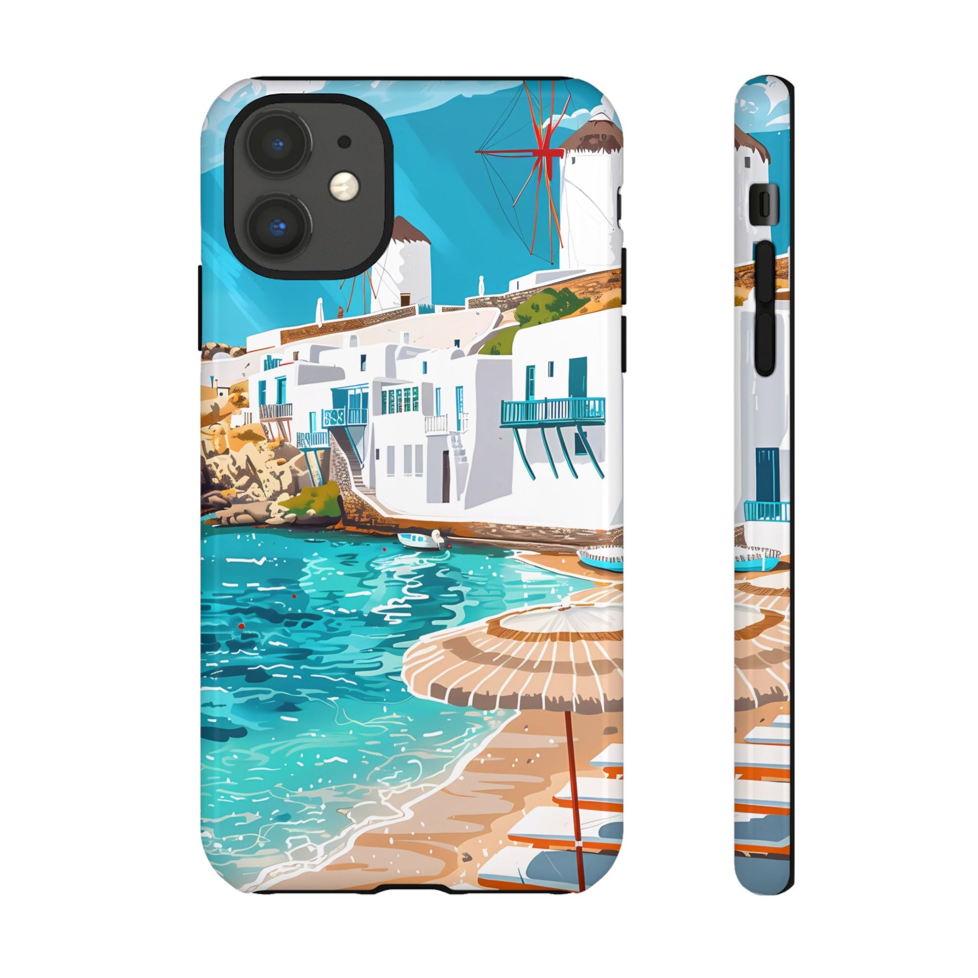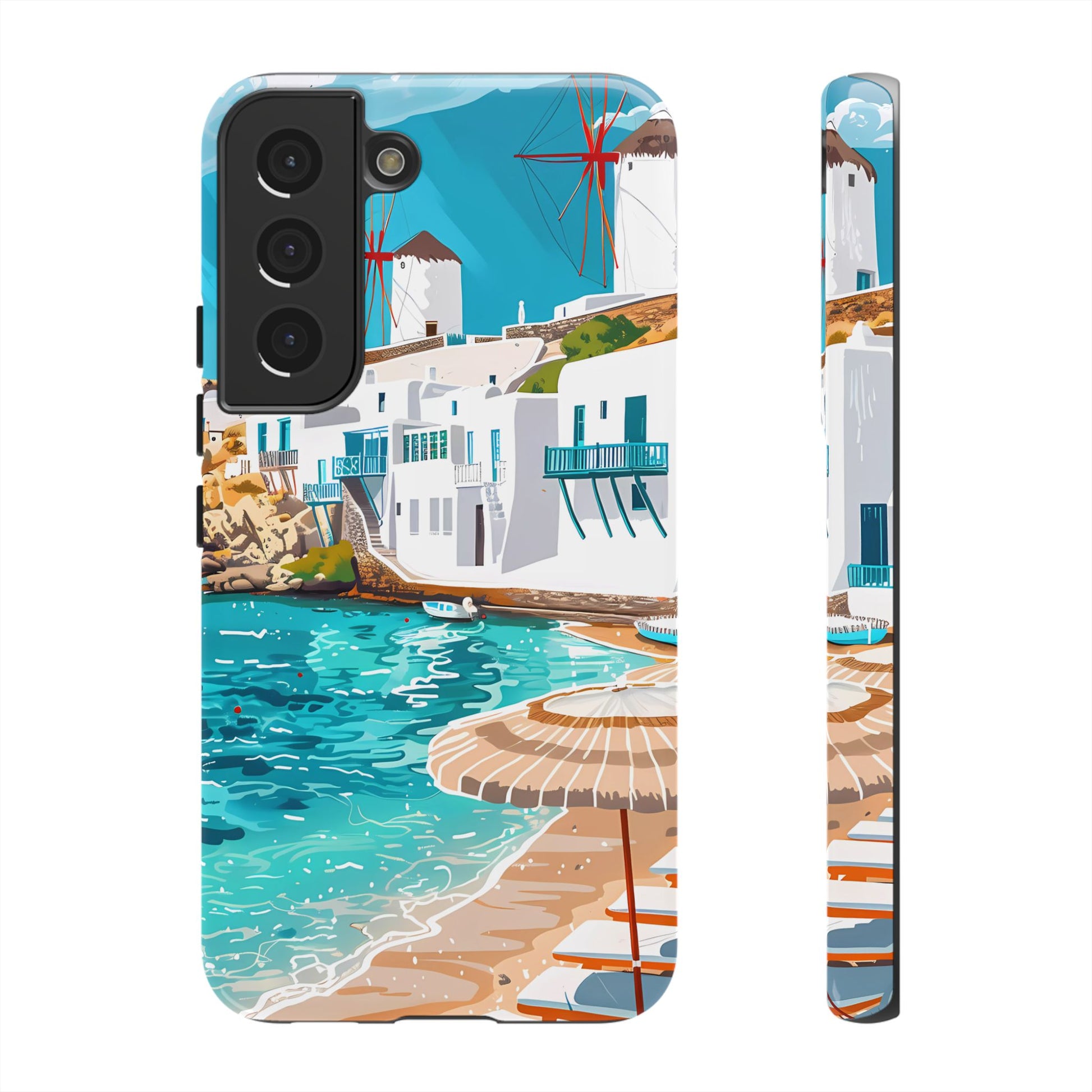 Capture the essence of Mykonos with this elegant phone case featuring white-washed buildings, iconic windmills, and vibrant turquoise waters. Perfect for those who love the stylish beach club atmosphere of Greece's most glamorous island.
