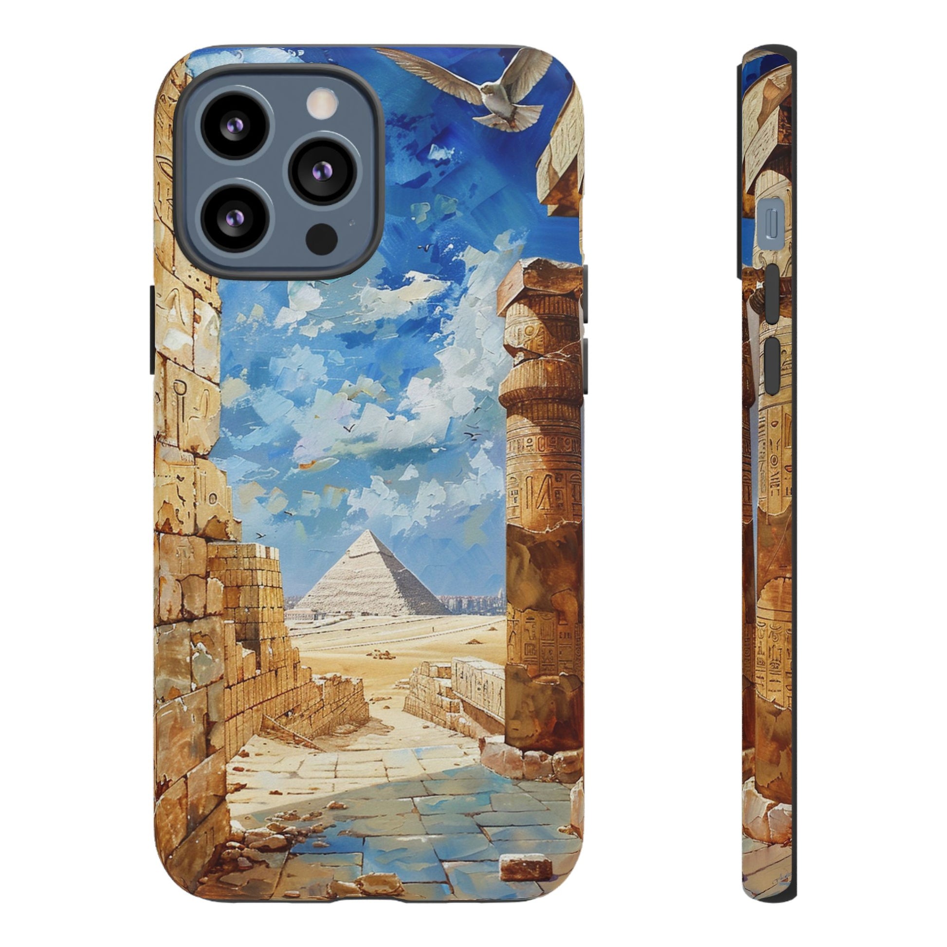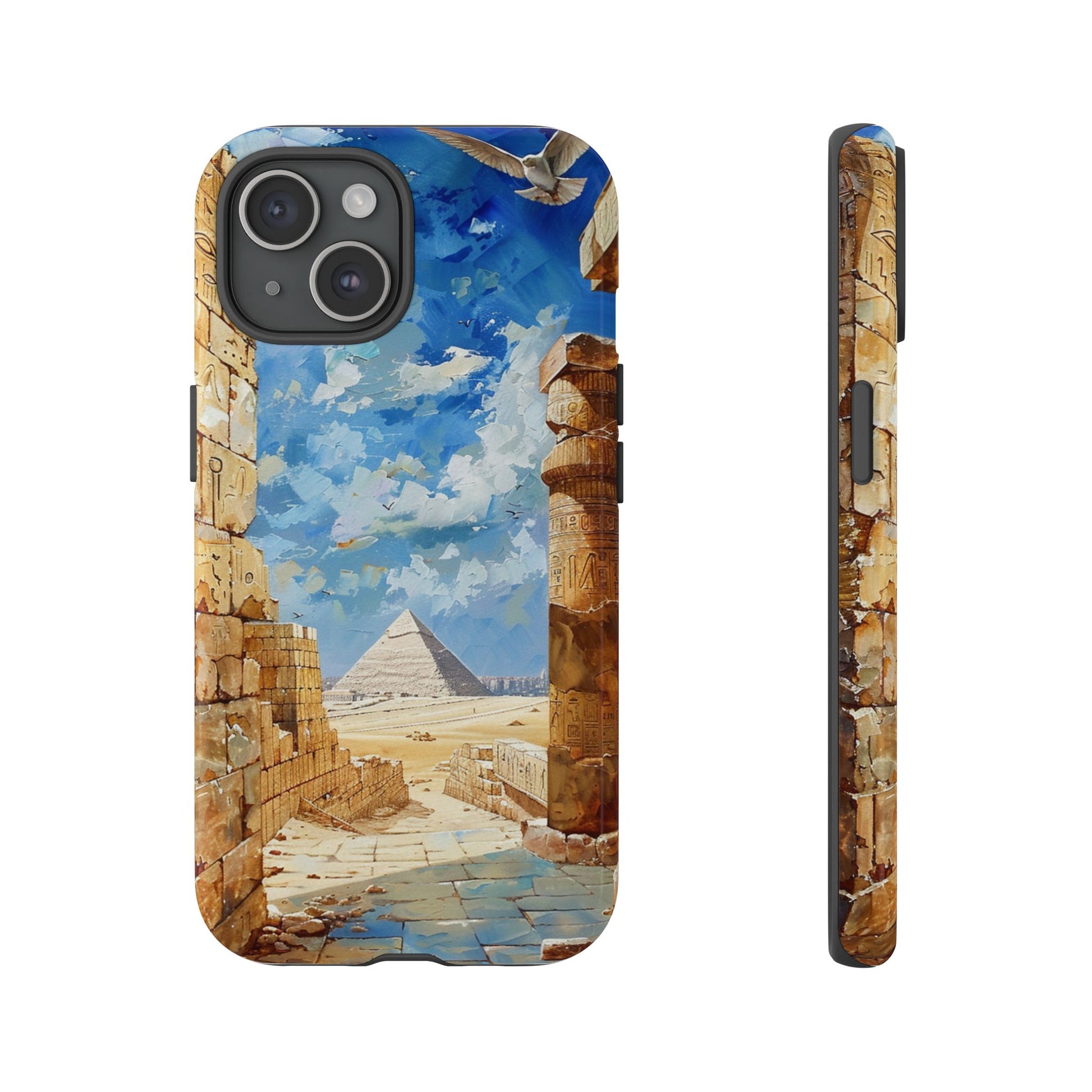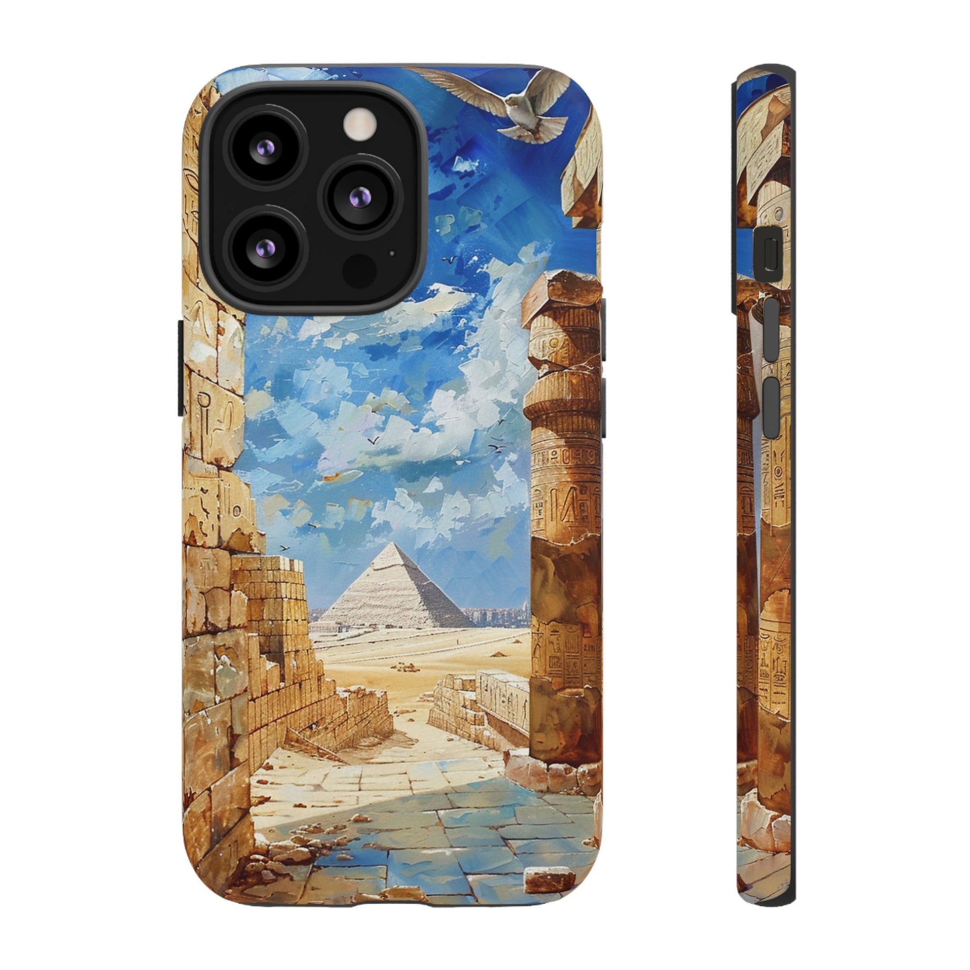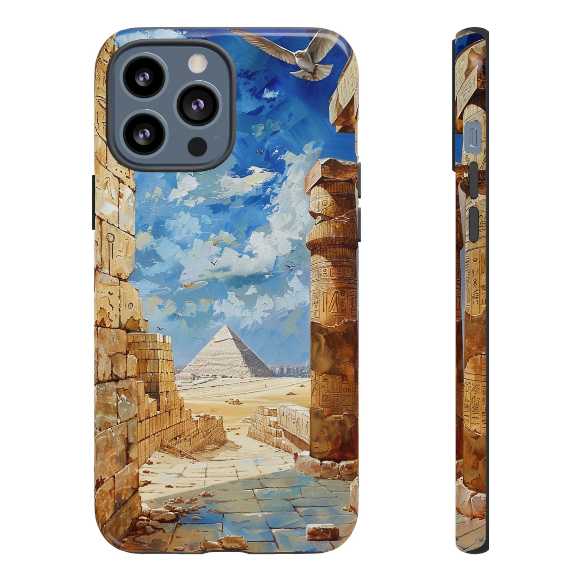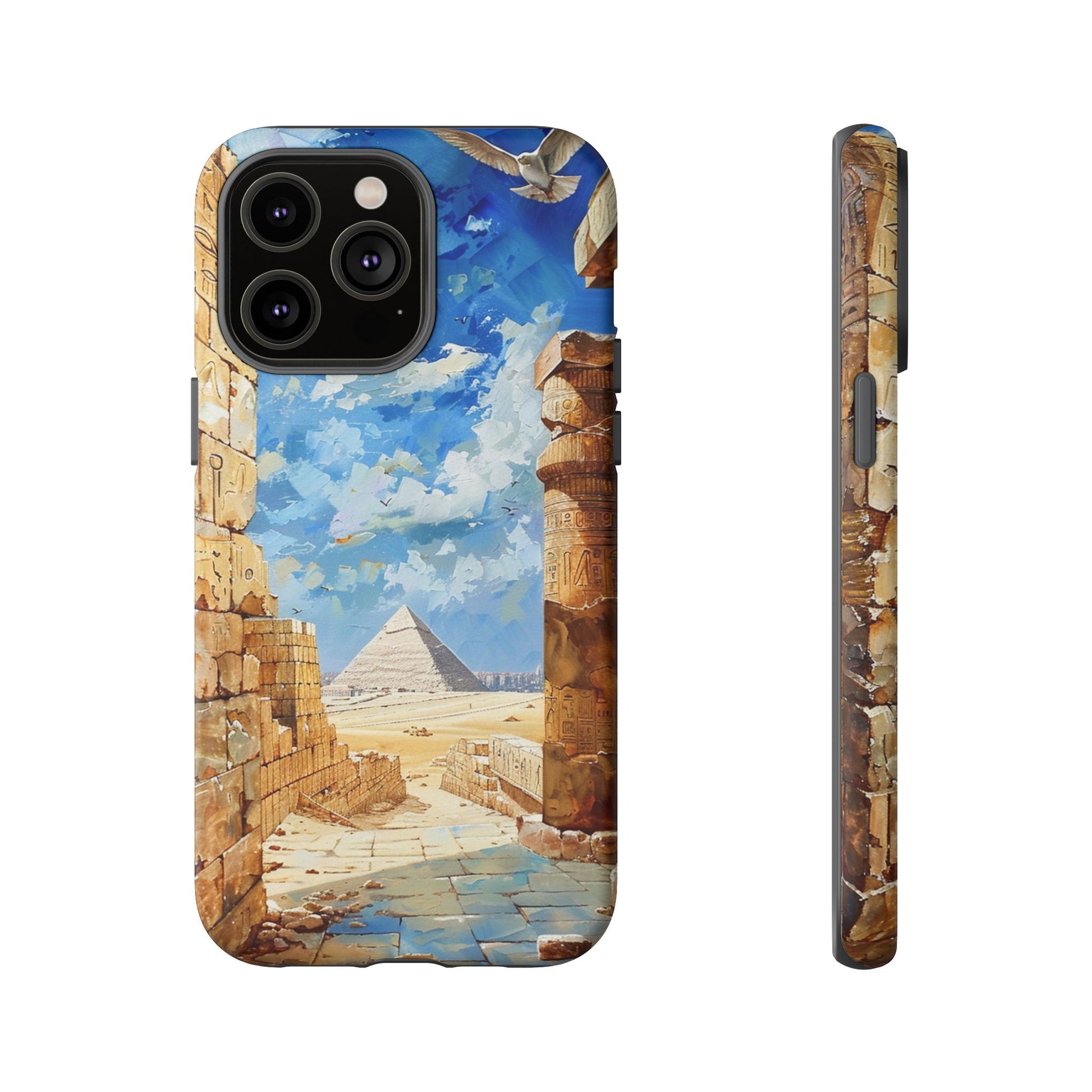 Experience the majestic heritage of Egypt with the "Nile Majesty" phone cover. Showcasing an oil painting of Cairo’s most iconic landmarks—the Great Pyramids, and hieroglyphics—this cover is perfect for anyone captivated by the ancient wonders of Egypt.
