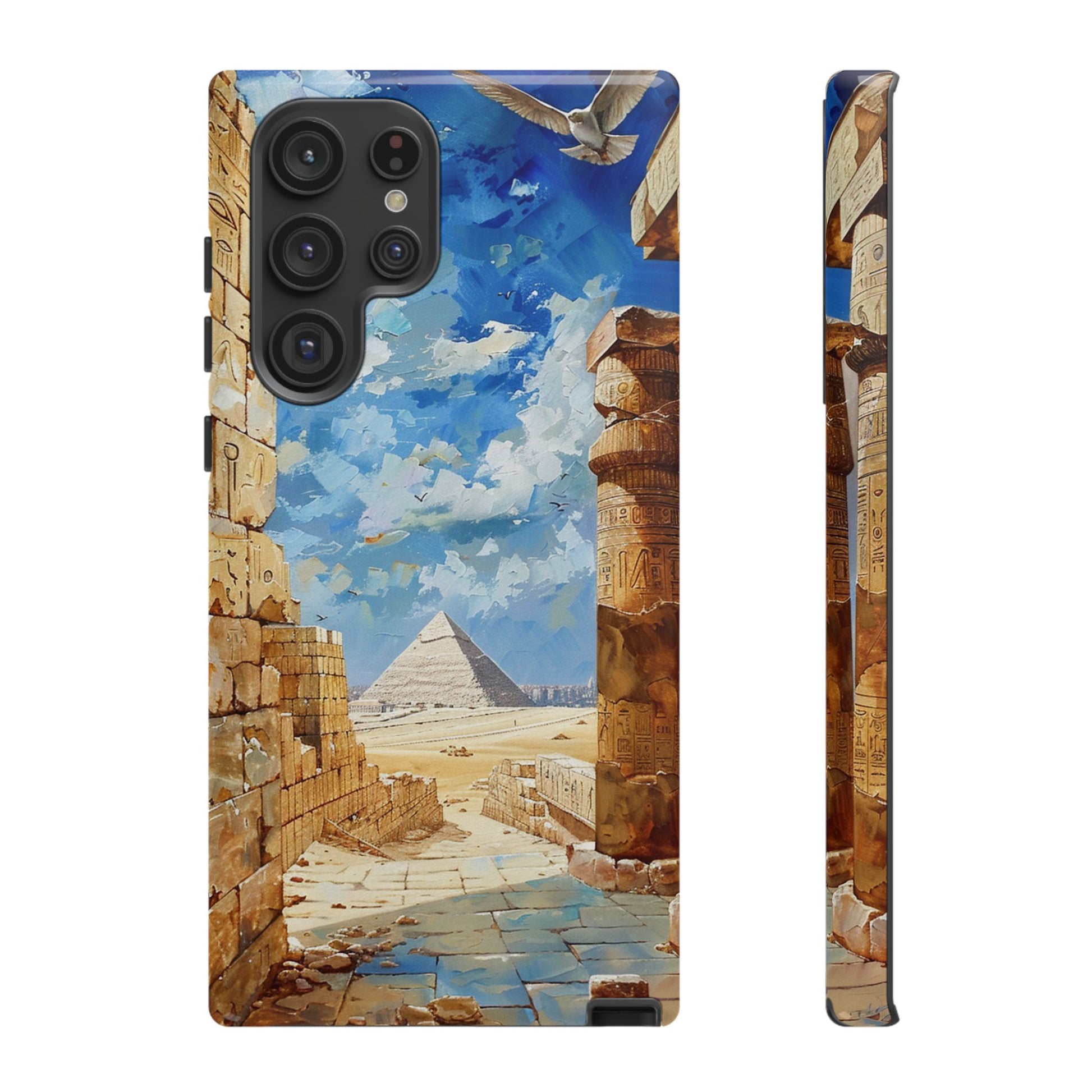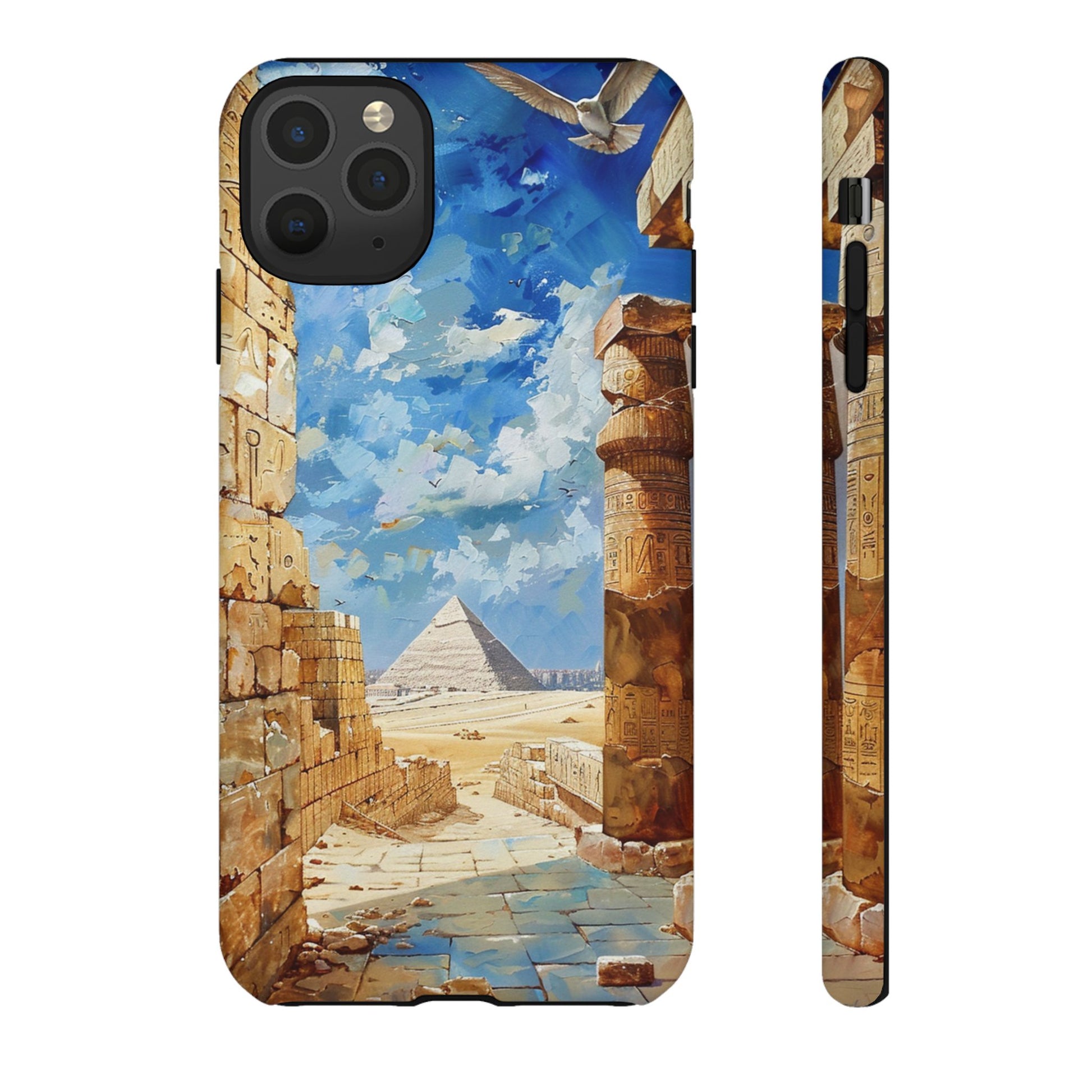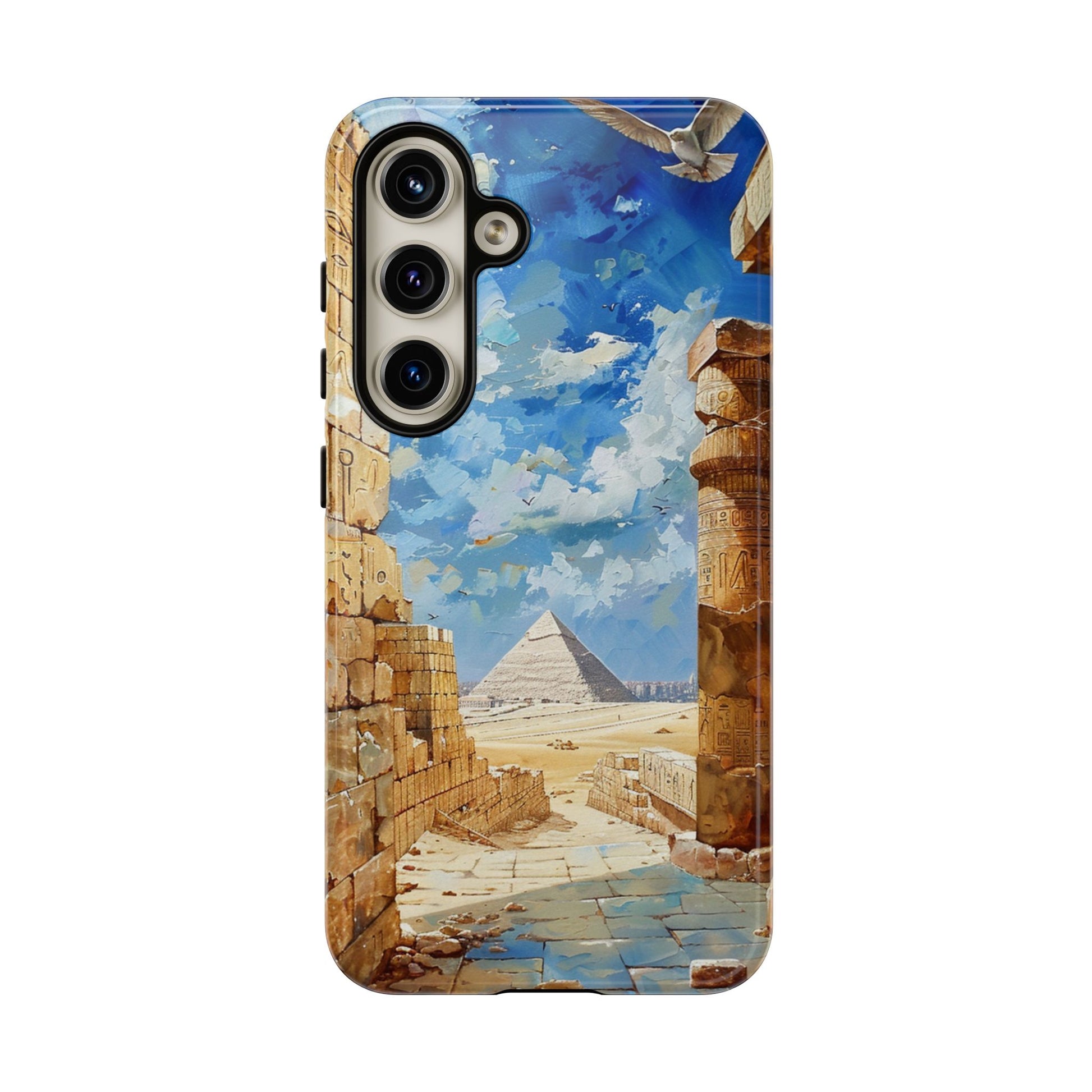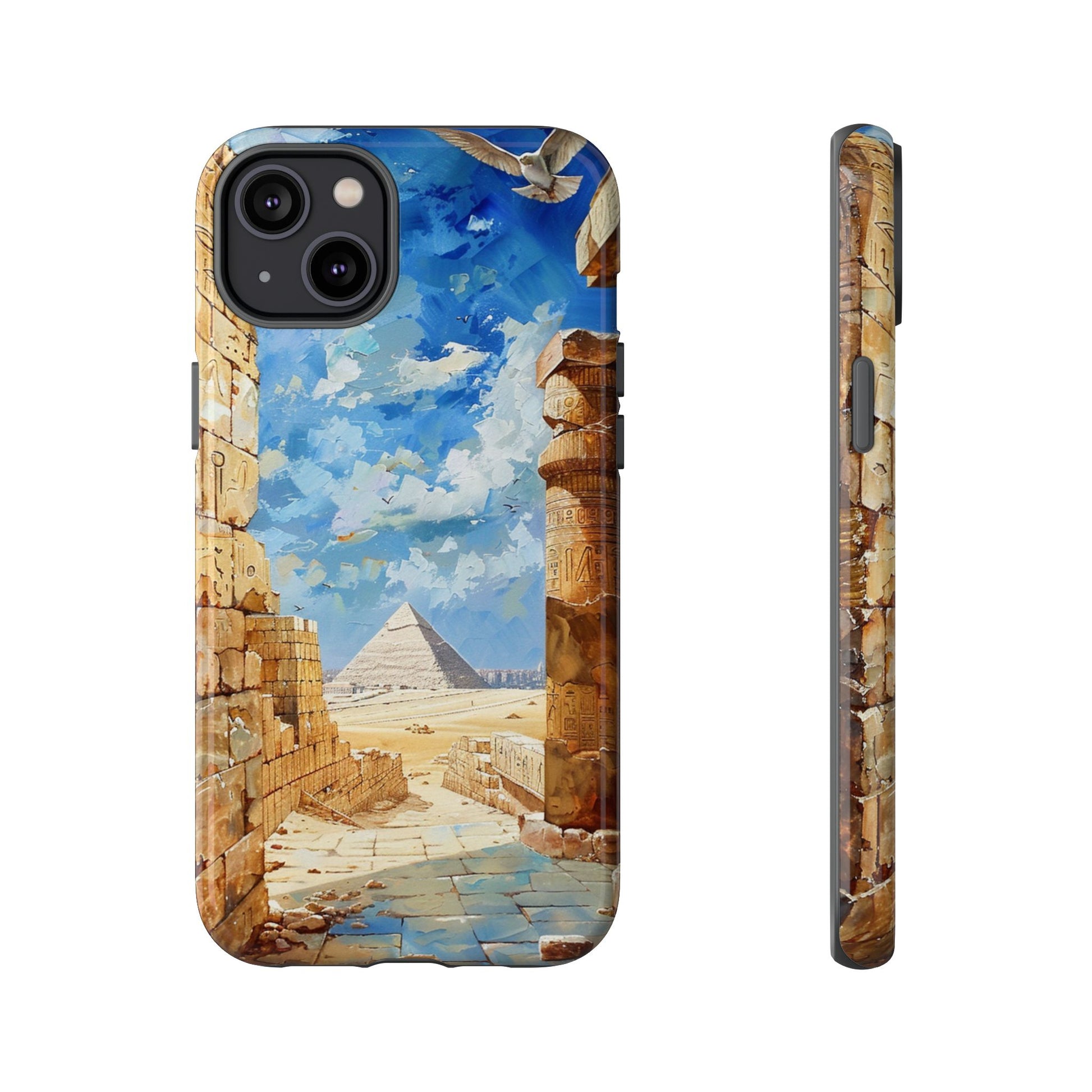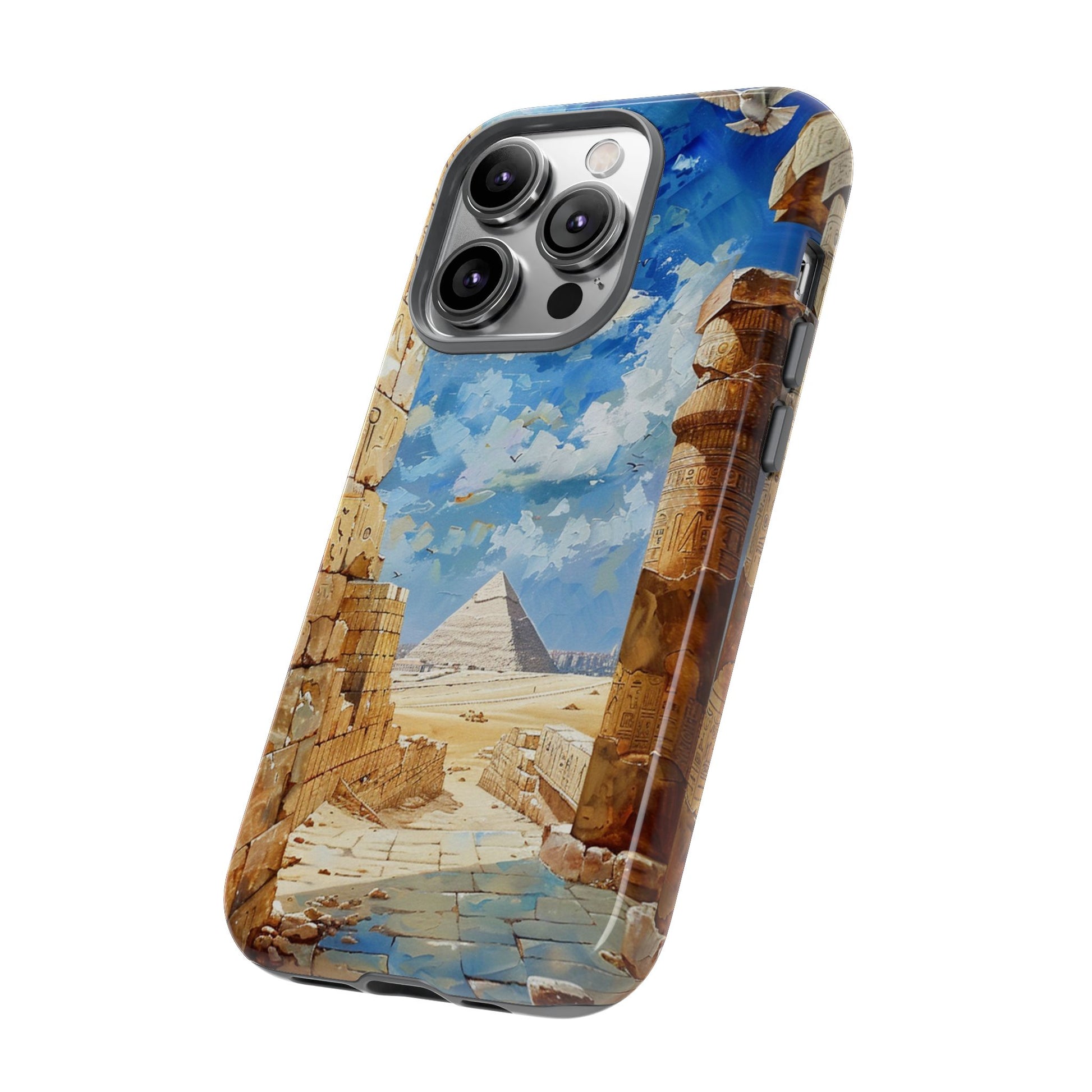 Experience the majestic heritage of Egypt with the "Nile Majesty" phone cover. Showcasing an oil painting of Cairo’s most iconic landmarks—the Great Pyramids, and hieroglyphics—this cover is perfect for anyone captivated by the ancient wonders of Egypt.