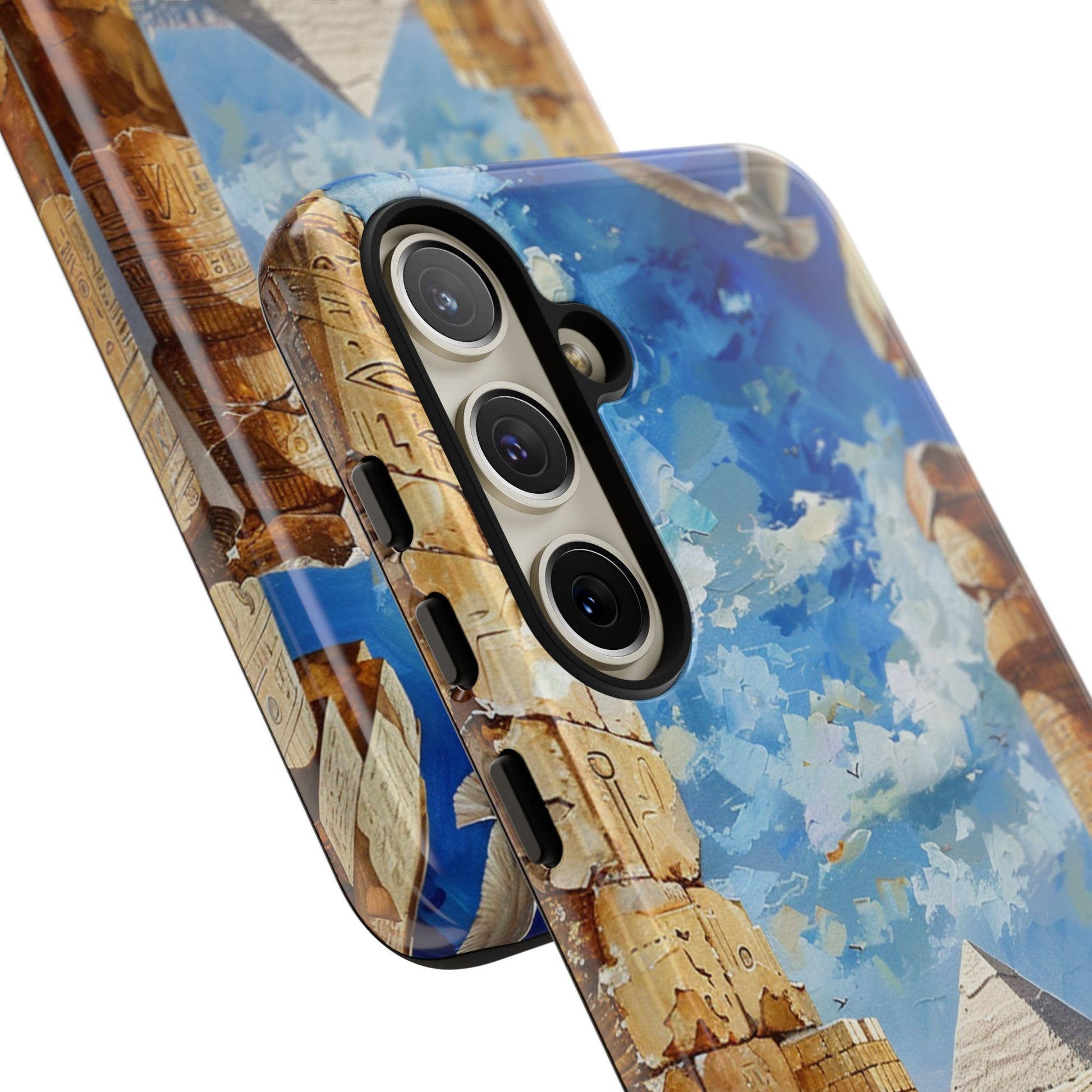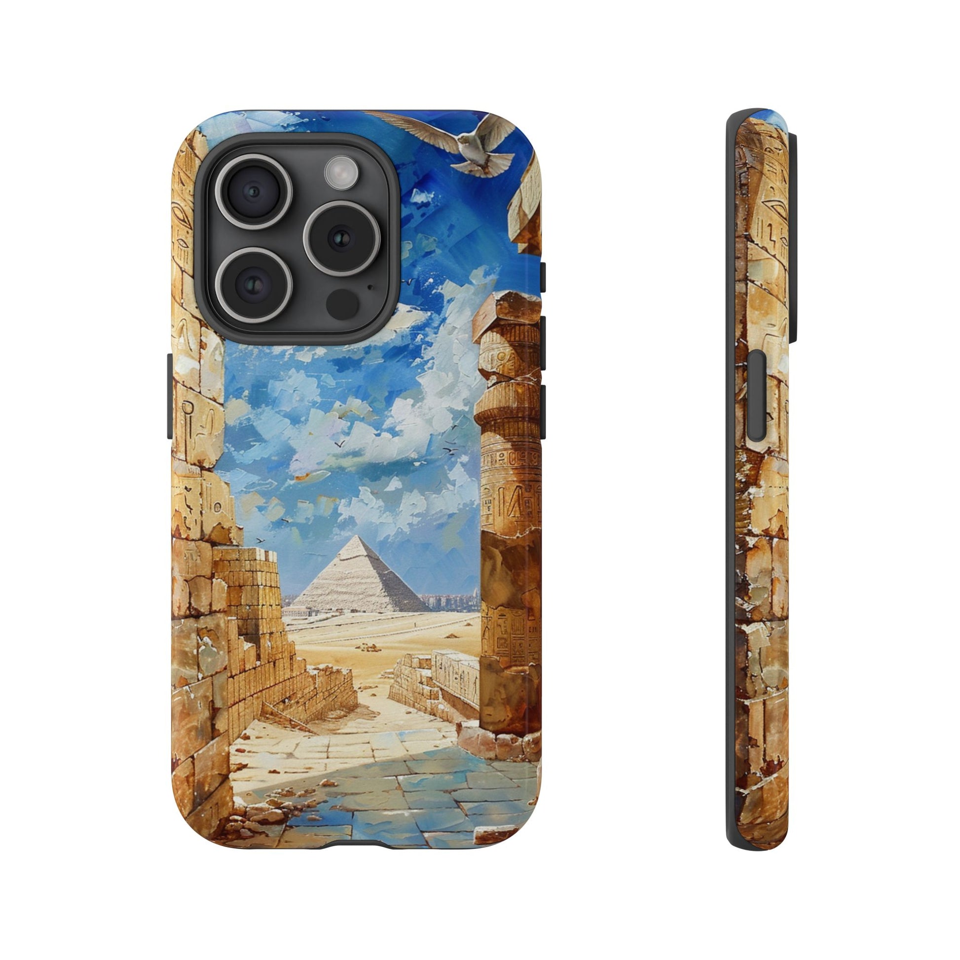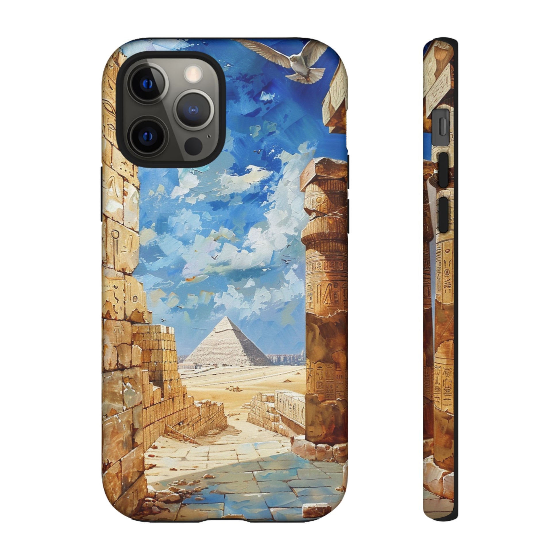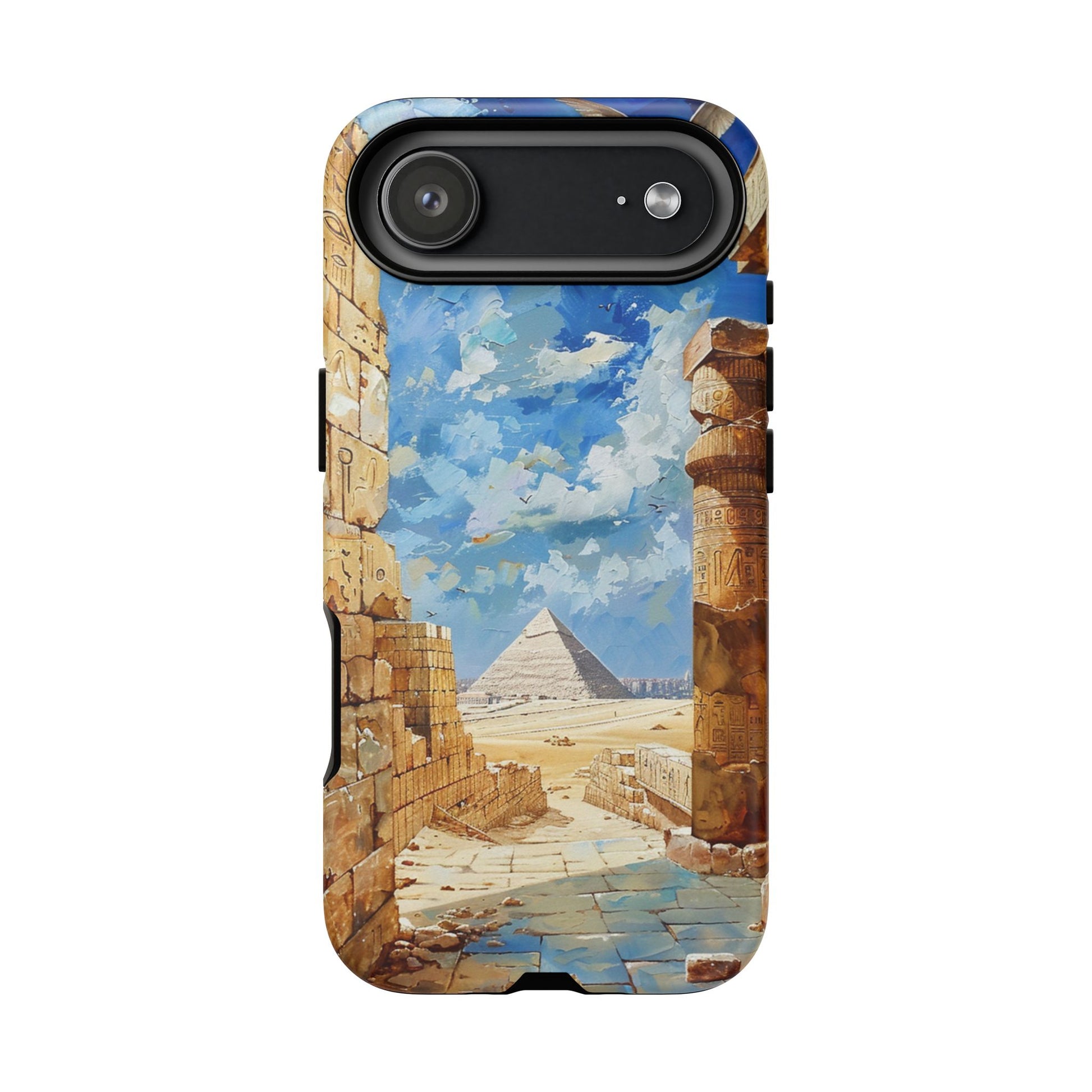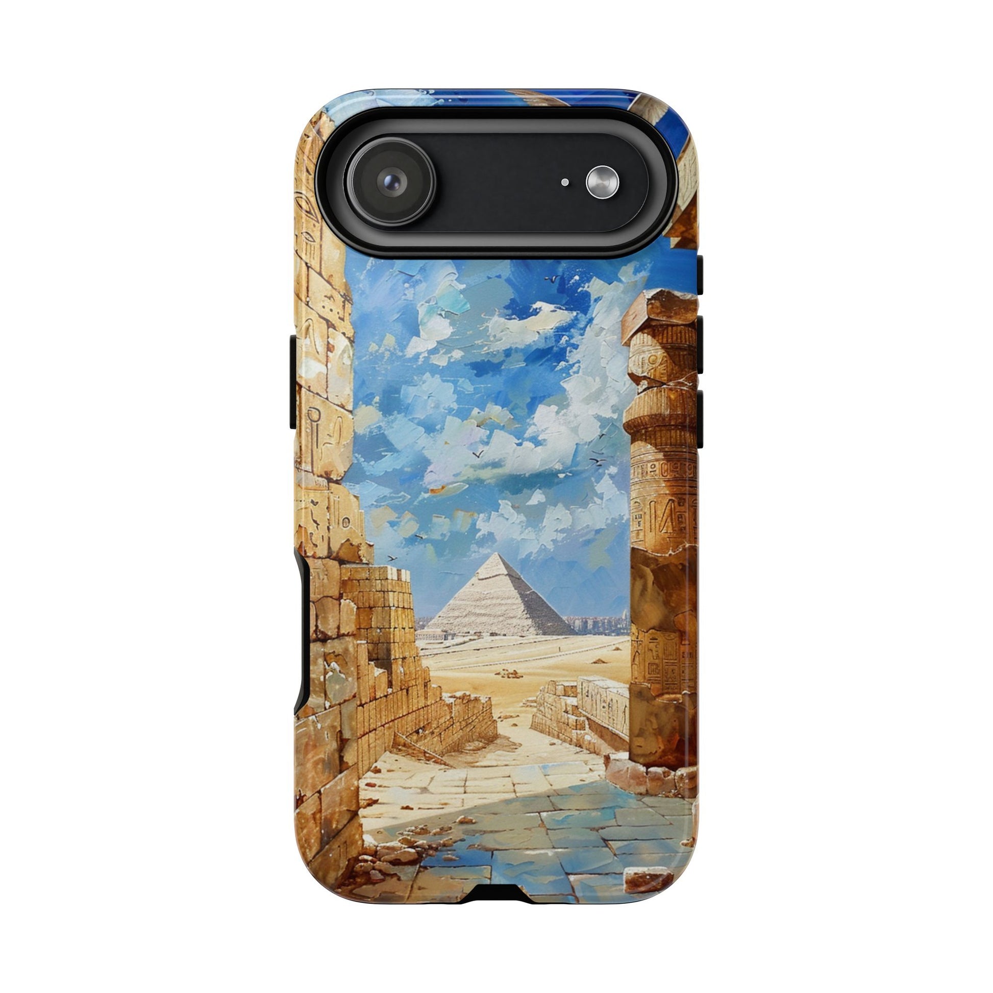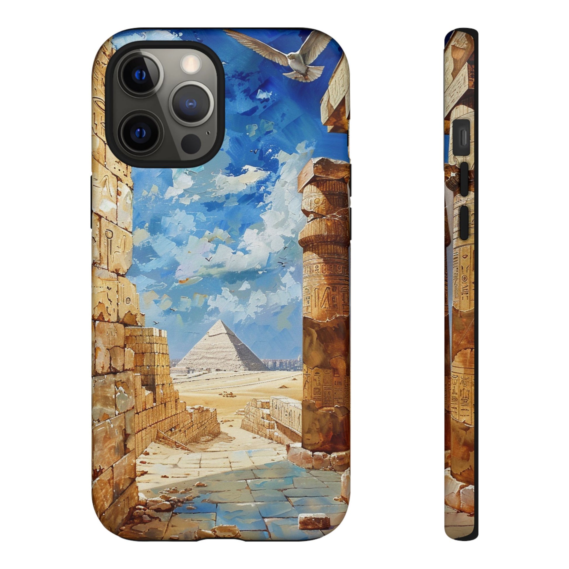 Experience the majestic heritage of Egypt with the "Nile Majesty" phone cover. Showcasing an oil painting of Cairo’s most iconic landmarks—the Great Pyramids, and hieroglyphics—this cover is perfect for anyone captivated by the ancient wonders of Egypt.