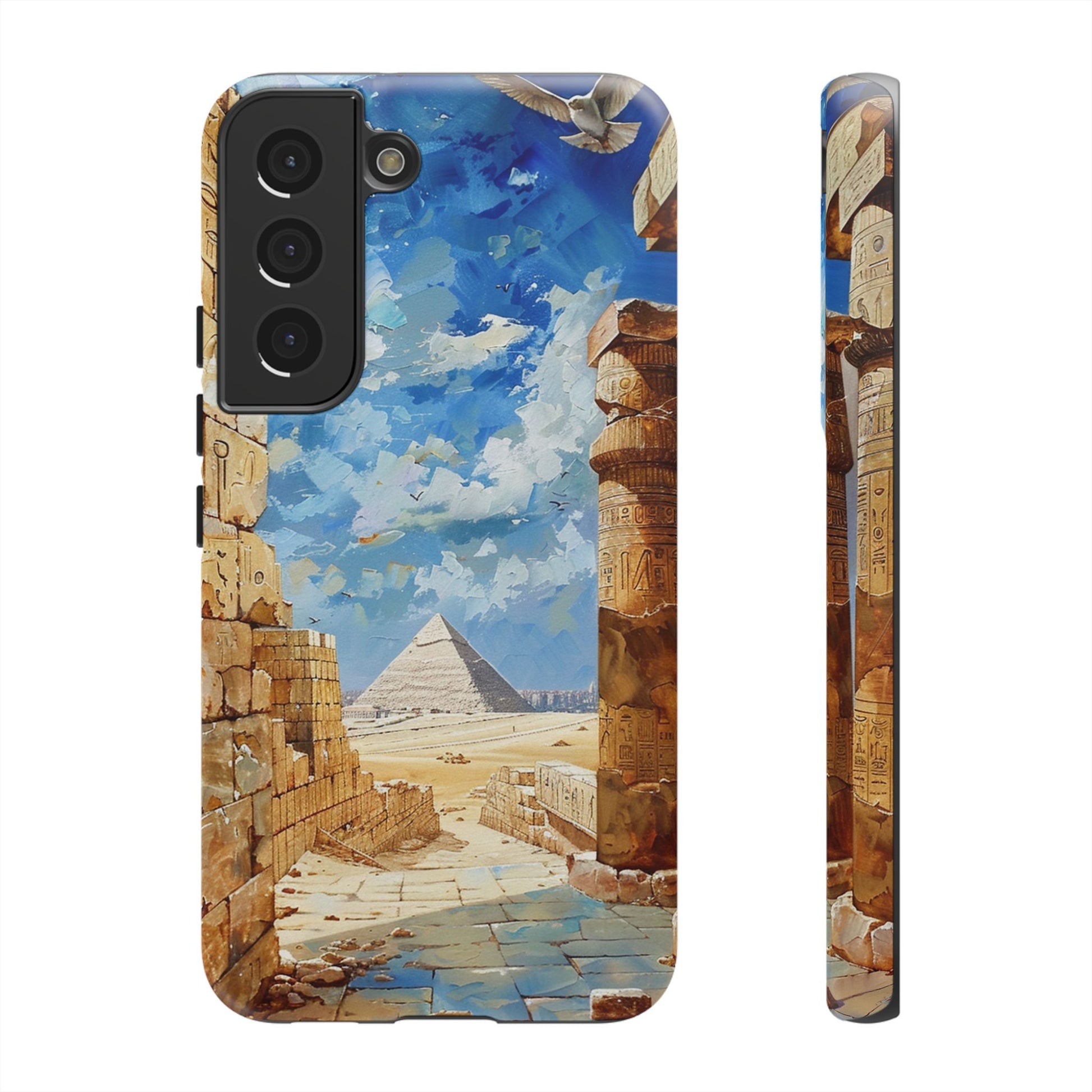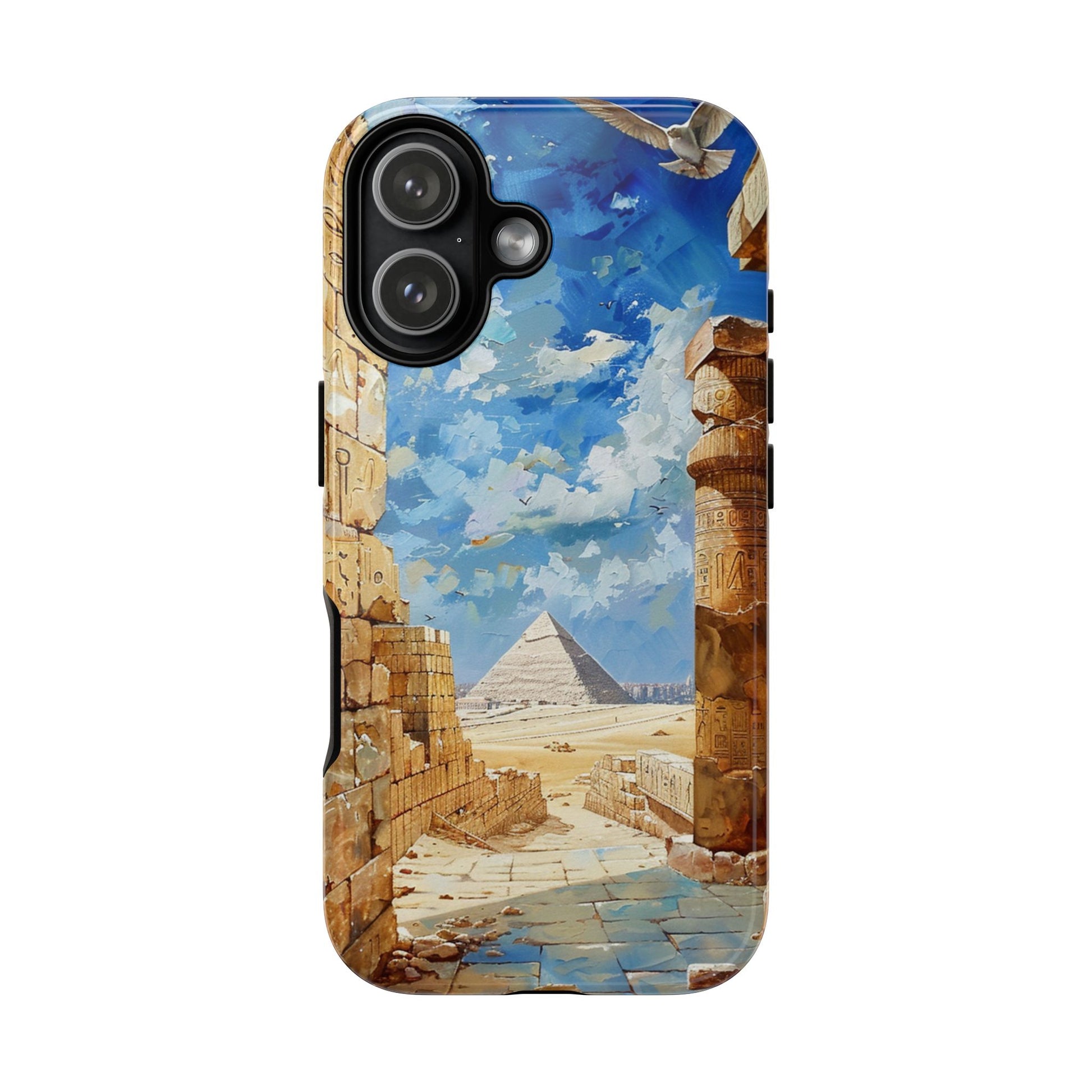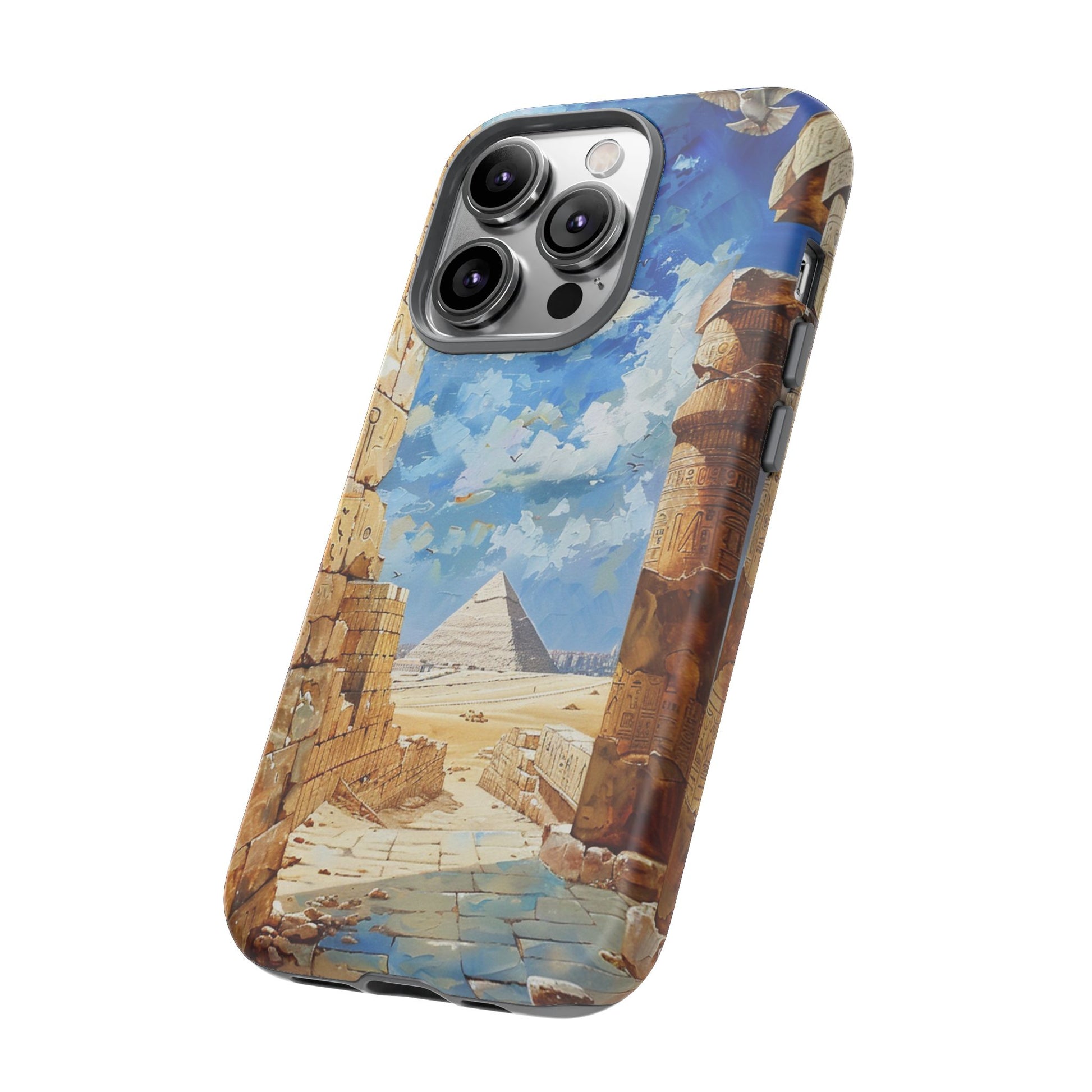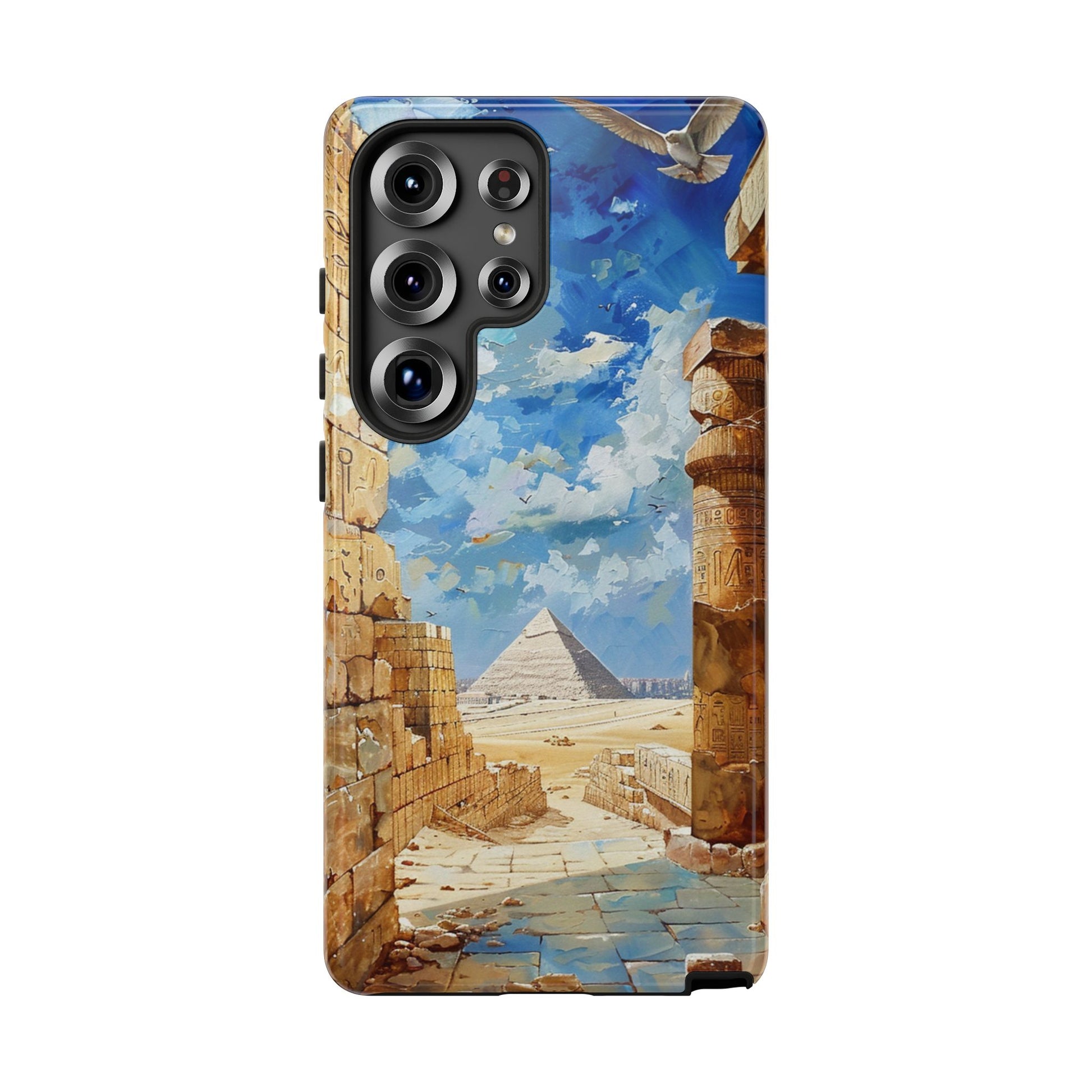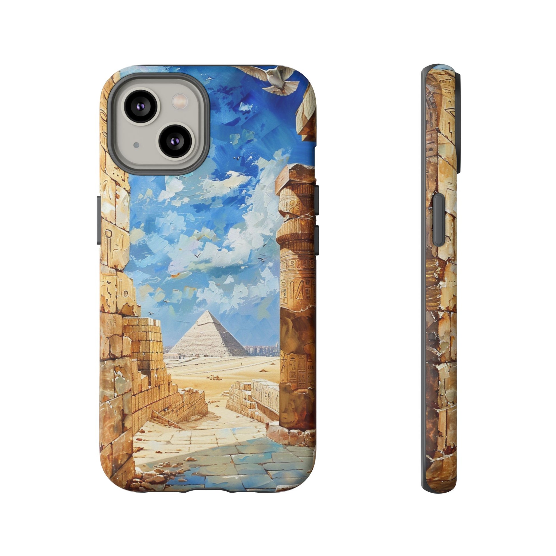 Experience the majestic heritage of Egypt with the "Nile Majesty" phone cover. Showcasing an oil painting of Cairo’s most iconic landmarks—the Great Pyramids, and hieroglyphics—this cover is perfect for anyone captivated by the ancient wonders of Egypt.