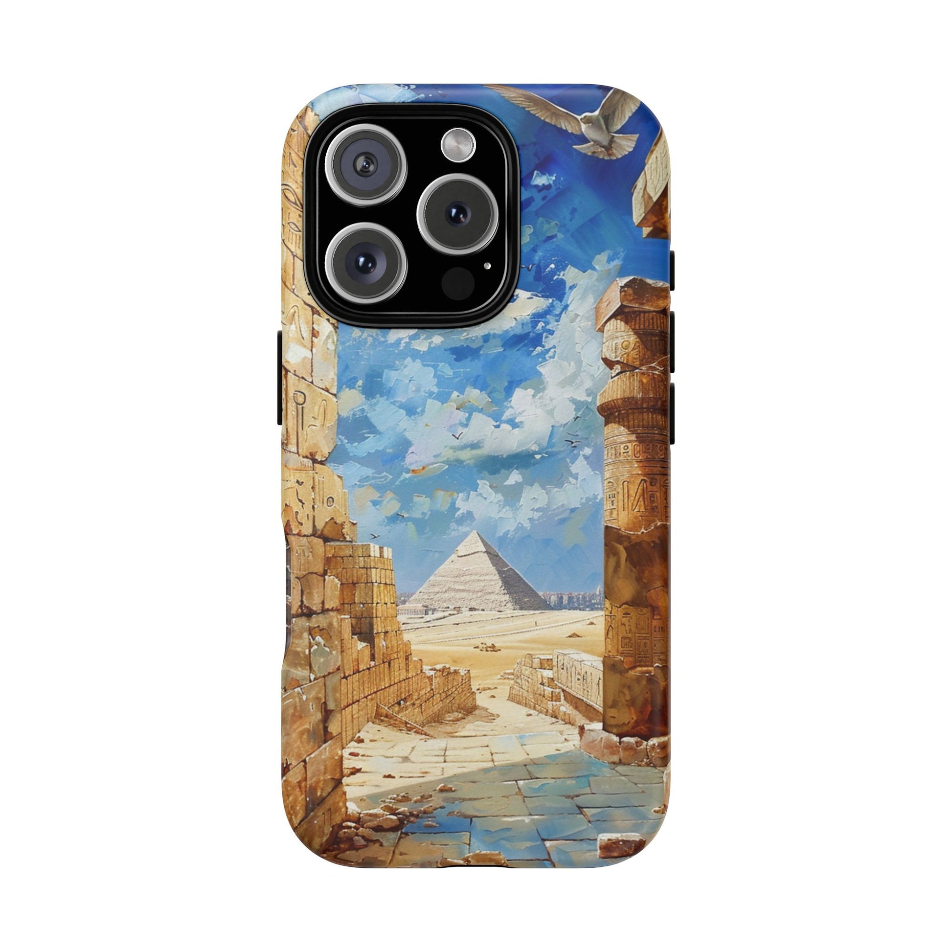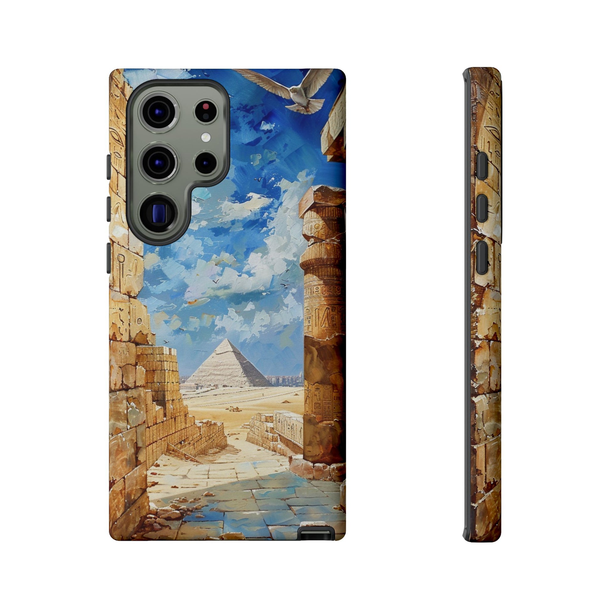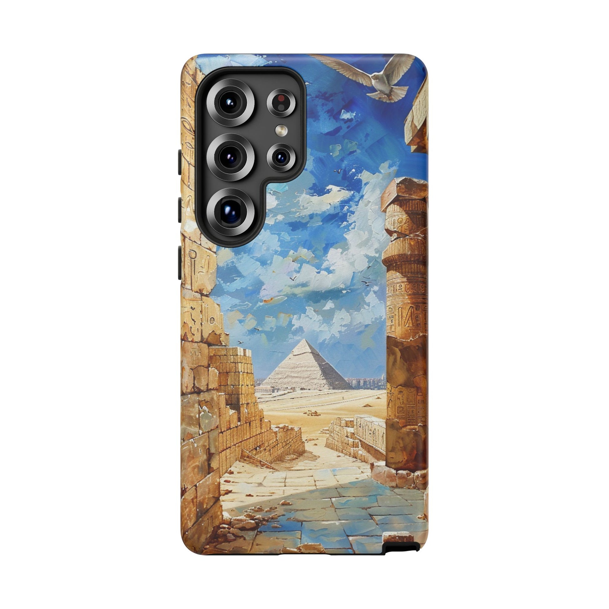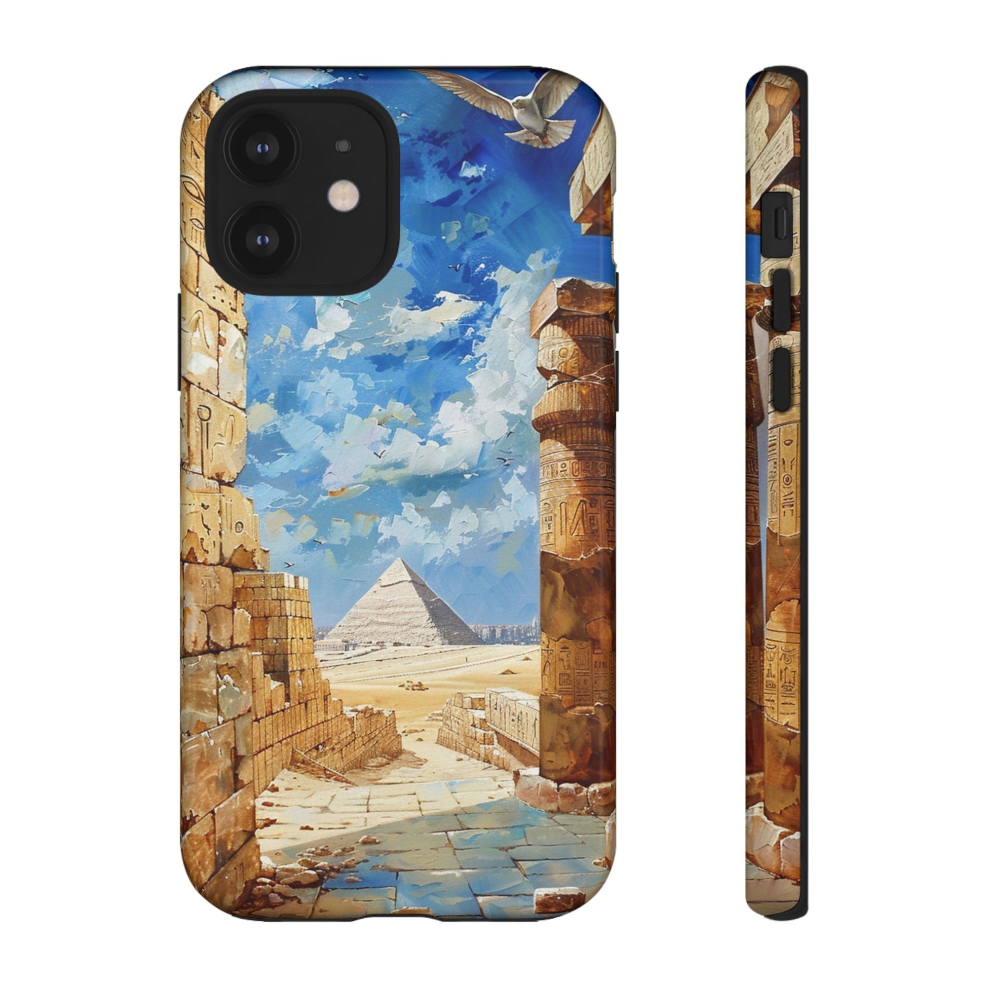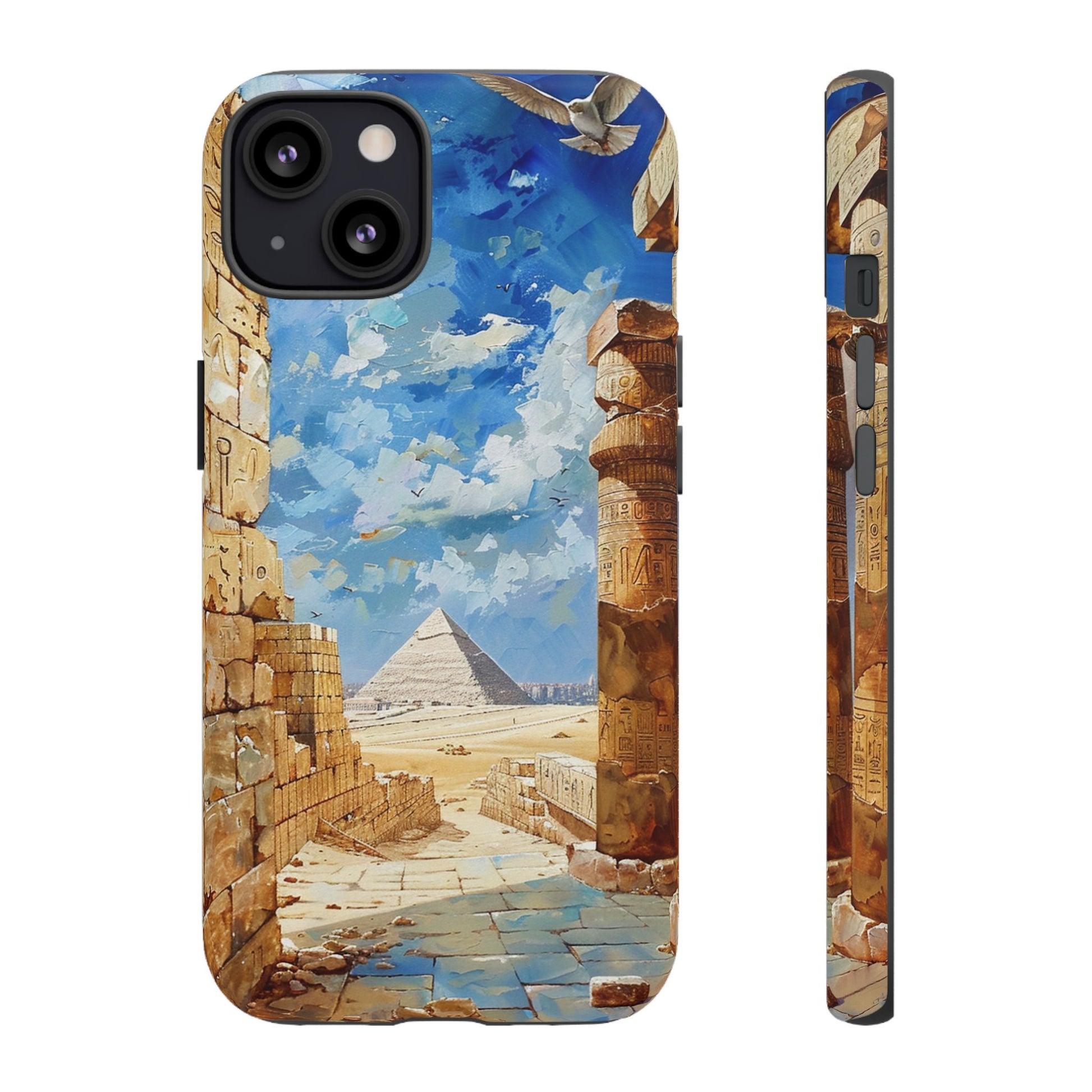 Experience the majestic heritage of Egypt with the "Nile Majesty" phone cover. Showcasing an oil painting of Cairo’s most iconic landmarks—the Great Pyramids, and hieroglyphics—this cover is perfect for anyone captivated by the ancient wonders of Egypt.