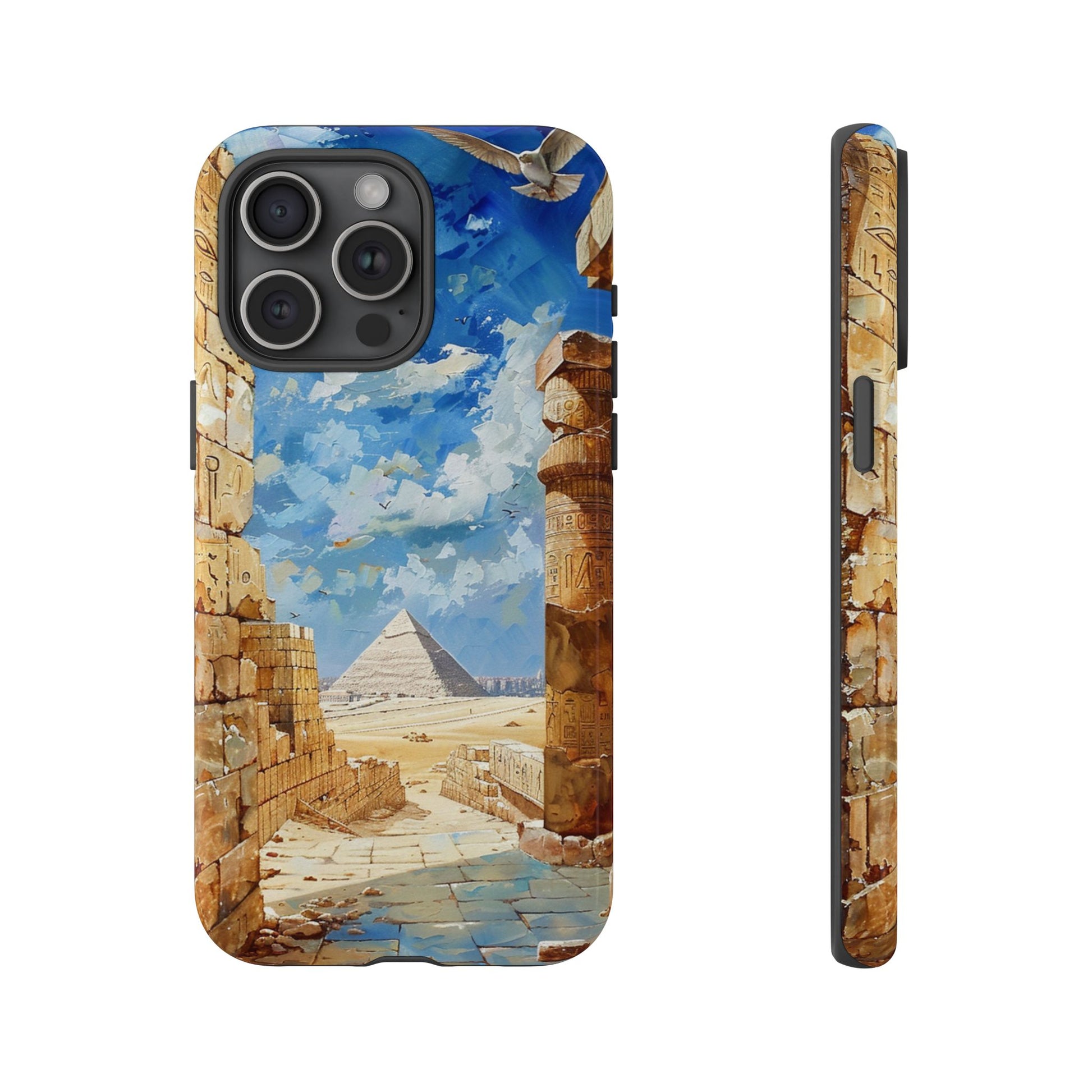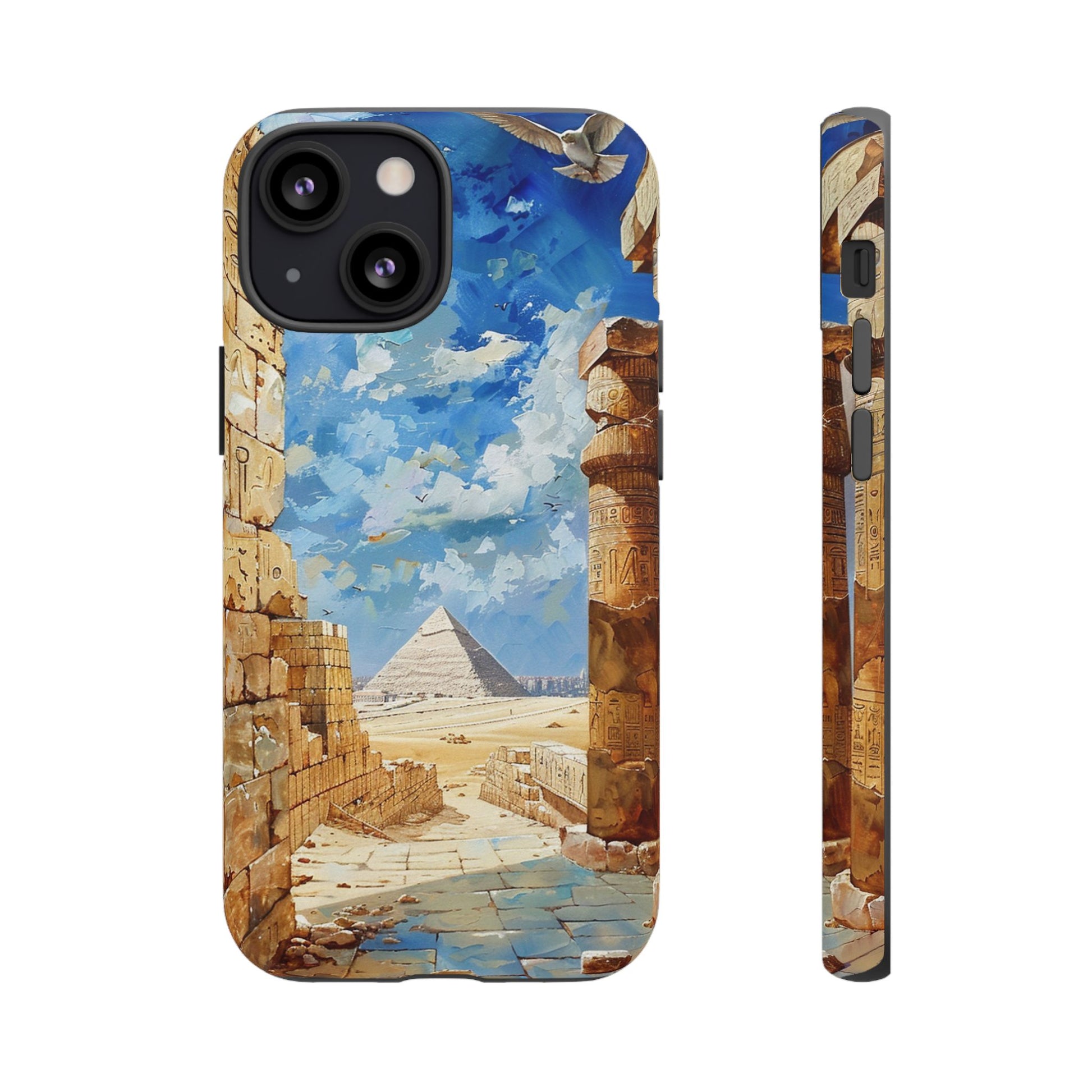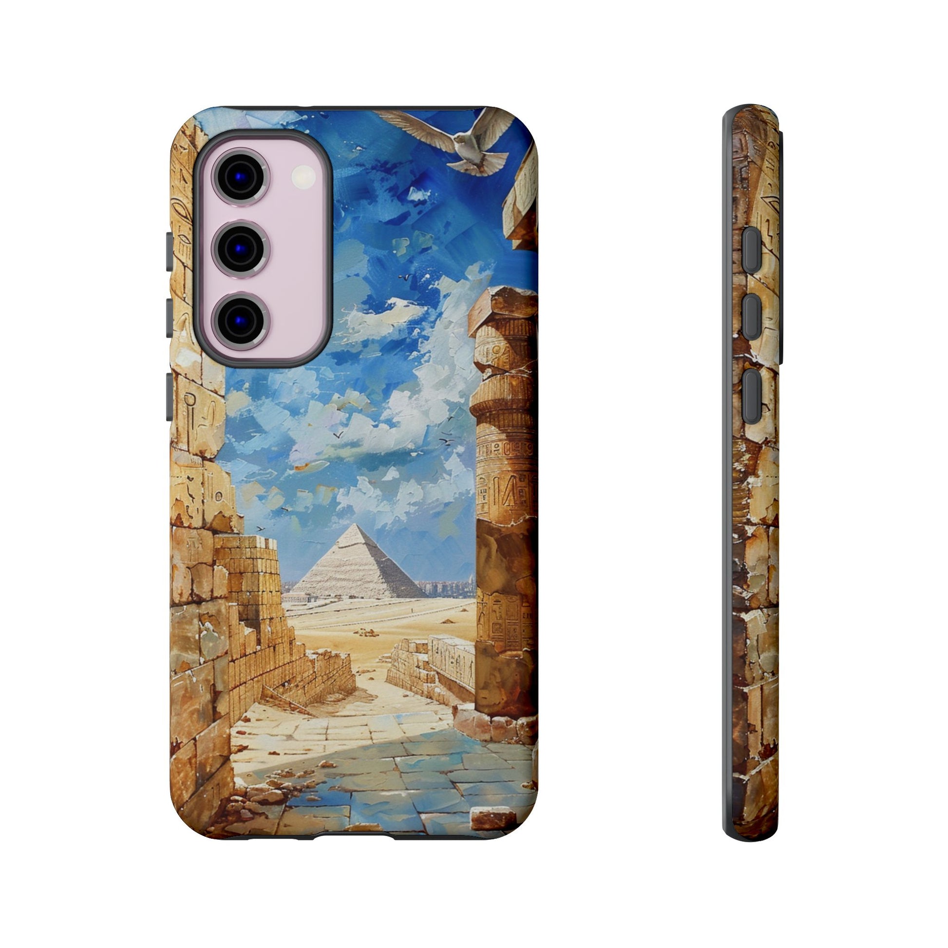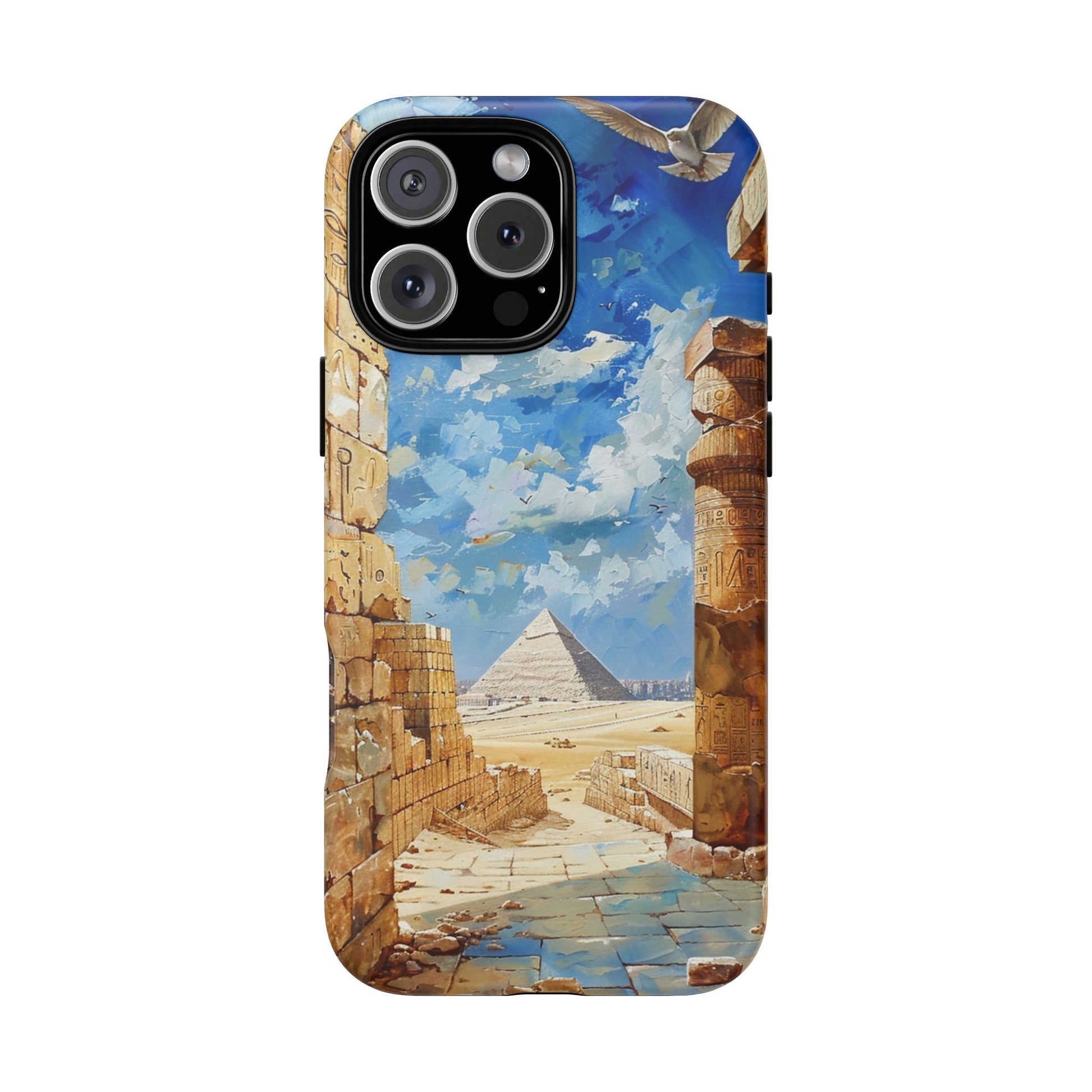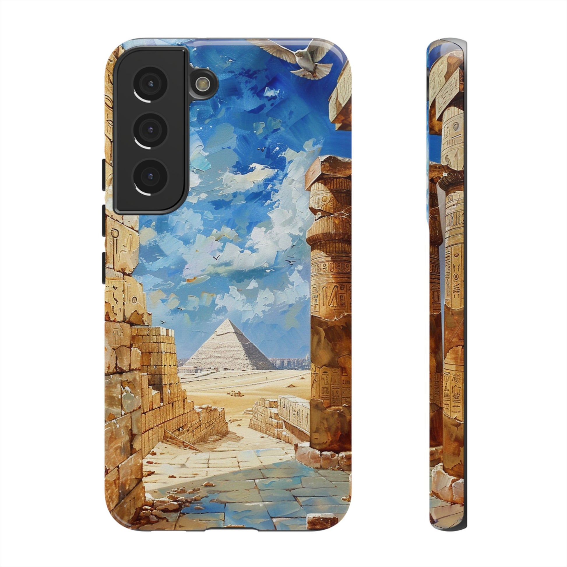 Experience the majestic heritage of Egypt with the "Nile Majesty" phone cover. Showcasing an oil painting of Cairo’s most iconic landmarks—the Great Pyramids, and hieroglyphics—this cover is perfect for anyone captivated by the ancient wonders of Egypt.