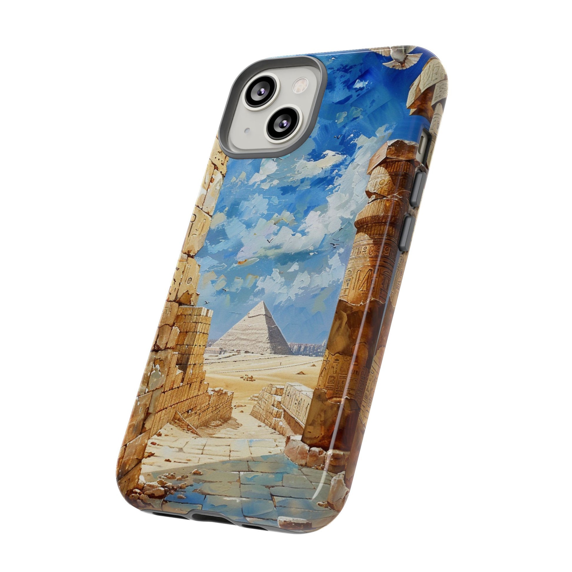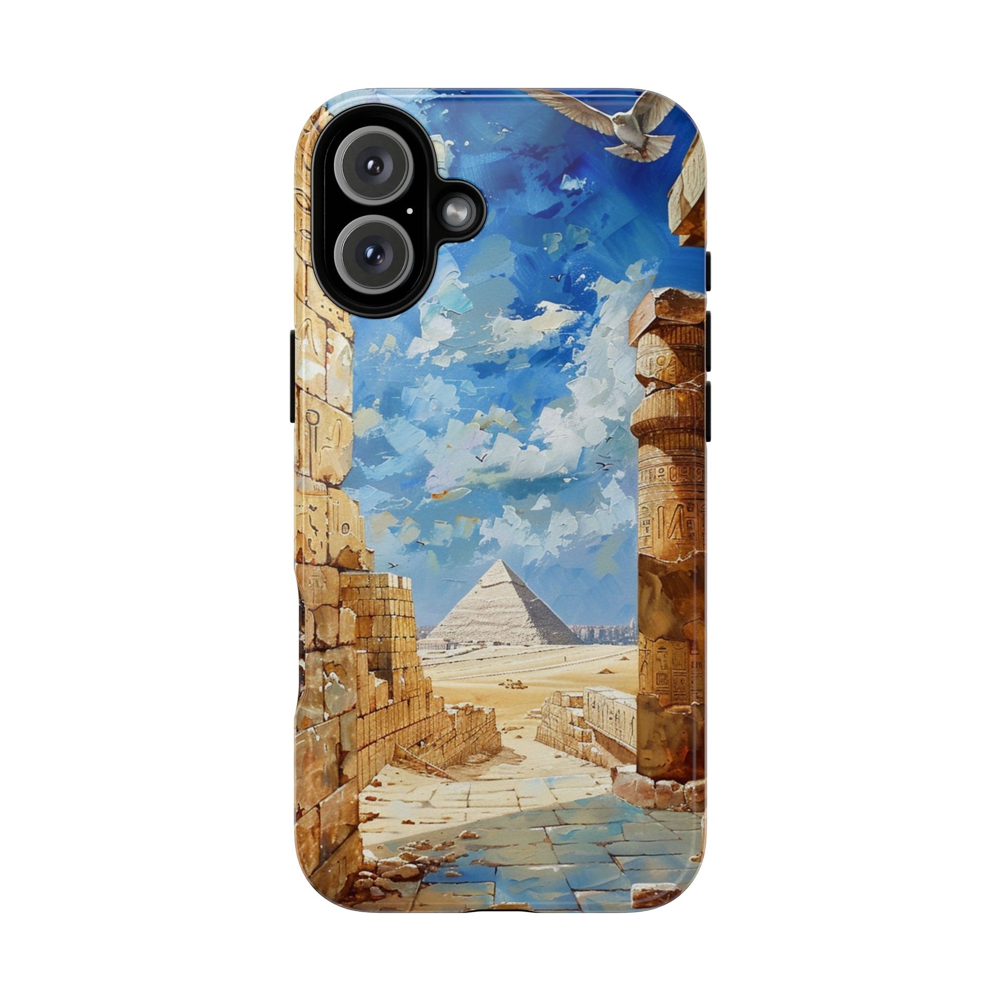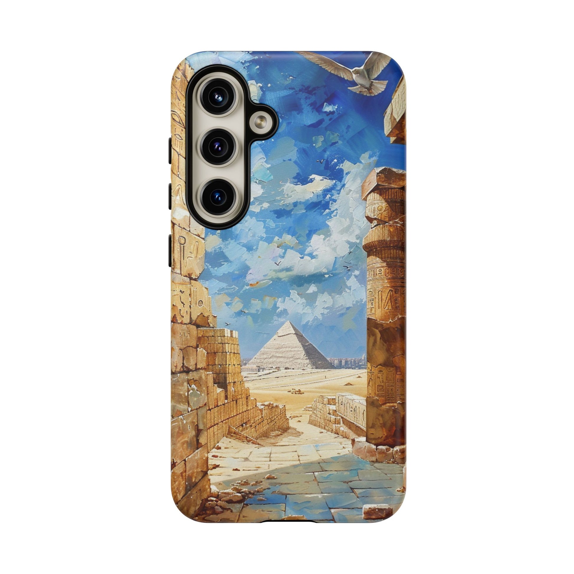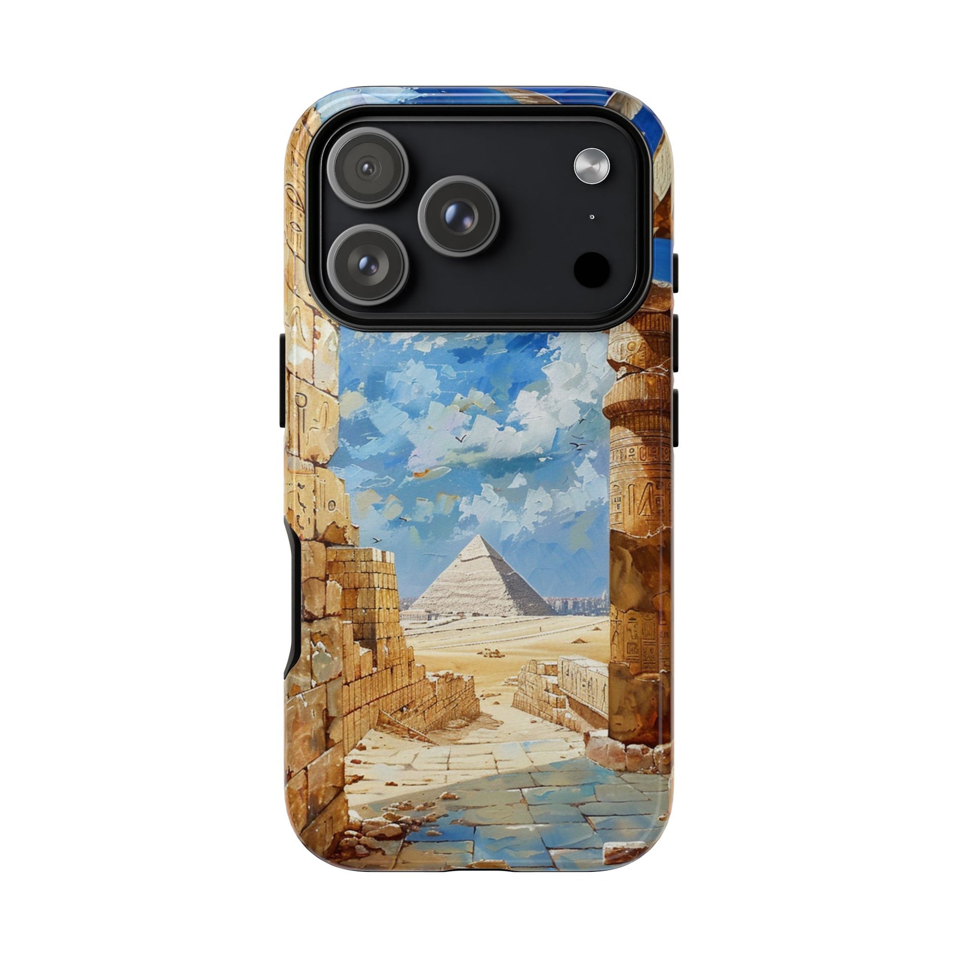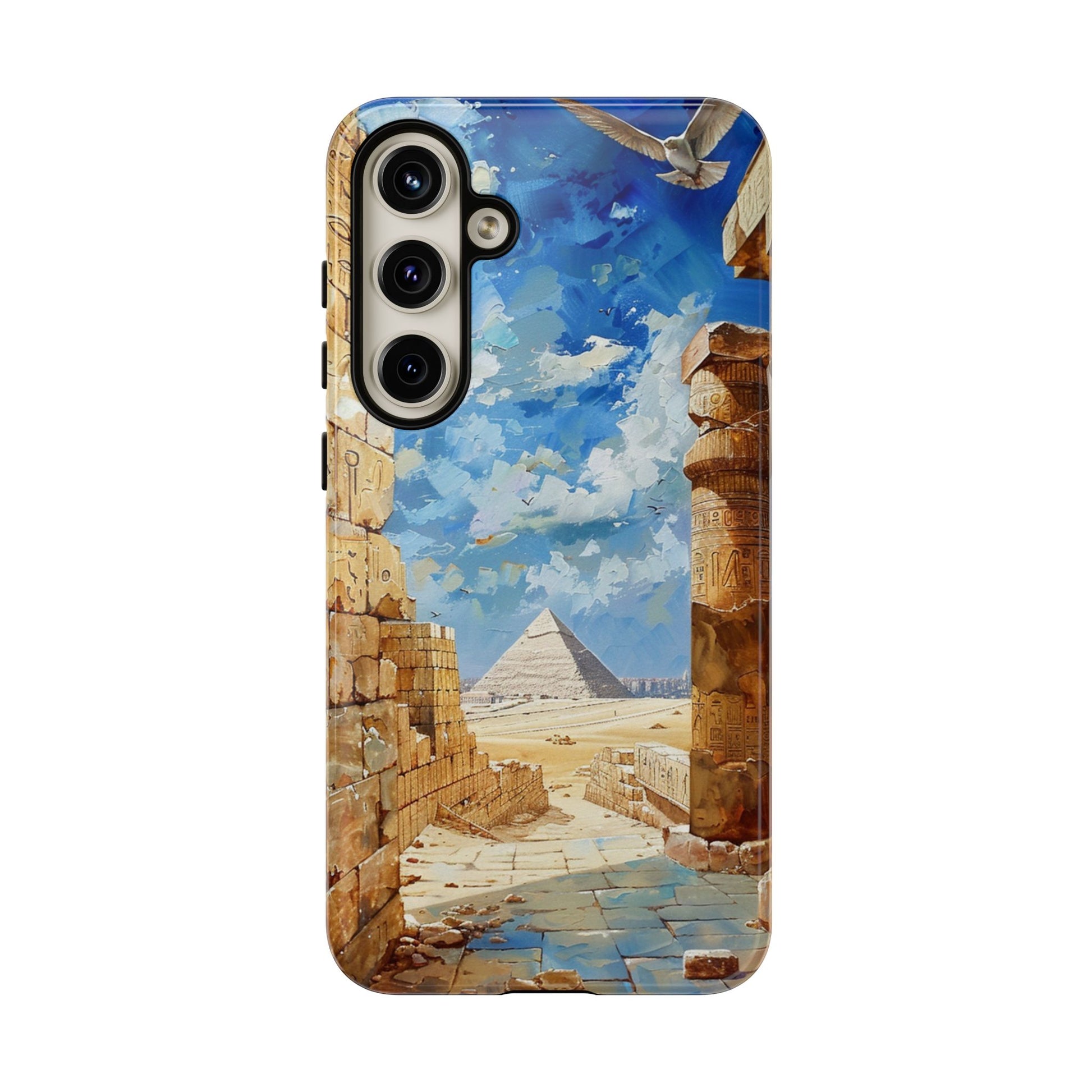 Experience the majestic heritage of Egypt with the "Nile Majesty" phone cover. Showcasing an oil painting of Cairo’s most iconic landmarks—the Great Pyramids, and hieroglyphics—this cover is perfect for anyone captivated by the ancient wonders of Egypt.