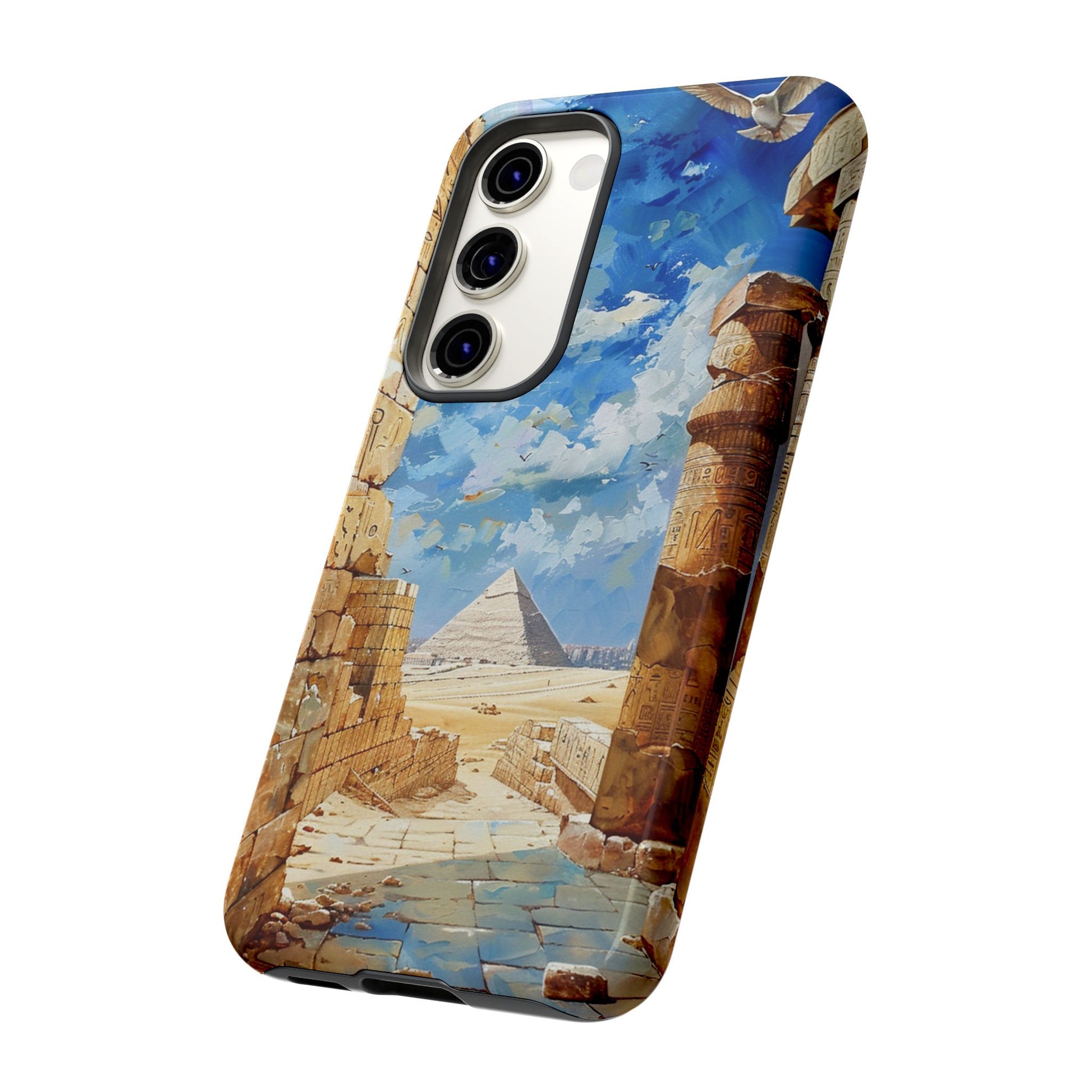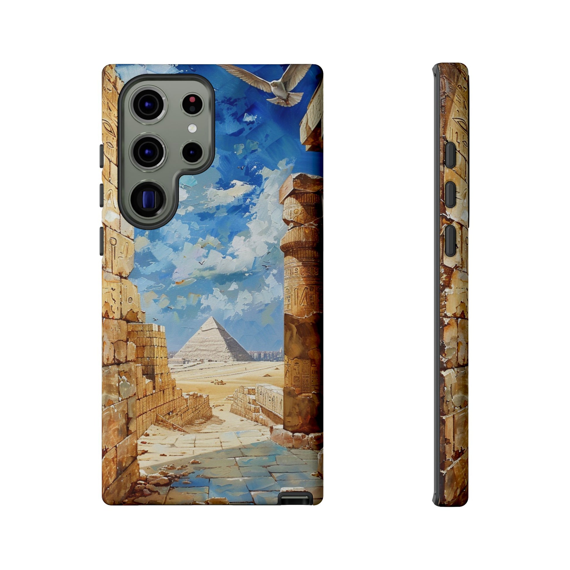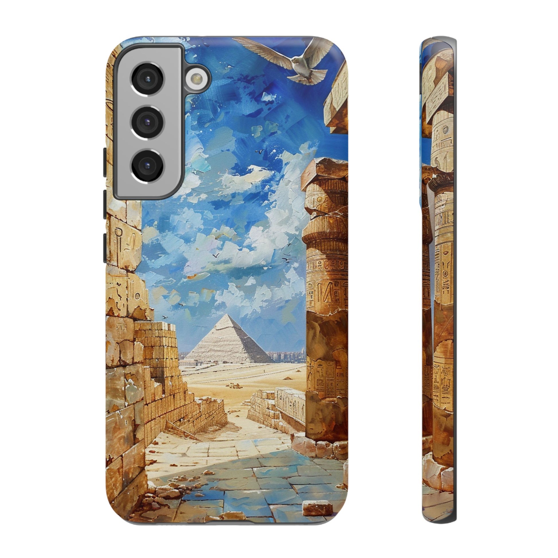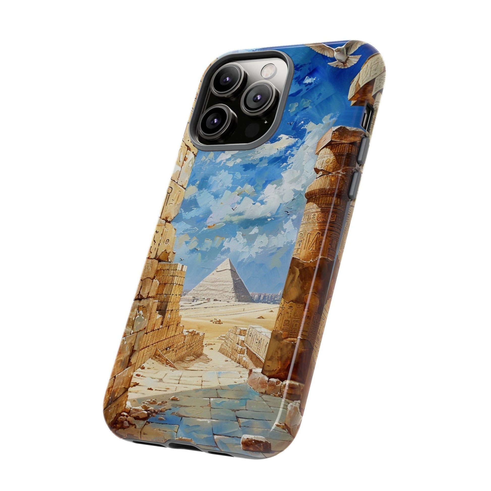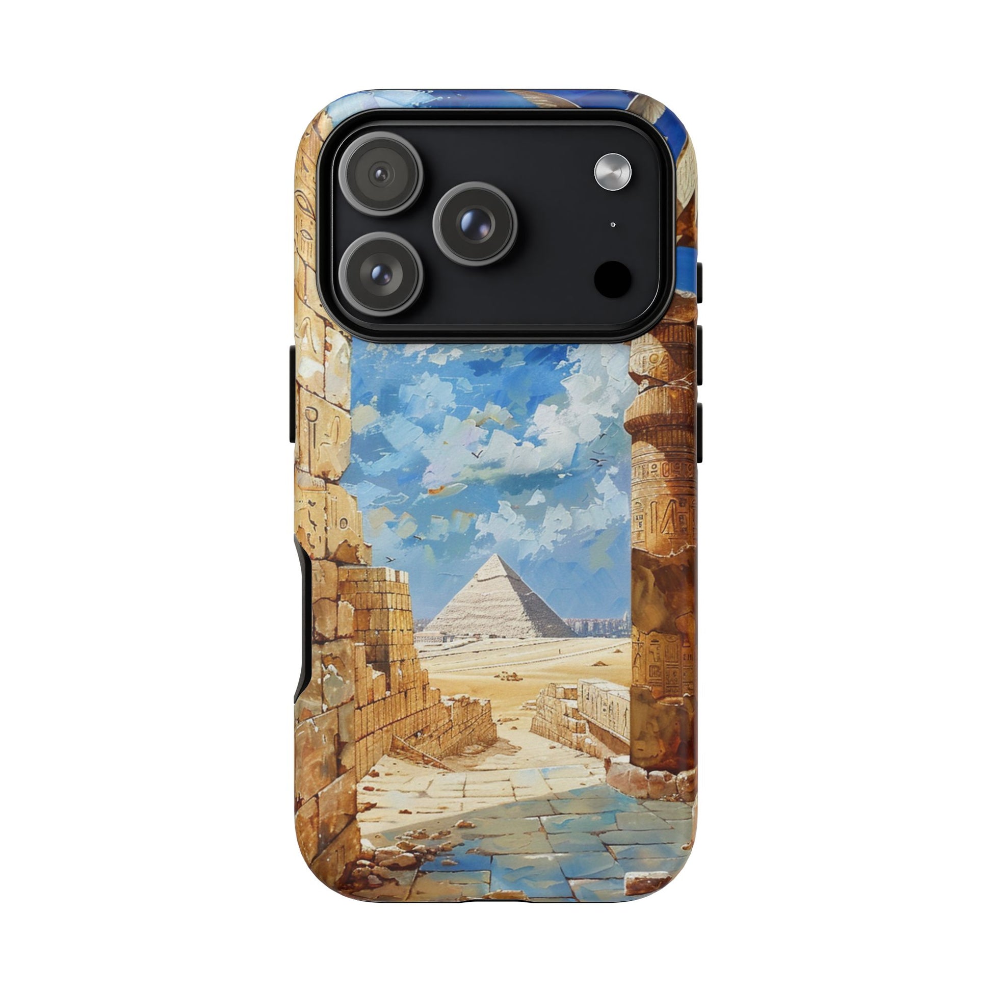 Experience the majestic heritage of Egypt with the "Nile Majesty" phone cover. Showcasing an oil painting of Cairo’s most iconic landmarks—the Great Pyramids, and hieroglyphics—this cover is perfect for anyone captivated by the ancient wonders of Egypt.
