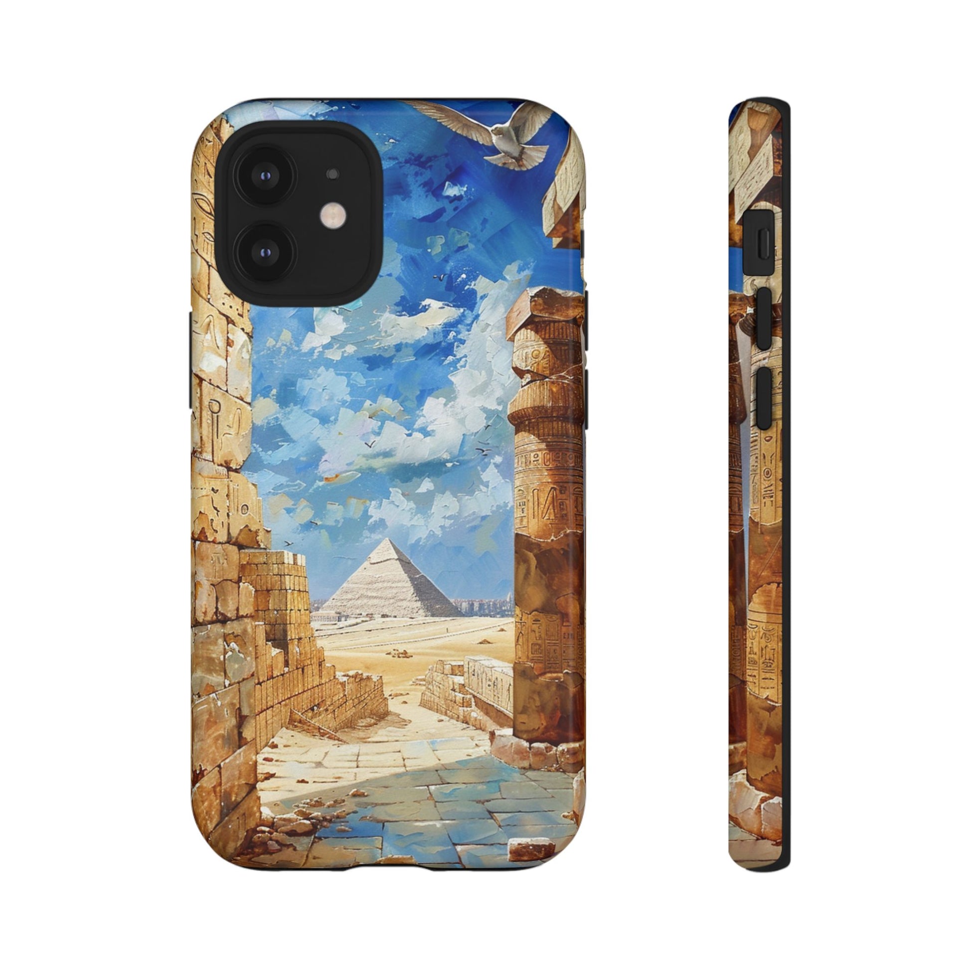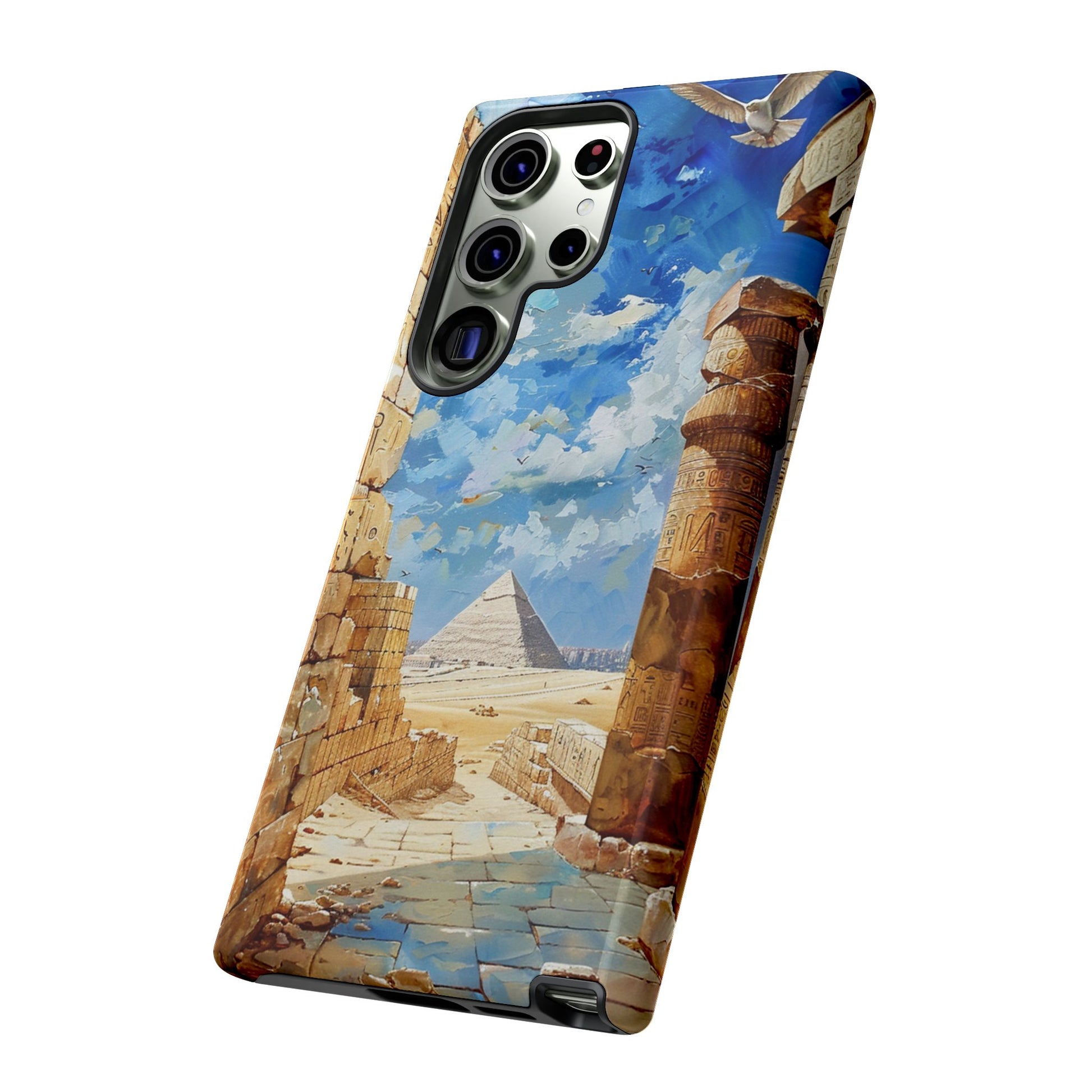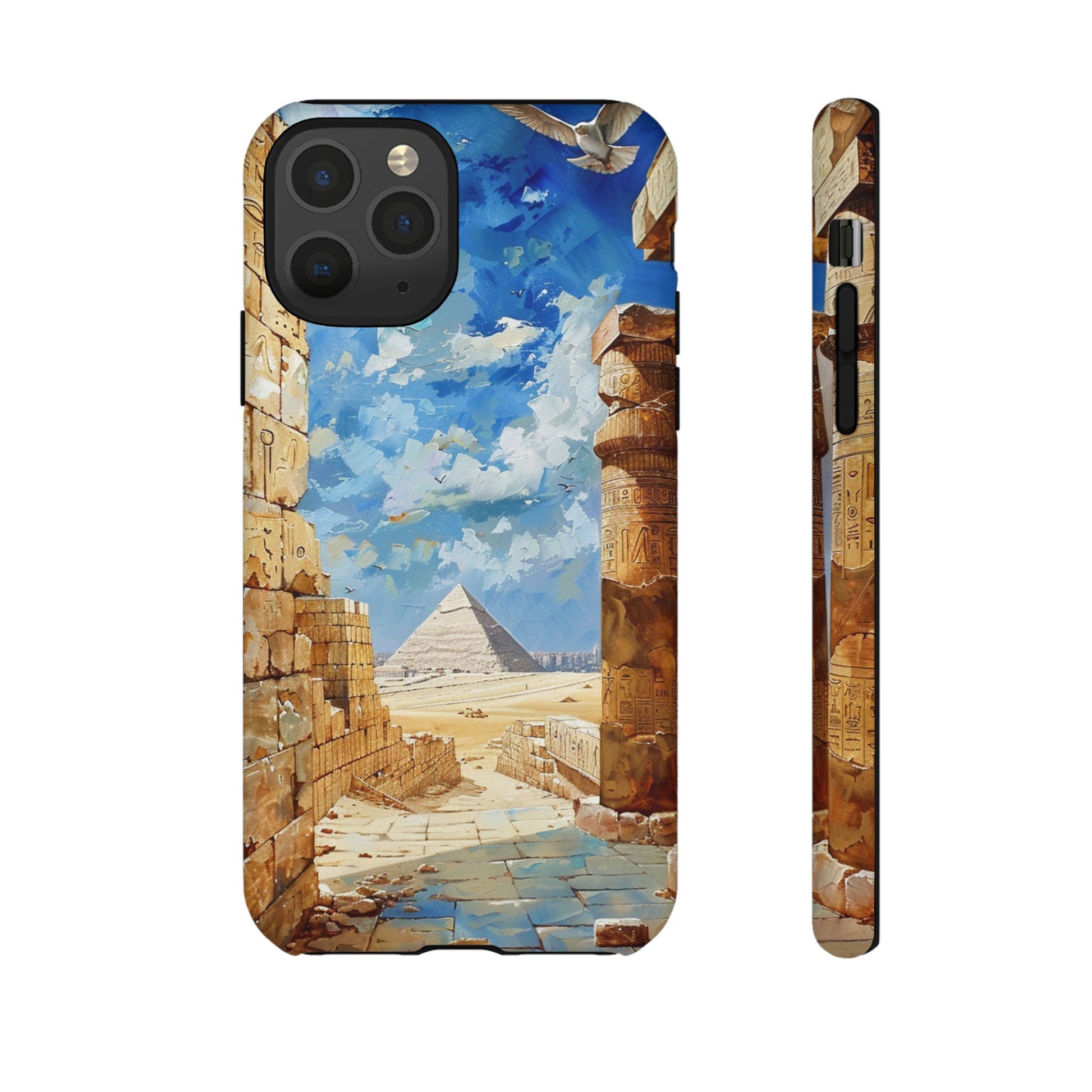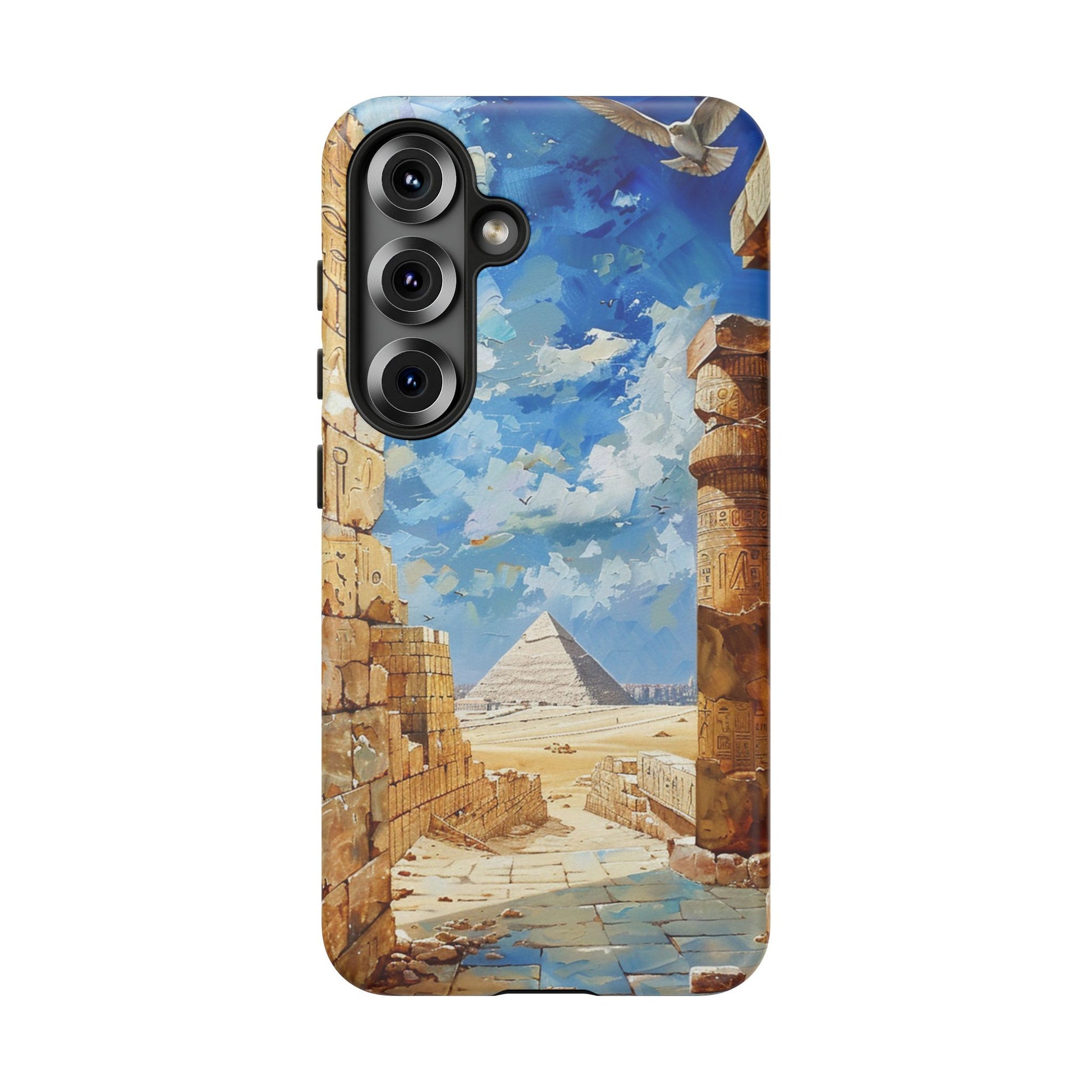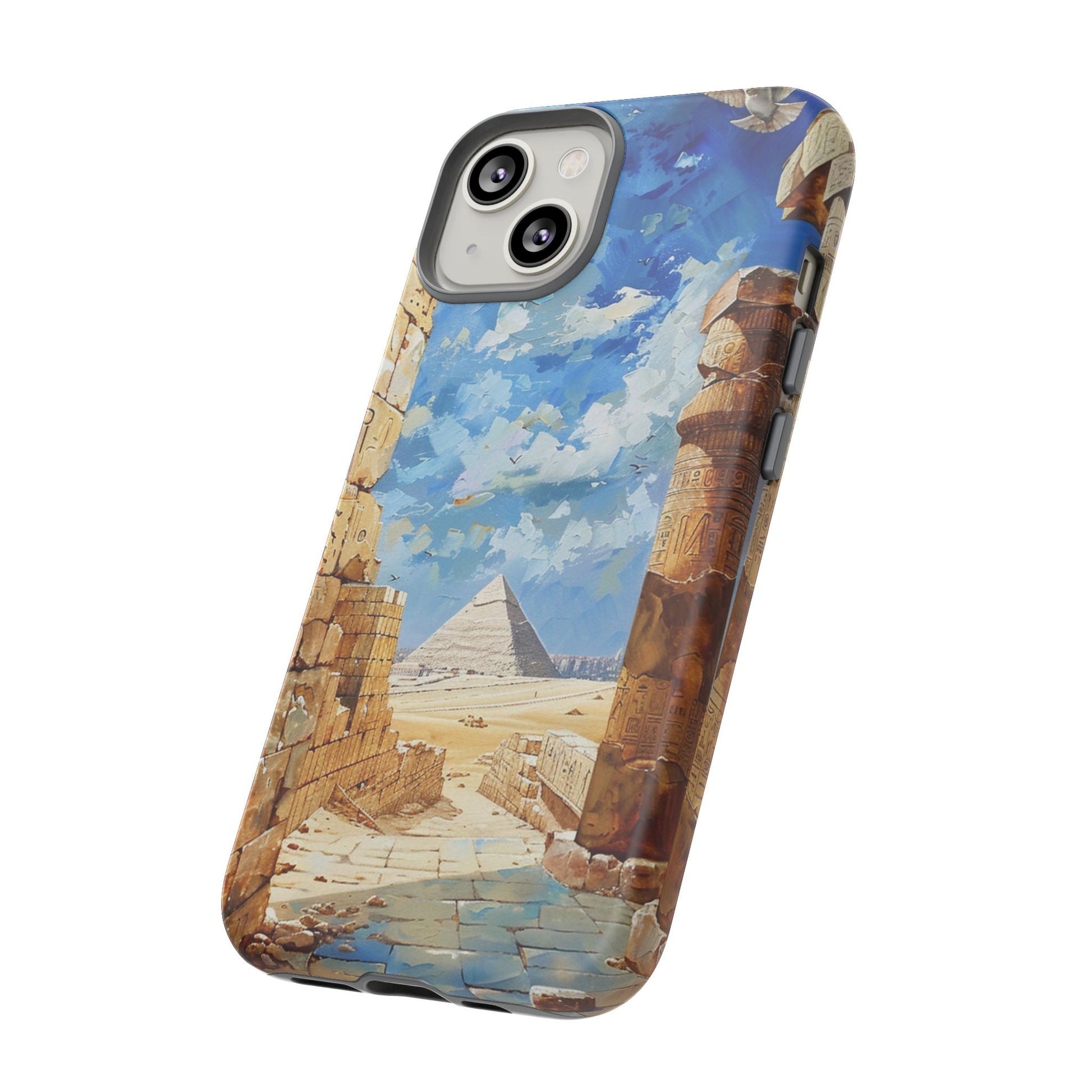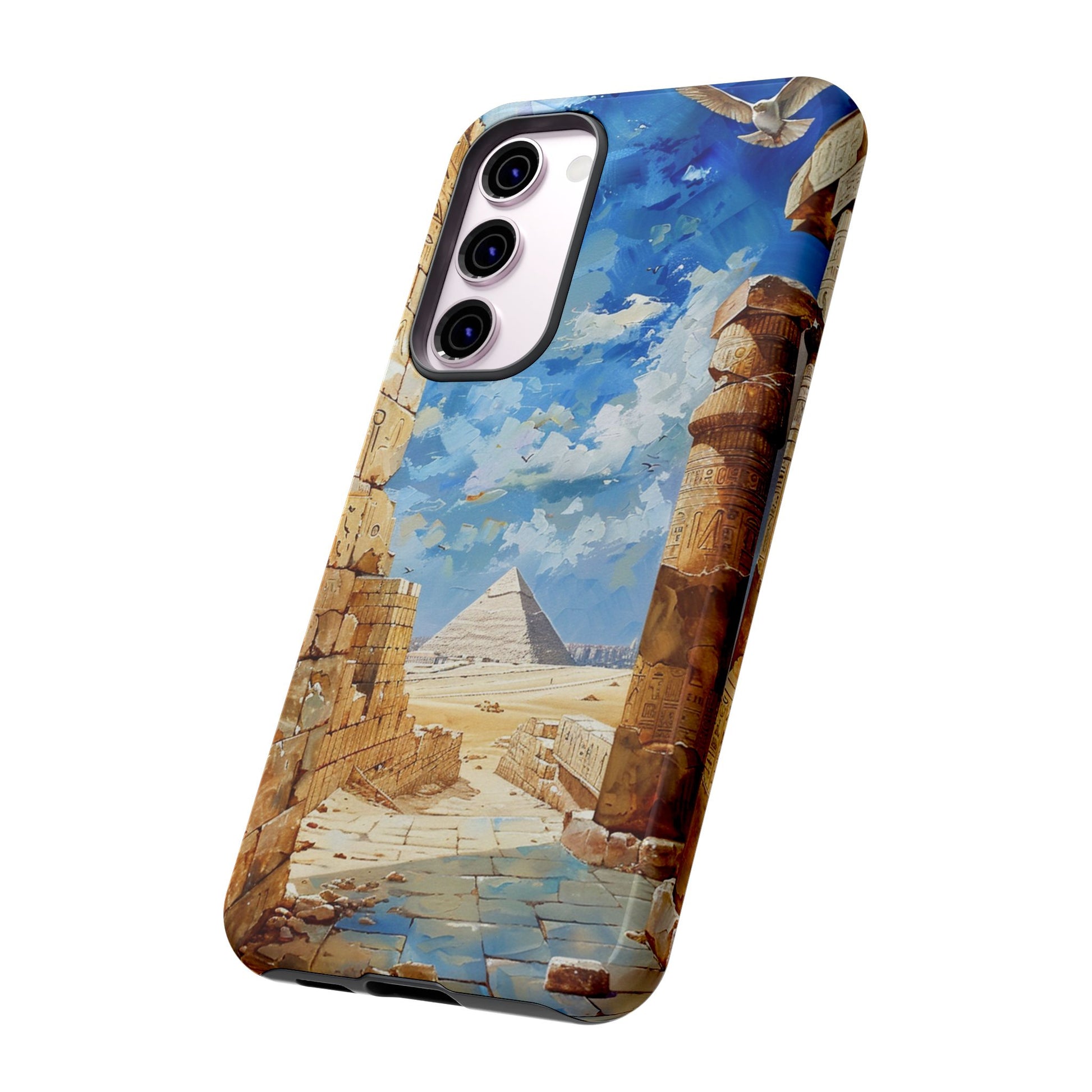Experience the majestic heritage of Egypt with the "Nile Majesty" phone cover. Showcasing an oil painting of Cairo’s most iconic landmarks—the Great Pyramids, and hieroglyphics—this cover is perfect for anyone captivated by the ancient wonders of Egypt.
