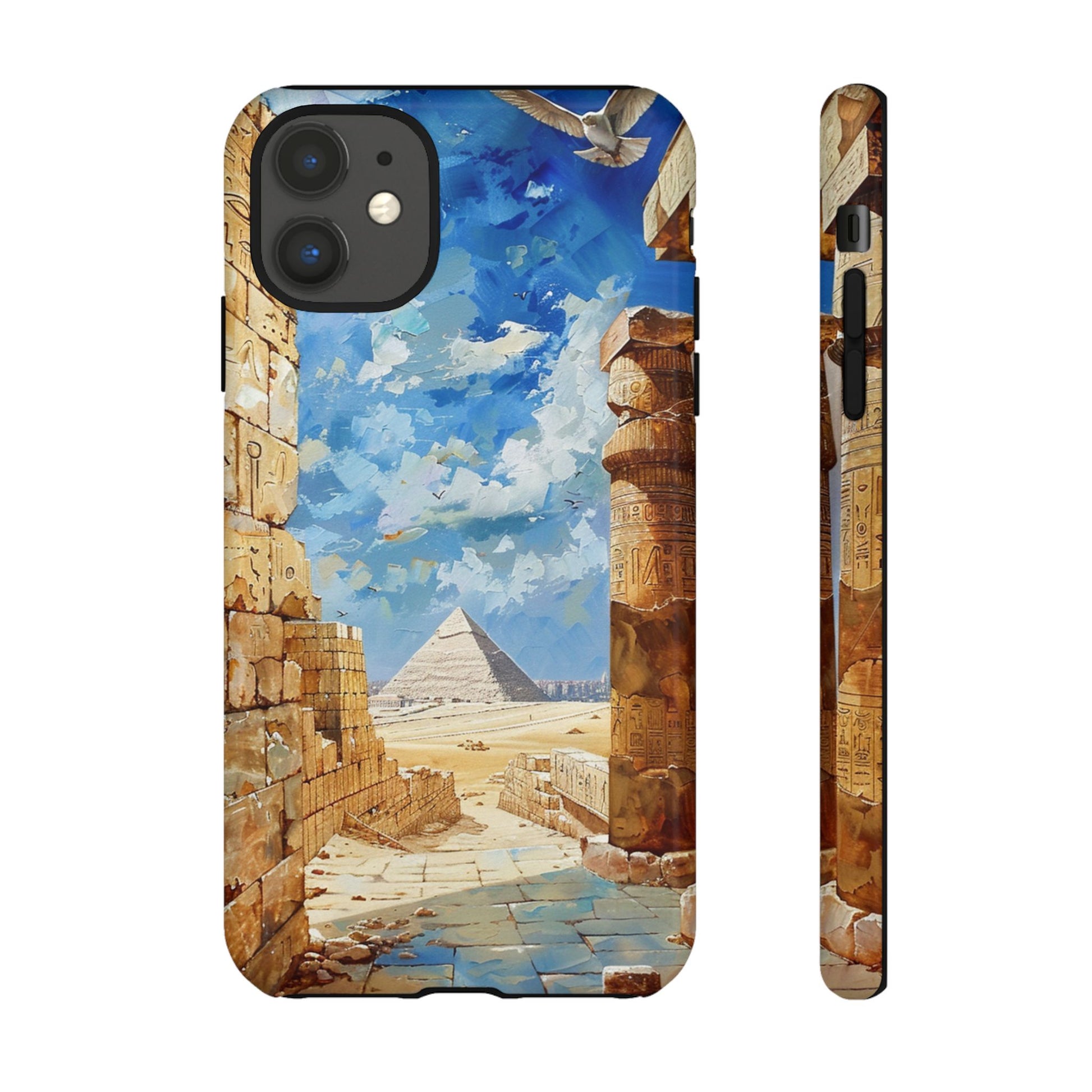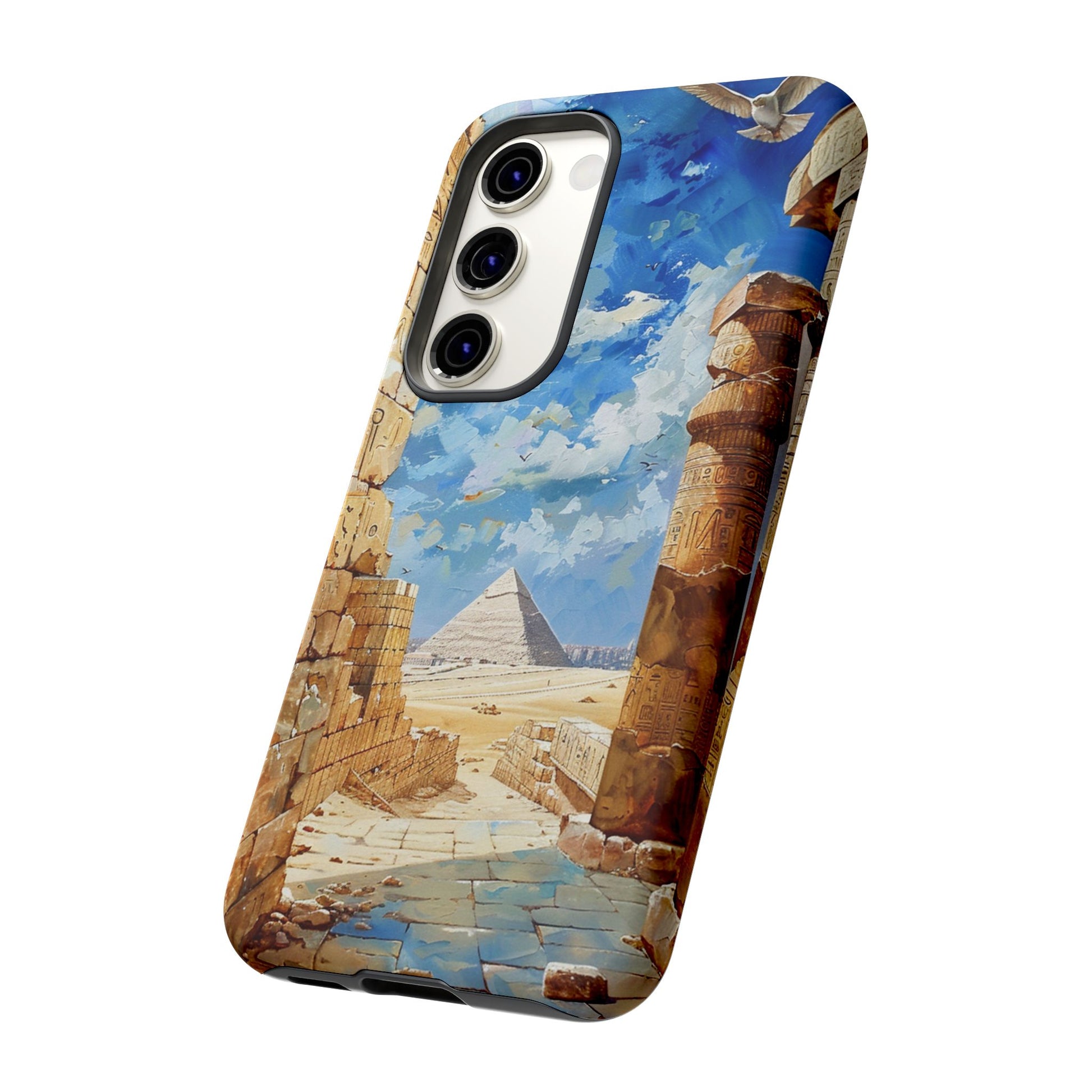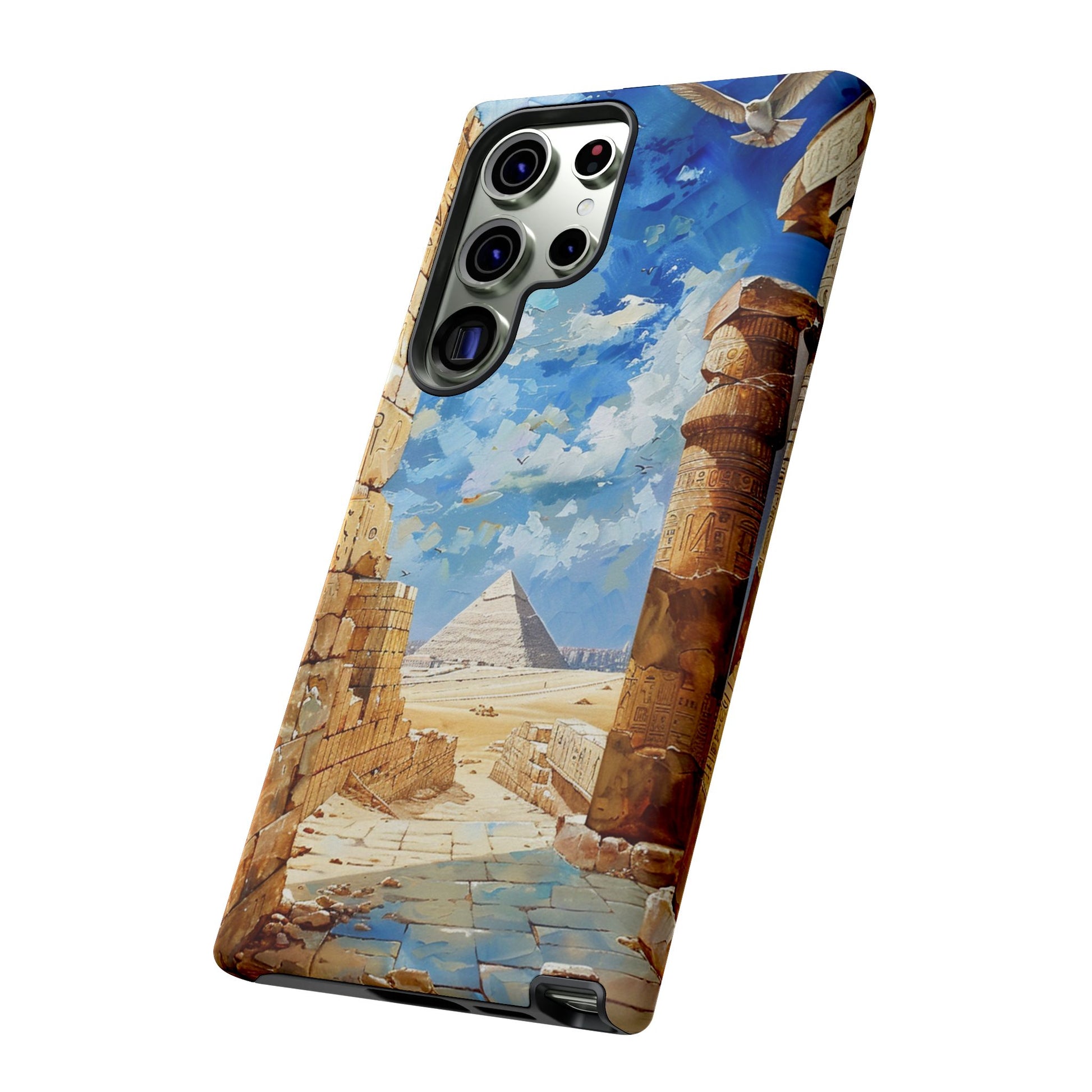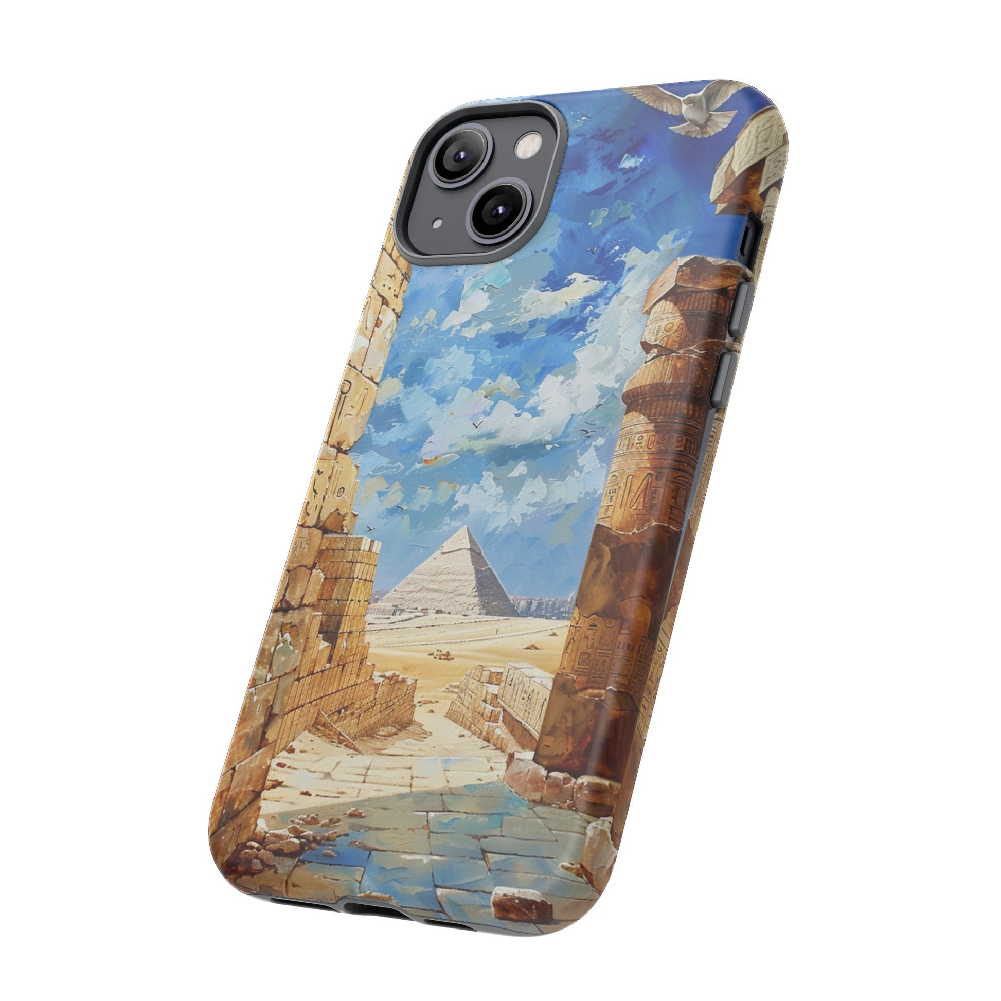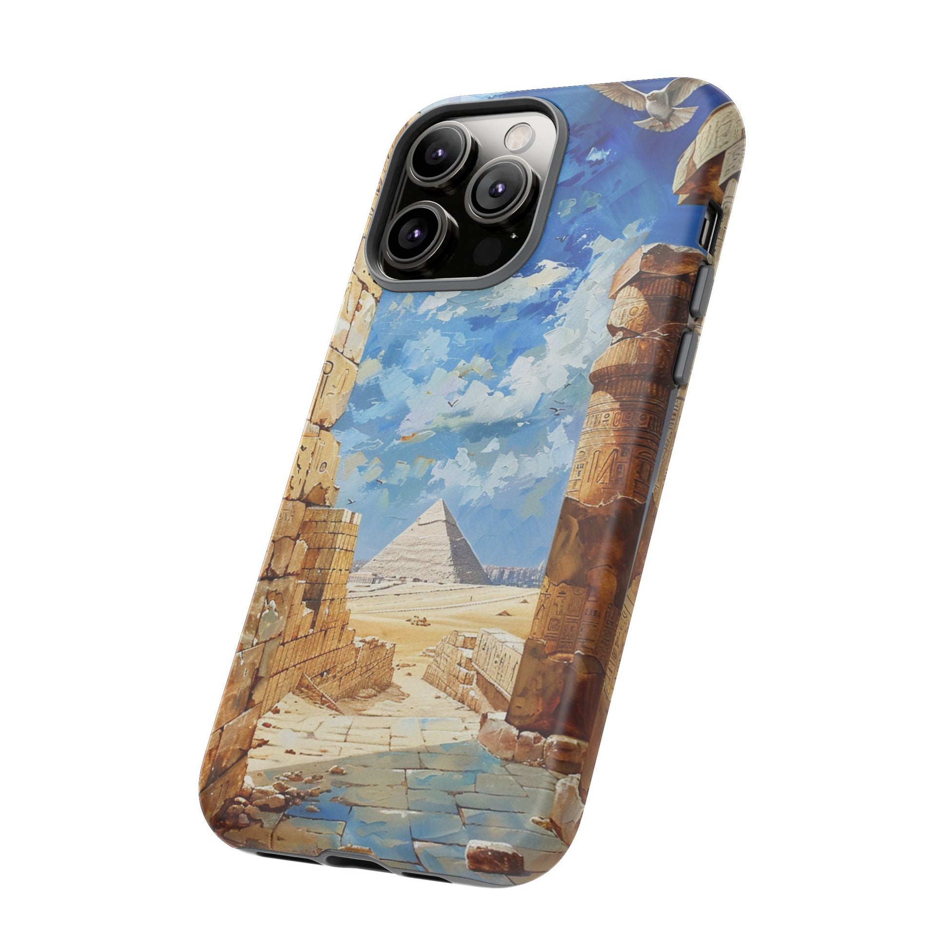 Experience the majestic heritage of Egypt with the "Nile Majesty" phone cover. Showcasing an oil painting of Cairo’s most iconic landmarks—the Great Pyramids, and hieroglyphics—this cover is perfect for anyone captivated by the ancient wonders of Egypt.