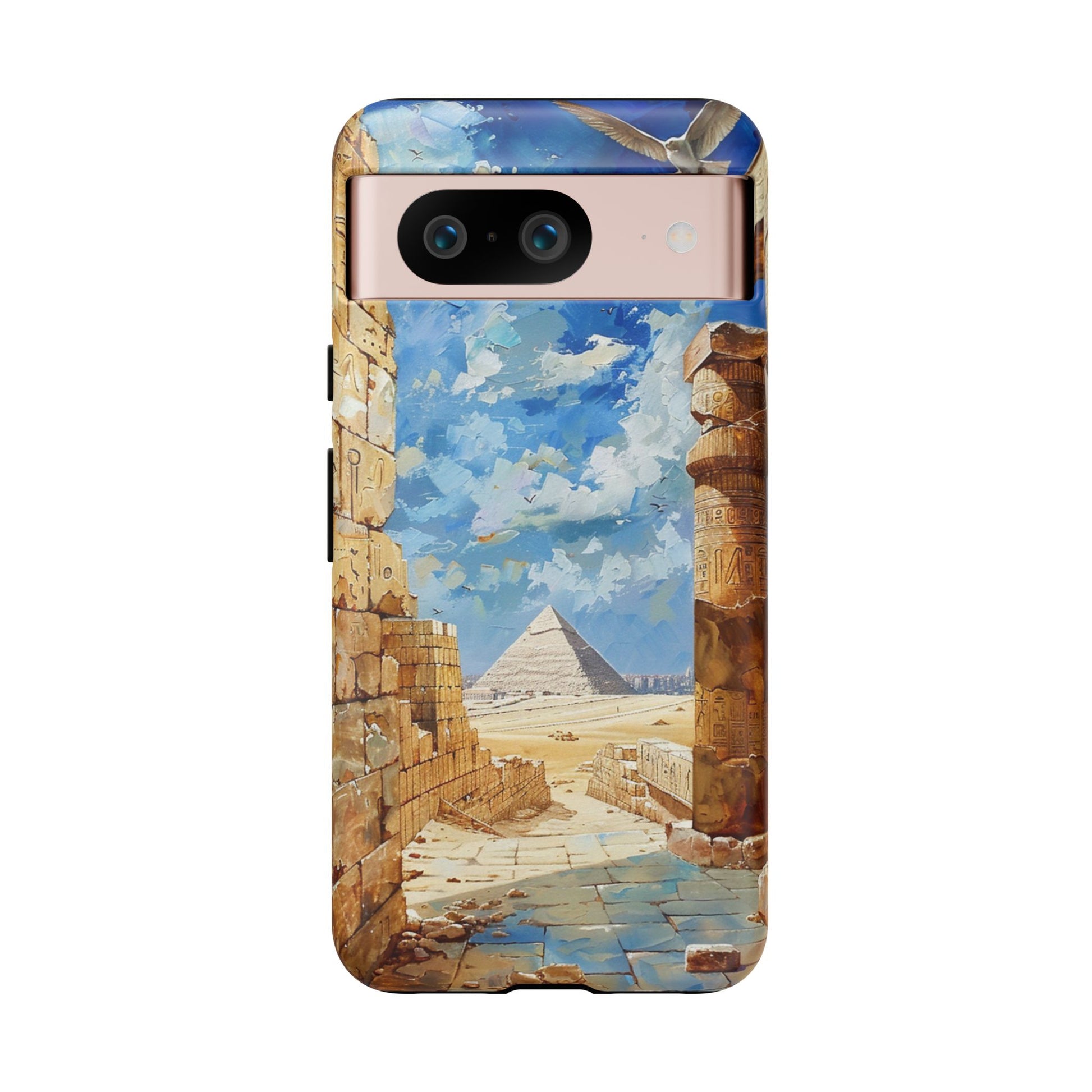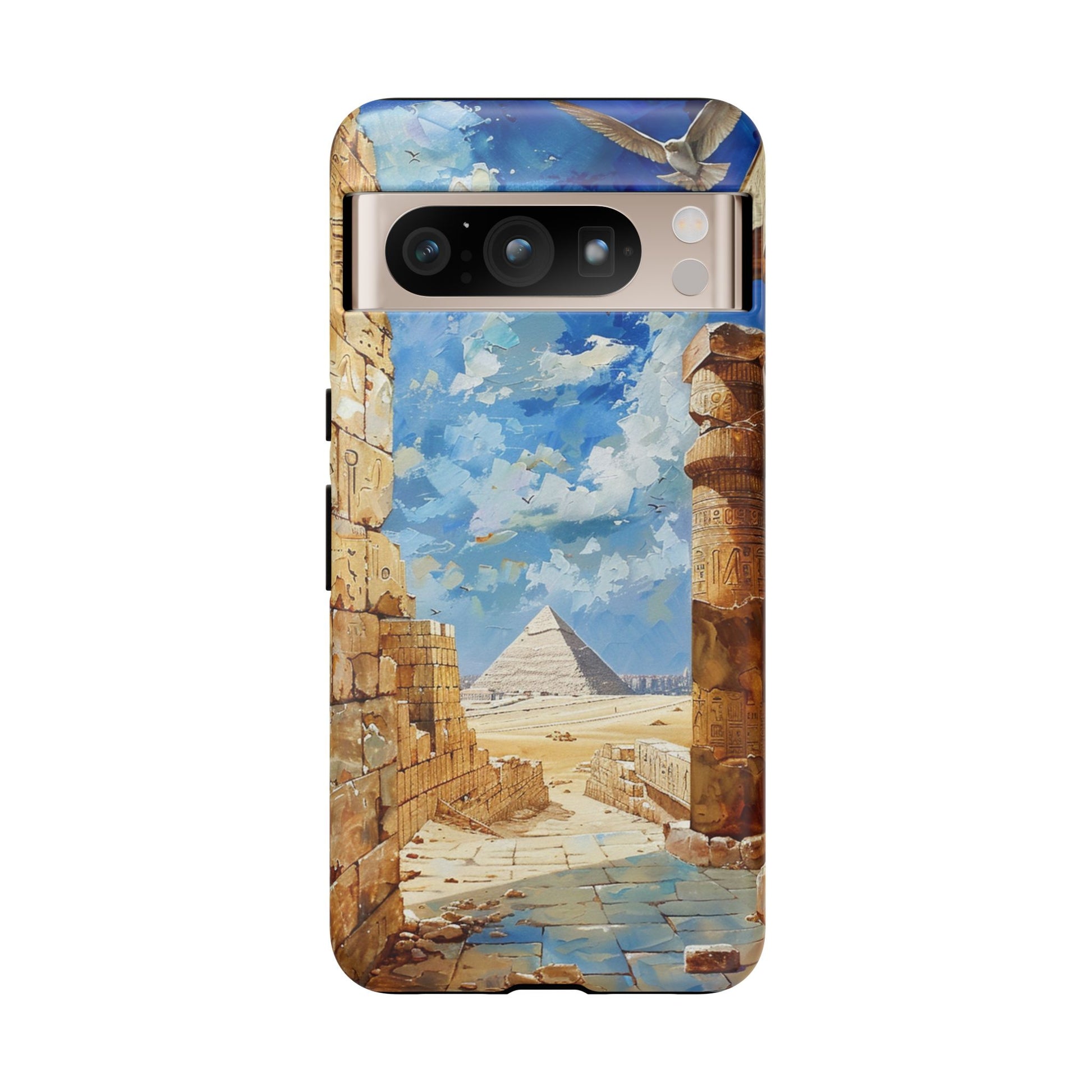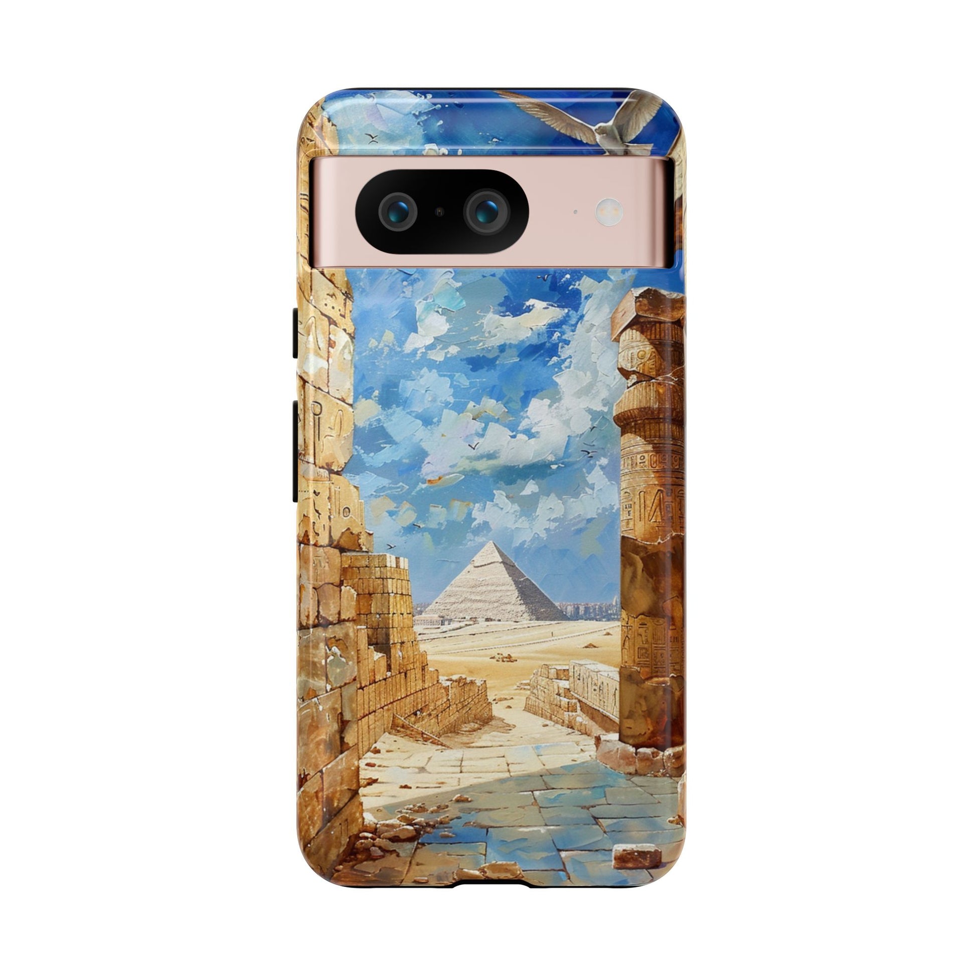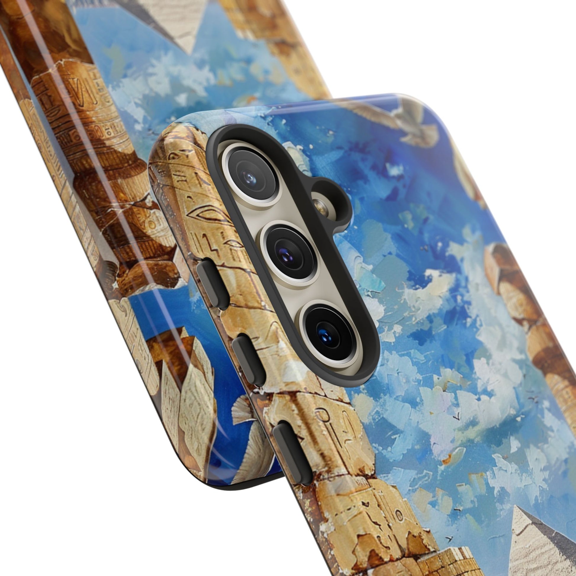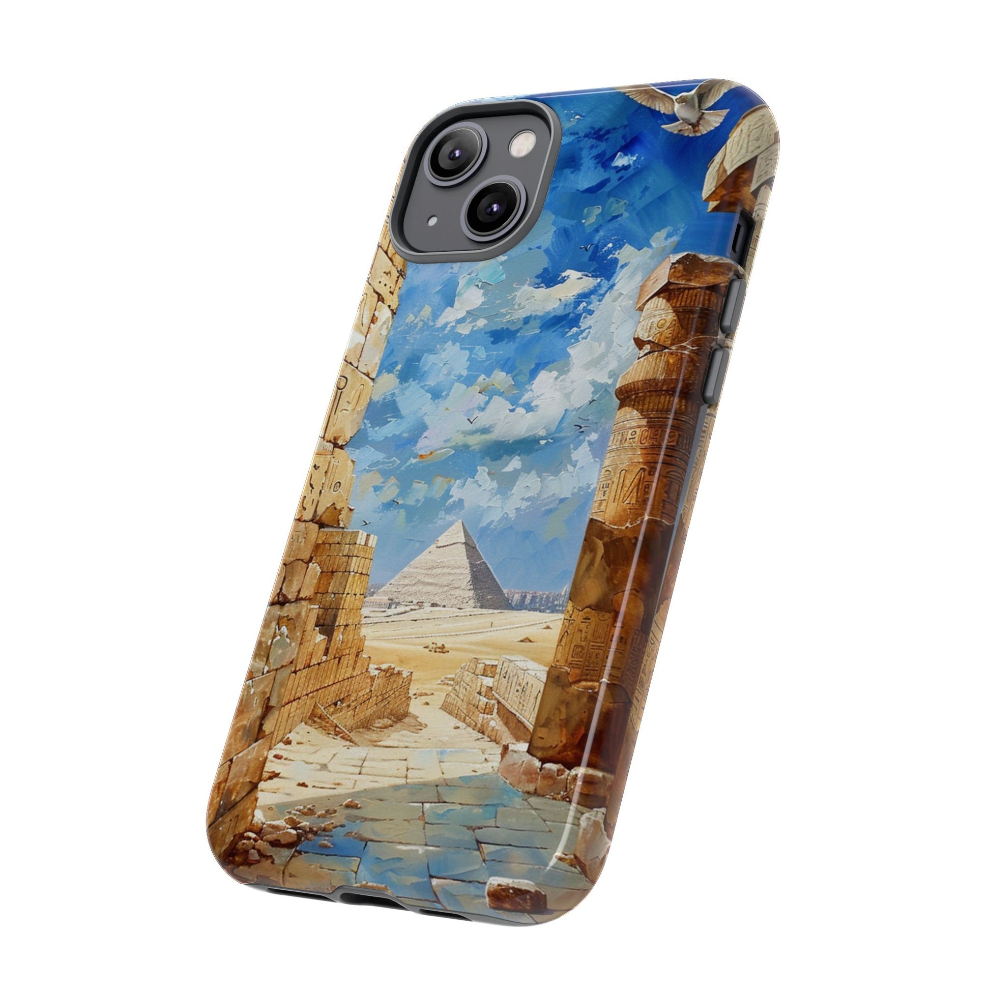 Experience the majestic heritage of Egypt with the "Nile Majesty" phone cover. Showcasing an oil painting of Cairo’s most iconic landmarks—the Great Pyramids, and hieroglyphics—this cover is perfect for anyone captivated by the ancient wonders of Egypt.