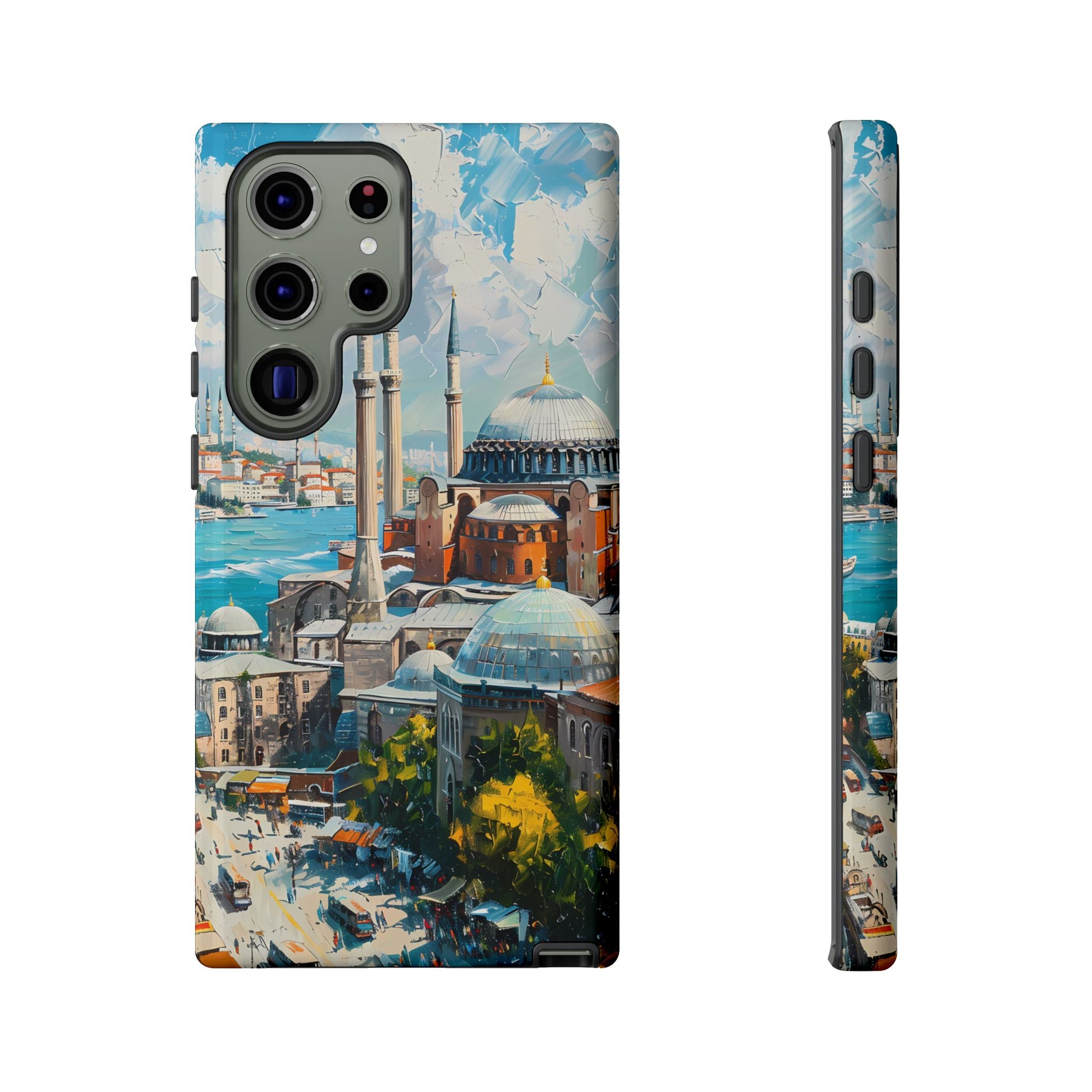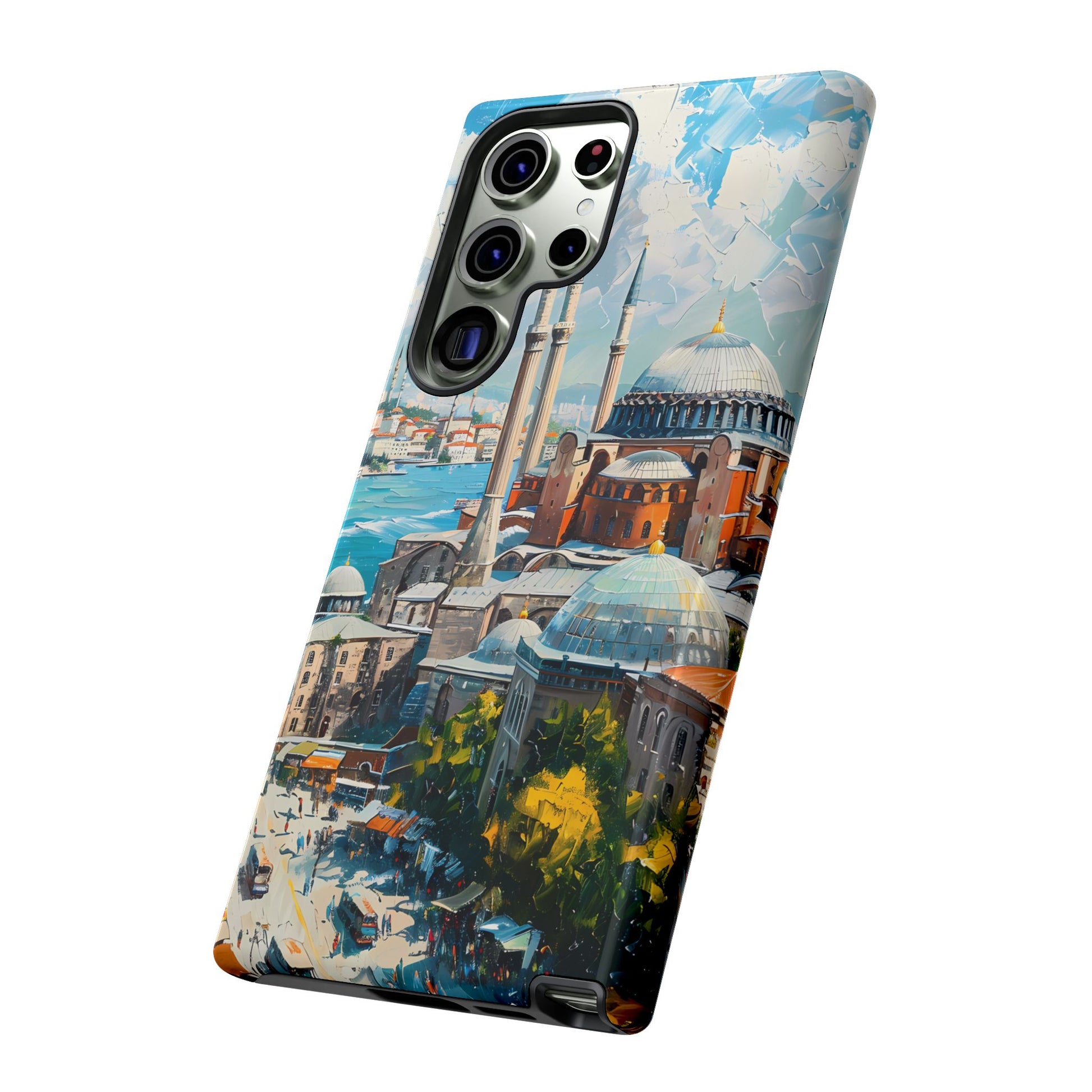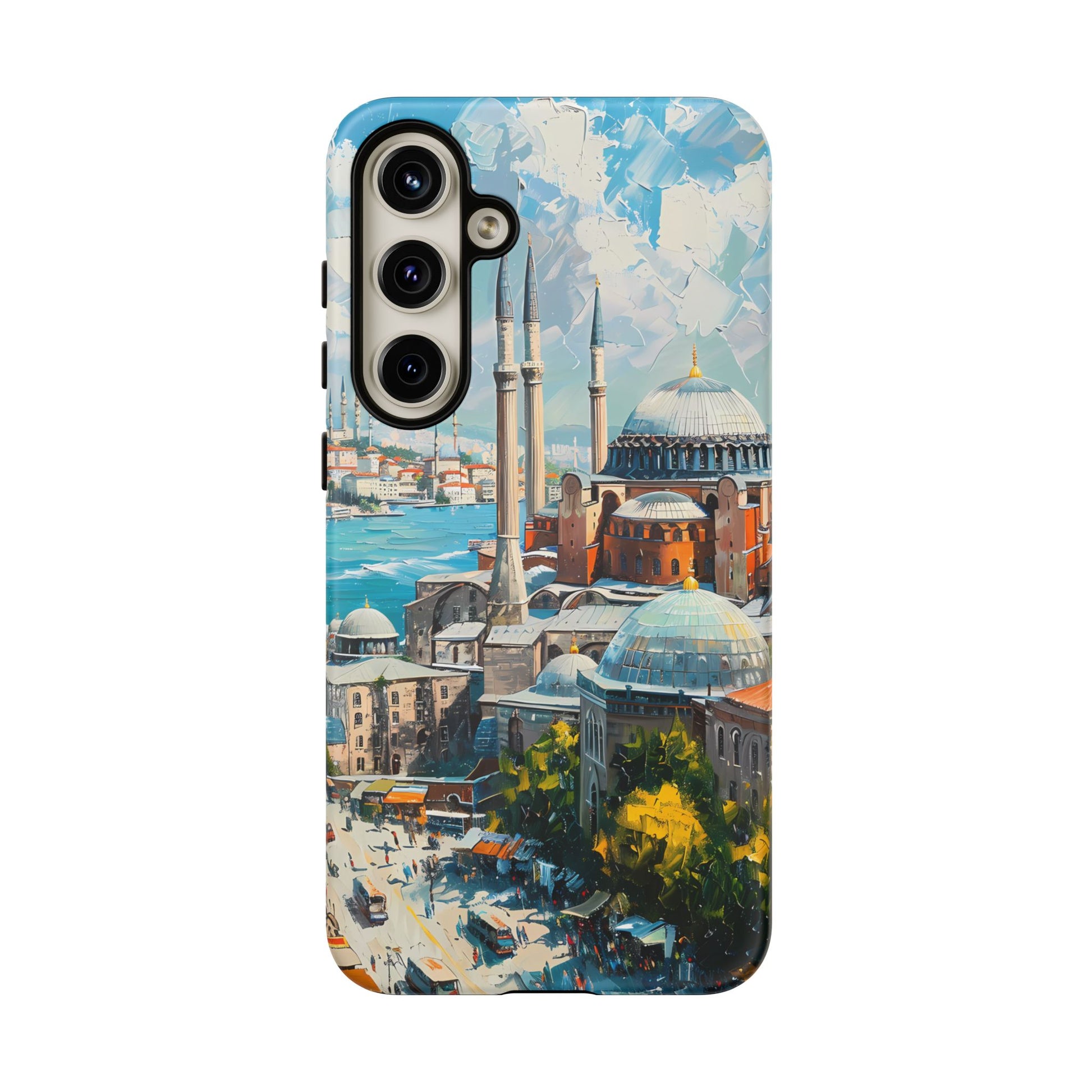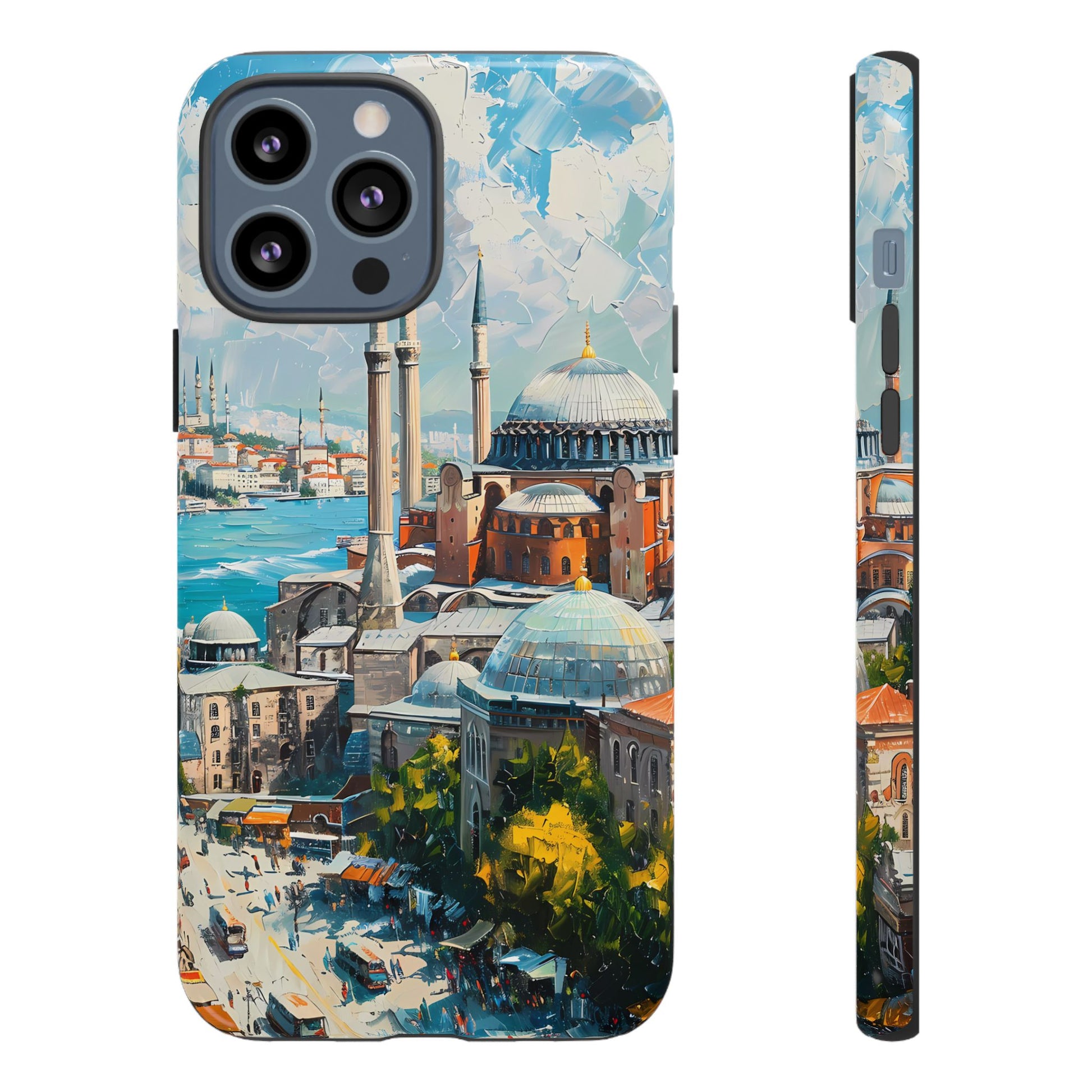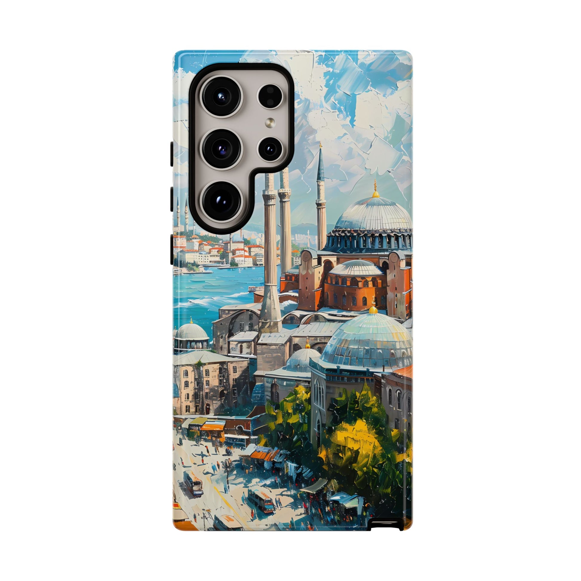 Experience the grandeur of Istanbul with the "Ottoman Opulence" phone cover. This design captures the timeless beauty of the Hagia Sophia, the bustling life of the bazaars, and the stunning mosques, all depicted in a masterful oil painting that embodies the spirit of this historic city.