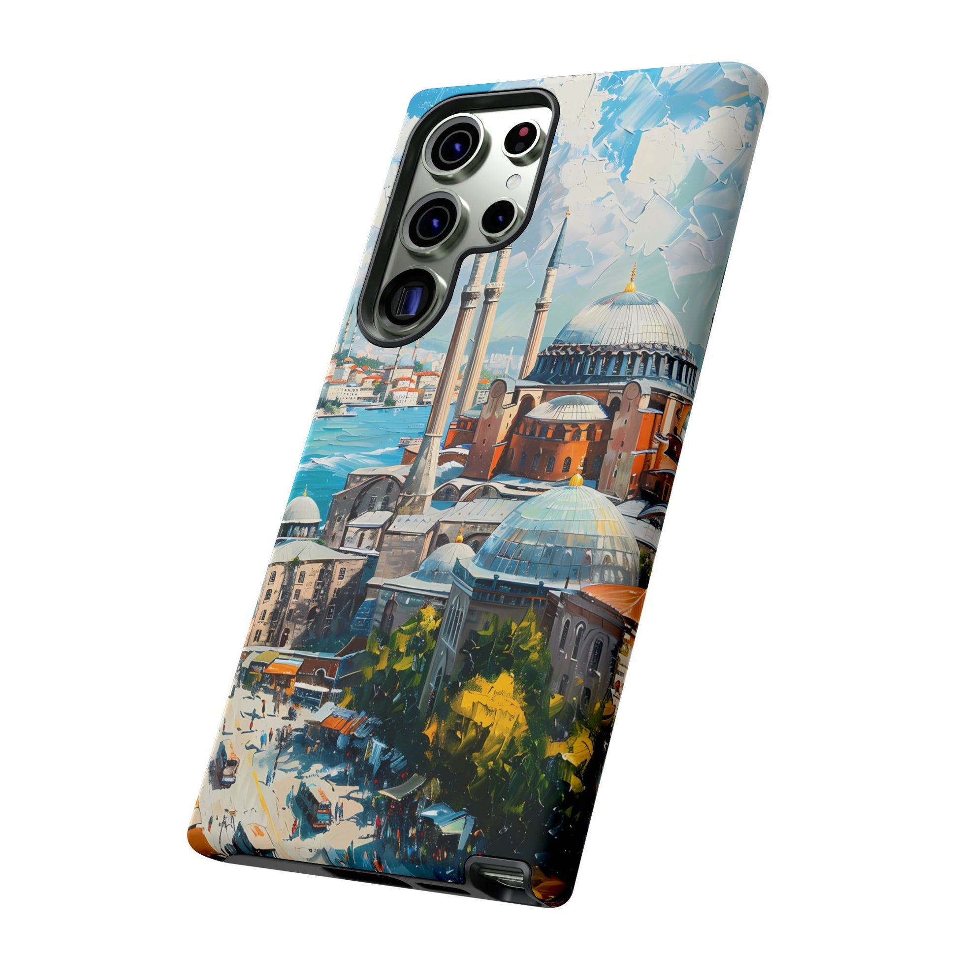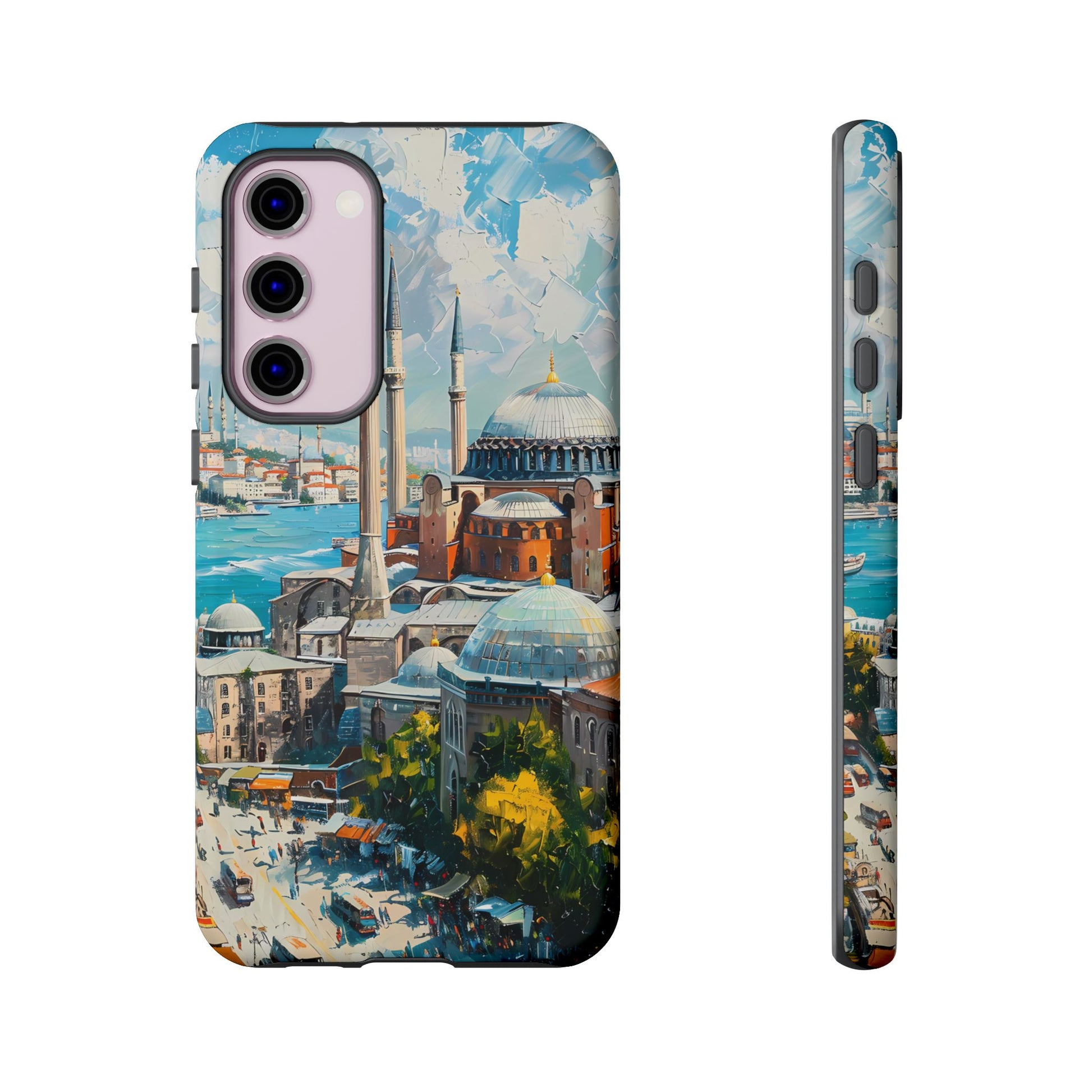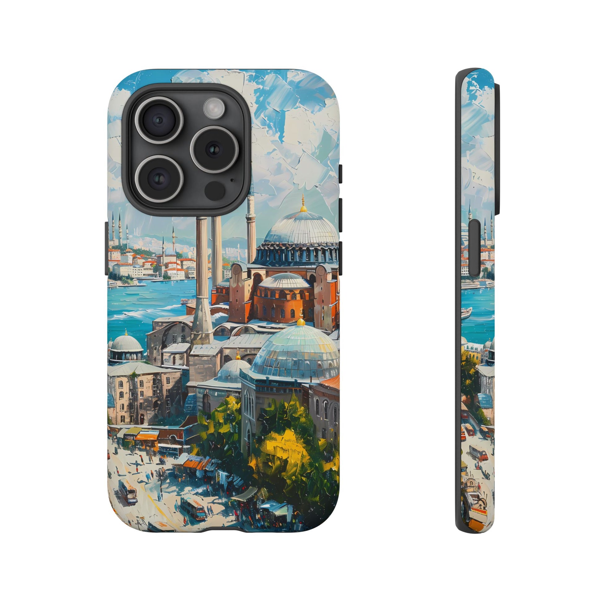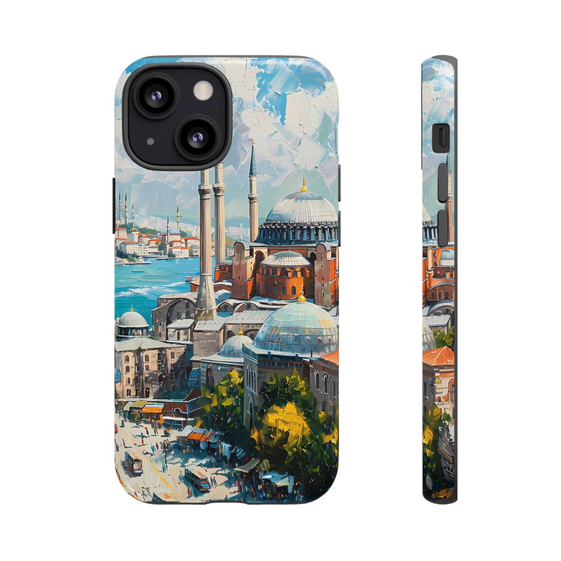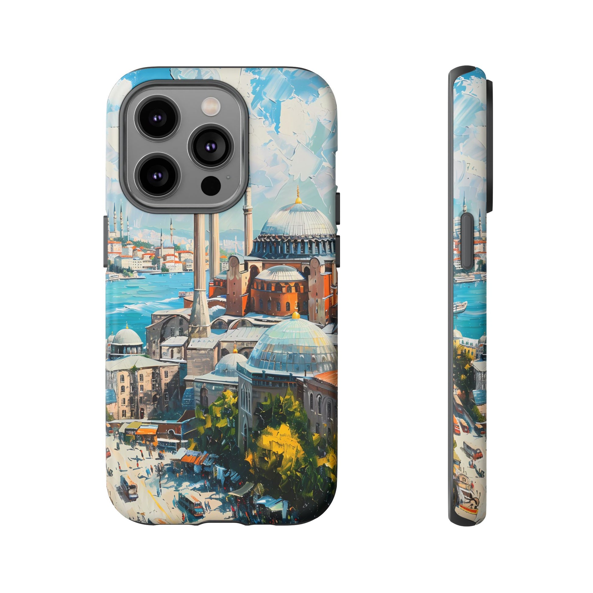 Experience the grandeur of Istanbul with the "Ottoman Opulence" phone cover. This design captures the timeless beauty of the Hagia Sophia, the bustling life of the bazaars, and the stunning mosques, all depicted in a masterful oil painting that embodies the spirit of this historic city.