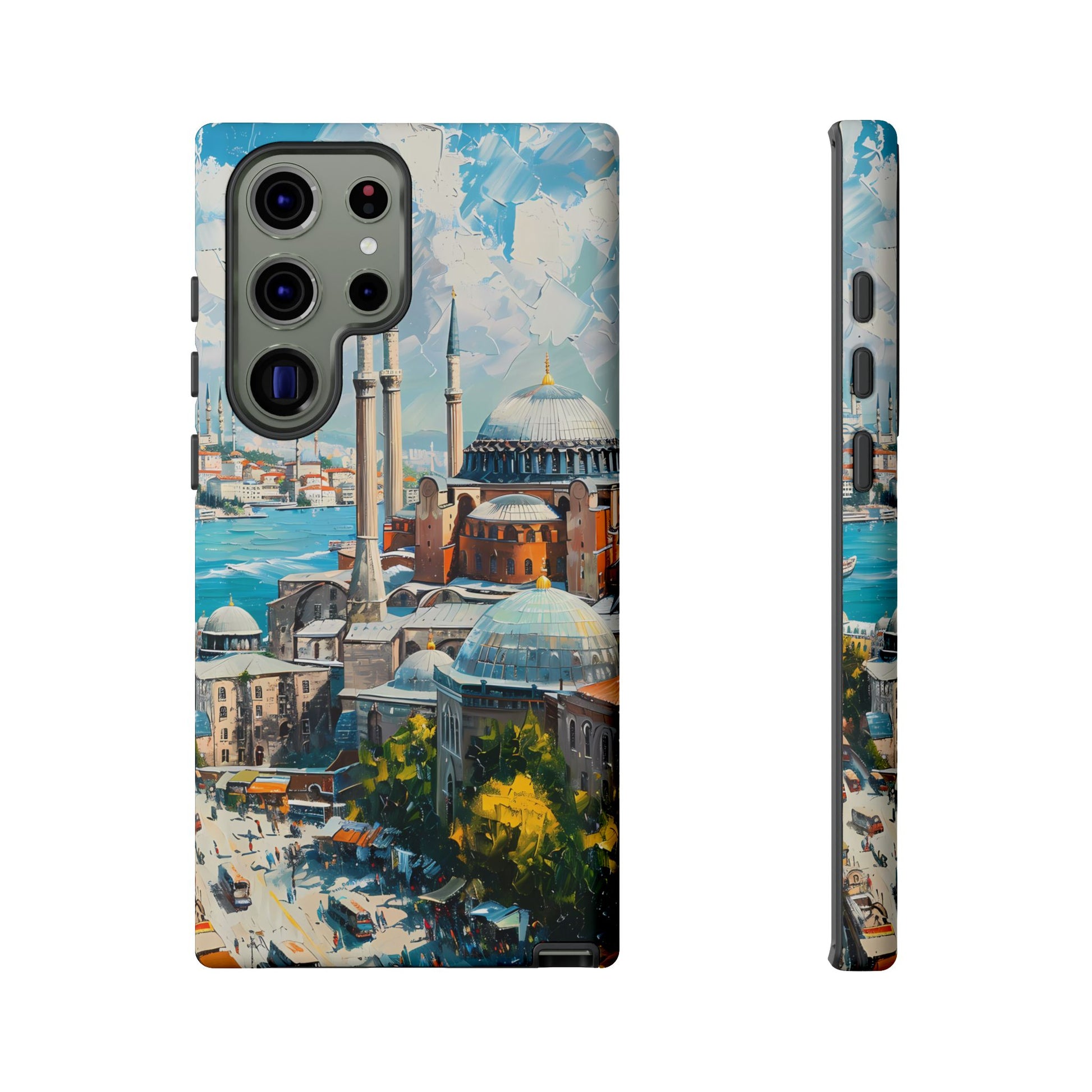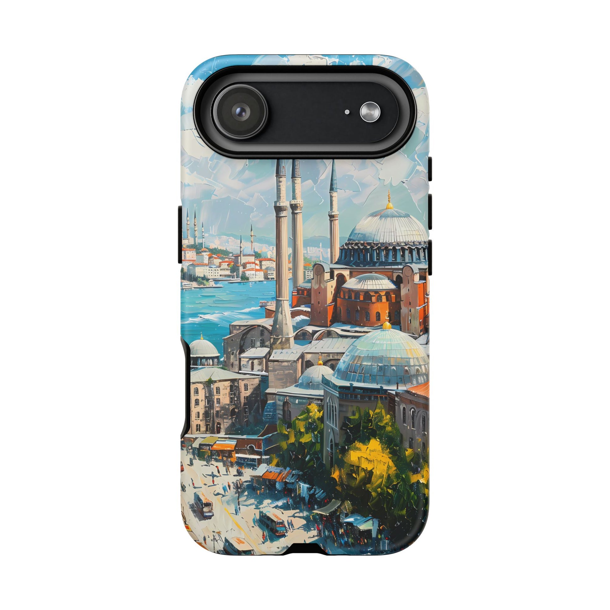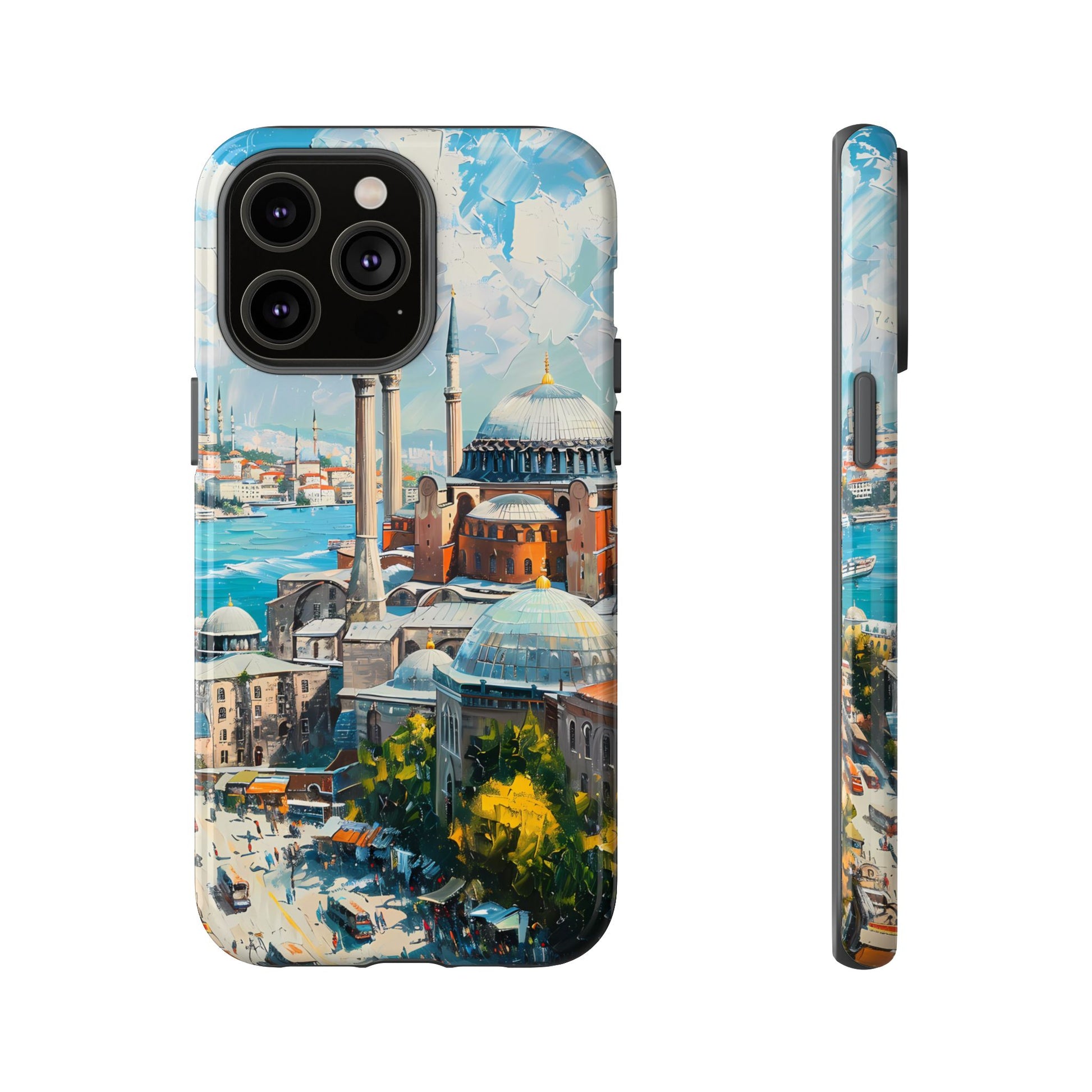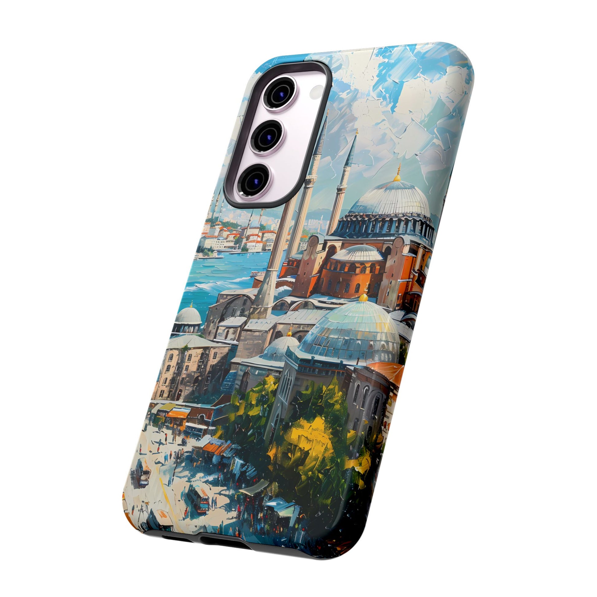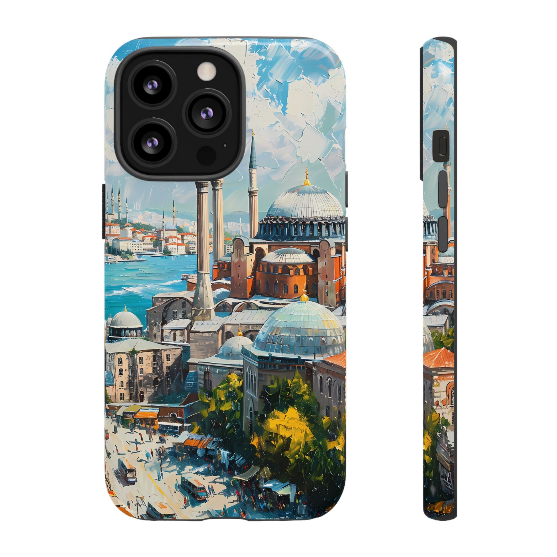 Experience the grandeur of Istanbul with the "Ottoman Opulence" phone cover. This design captures the timeless beauty of the Hagia Sophia, the bustling life of the bazaars, and the stunning mosques, all depicted in a masterful oil painting that embodies the spirit of this historic city.