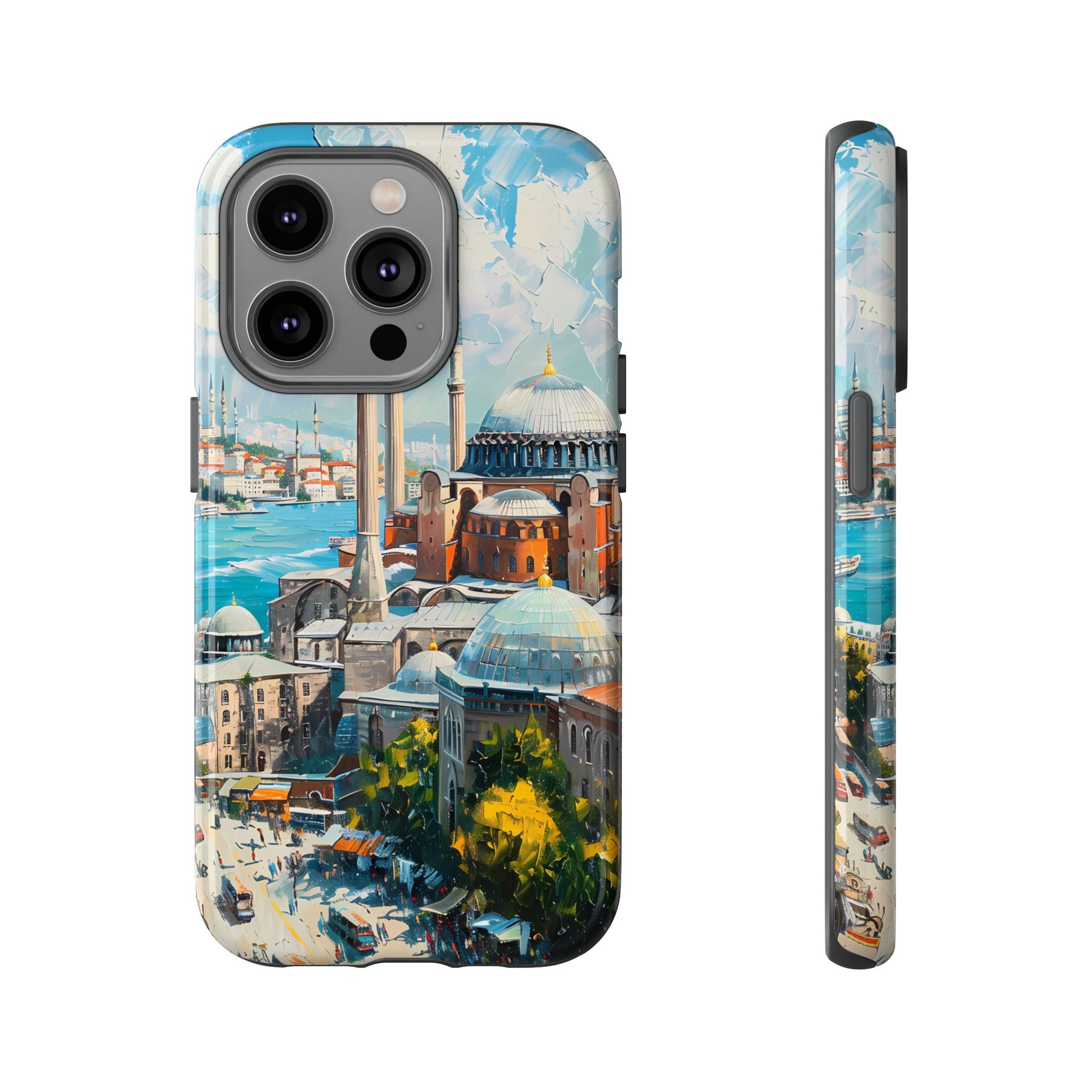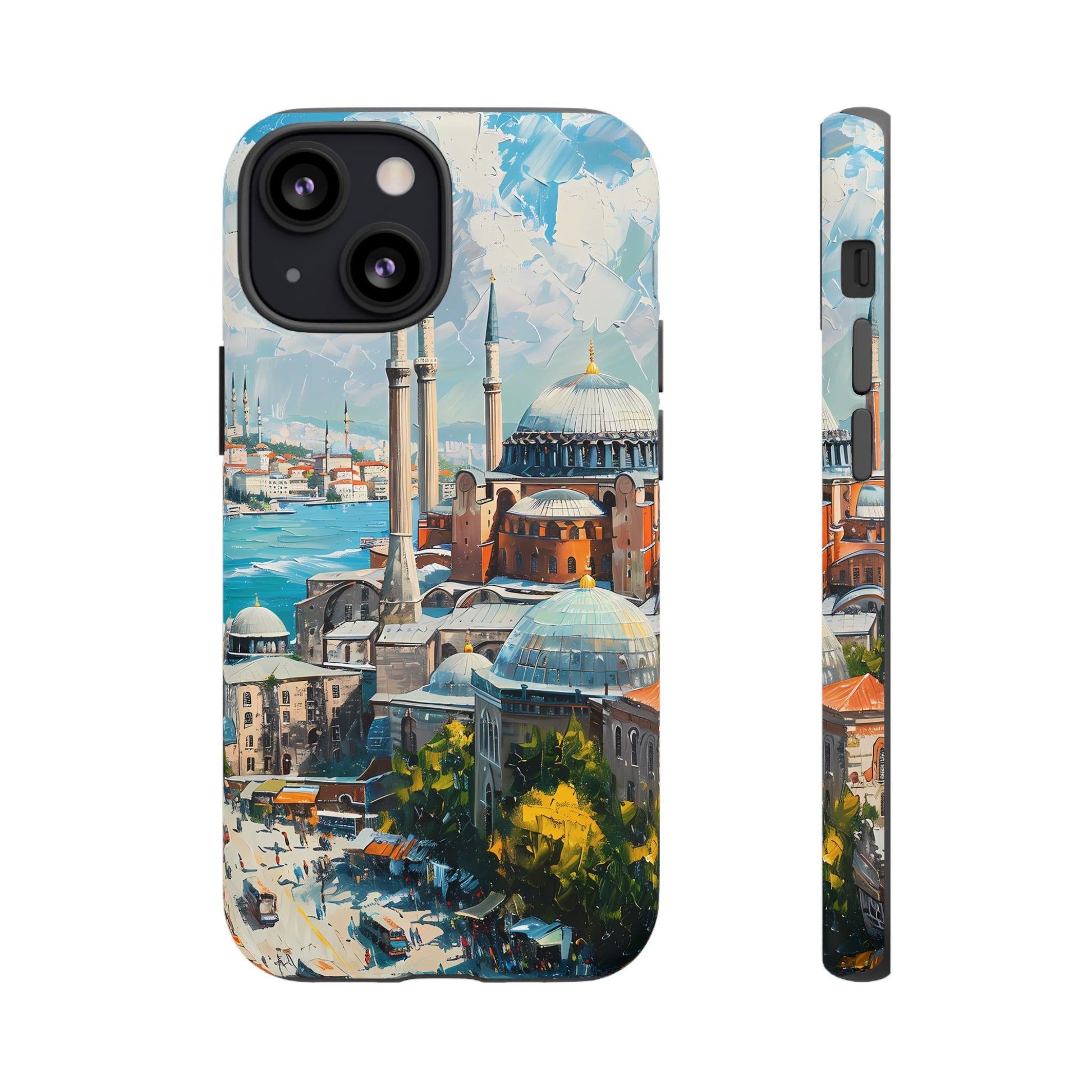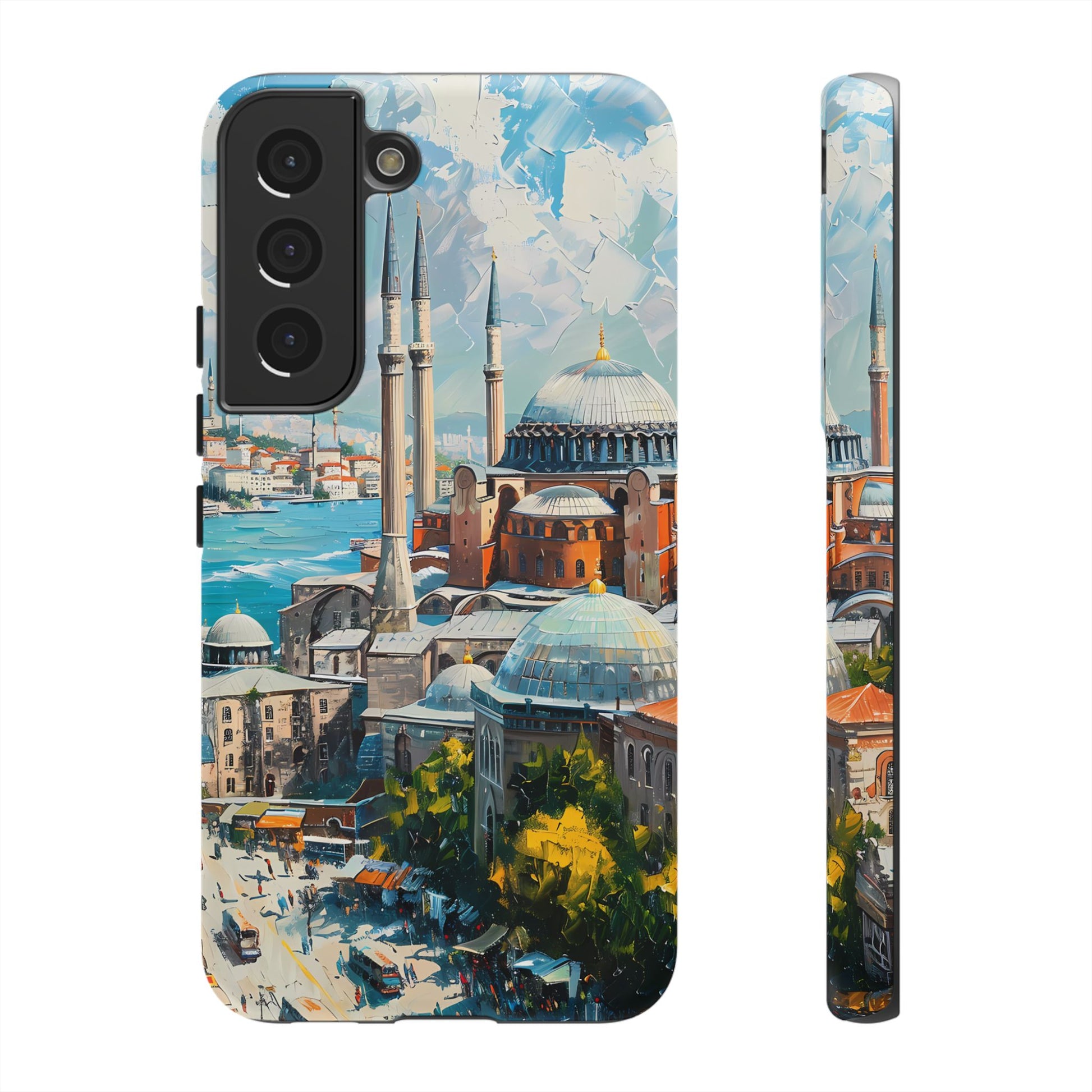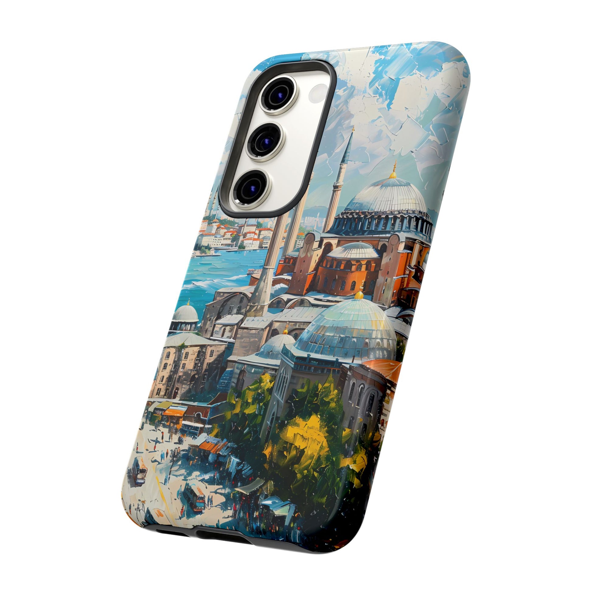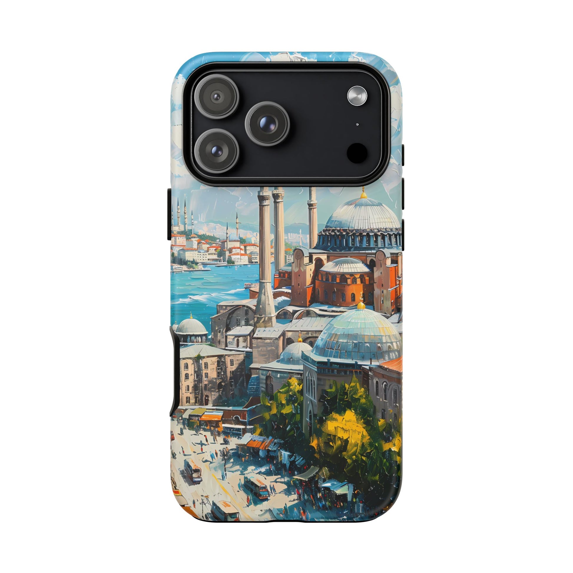 Experience the grandeur of Istanbul with the "Ottoman Opulence" phone cover. This design captures the timeless beauty of the Hagia Sophia, the bustling life of the bazaars, and the stunning mosques, all depicted in a masterful oil painting that embodies the spirit of this historic city.