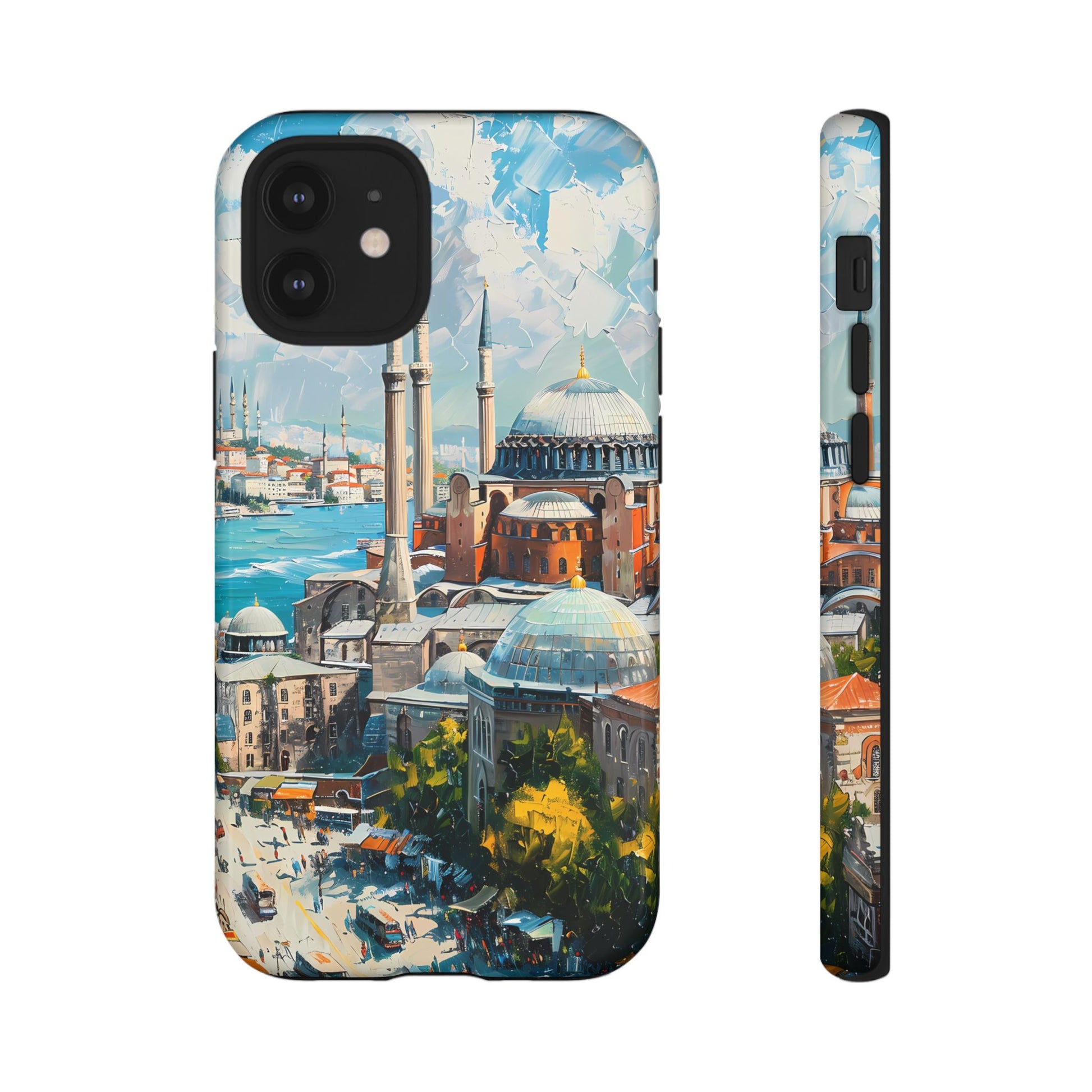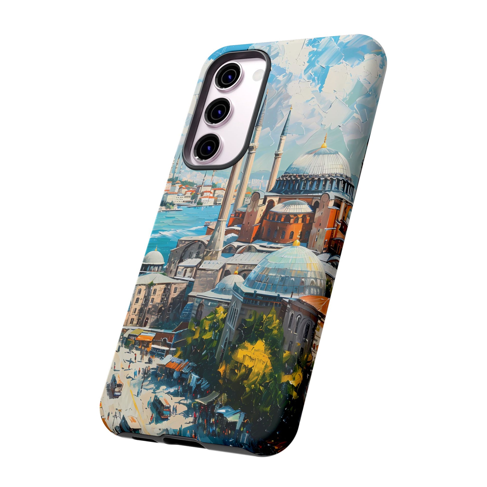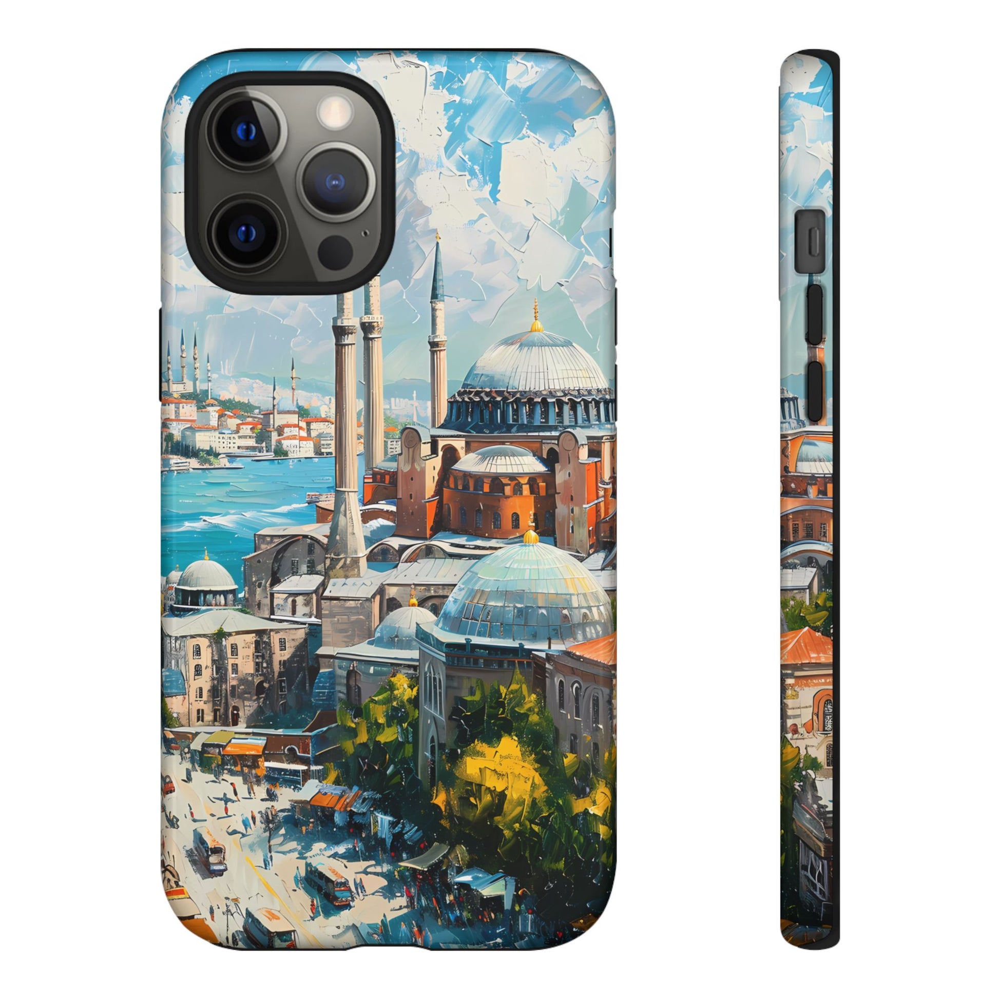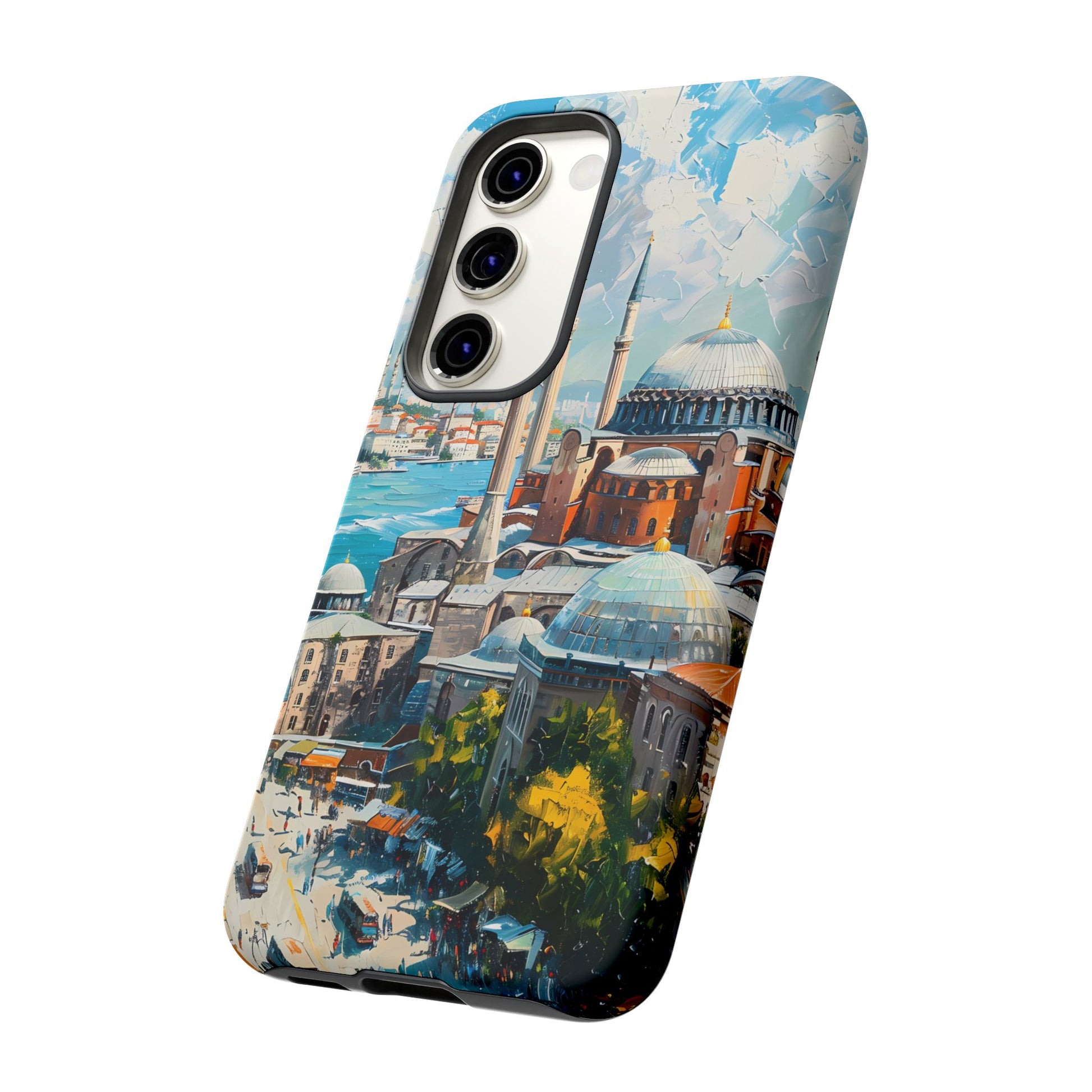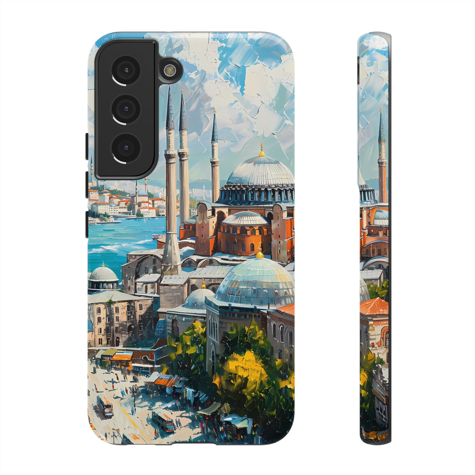 Experience the grandeur of Istanbul with the "Ottoman Opulence" phone cover. This design captures the timeless beauty of the Hagia Sophia, the bustling life of the bazaars, and the stunning mosques, all depicted in a masterful oil painting that embodies the spirit of this historic city.