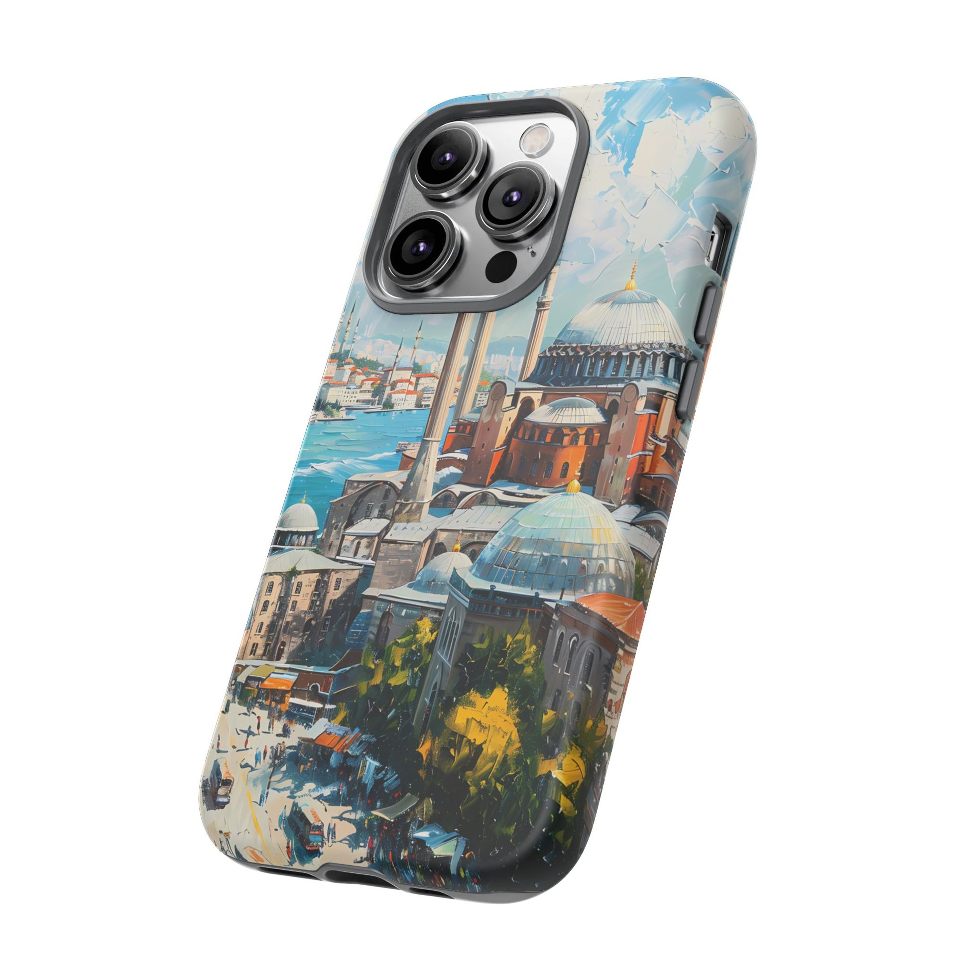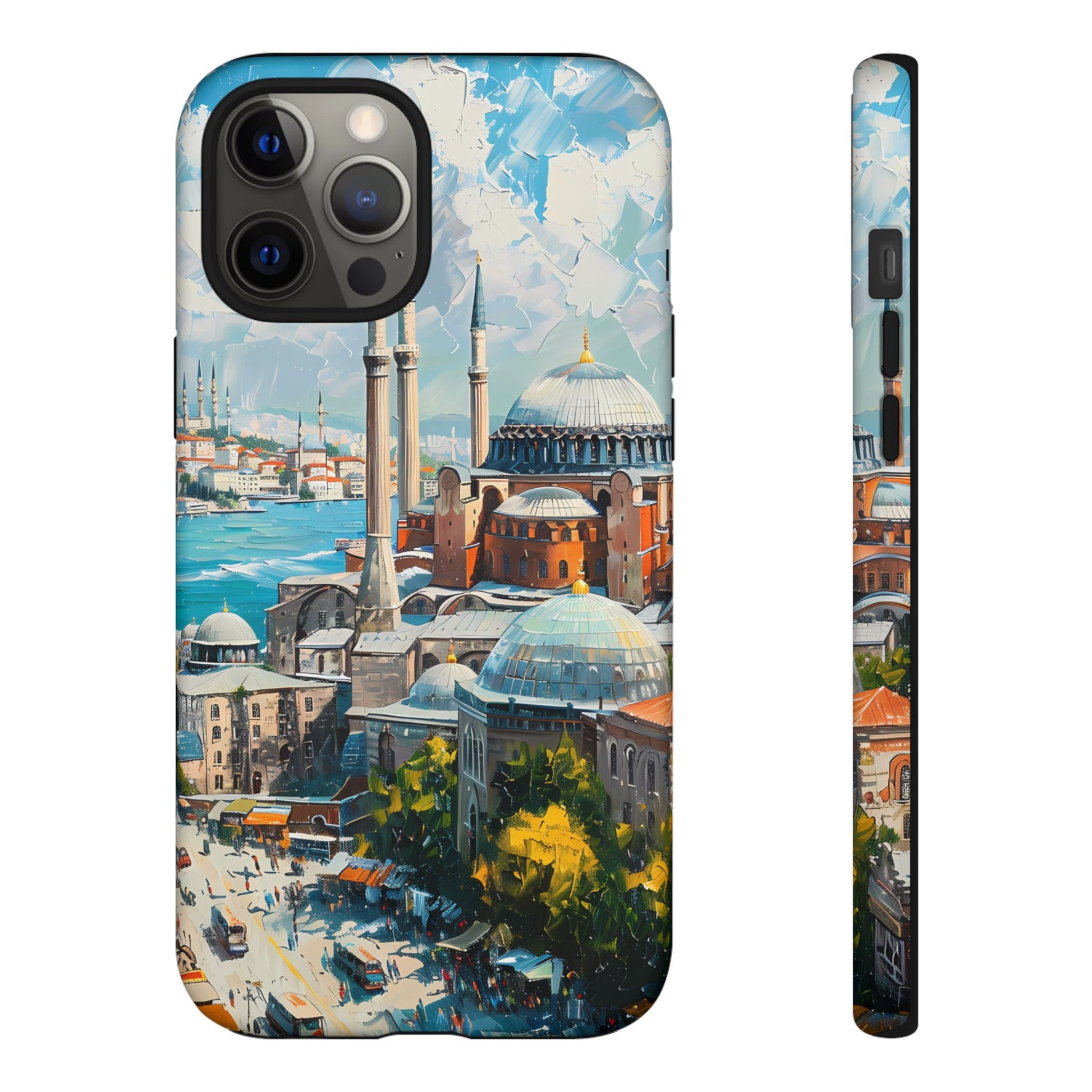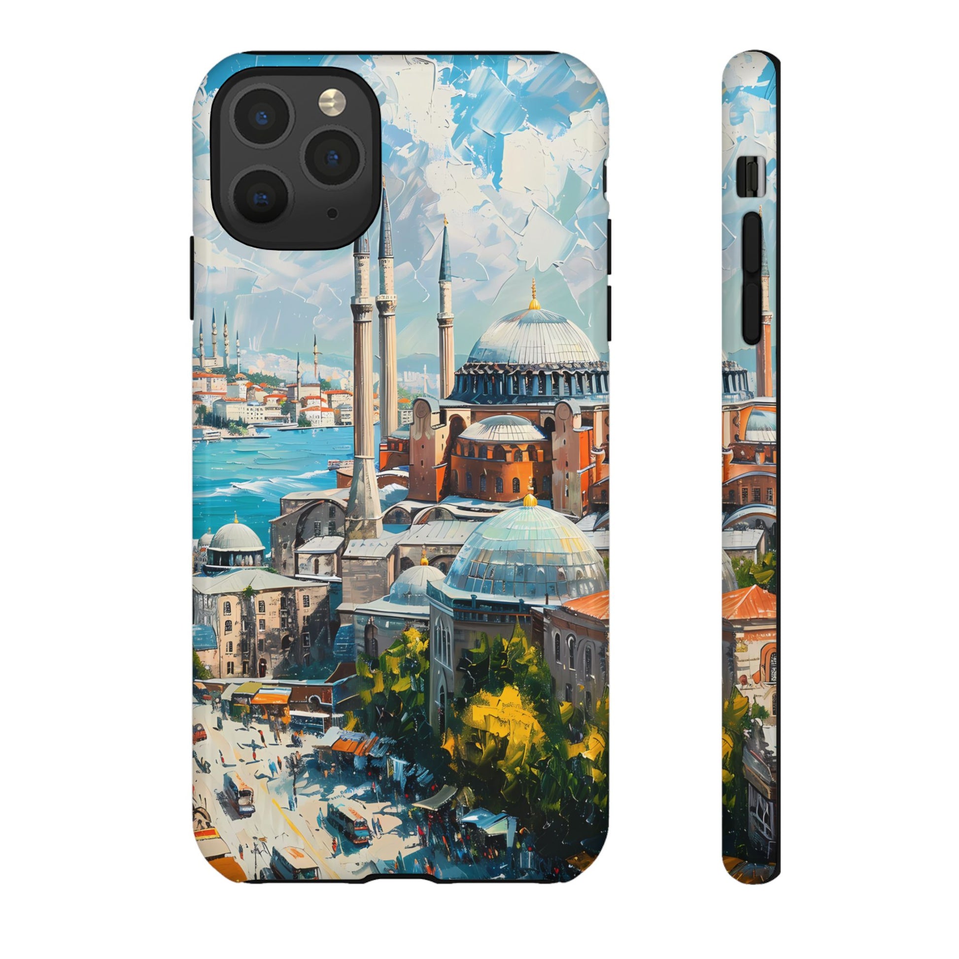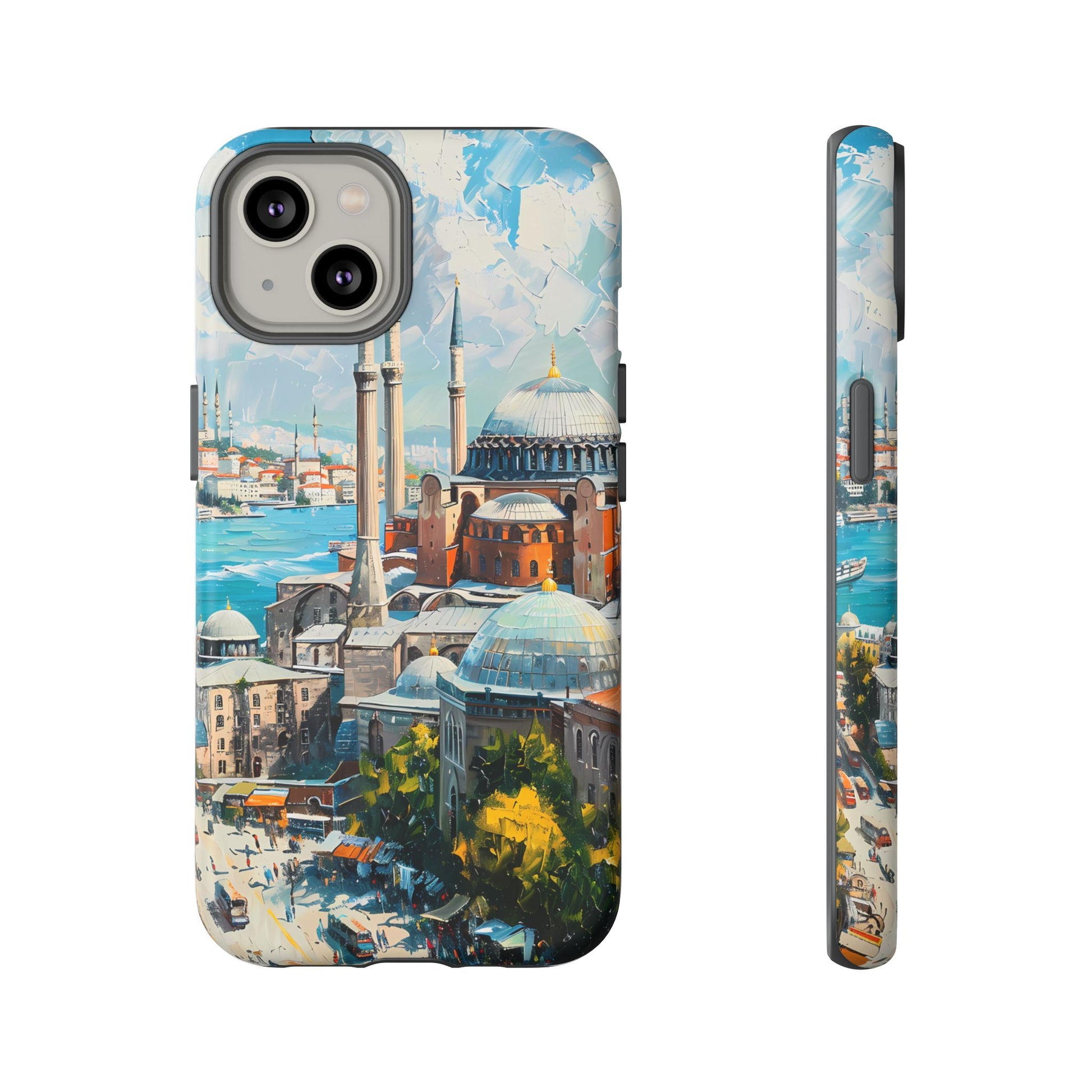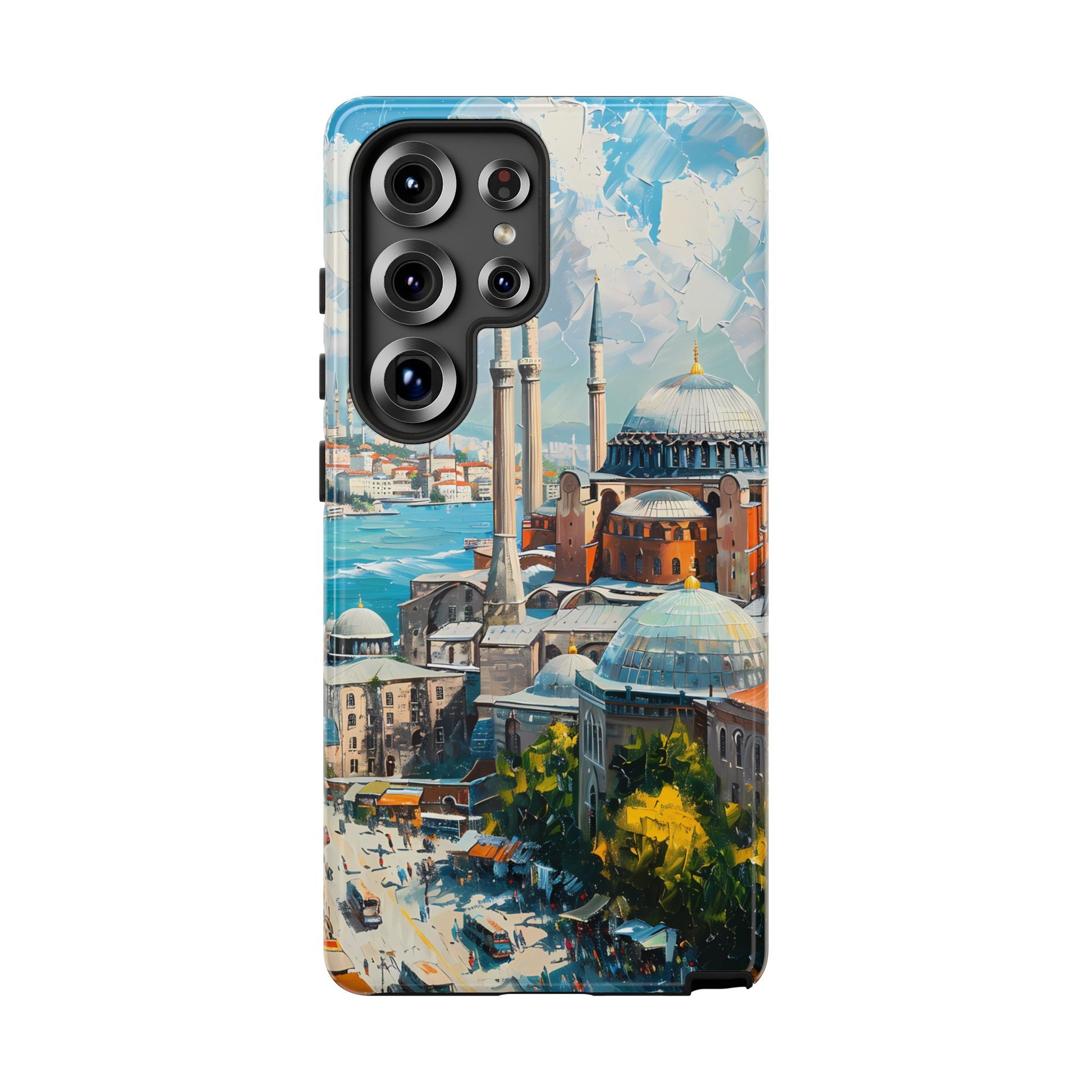 Experience the grandeur of Istanbul with the "Ottoman Opulence" phone cover. This design captures the timeless beauty of the Hagia Sophia, the bustling life of the bazaars, and the stunning mosques, all depicted in a masterful oil painting that embodies the spirit of this historic city.