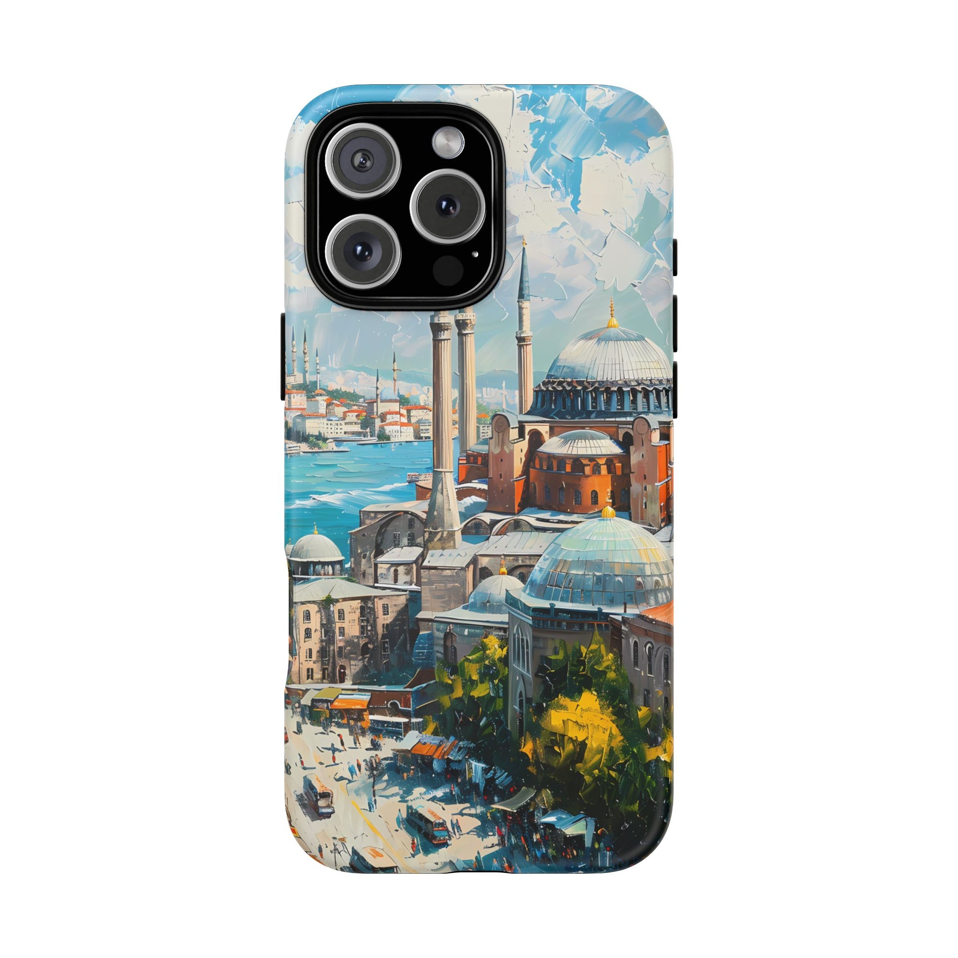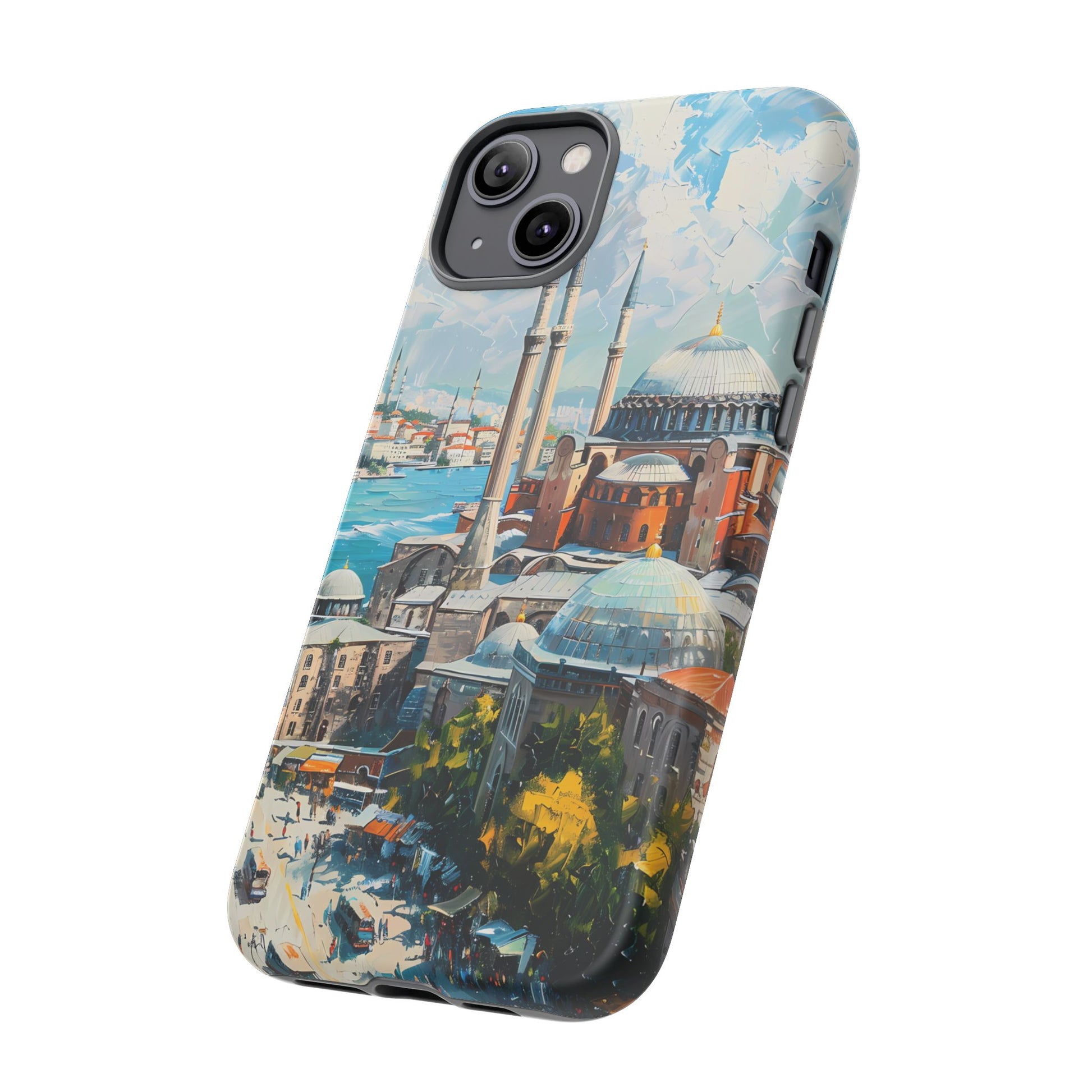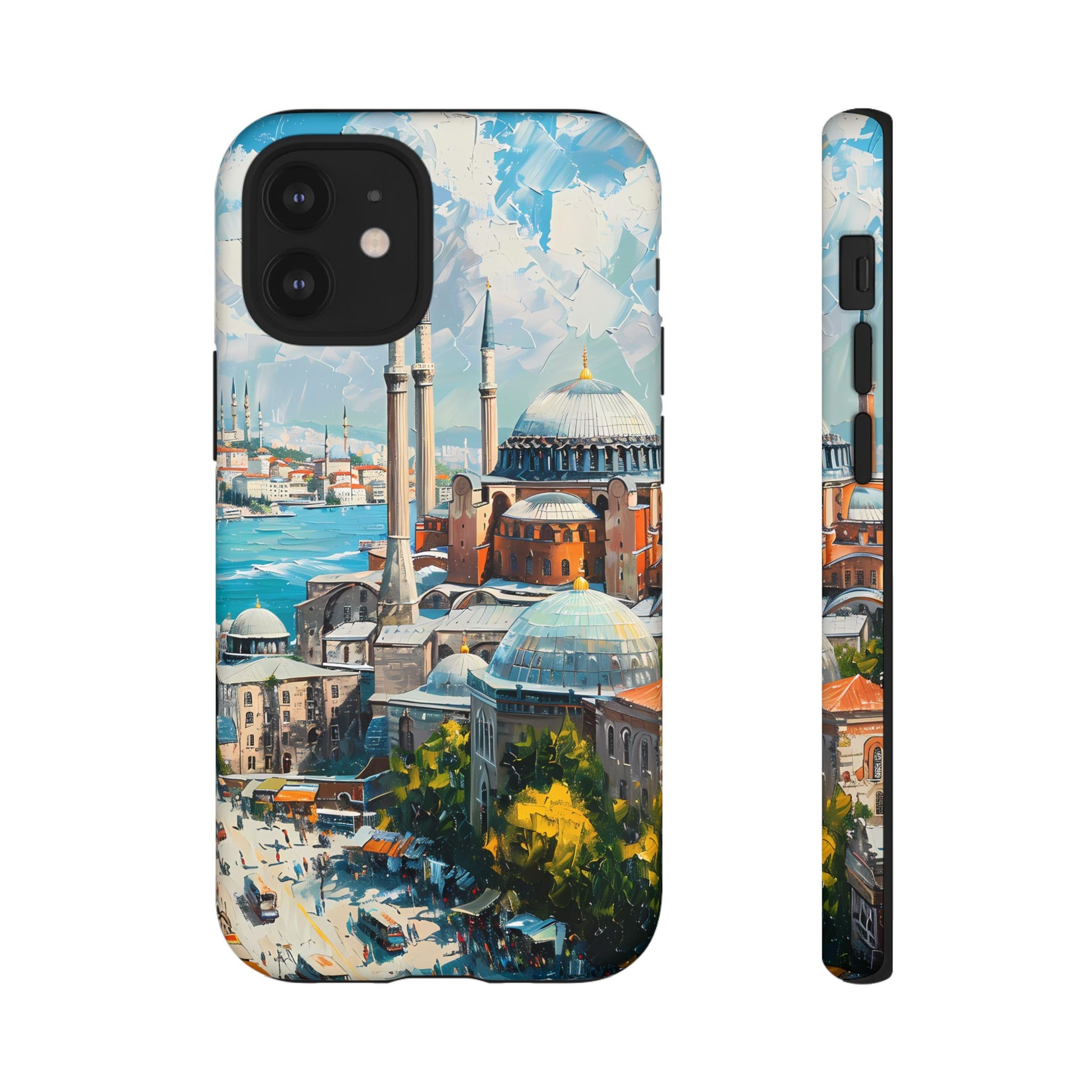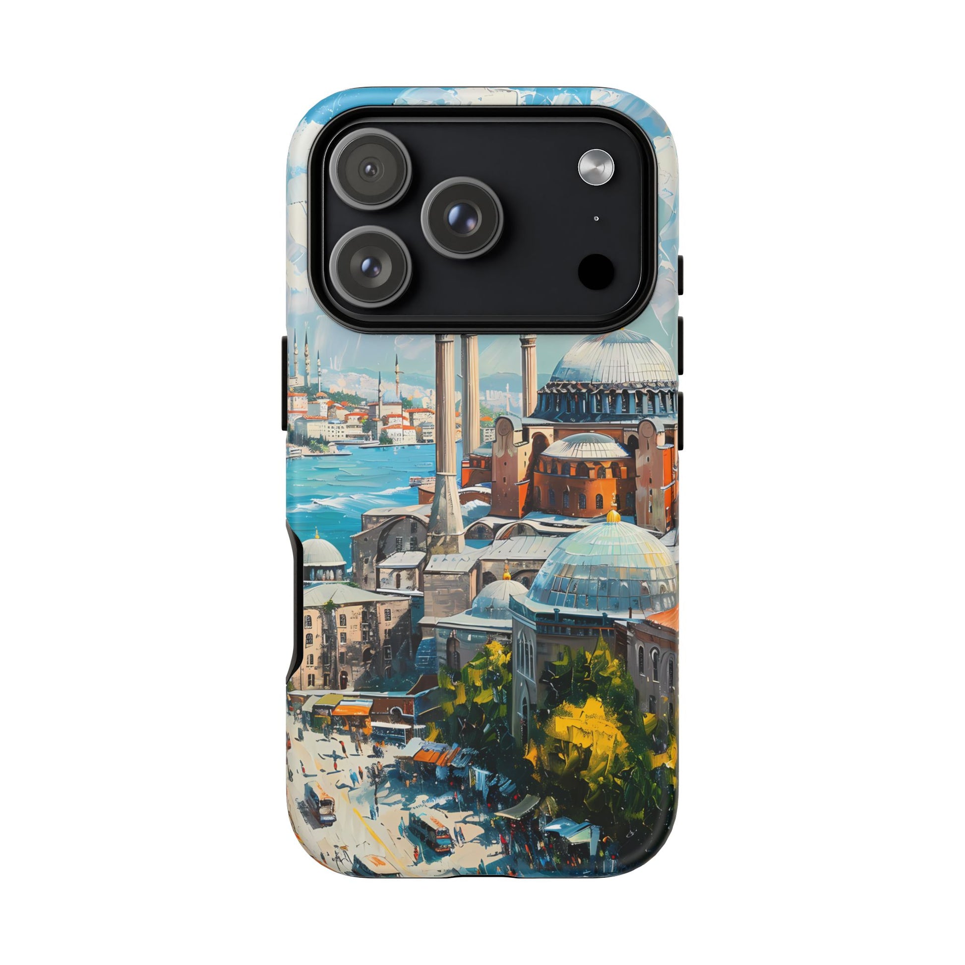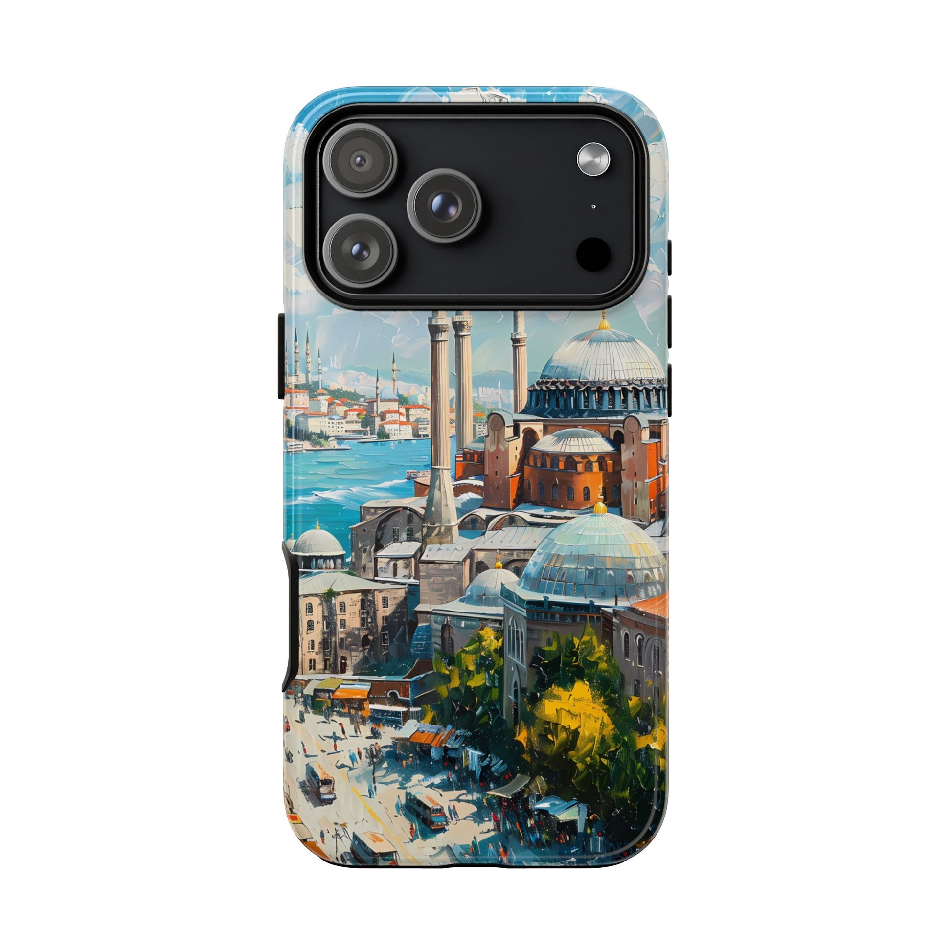 Experience the grandeur of Istanbul with the "Ottoman Opulence" phone cover. This design captures the timeless beauty of the Hagia Sophia, the bustling life of the bazaars, and the stunning mosques, all depicted in a masterful oil painting that embodies the spirit of this historic city.