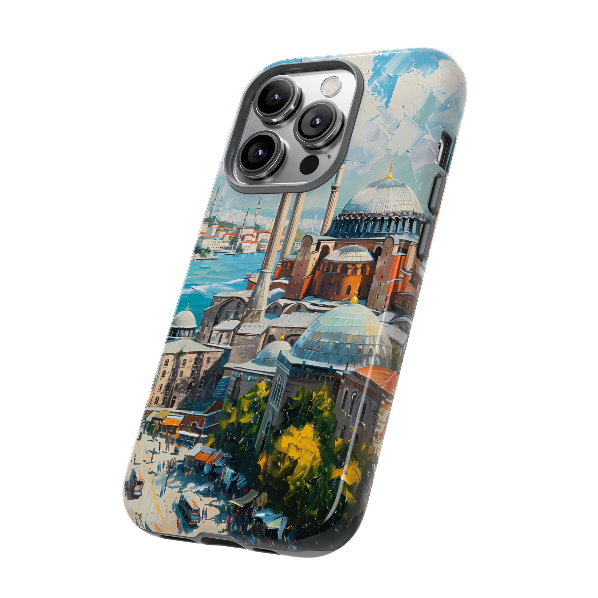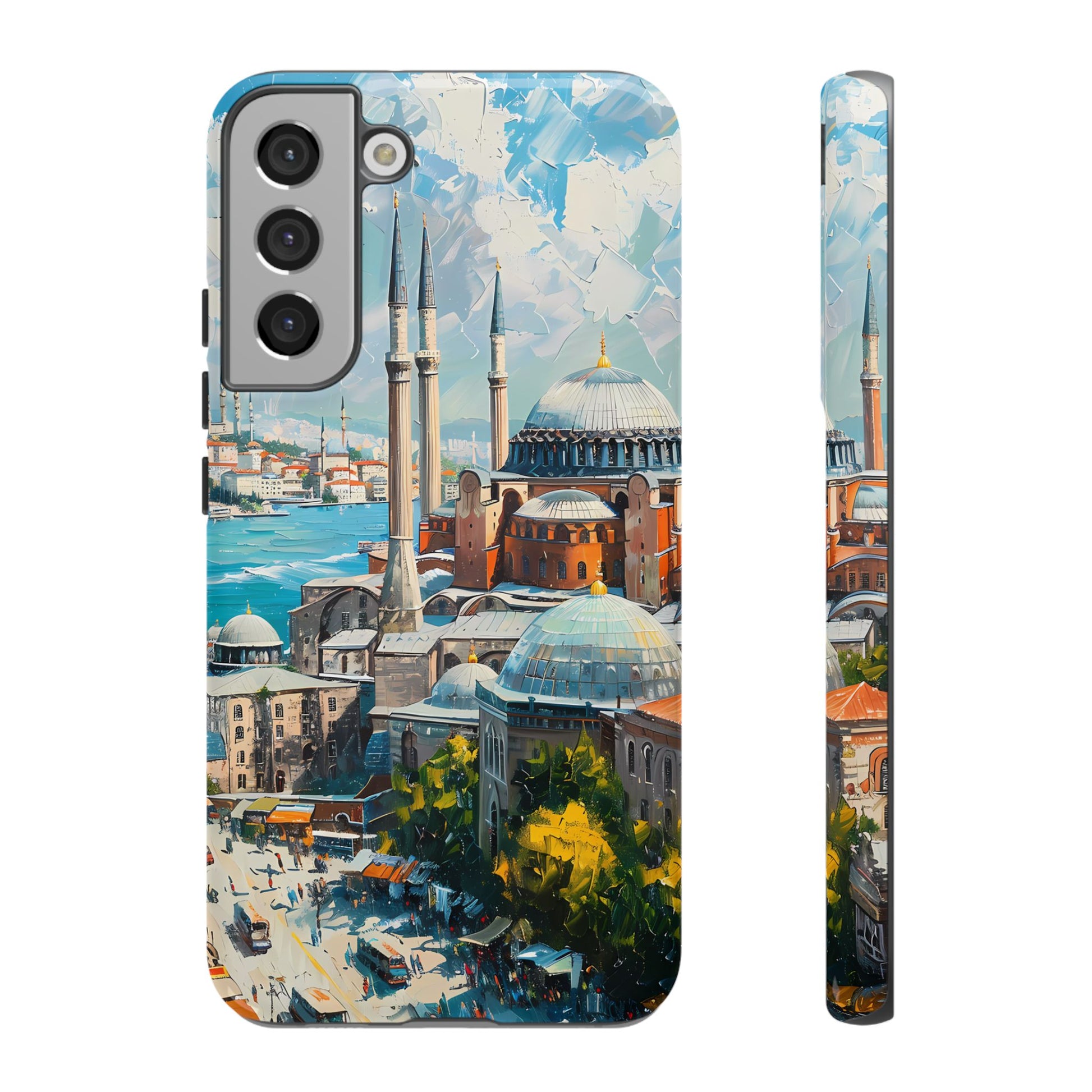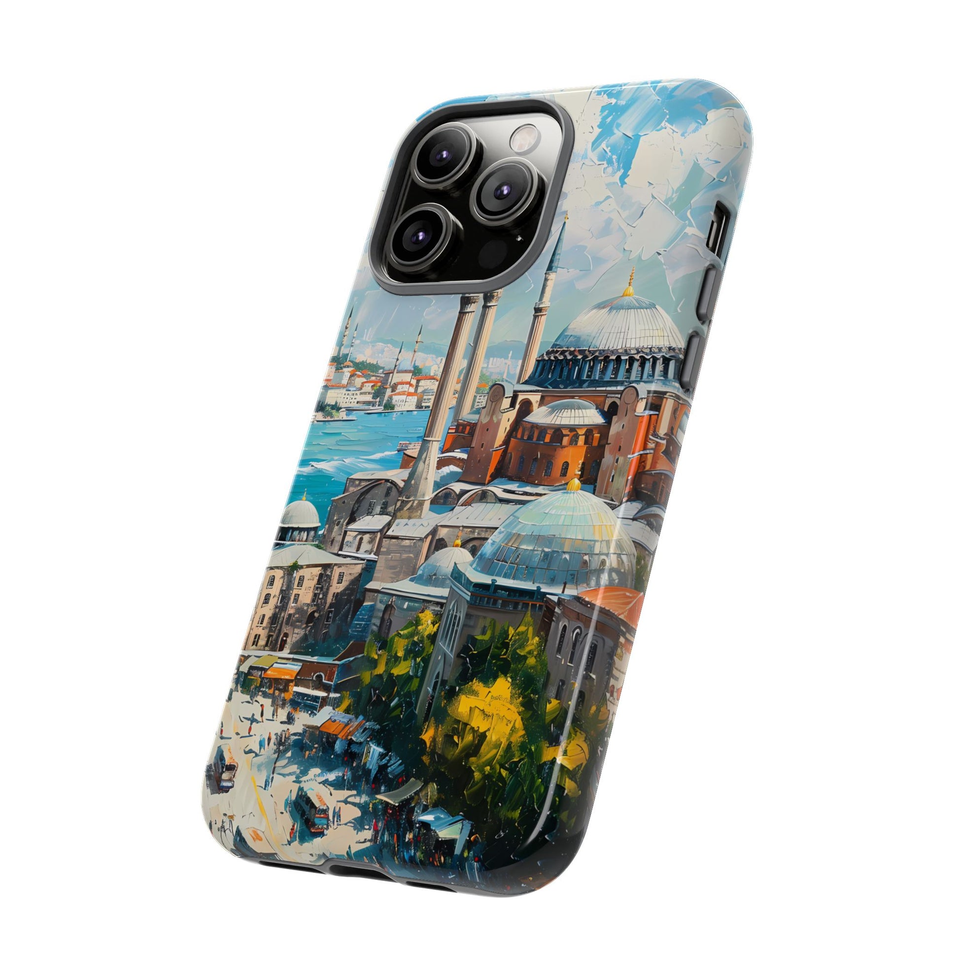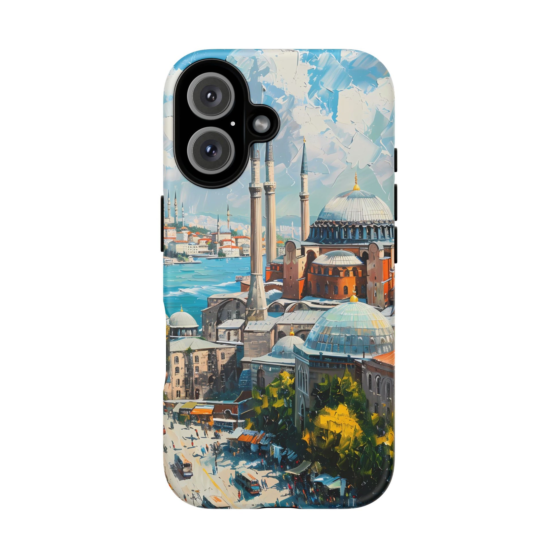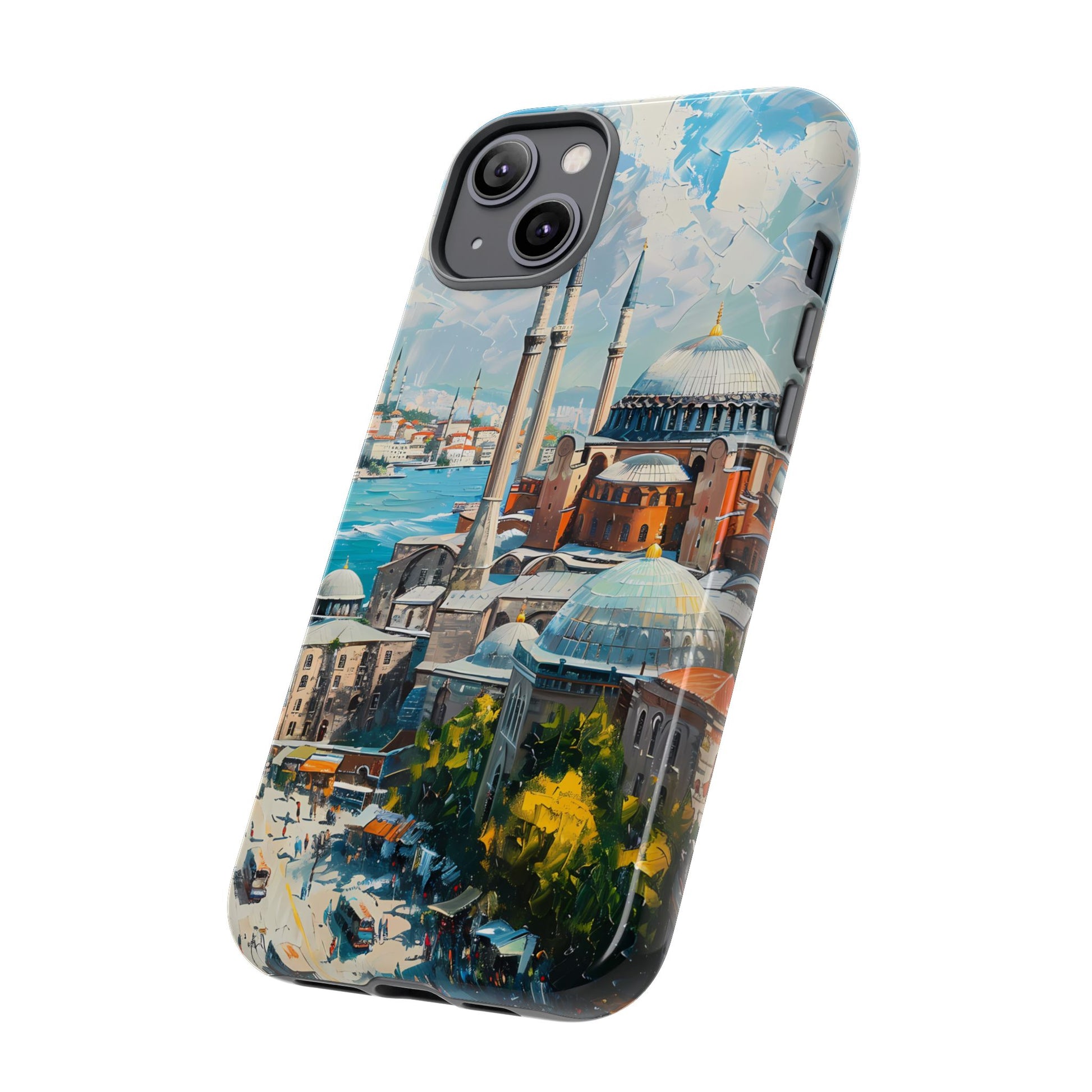 Experience the grandeur of Istanbul with the "Ottoman Opulence" phone cover. This design captures the timeless beauty of the Hagia Sophia, the bustling life of the bazaars, and the stunning mosques, all depicted in a masterful oil painting that embodies the spirit of this historic city.