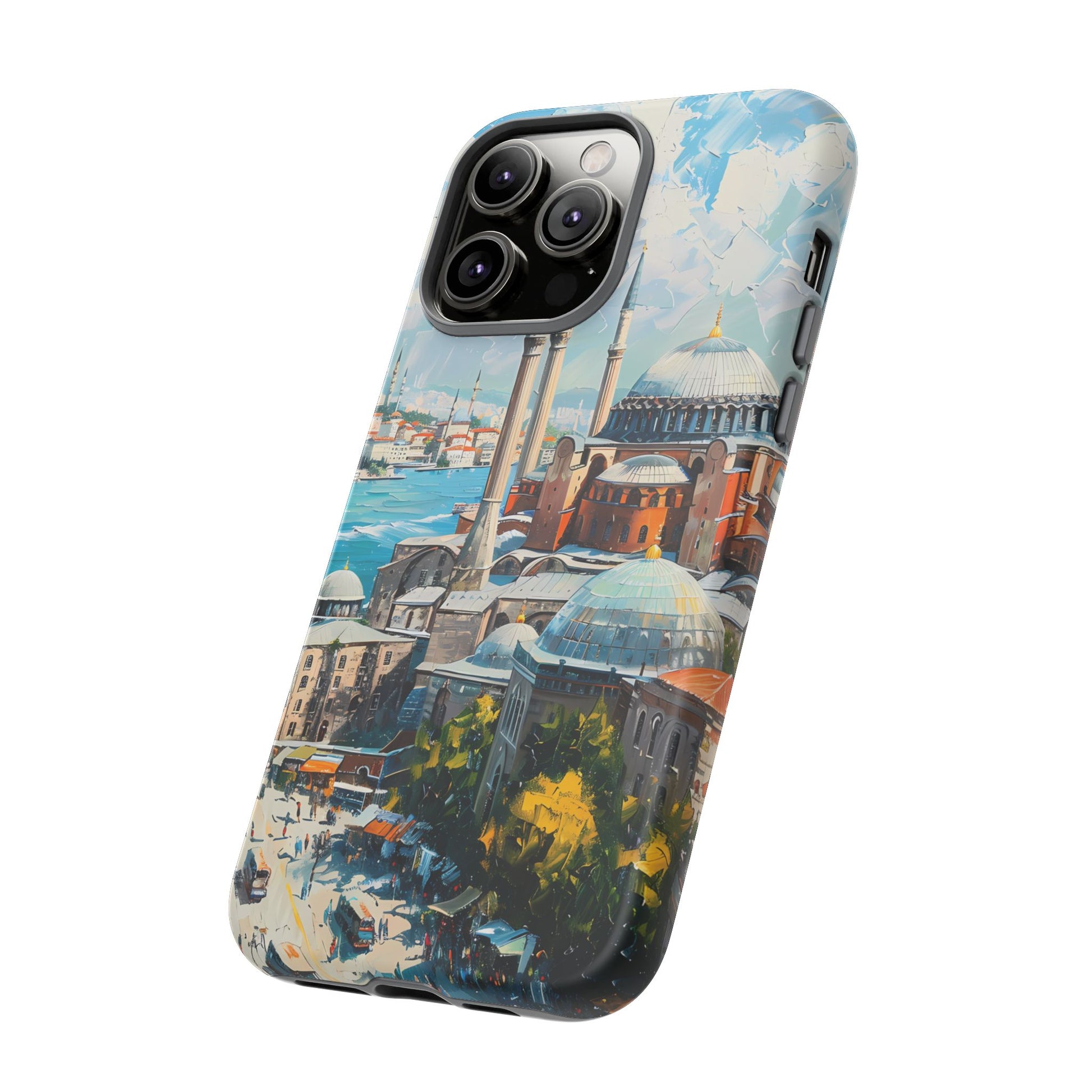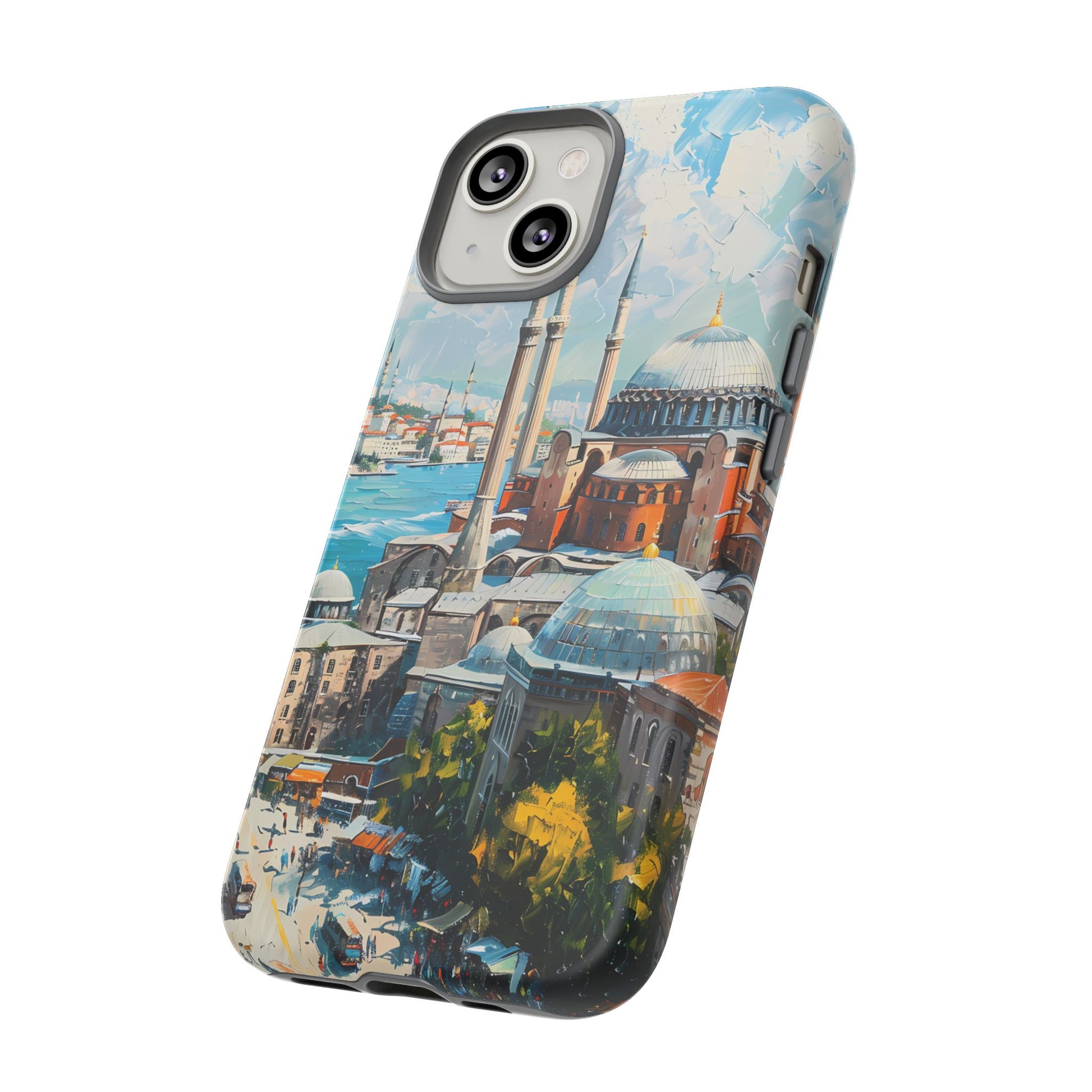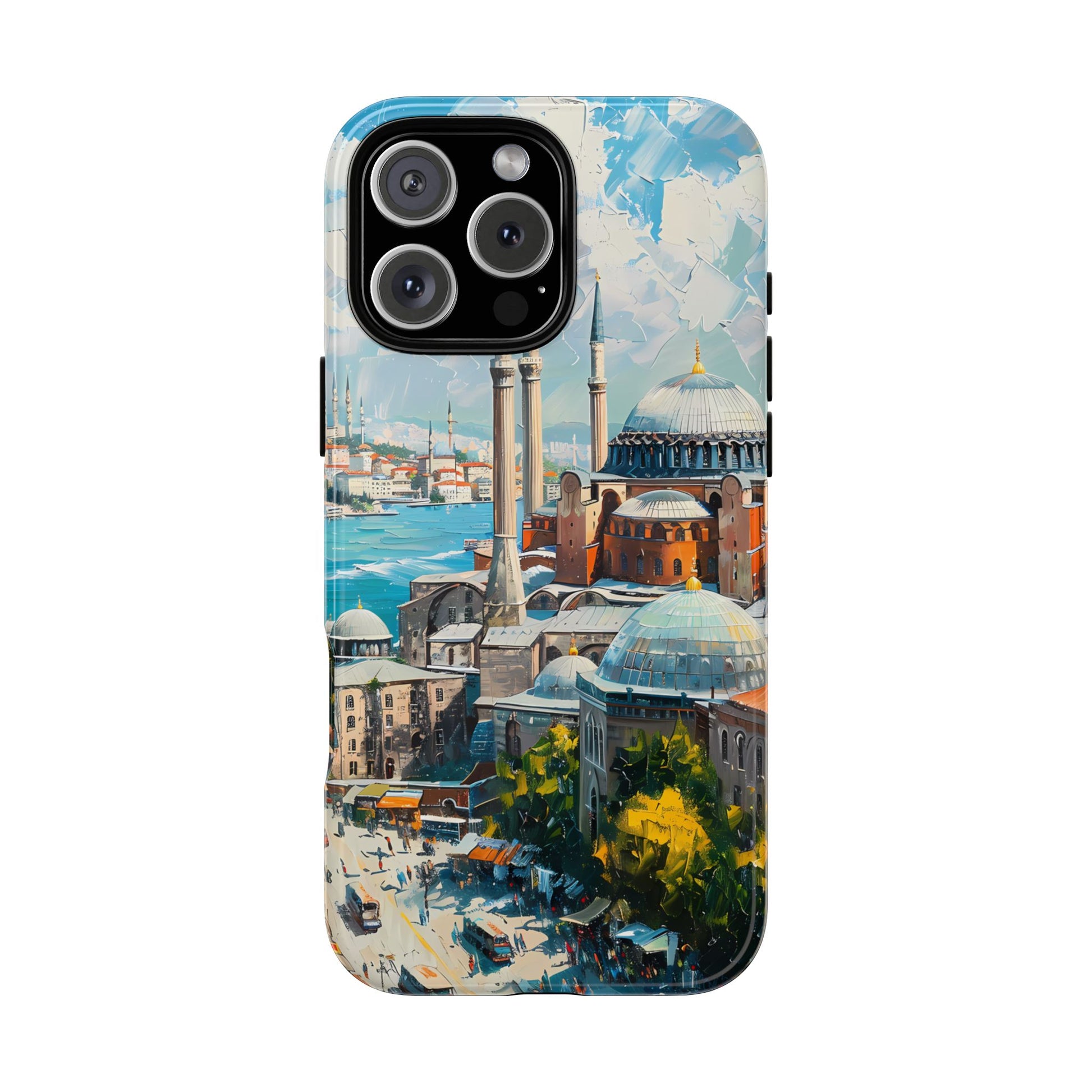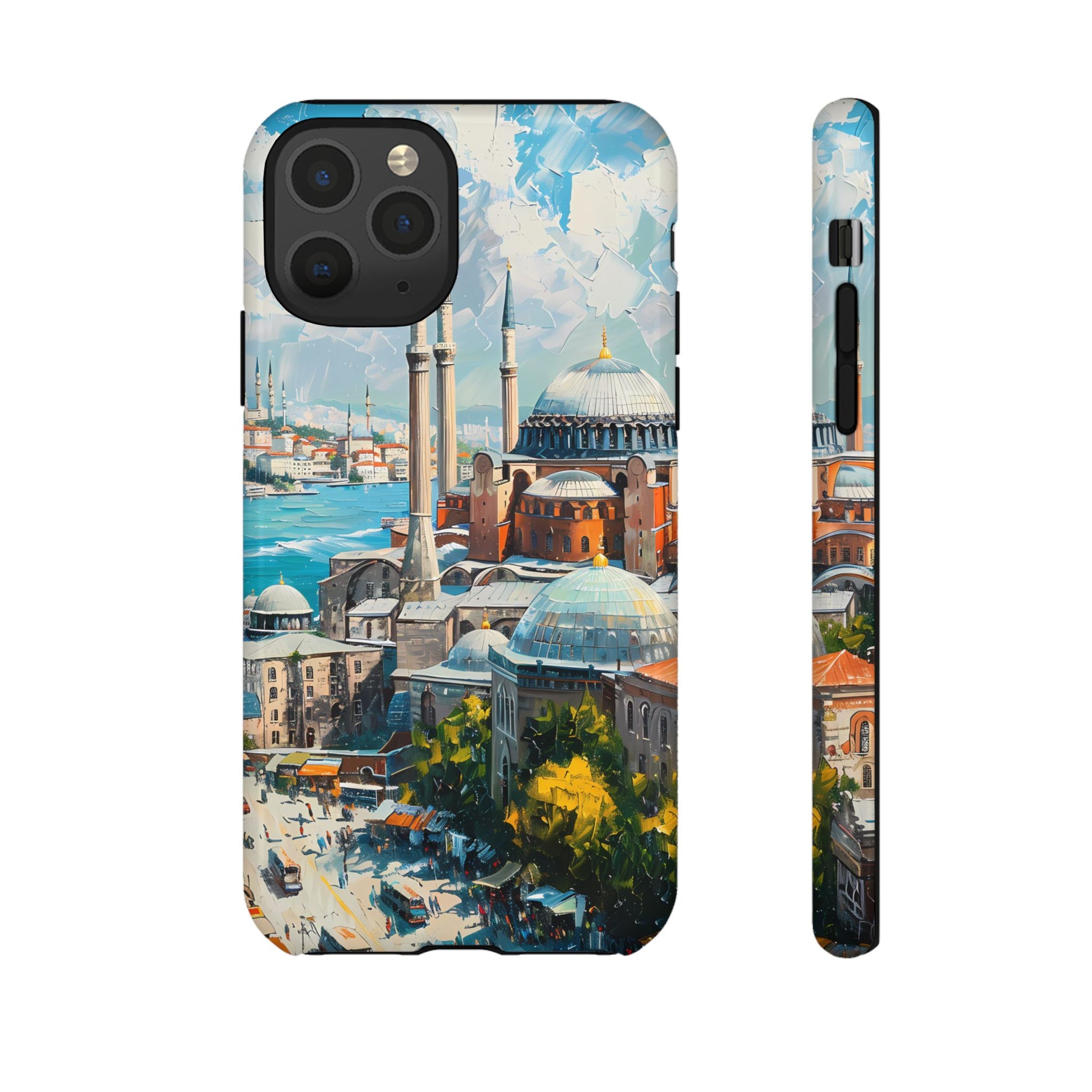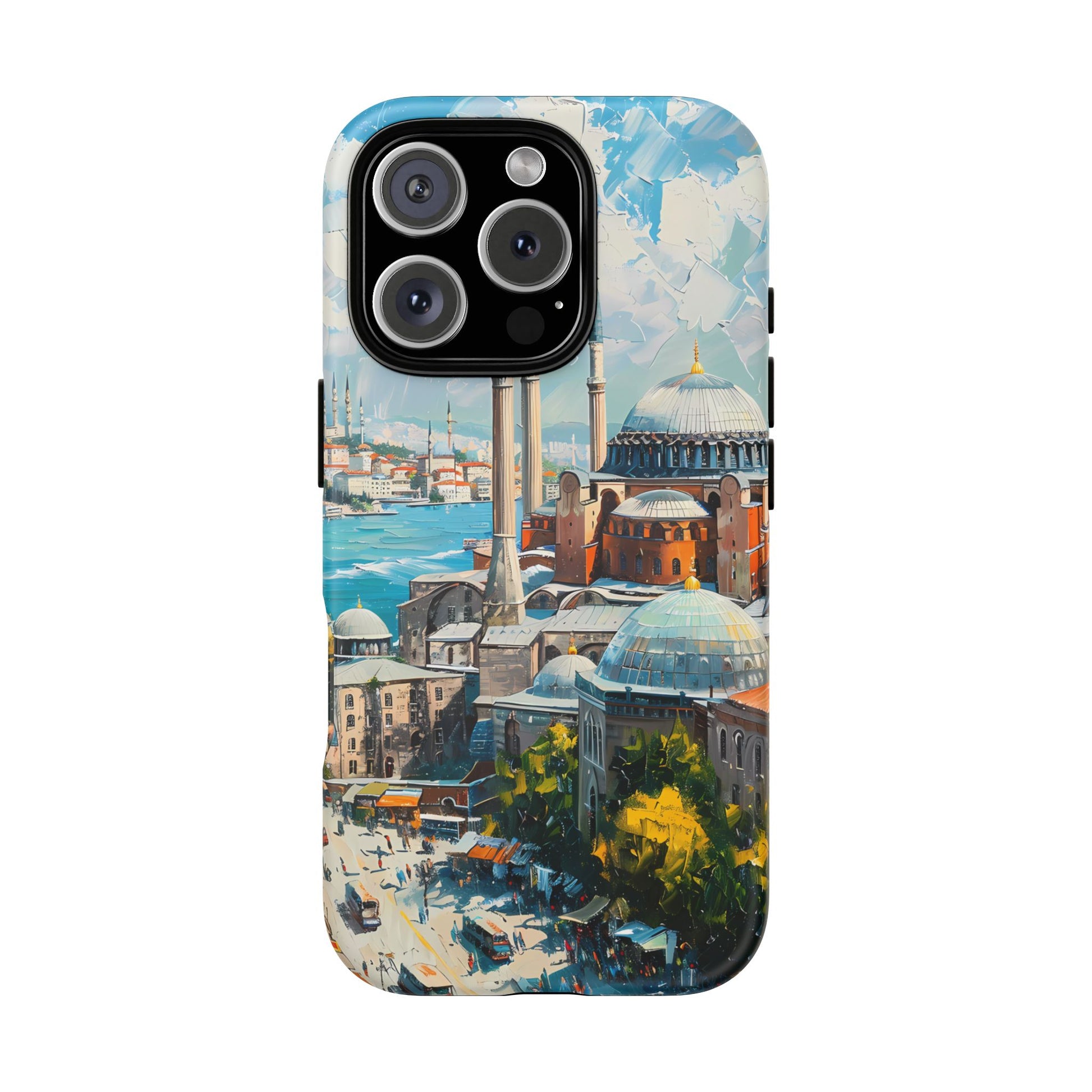 Experience the grandeur of Istanbul with the "Ottoman Opulence" phone cover. This design captures the timeless beauty of the Hagia Sophia, the bustling life of the bazaars, and the stunning mosques, all depicted in a masterful oil painting that embodies the spirit of this historic city.