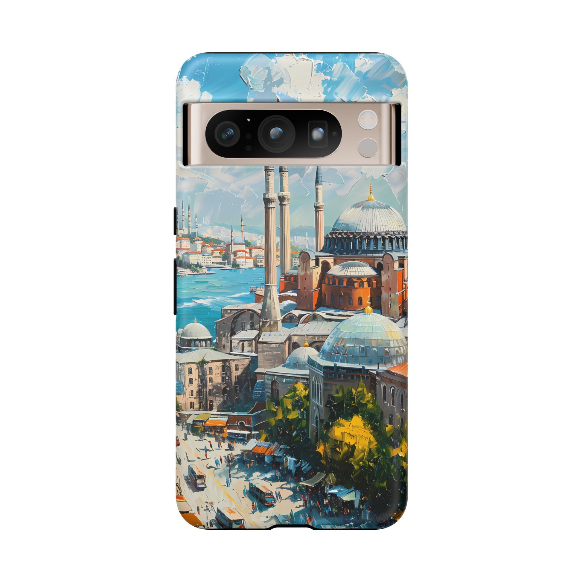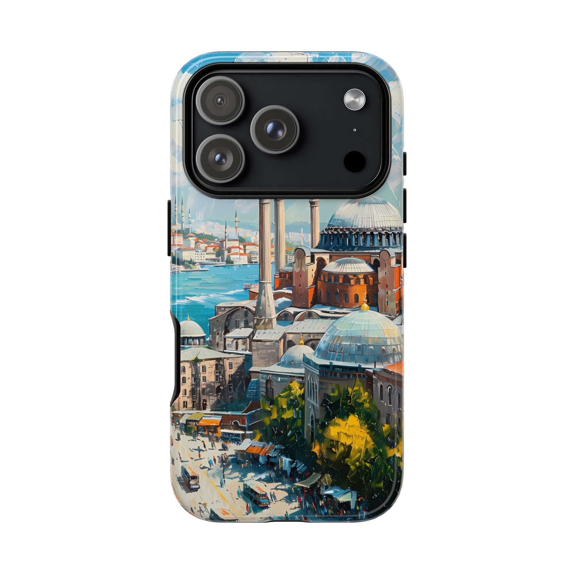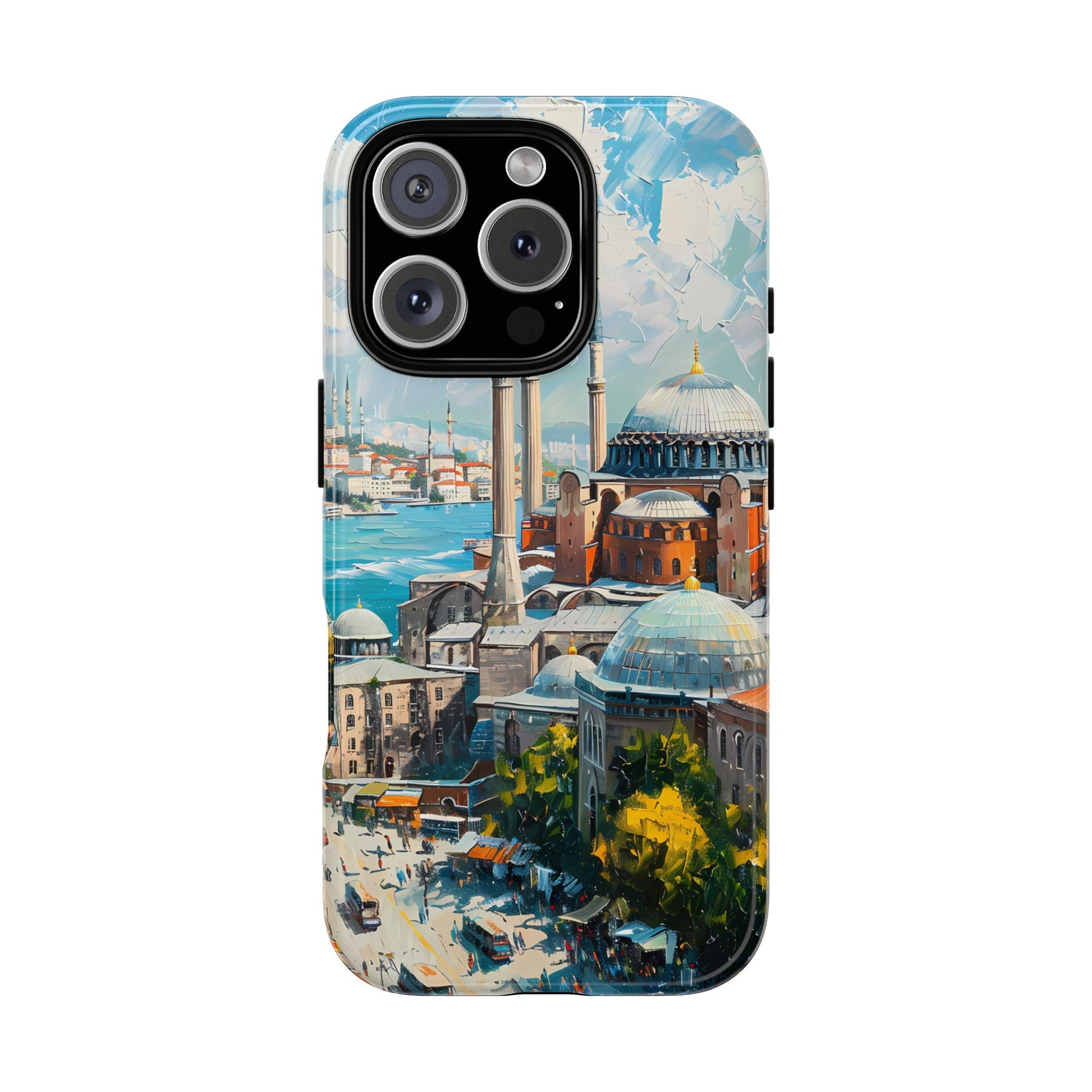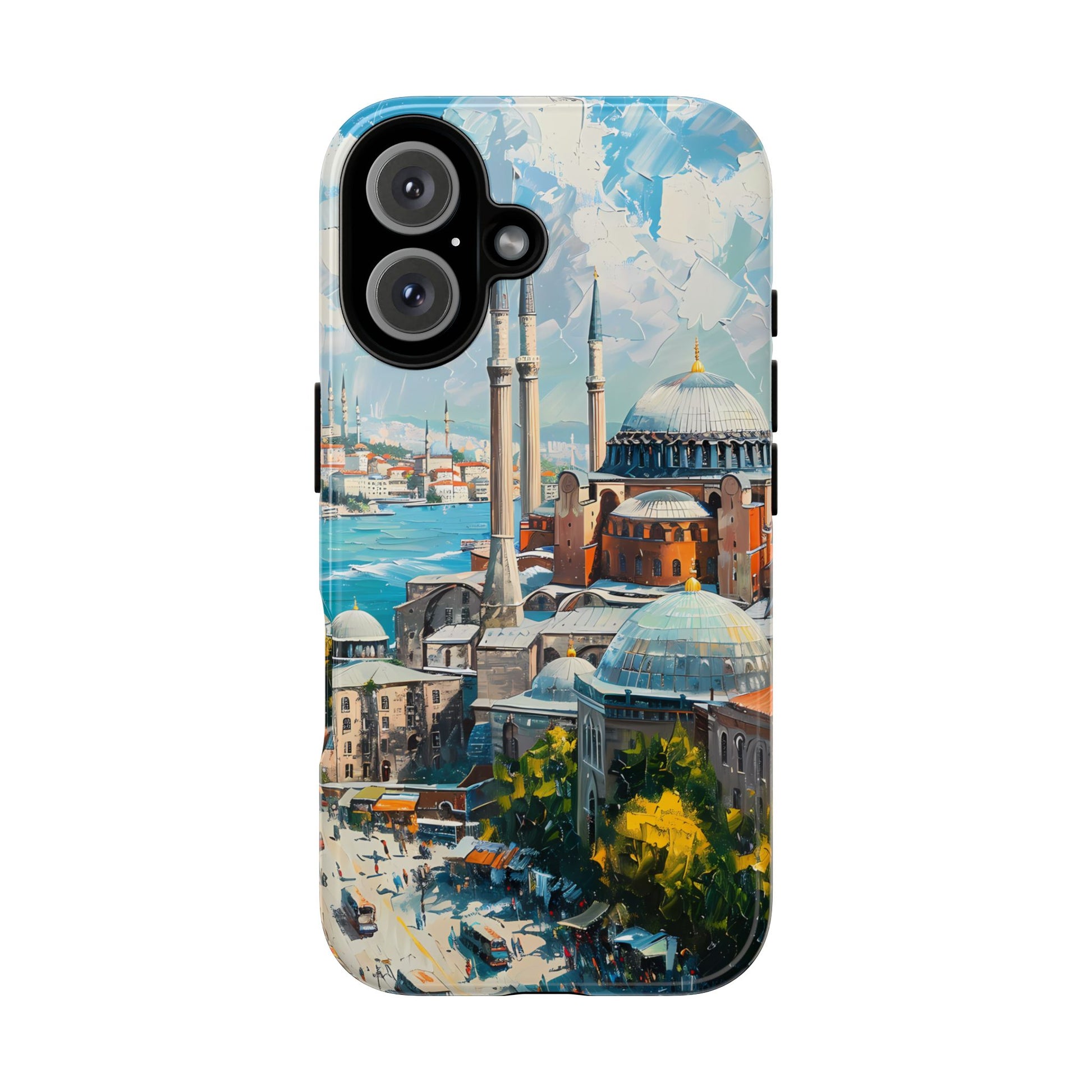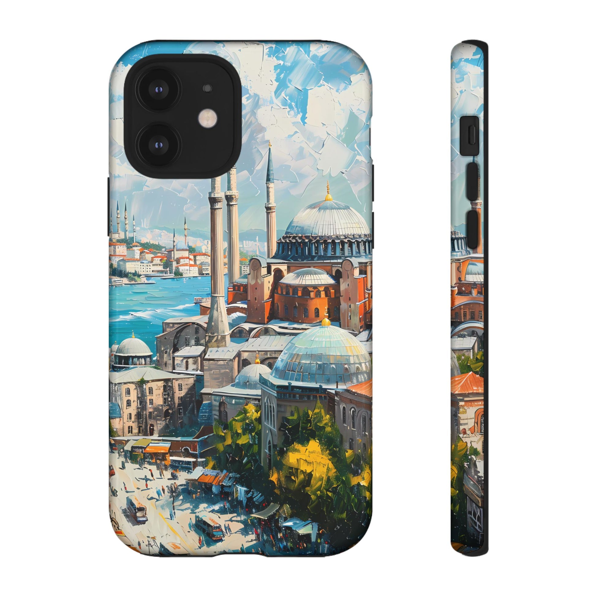 Experience the grandeur of Istanbul with the "Ottoman Opulence" phone cover. This design captures the timeless beauty of the Hagia Sophia, the bustling life of the bazaars, and the stunning mosques, all depicted in a masterful oil painting that embodies the spirit of this historic city.