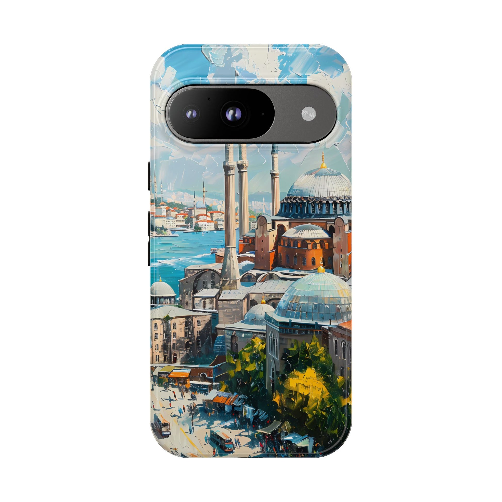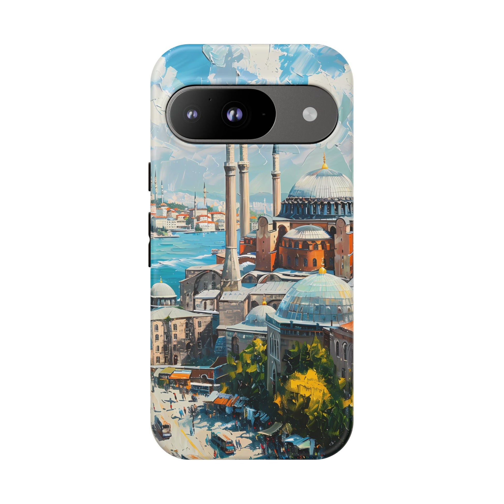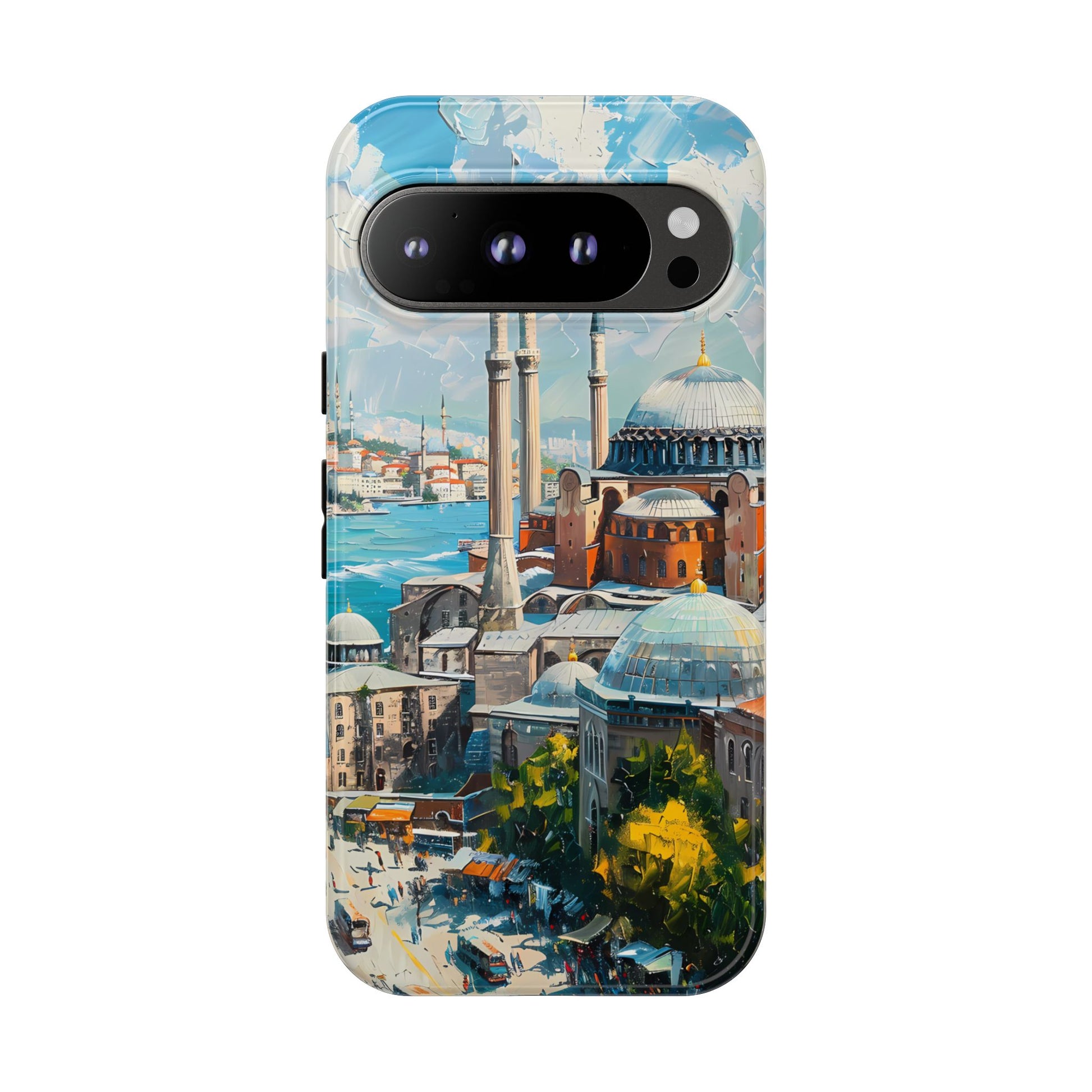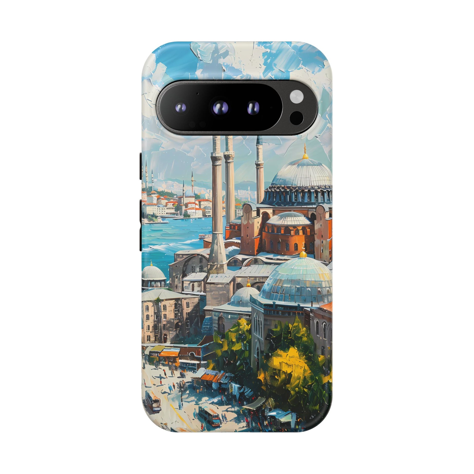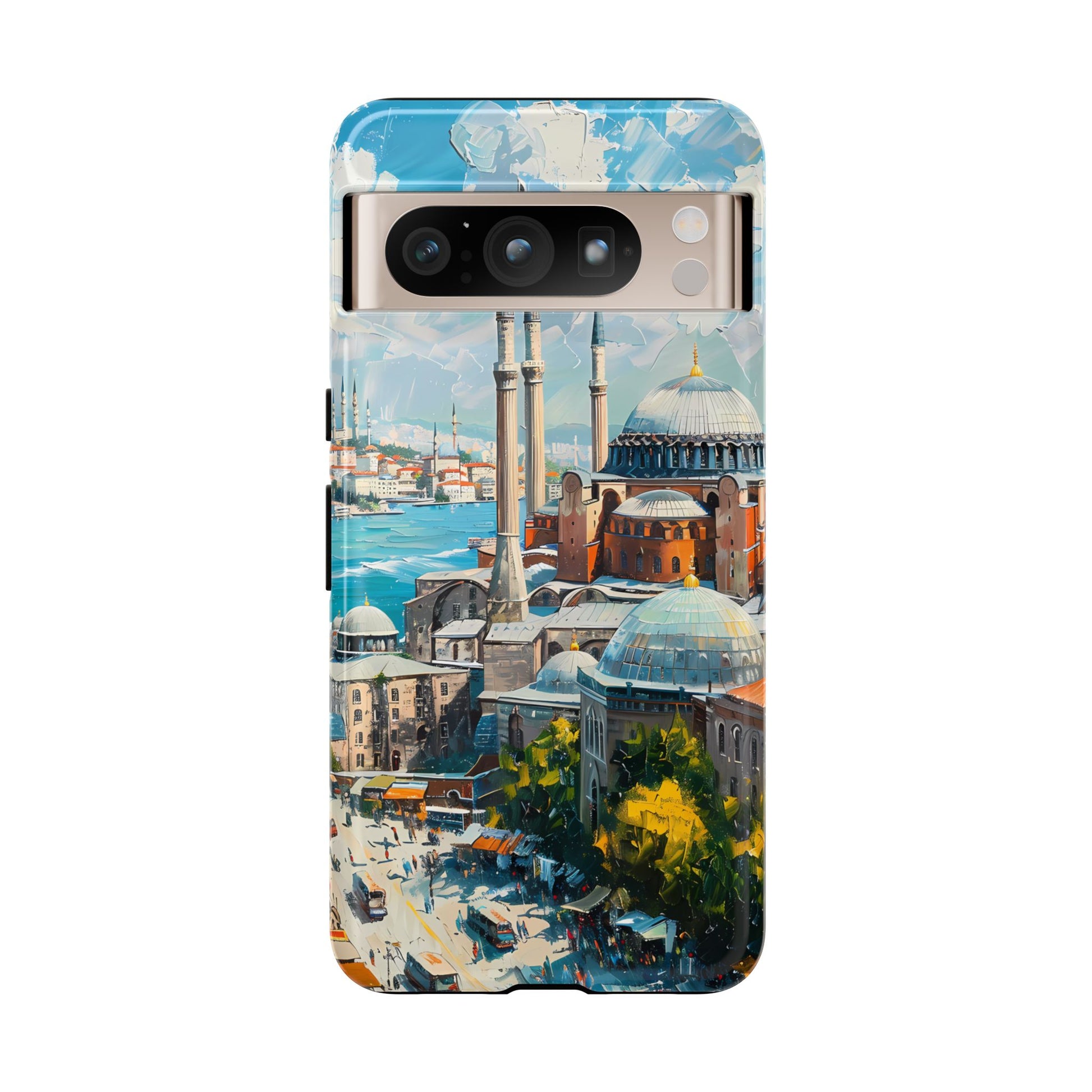 Experience the grandeur of Istanbul with the "Ottoman Opulence" phone cover. This design captures the timeless beauty of the Hagia Sophia, the bustling life of the bazaars, and the stunning mosques, all depicted in a masterful oil painting that embodies the spirit of this historic city.