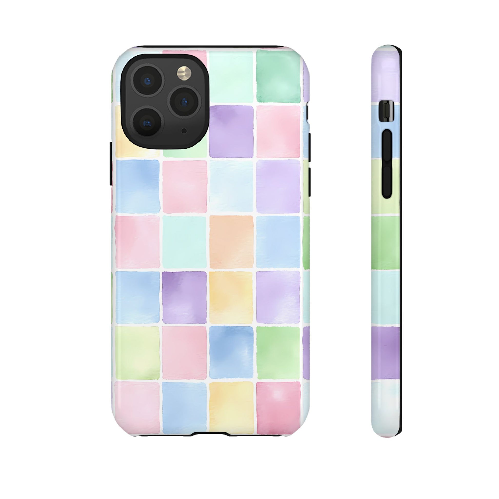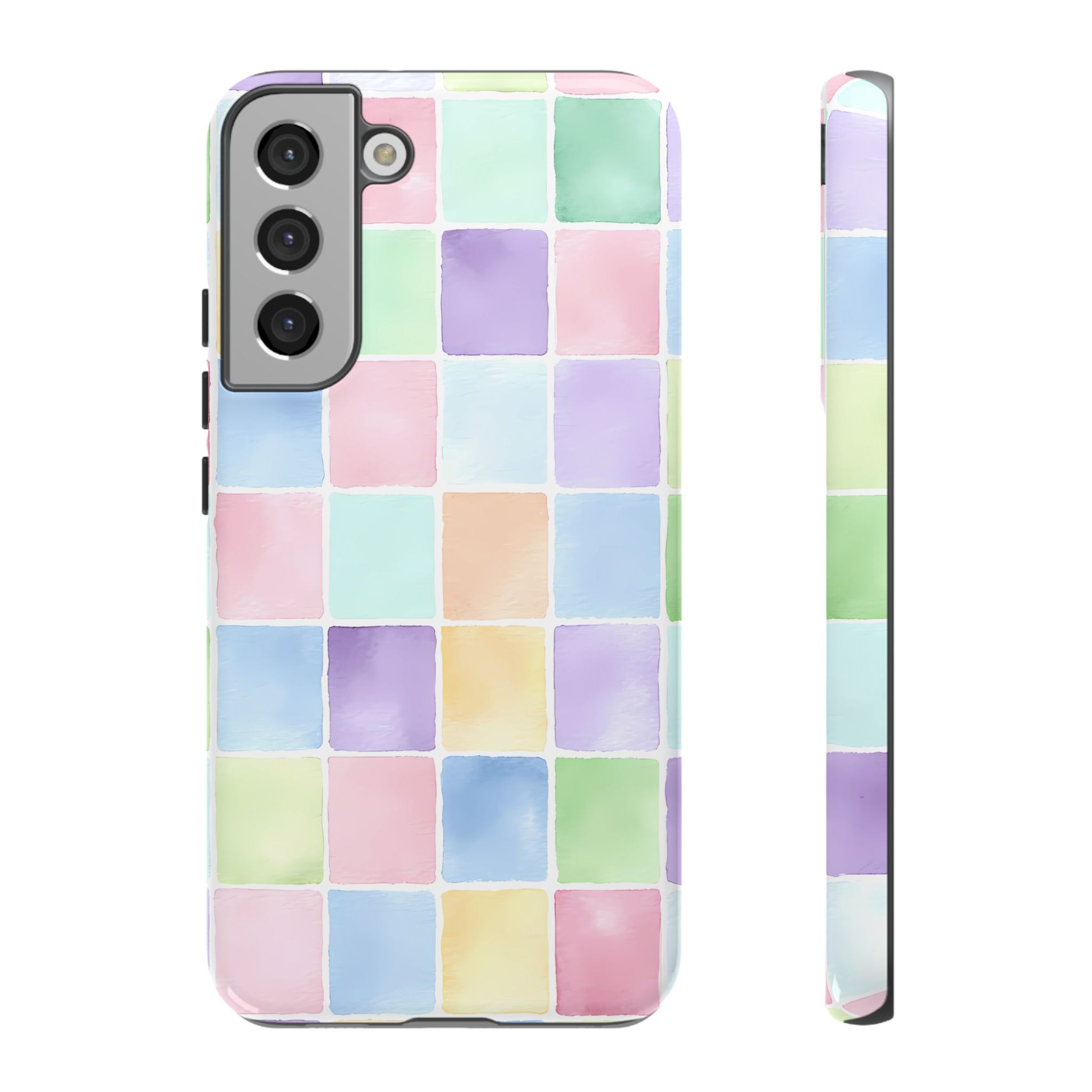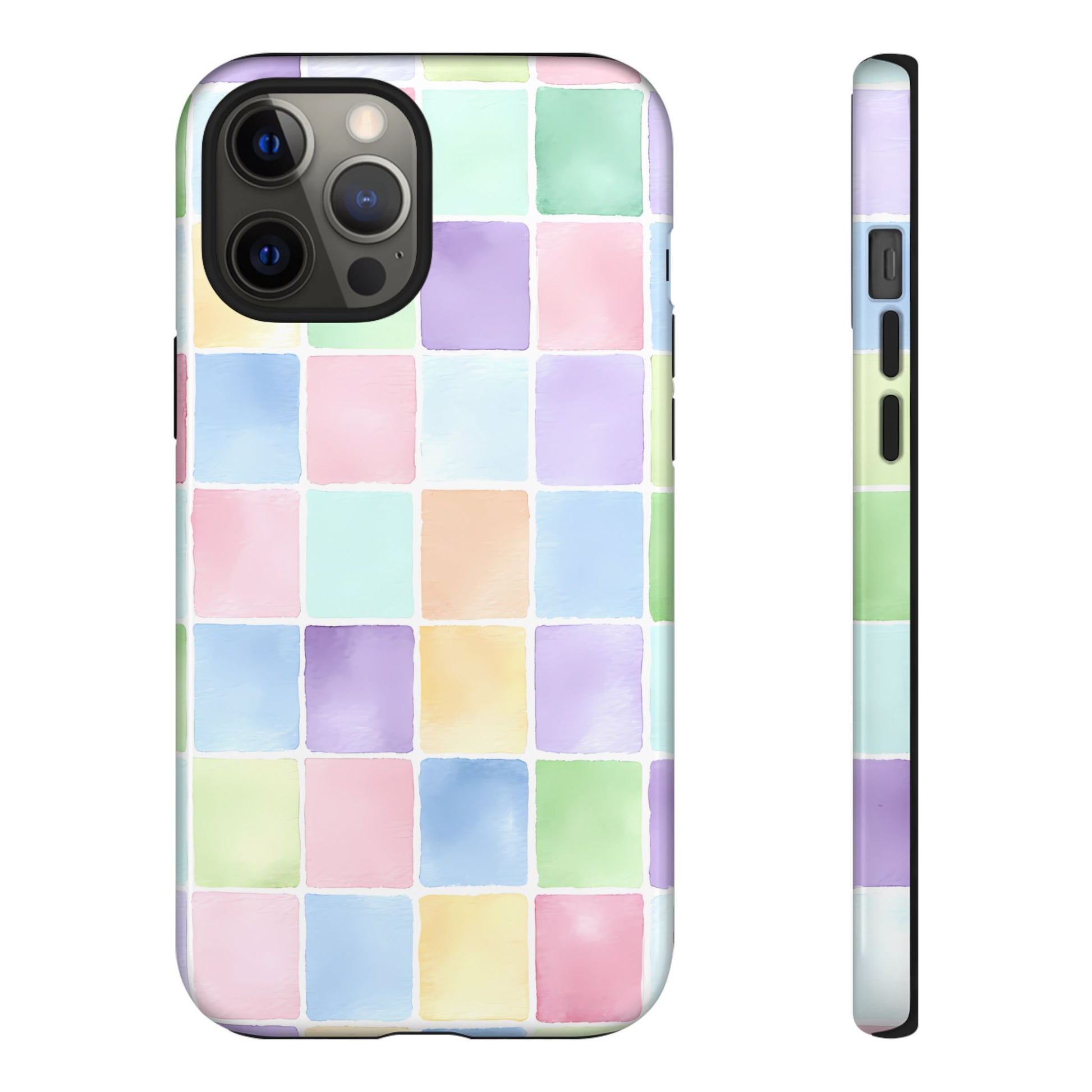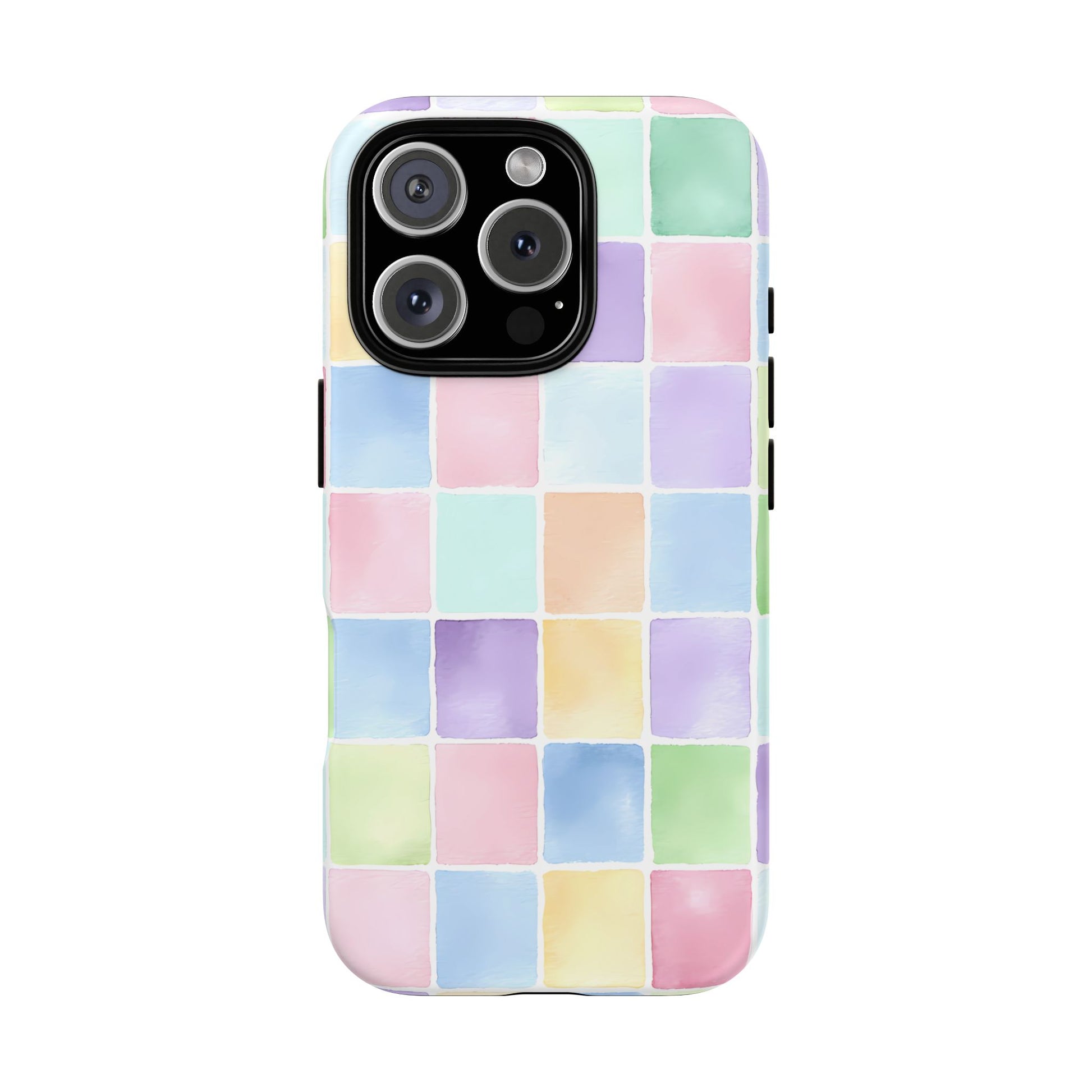 A seamless pastel checkered pattern of tiny watercolor squares floating across a clean white background, creating a playful yet refined aesthetic.