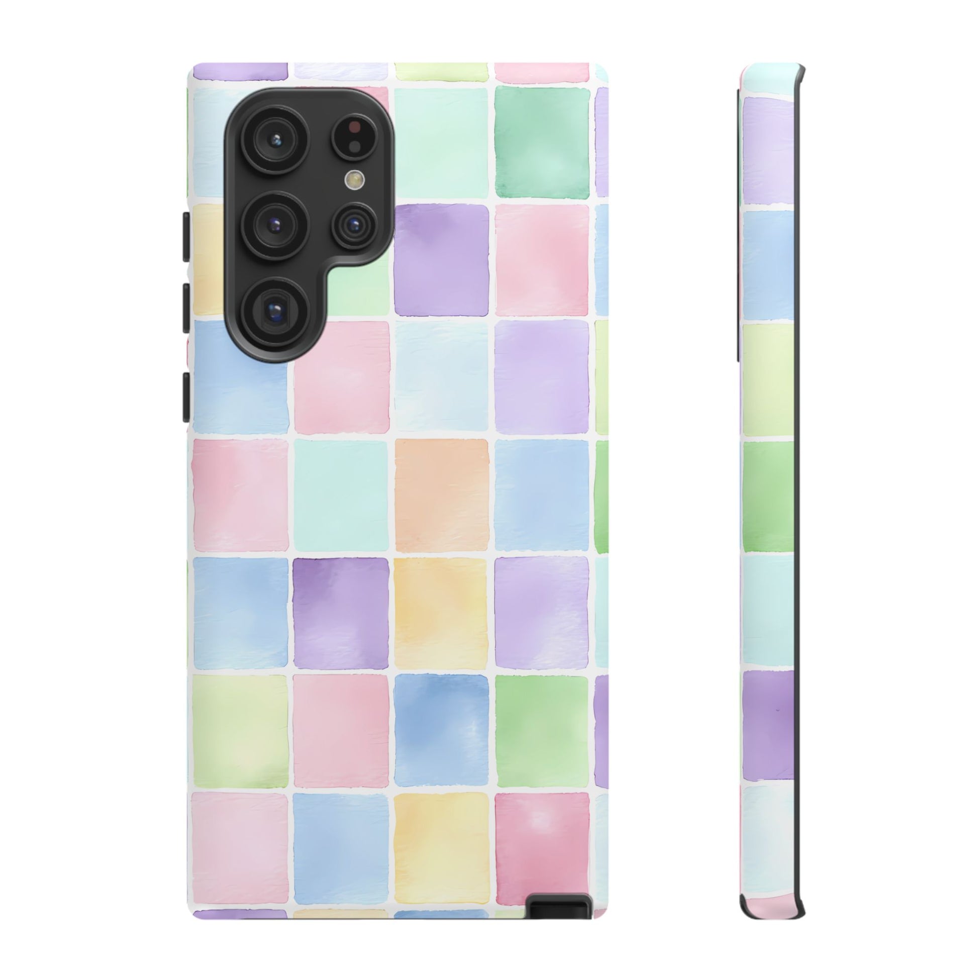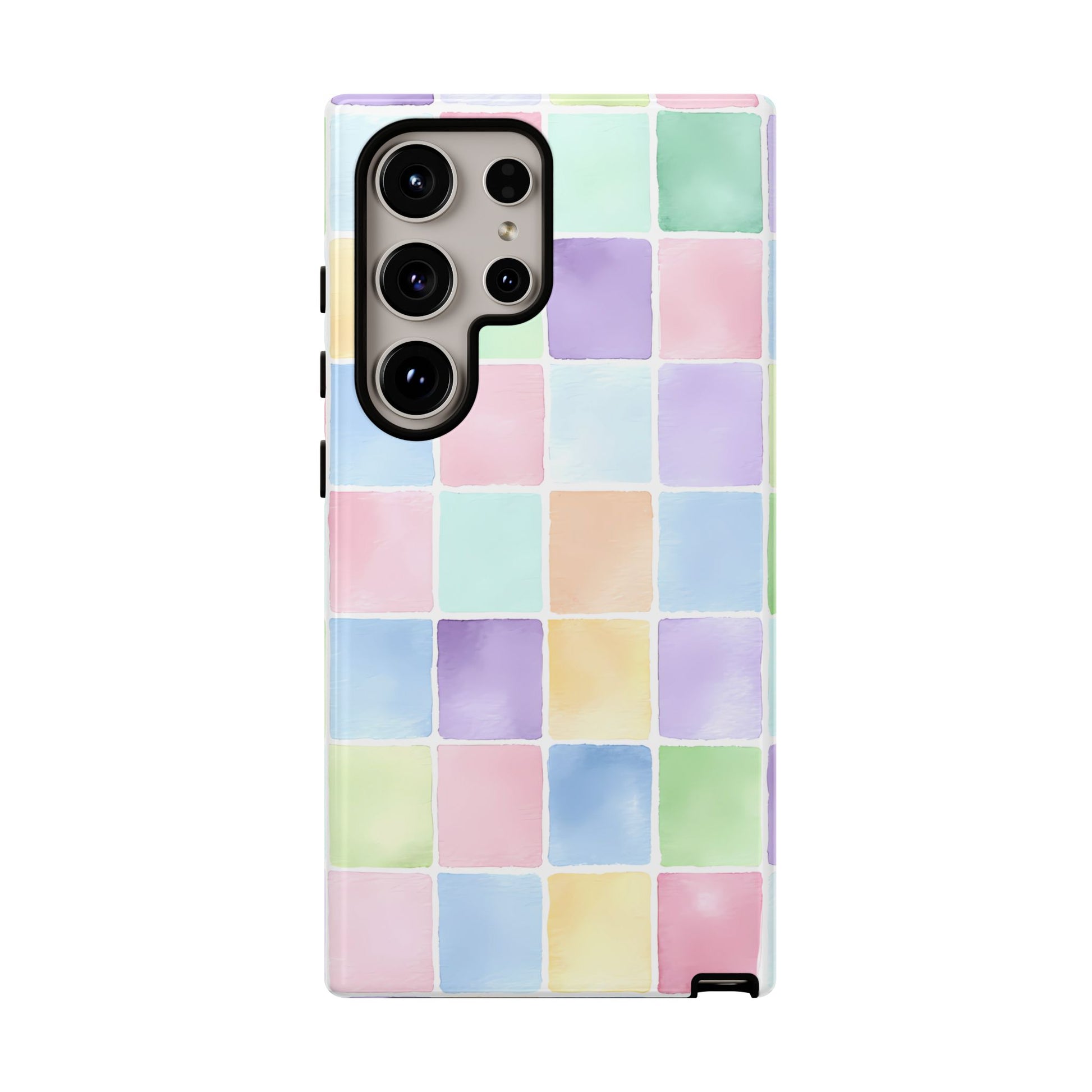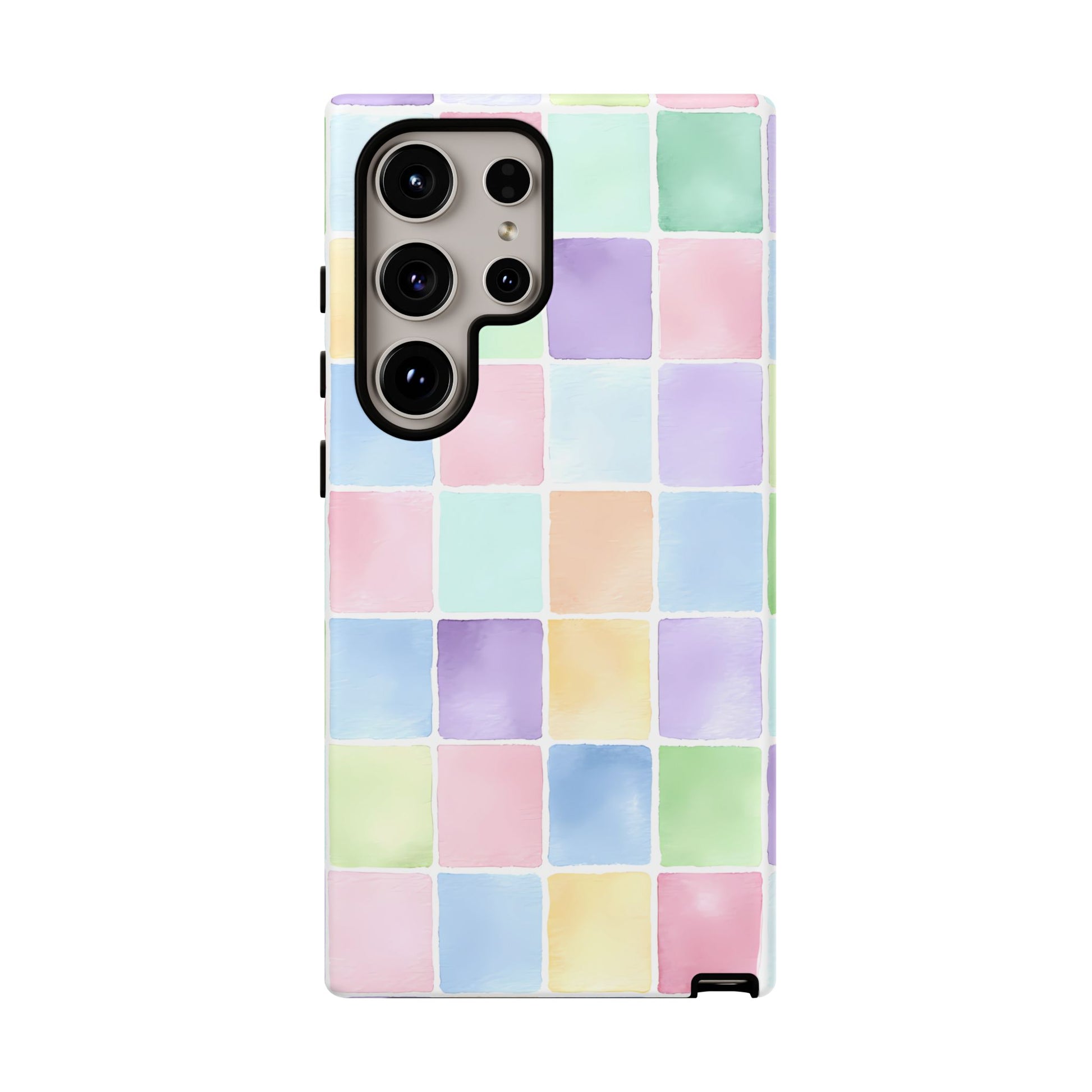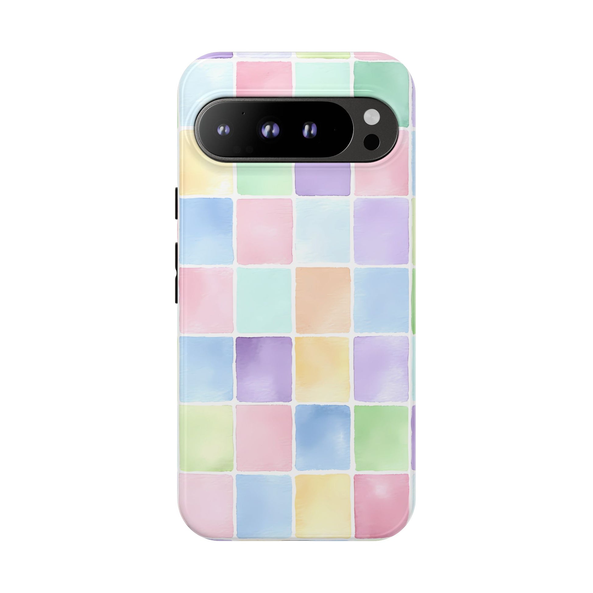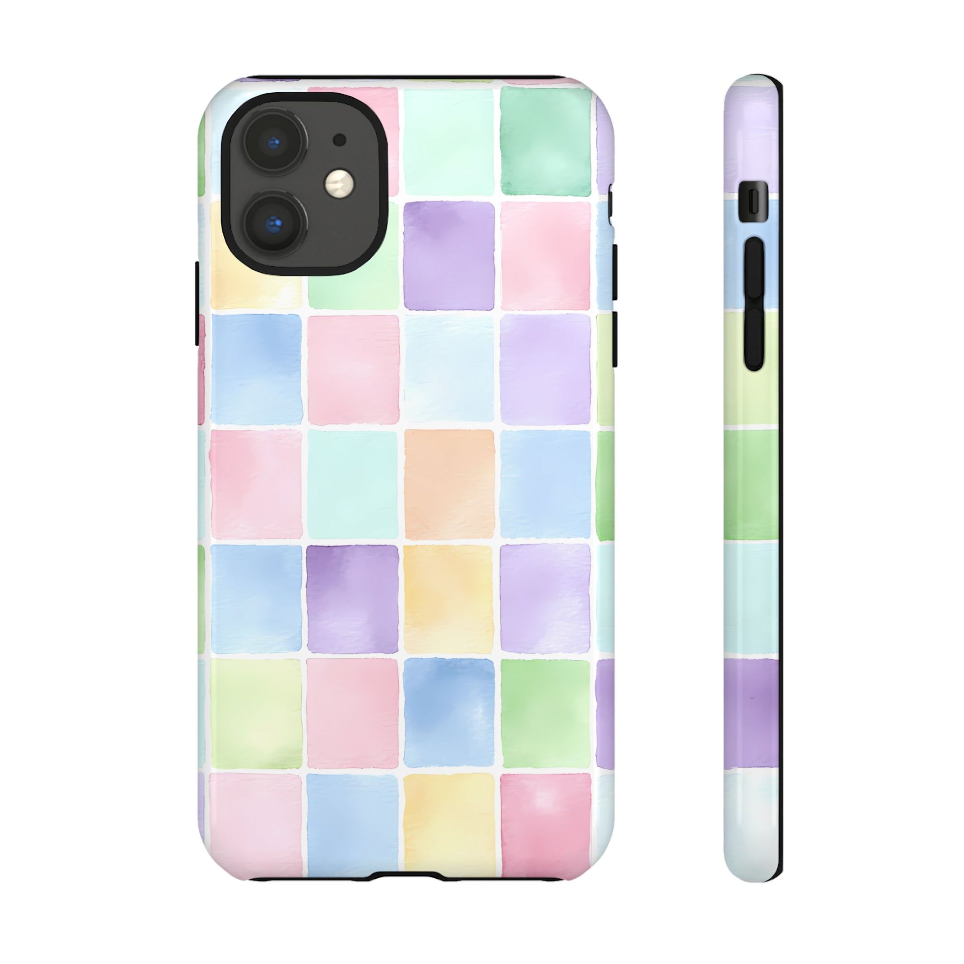 A seamless pastel checkered pattern of tiny watercolor squares floating across a clean white background, creating a playful yet refined aesthetic.