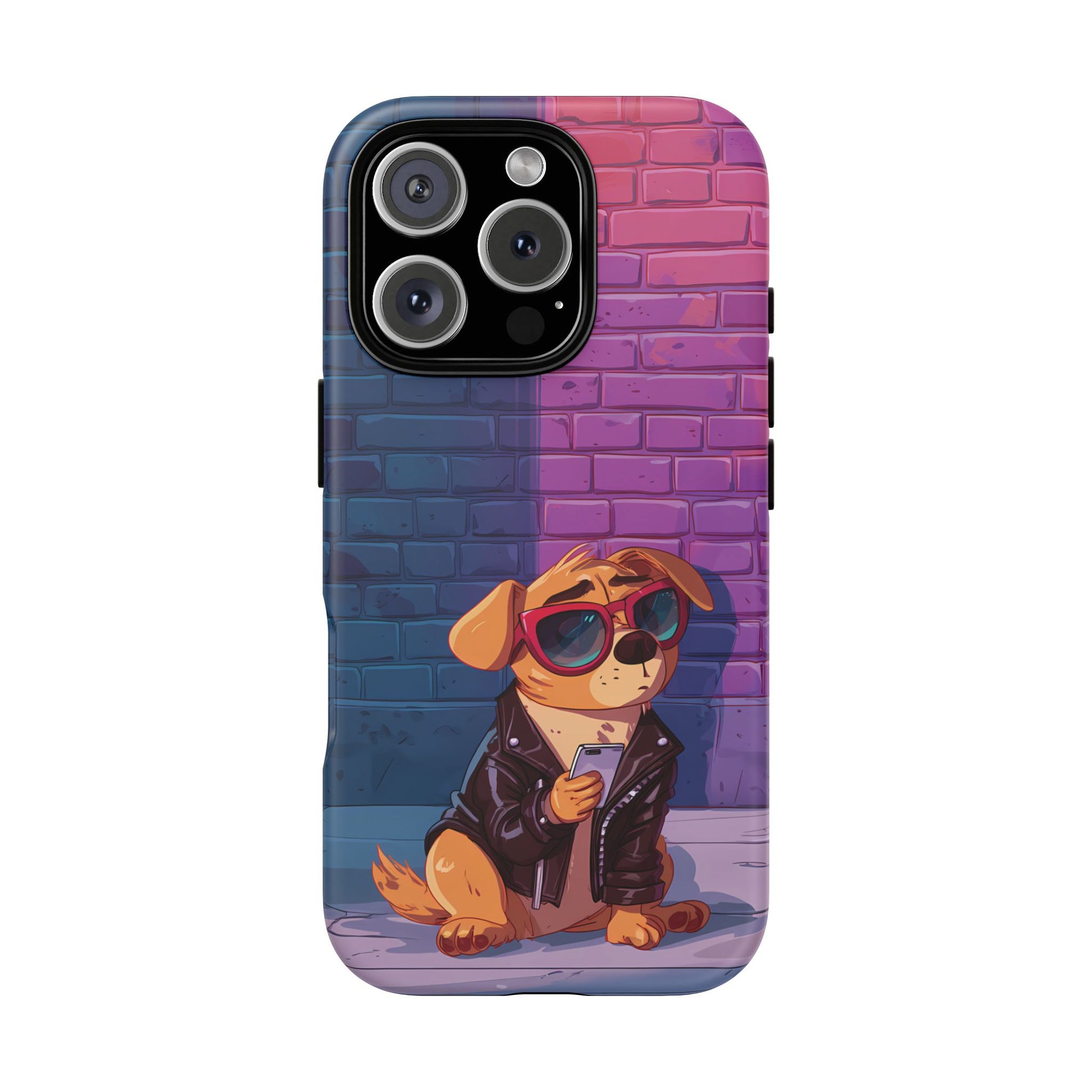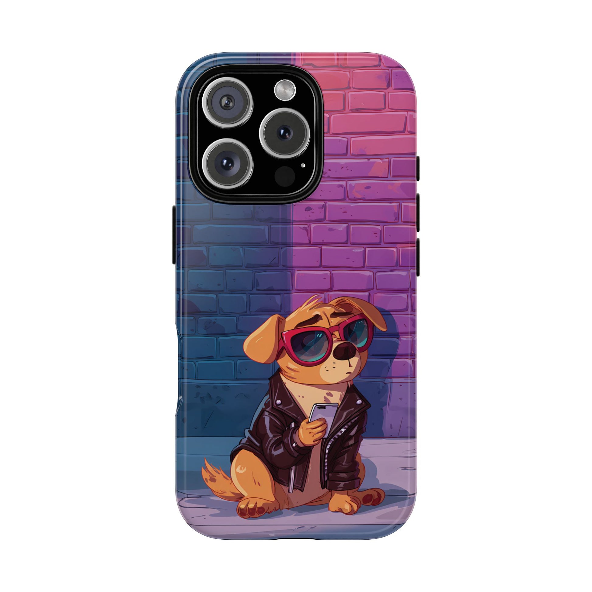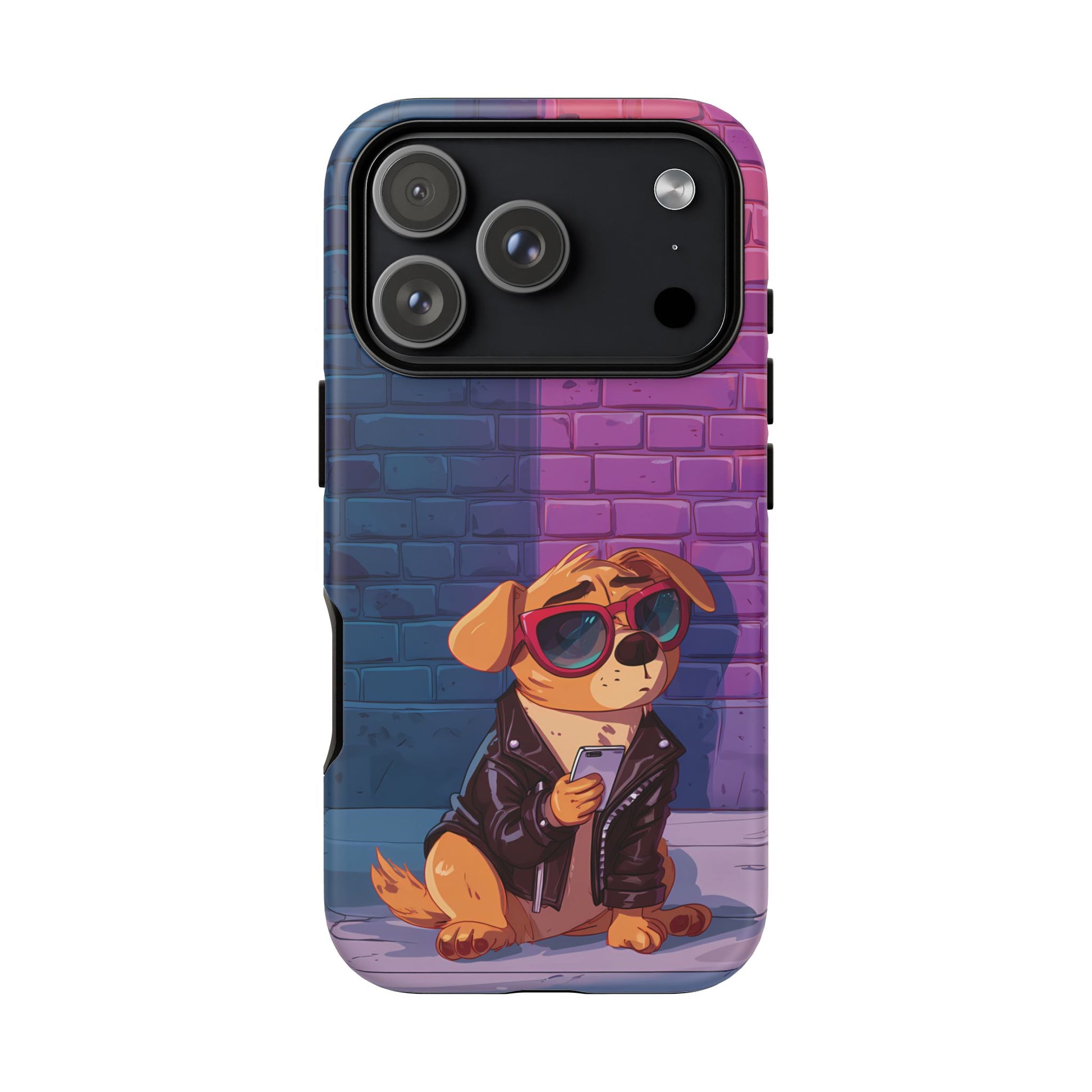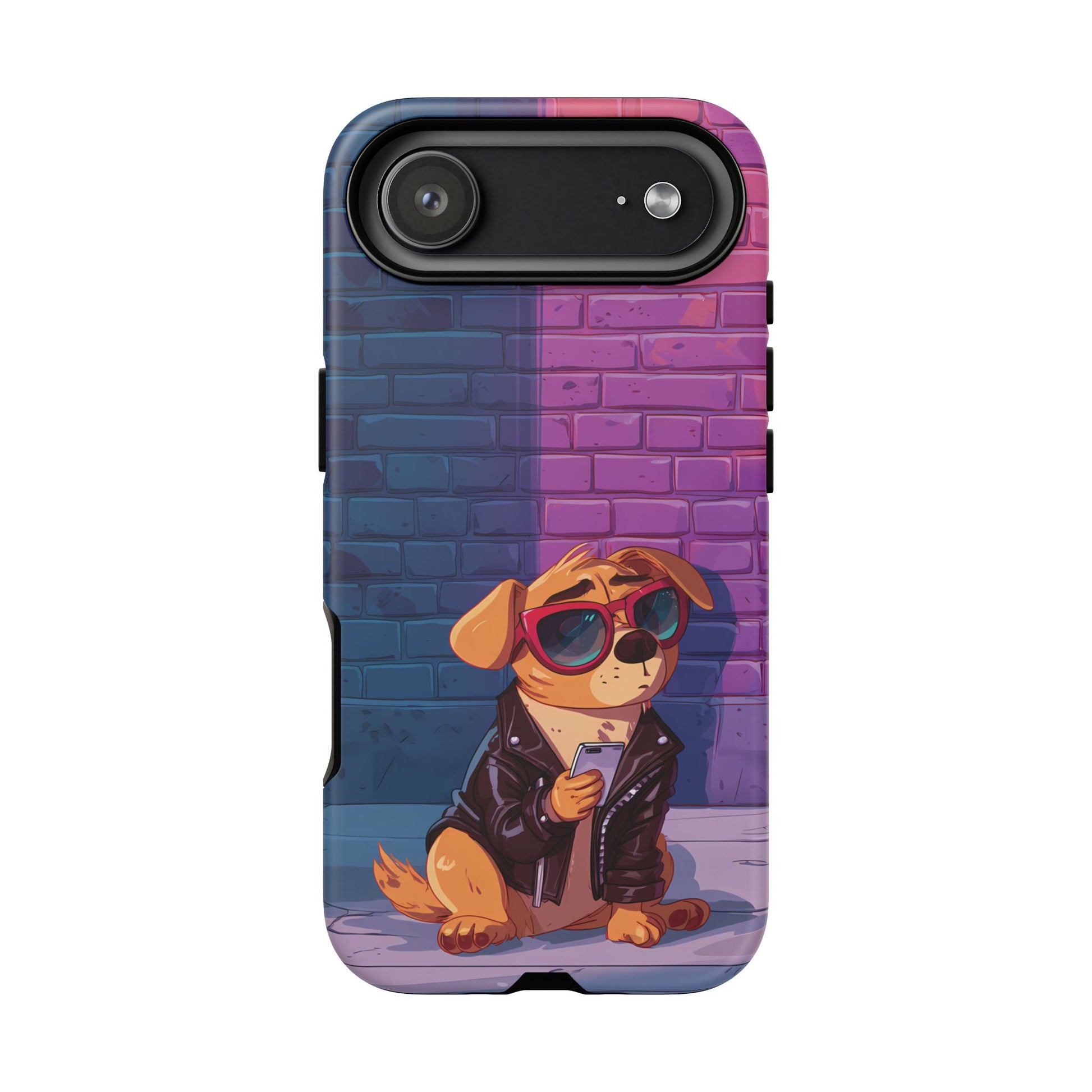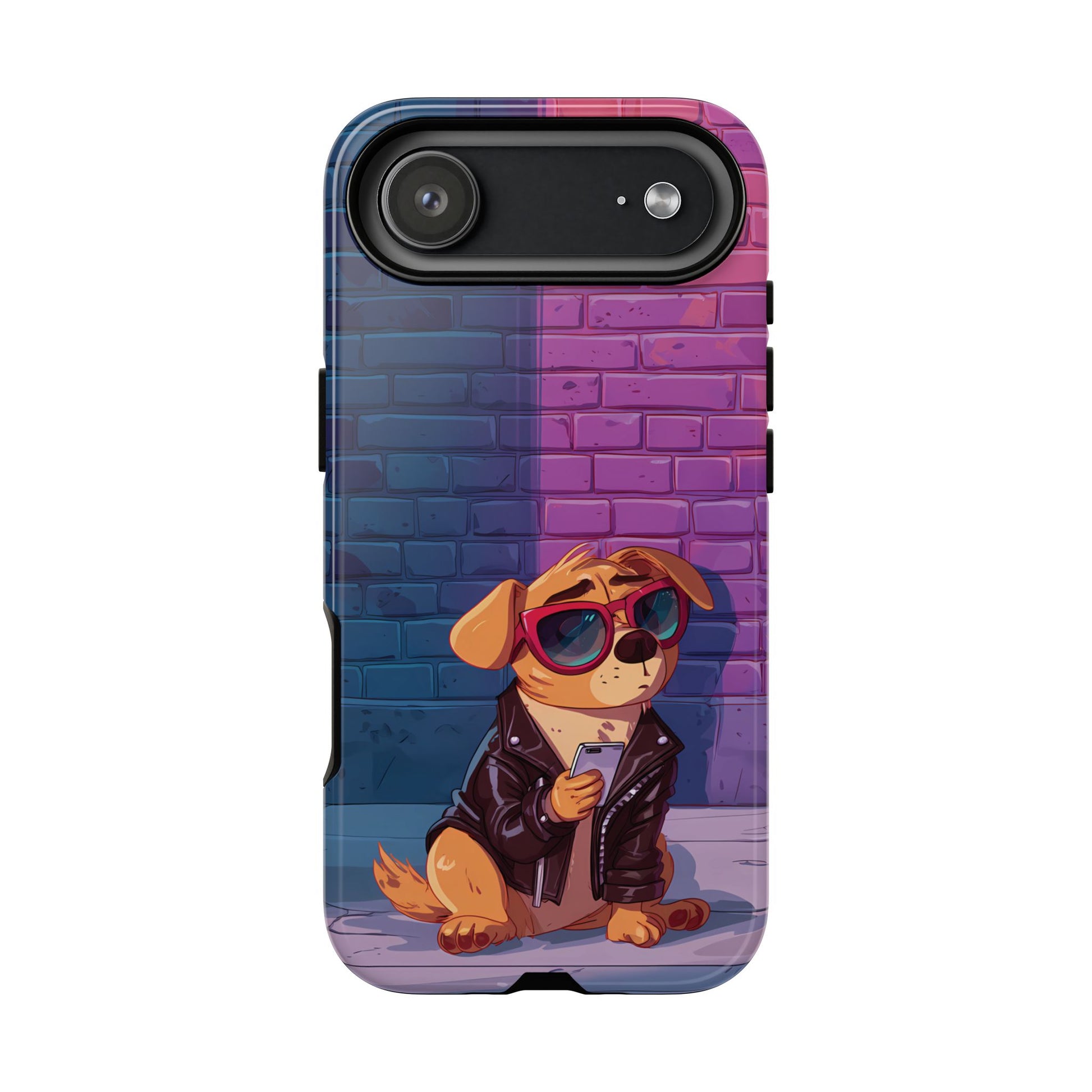 A digital-age doggo scrolling the streets with swagger. Leather, lenses, and that unmistakable “too cool for the kennel” energy make this case irresistibly fun.