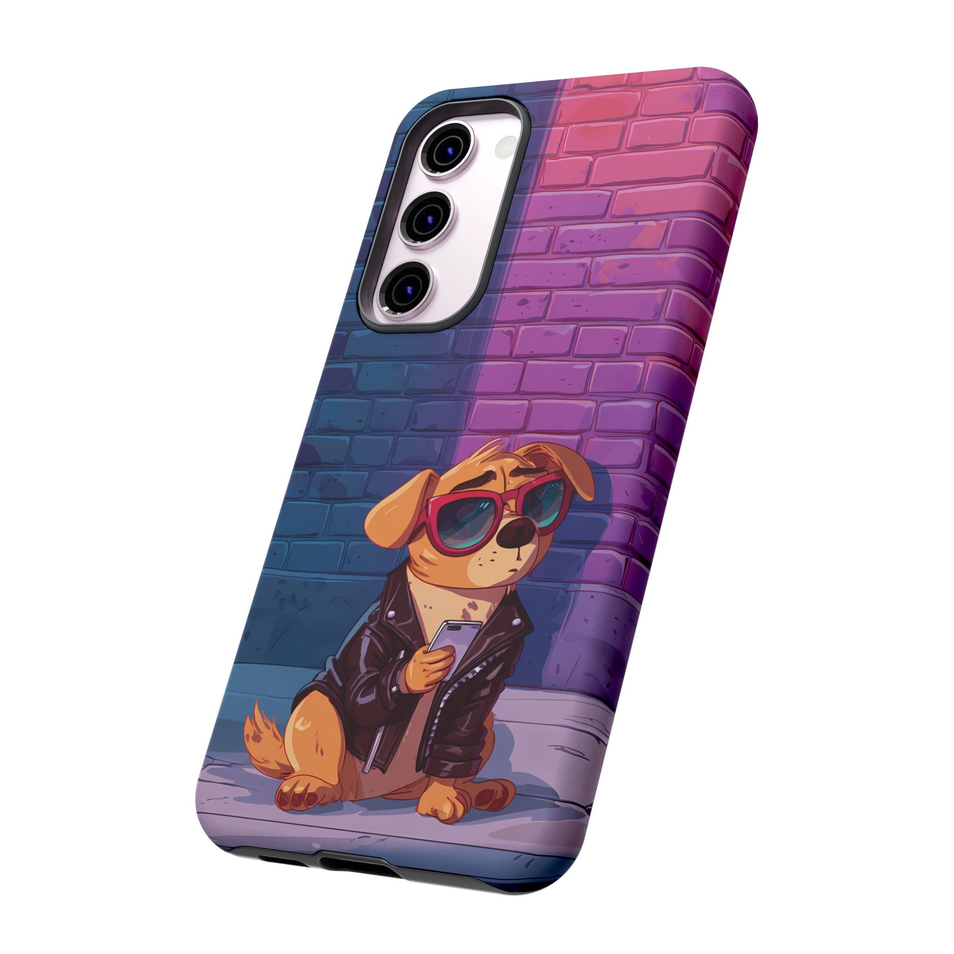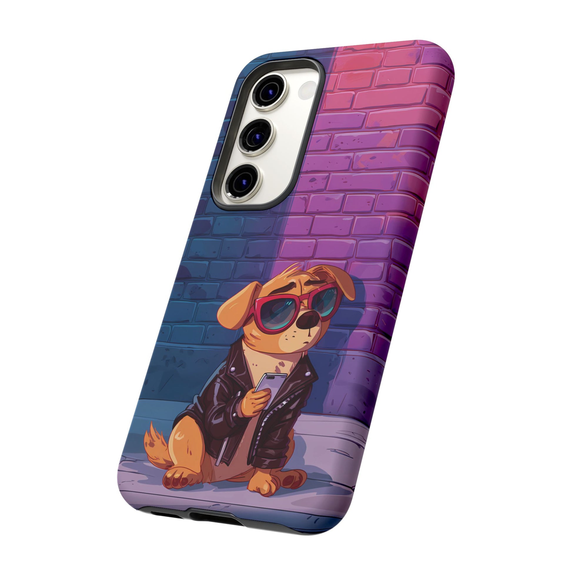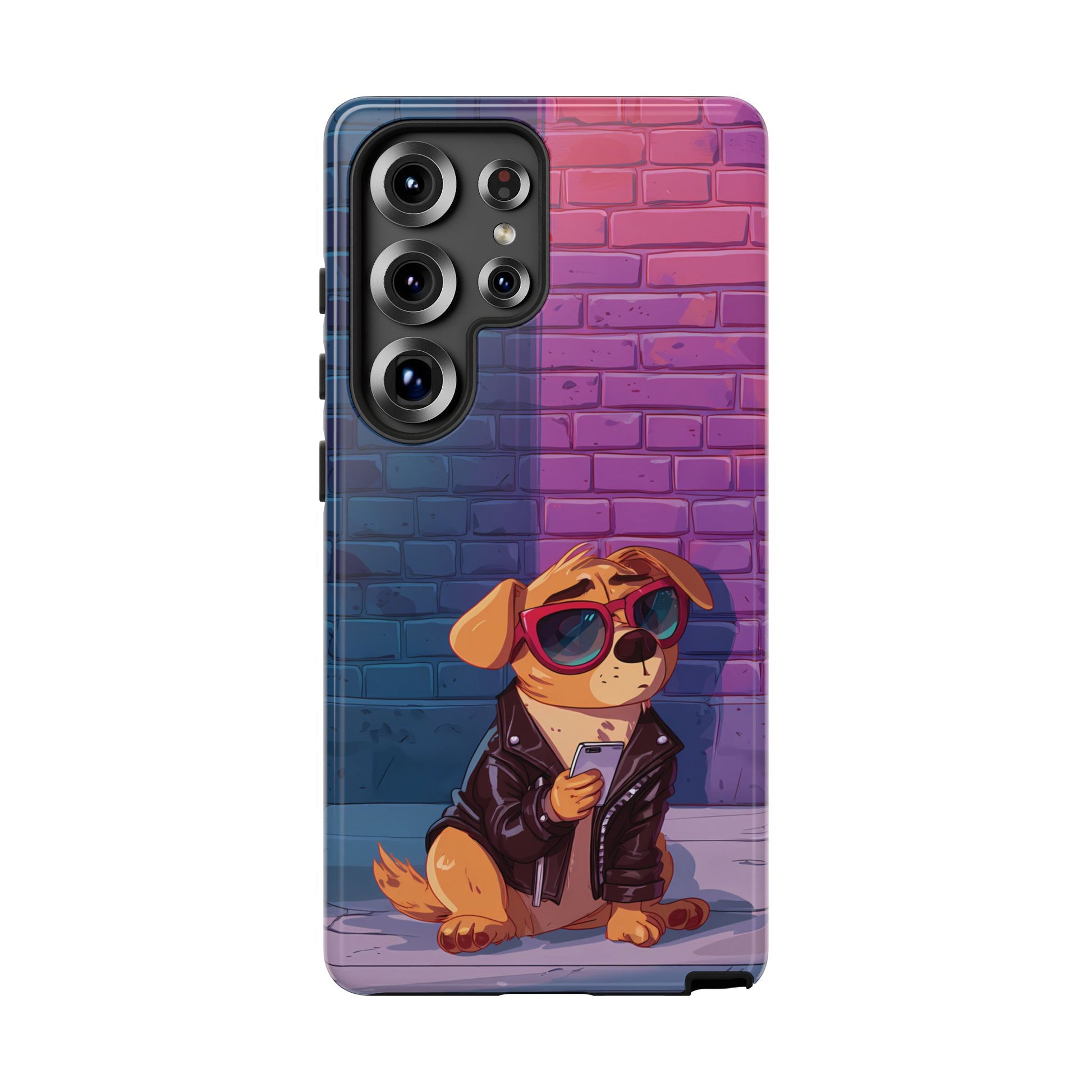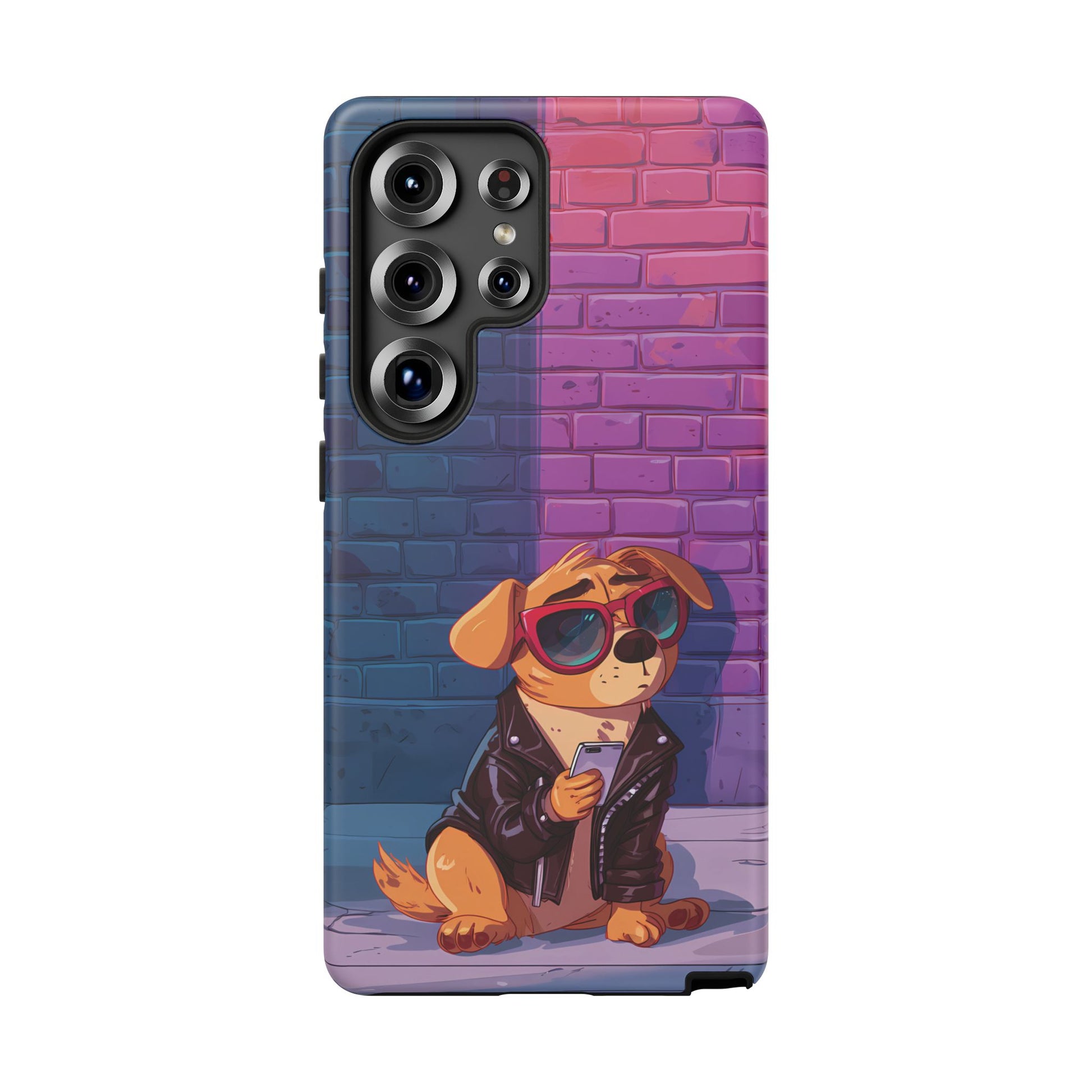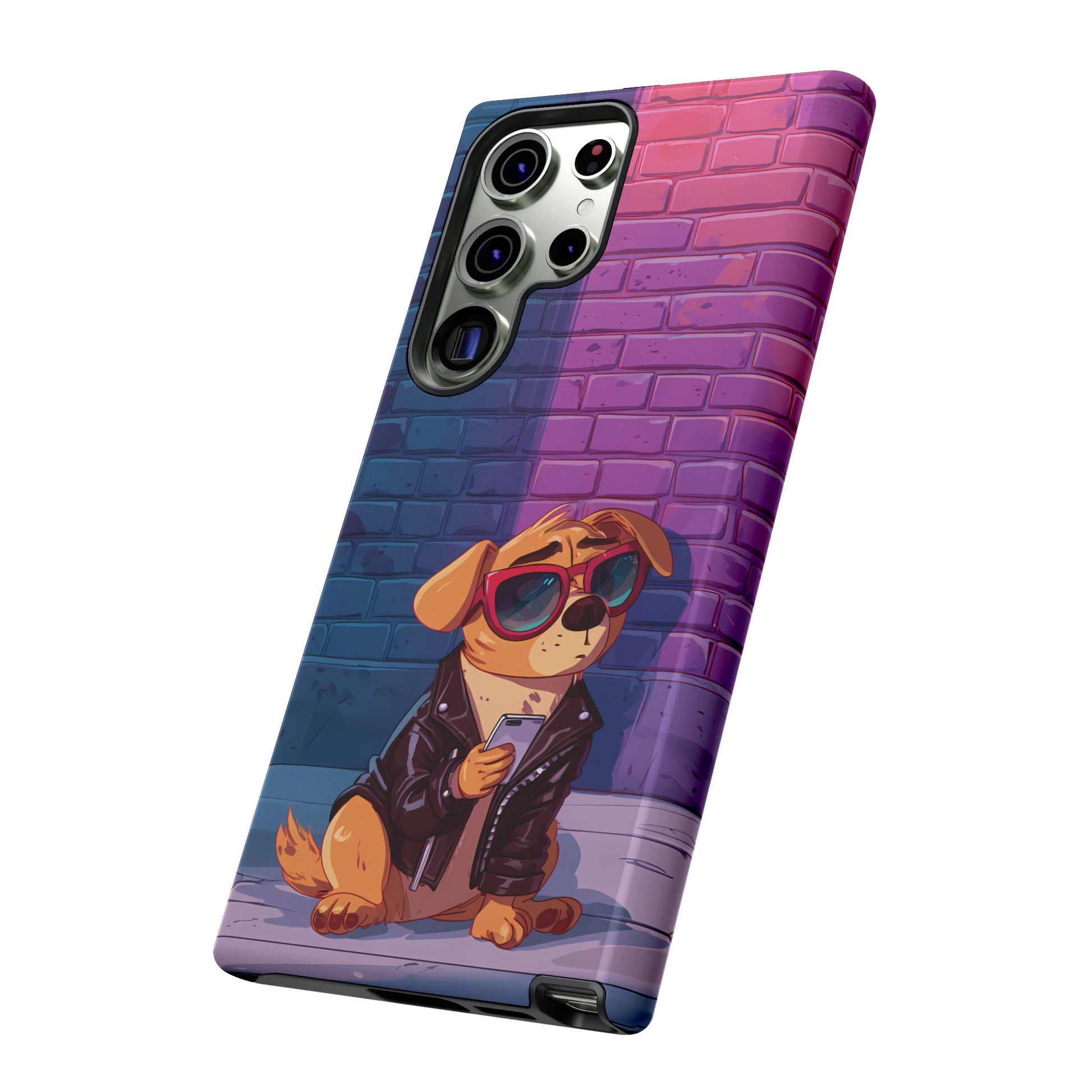 A digital-age doggo scrolling the streets with swagger. Leather, lenses, and that unmistakable “too cool for the kennel” energy make this case irresistibly fun.