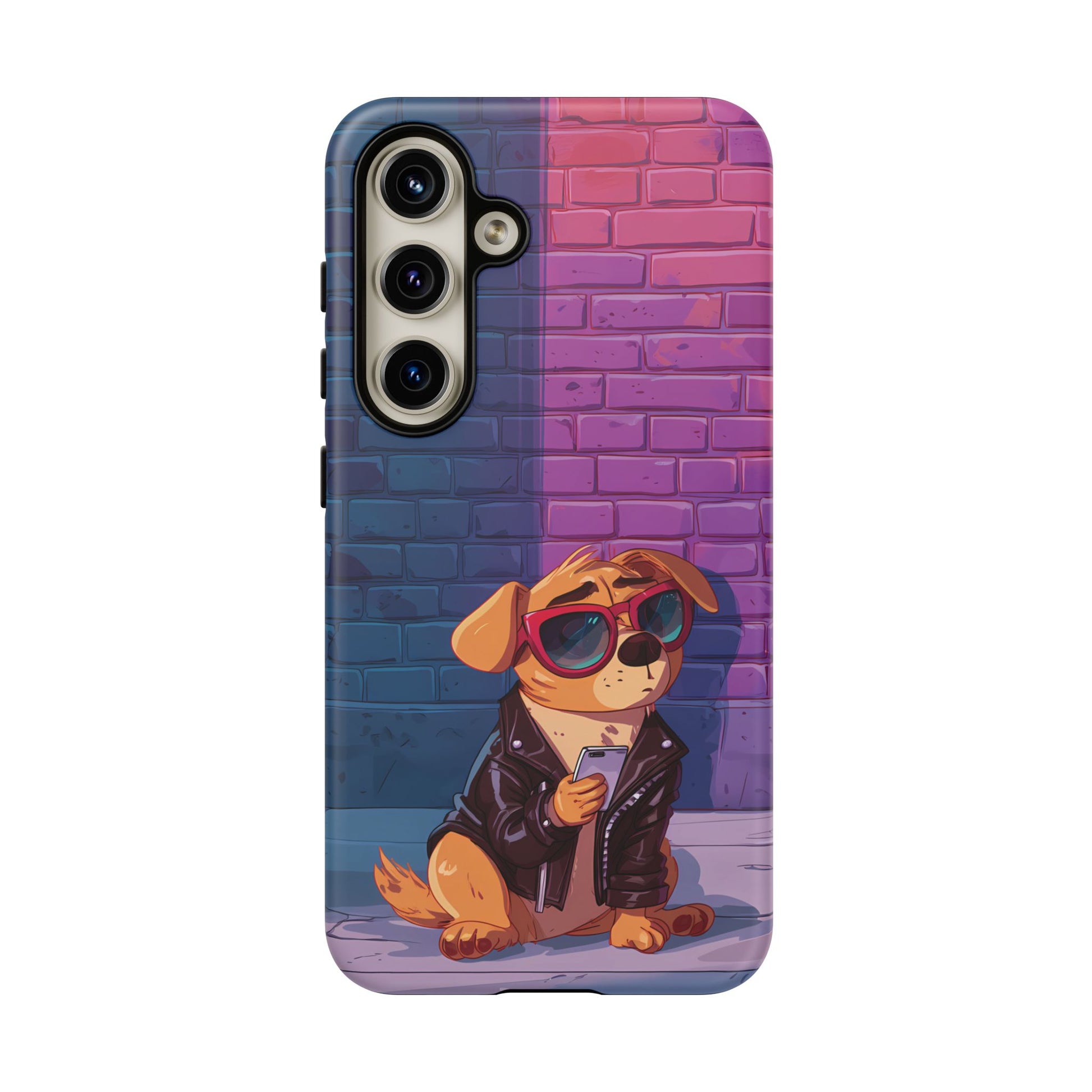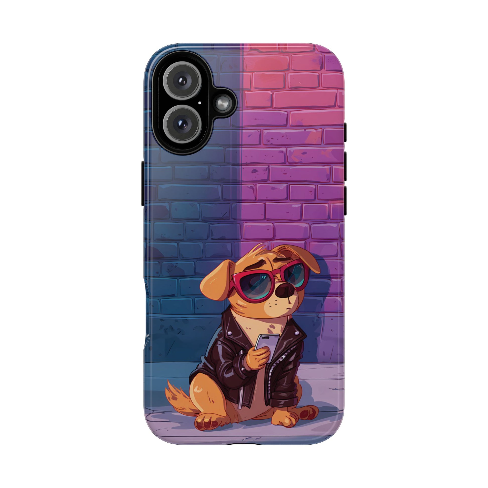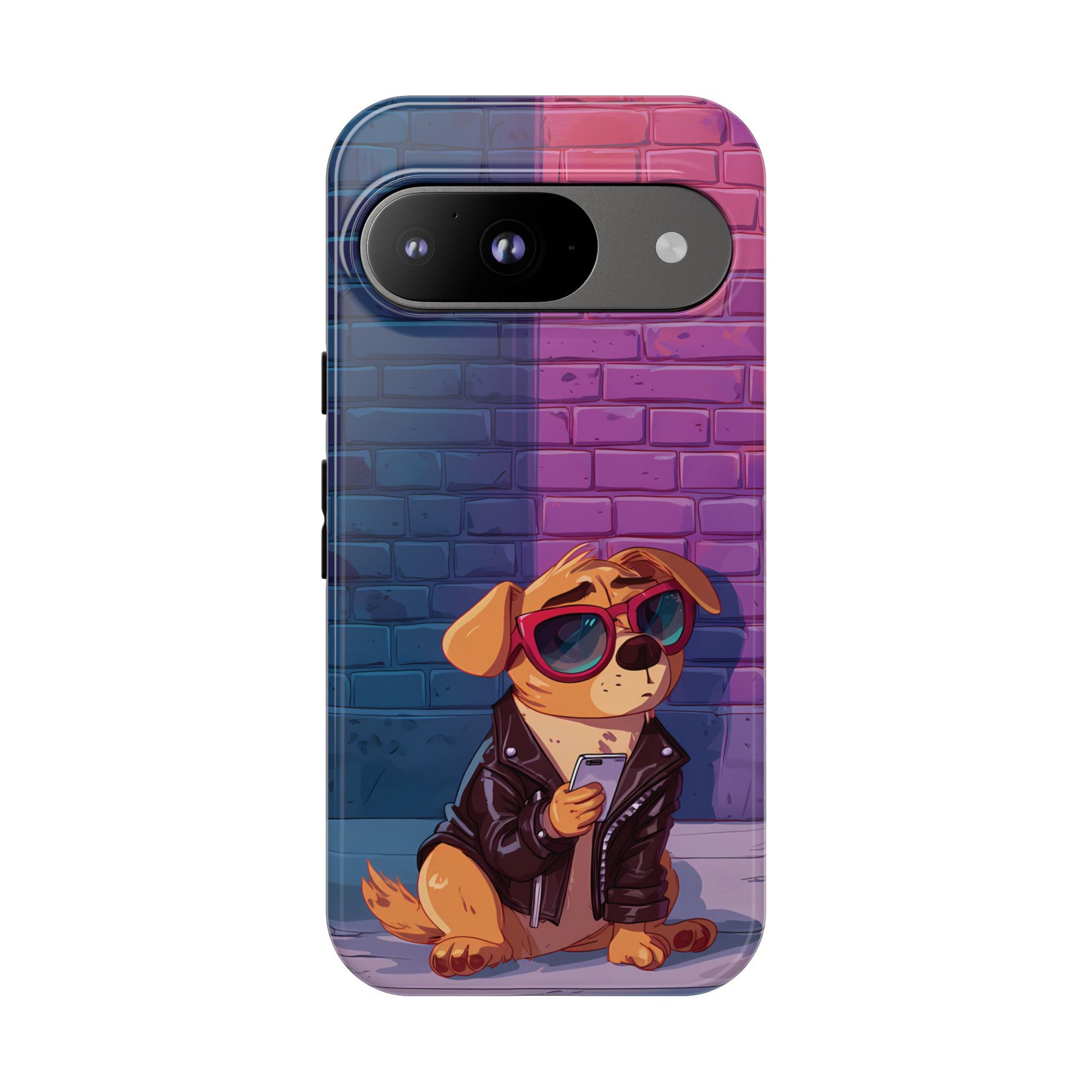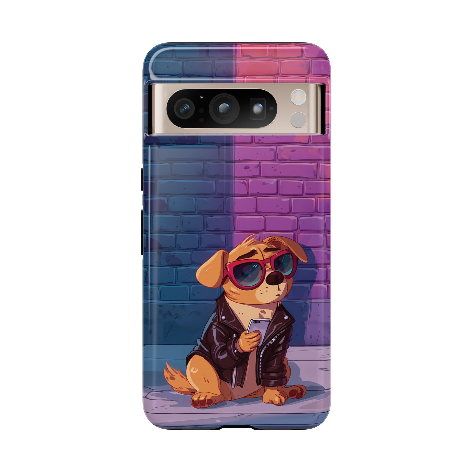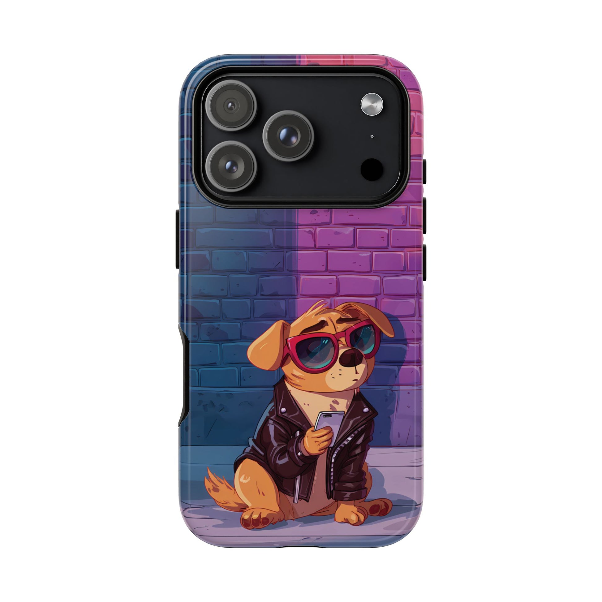 A digital-age doggo scrolling the streets with swagger. Leather, lenses, and that unmistakable “too cool for the kennel” energy make this case irresistibly fun.