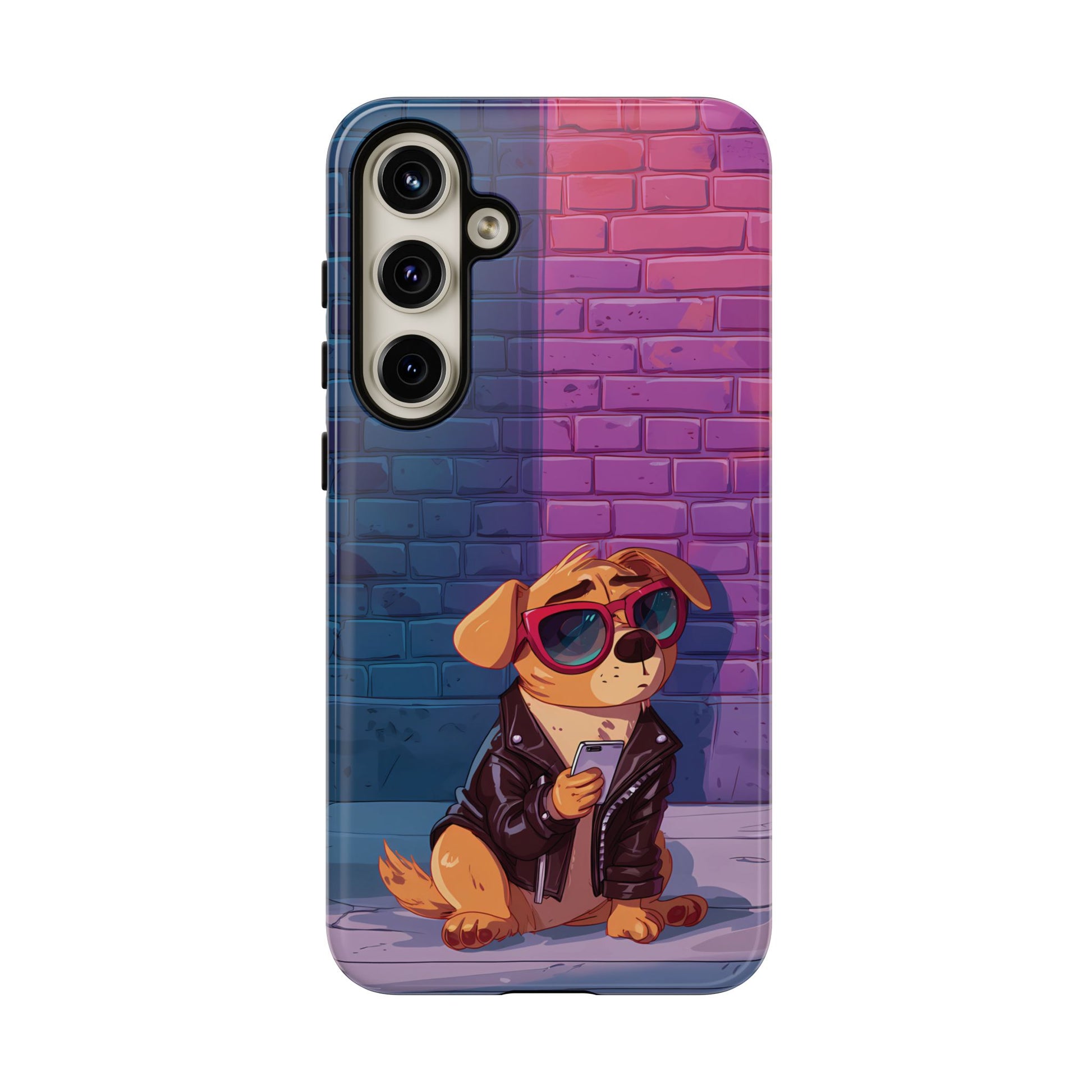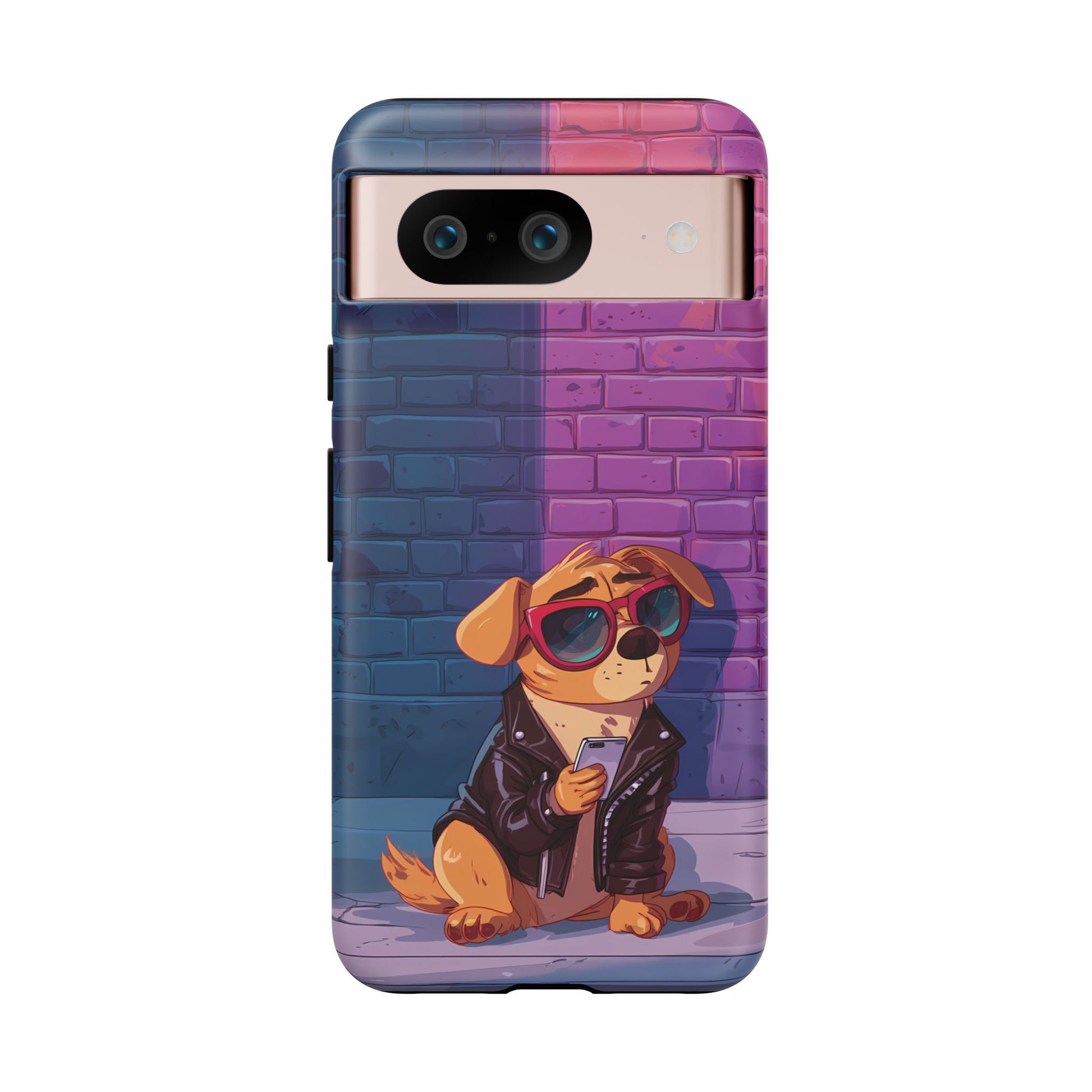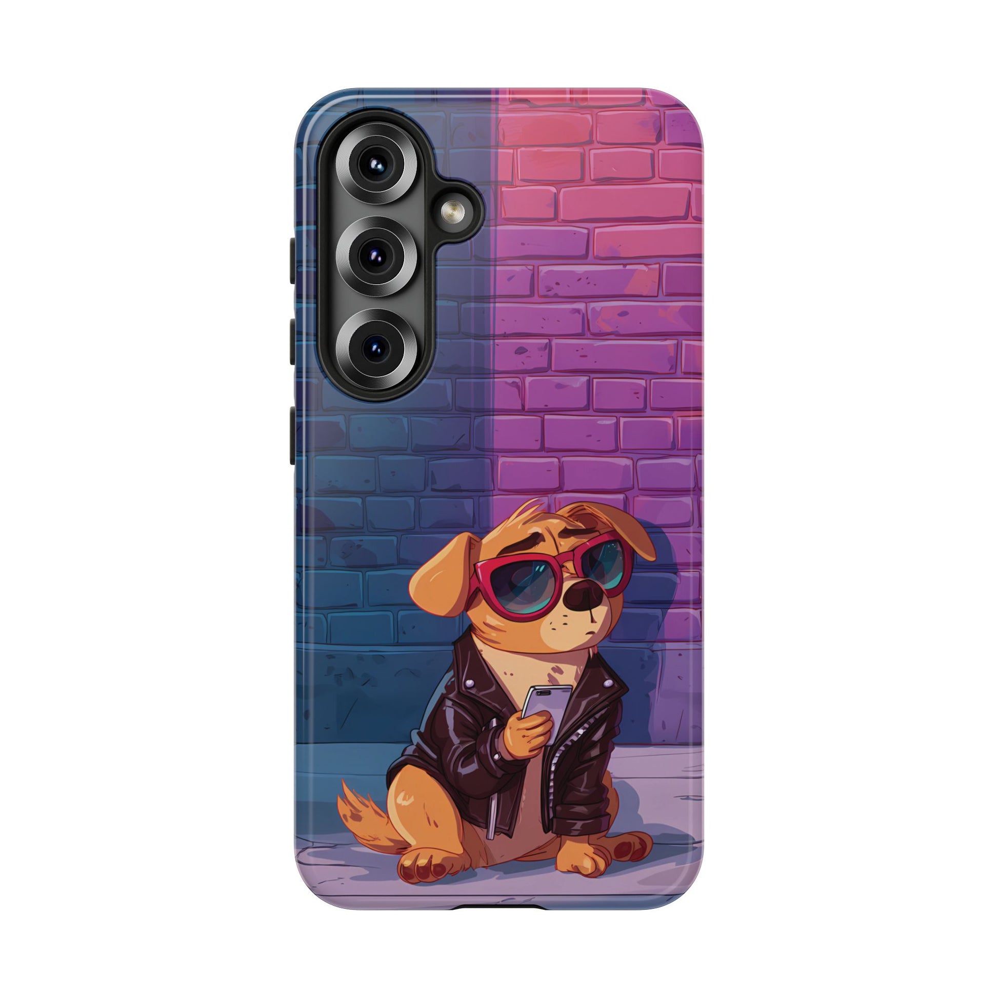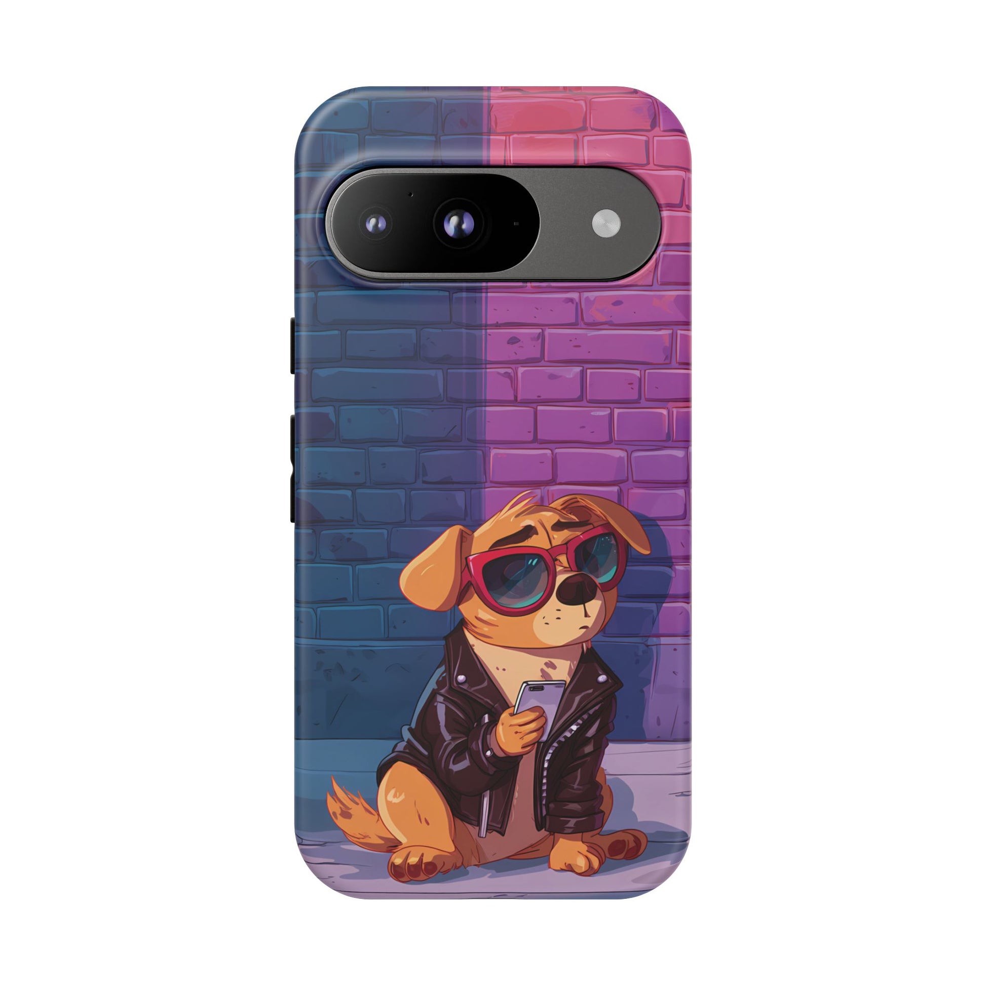 A digital-age doggo scrolling the streets with swagger. Leather, lenses, and that unmistakable “too cool for the kennel” energy make this case irresistibly fun.