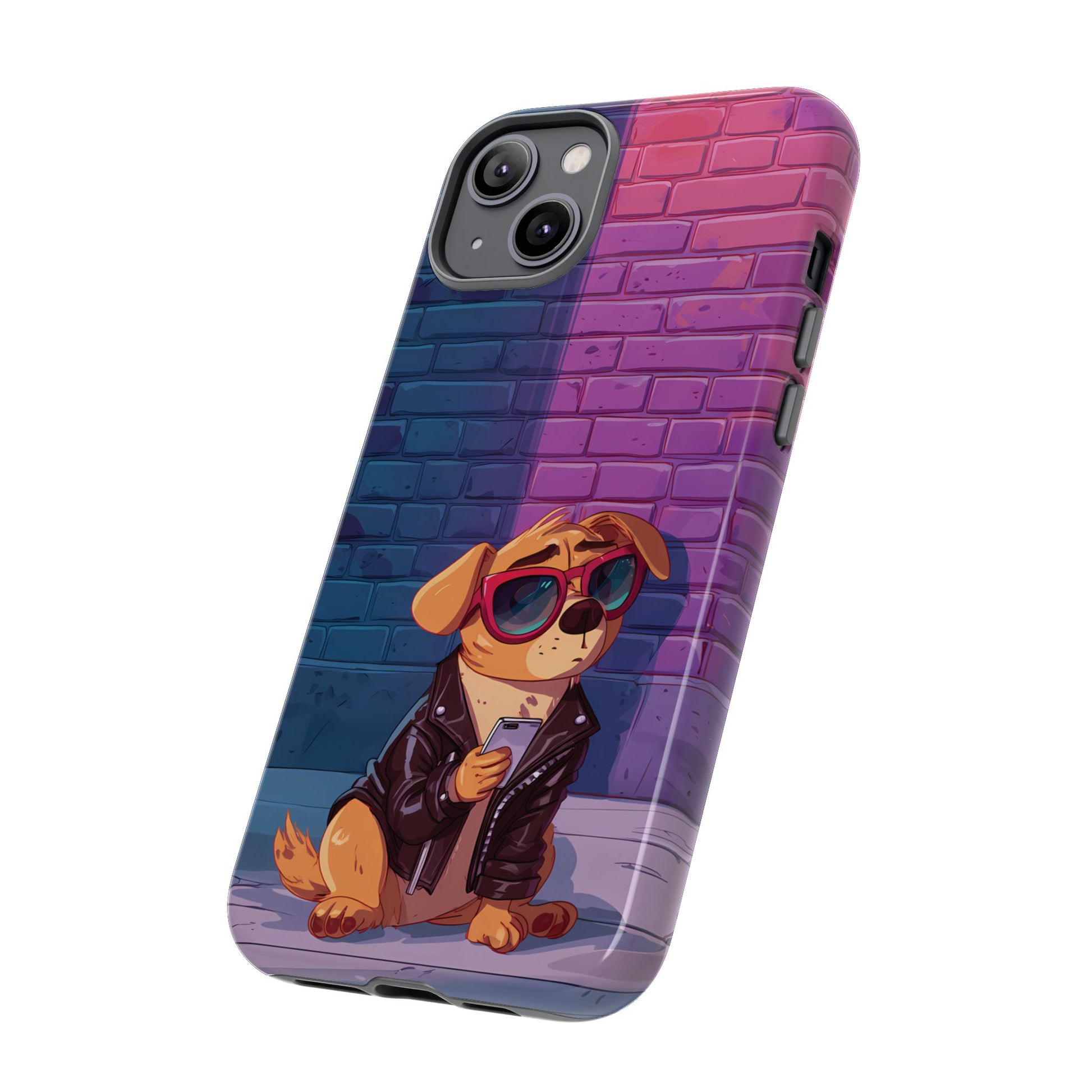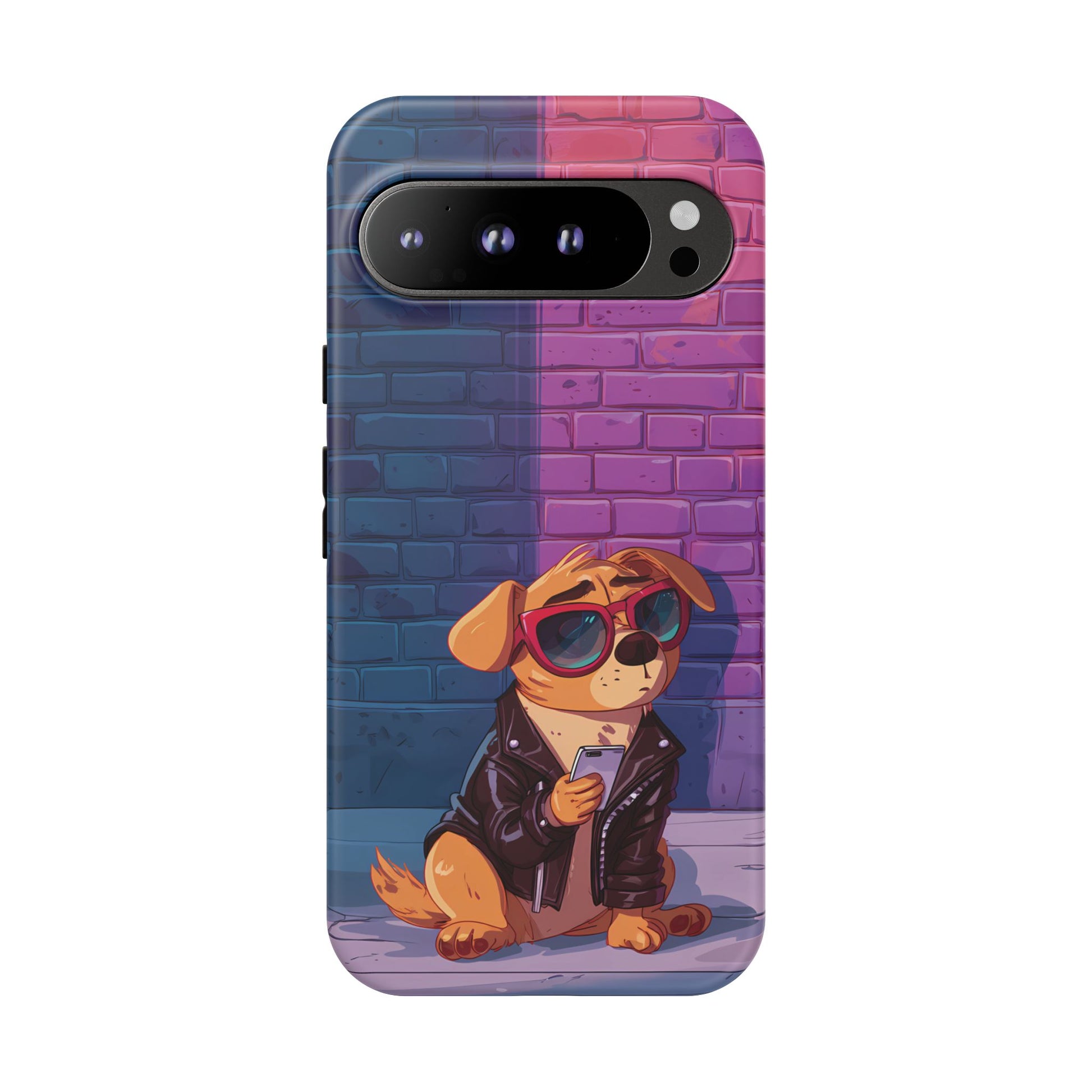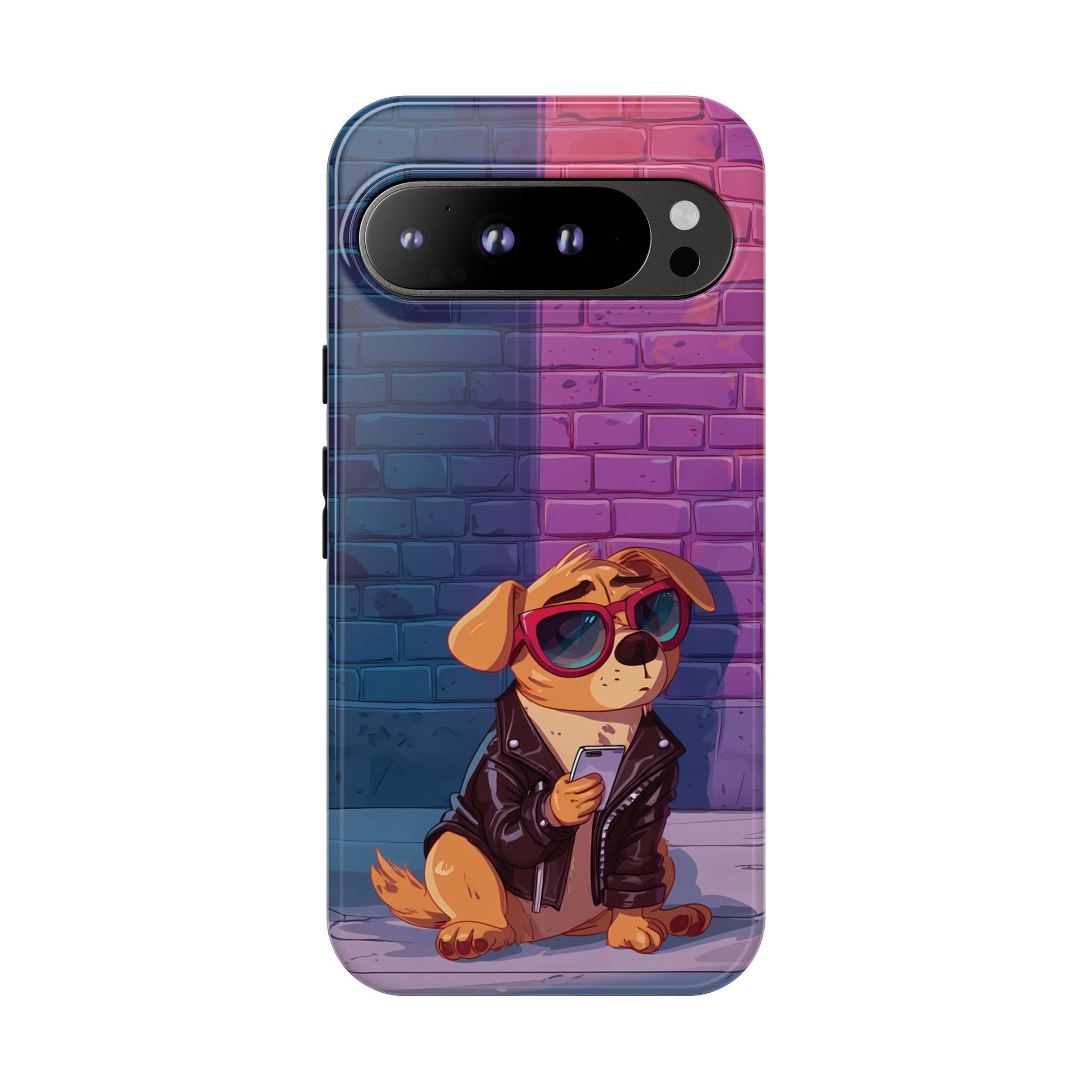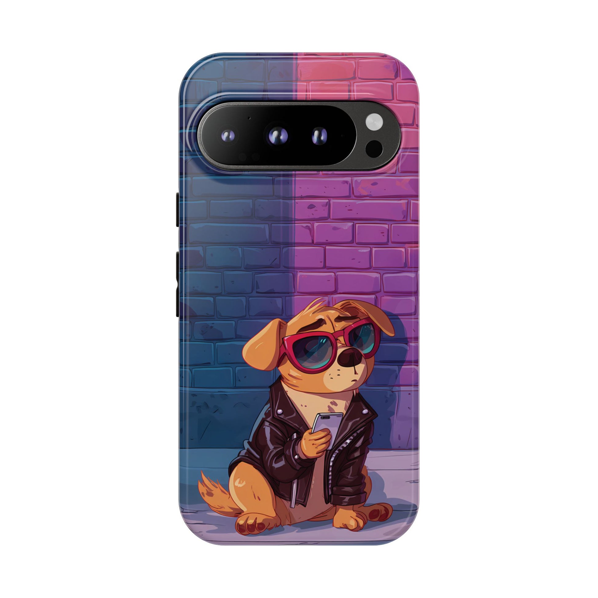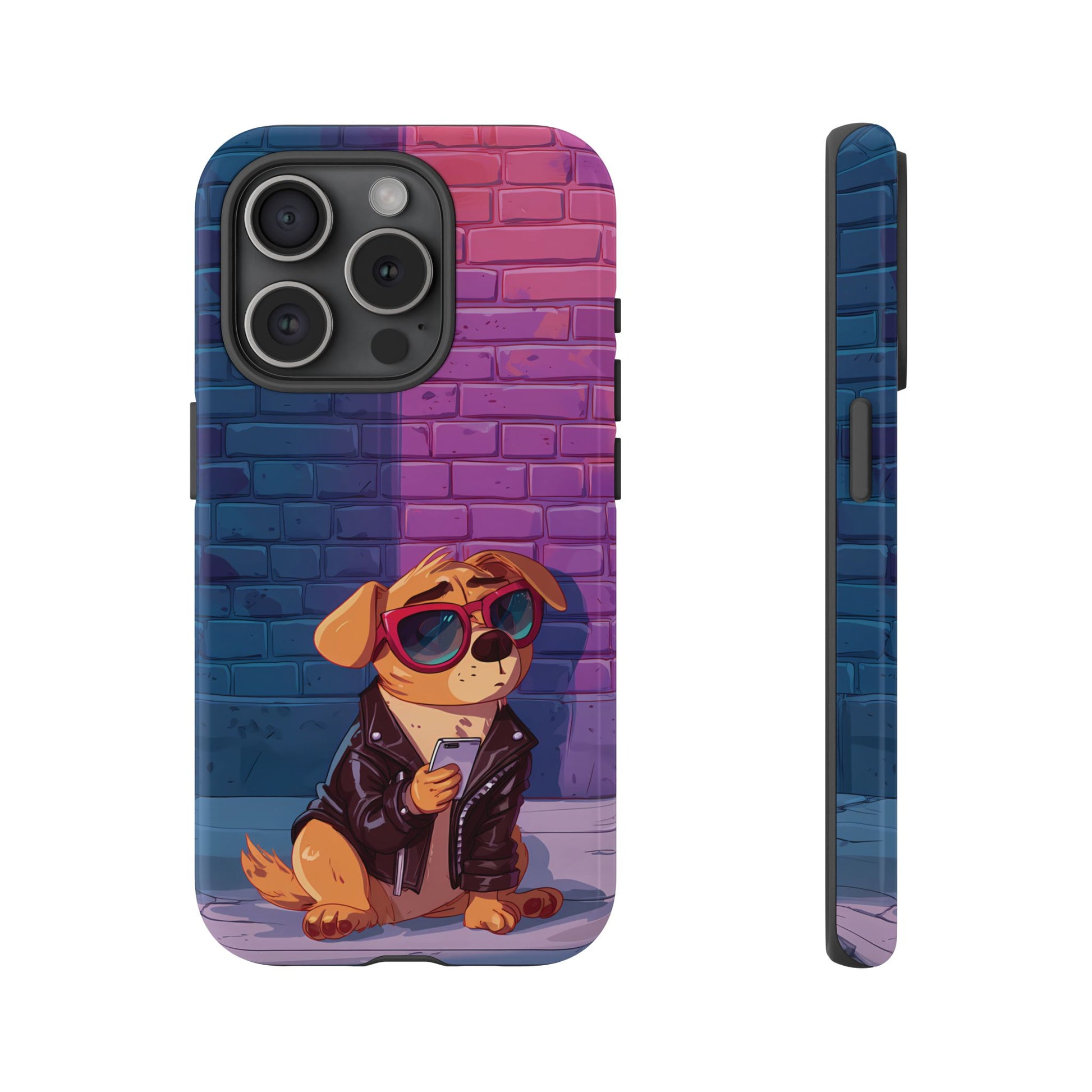 A digital-age doggo scrolling the streets with swagger. Leather, lenses, and that unmistakable “too cool for the kennel” energy make this case irresistibly fun.
