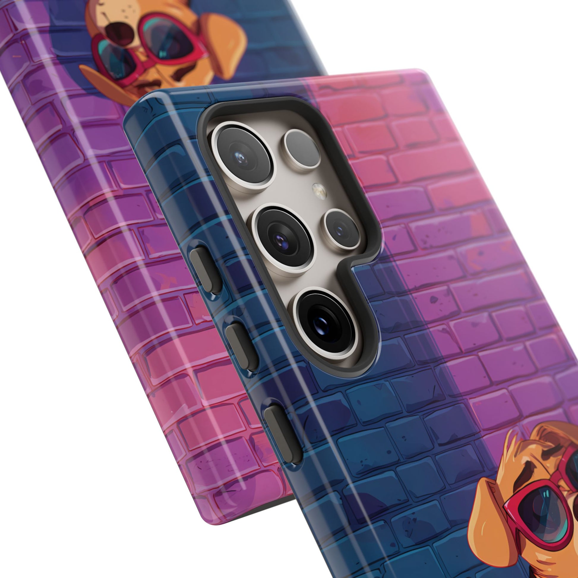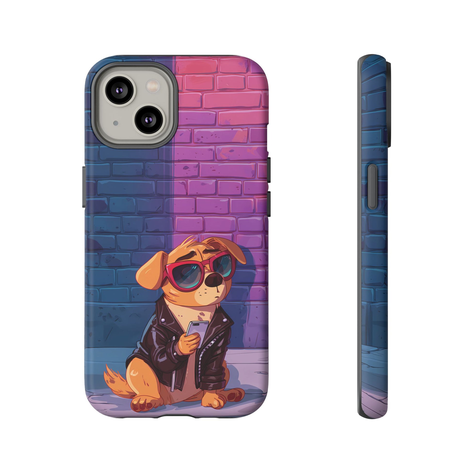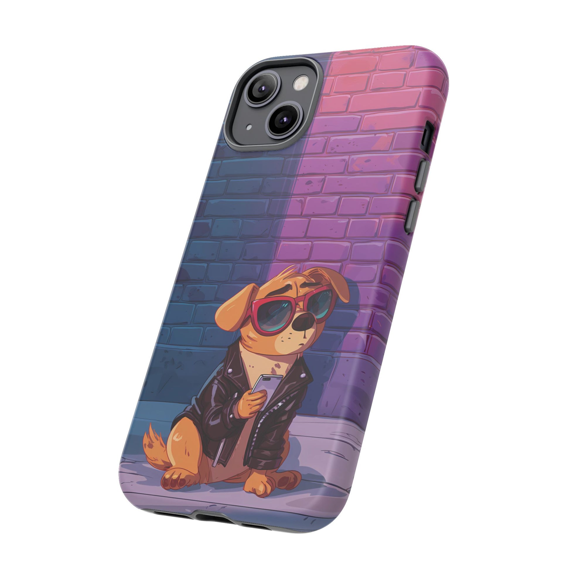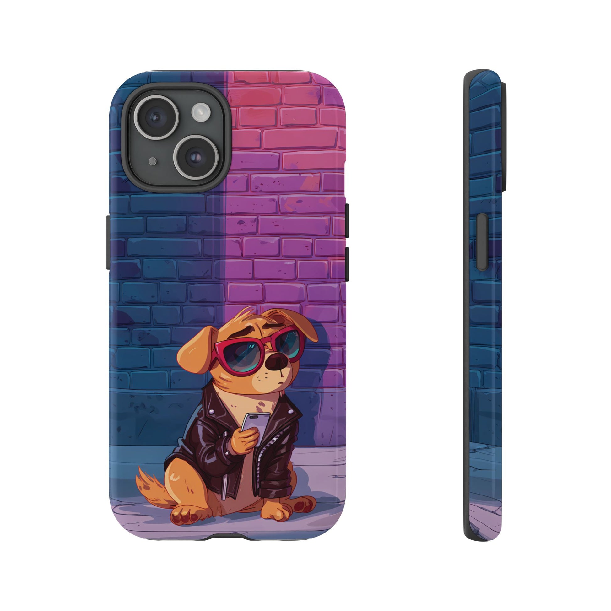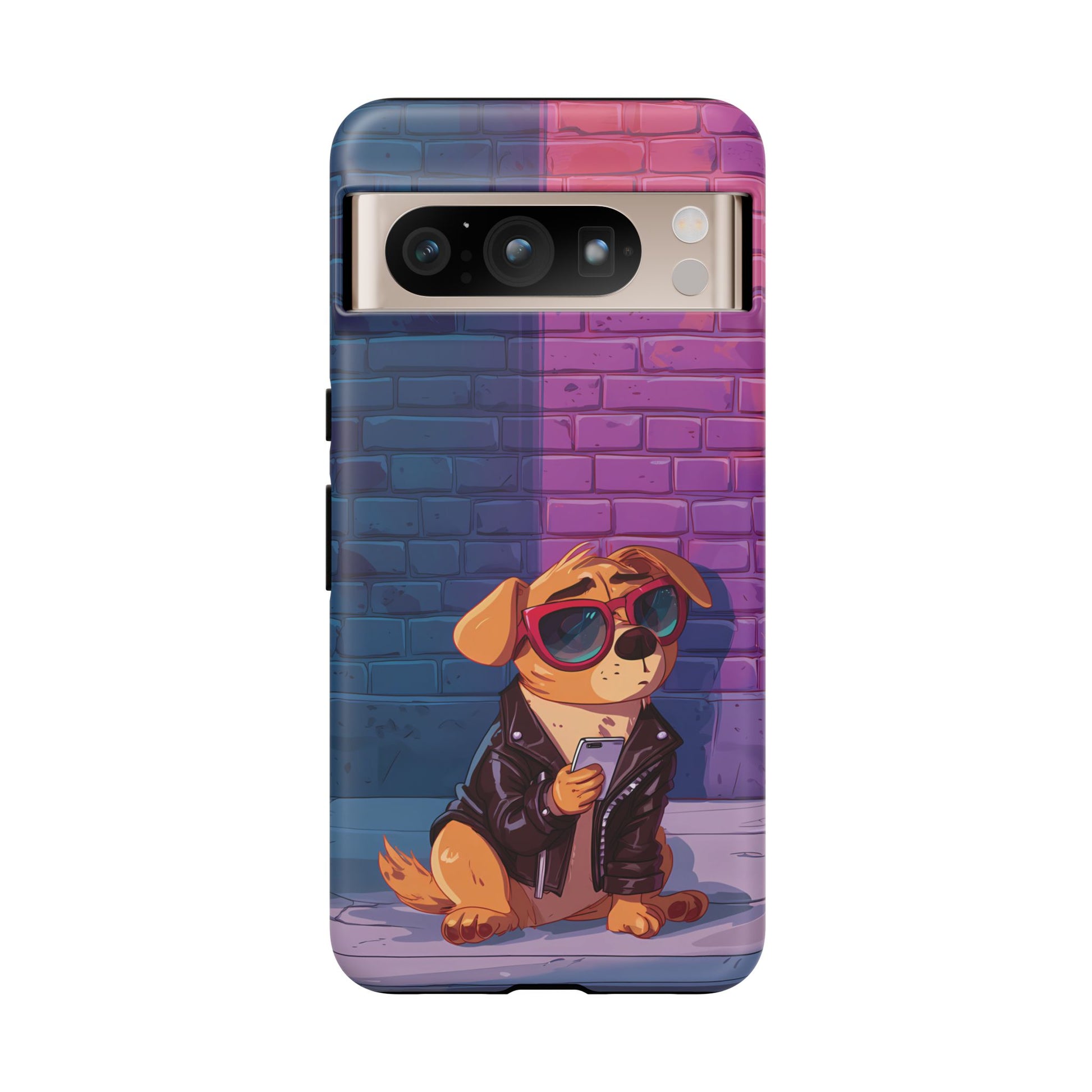 A digital-age doggo scrolling the streets with swagger. Leather, lenses, and that unmistakable “too cool for the kennel” energy make this case irresistibly fun.