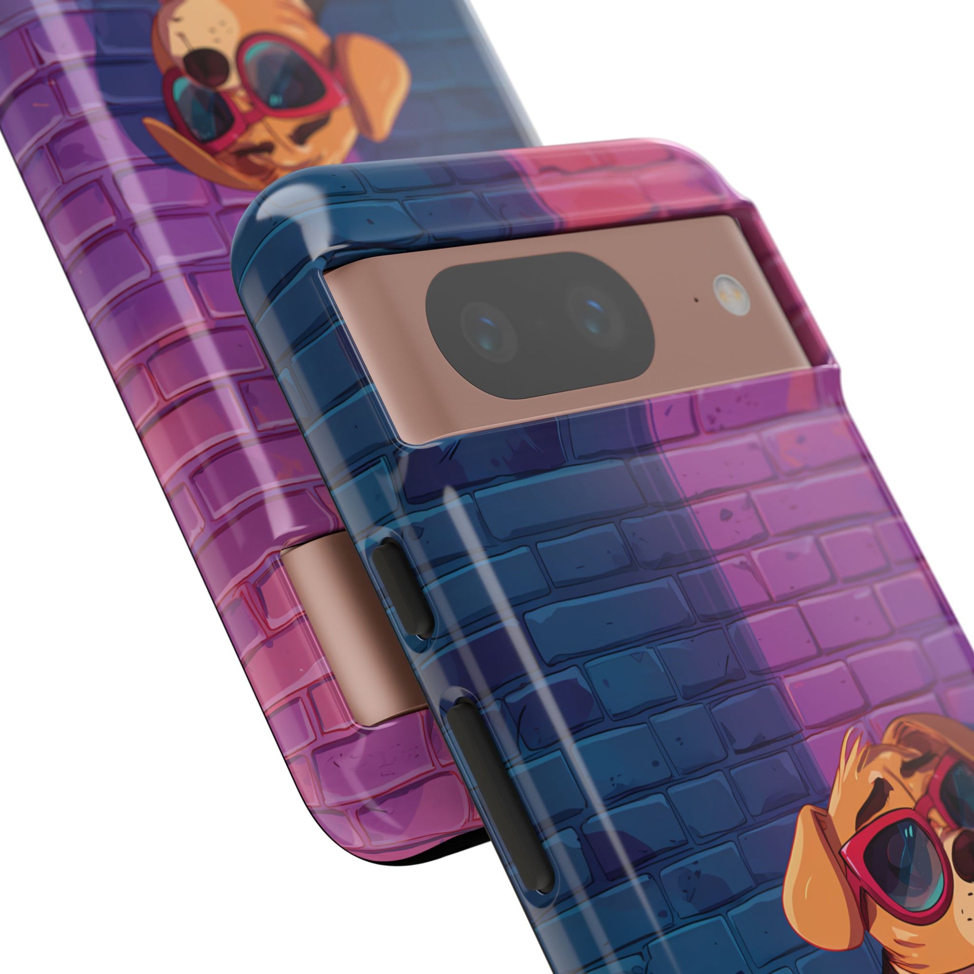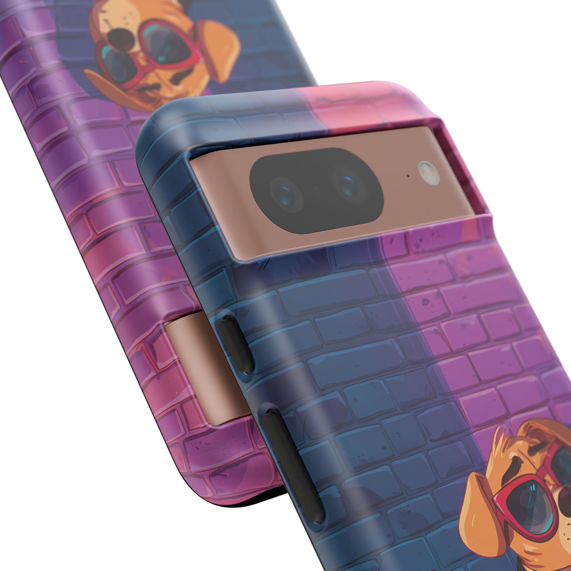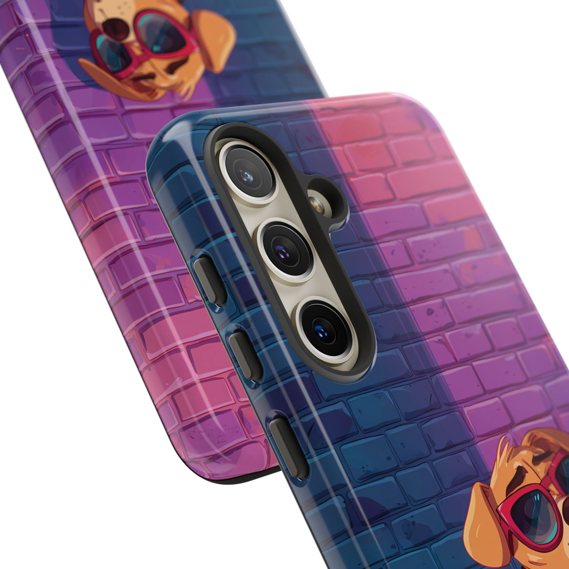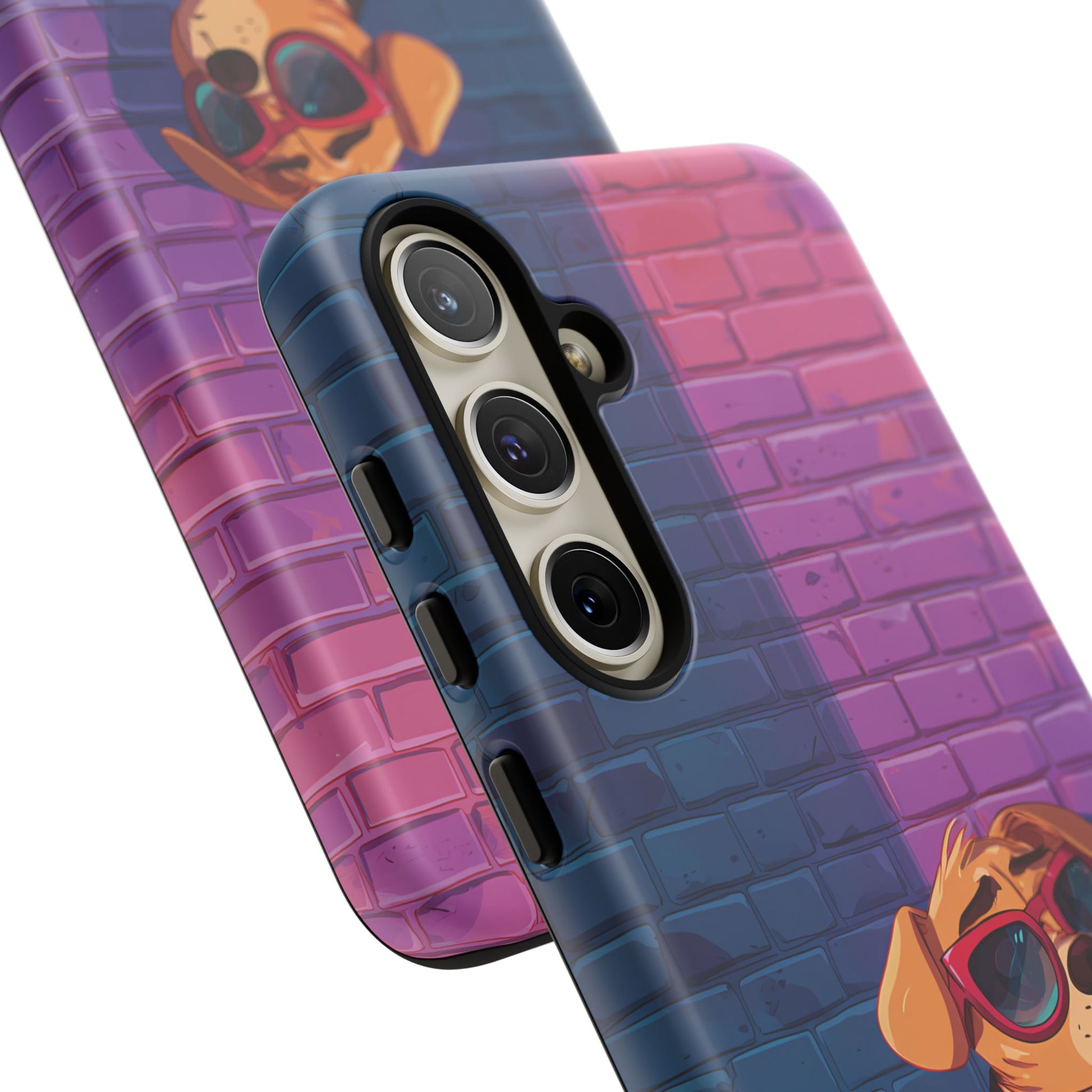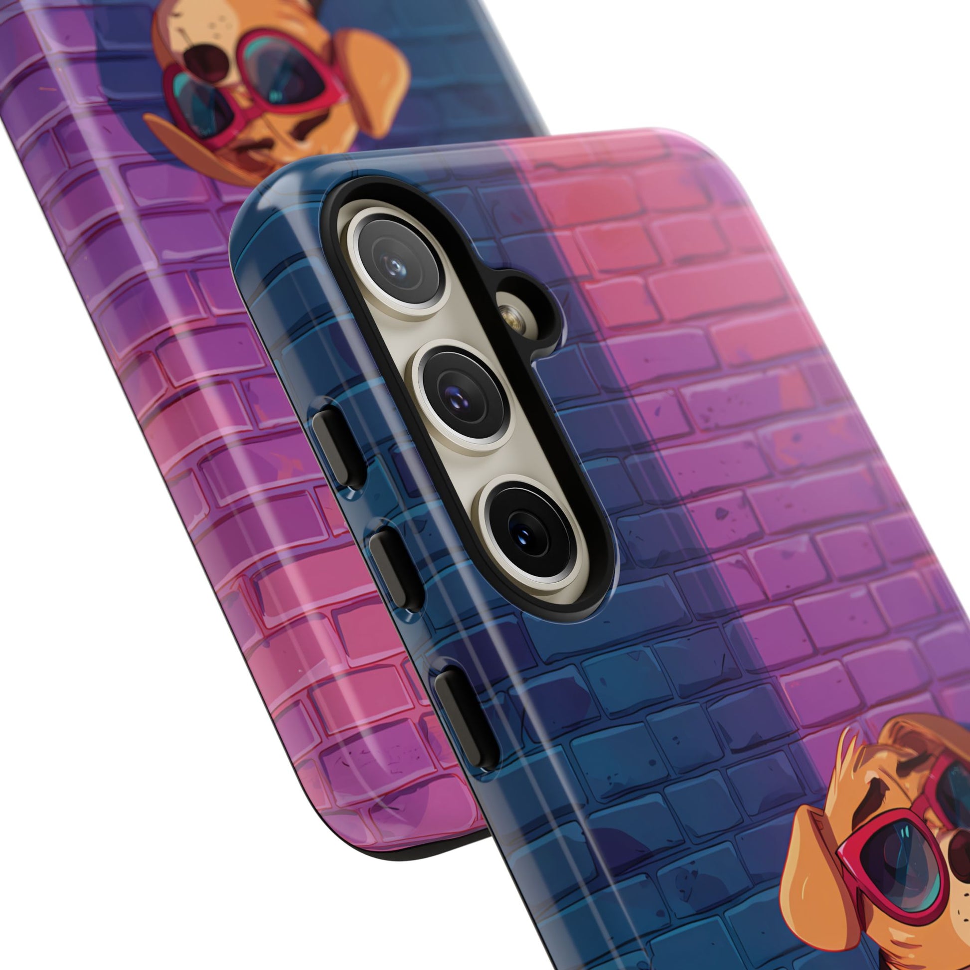 A digital-age doggo scrolling the streets with swagger. Leather, lenses, and that unmistakable “too cool for the kennel” energy make this case irresistibly fun.