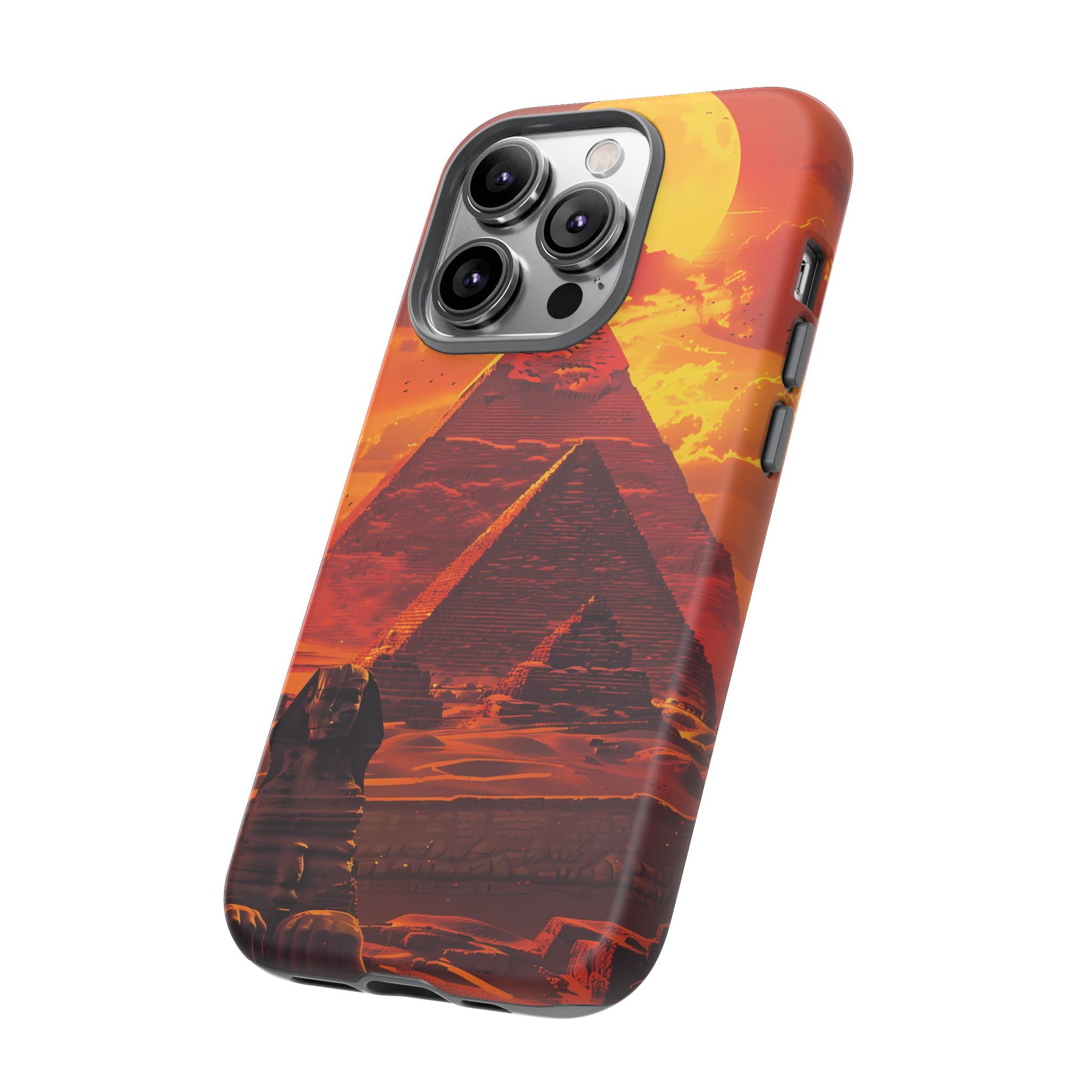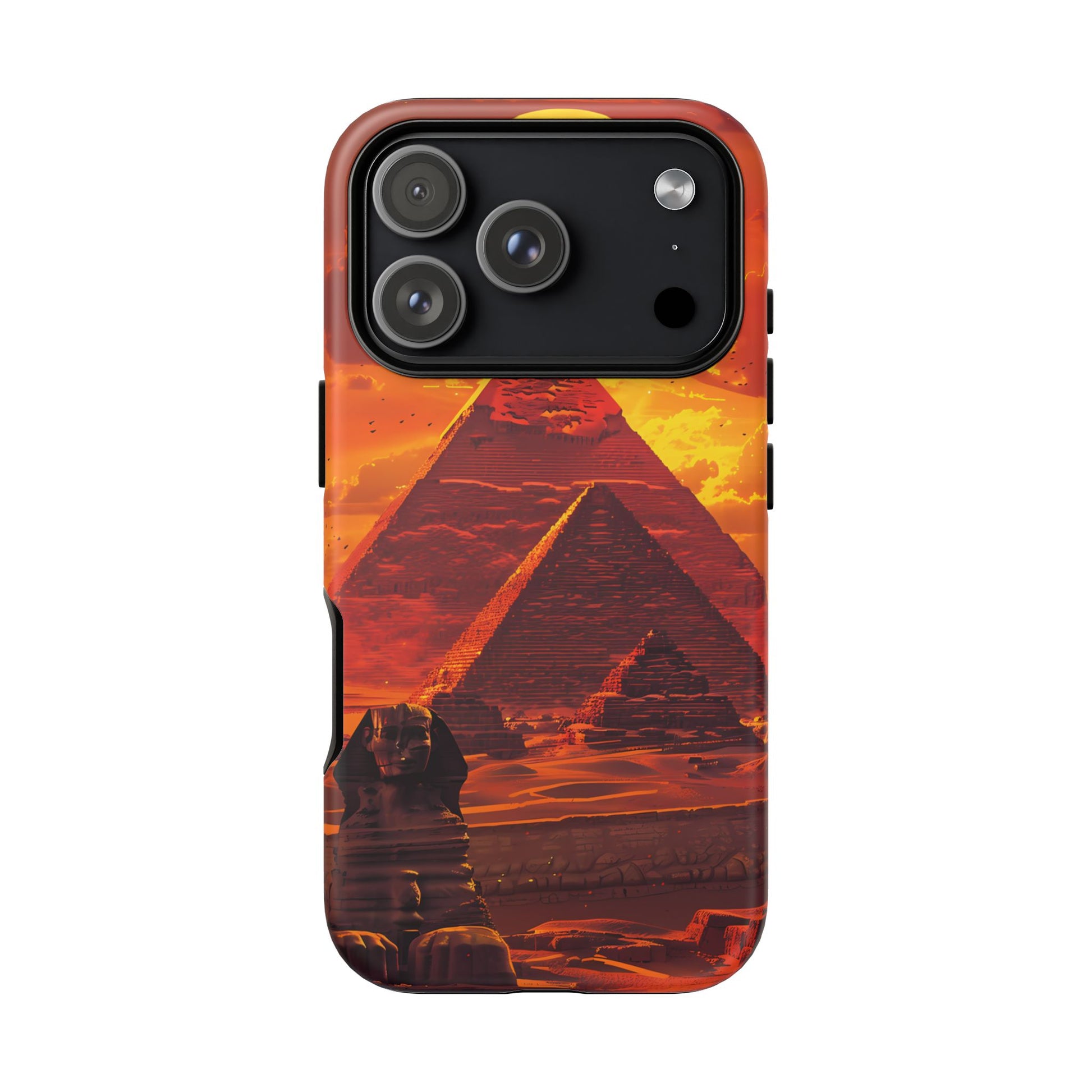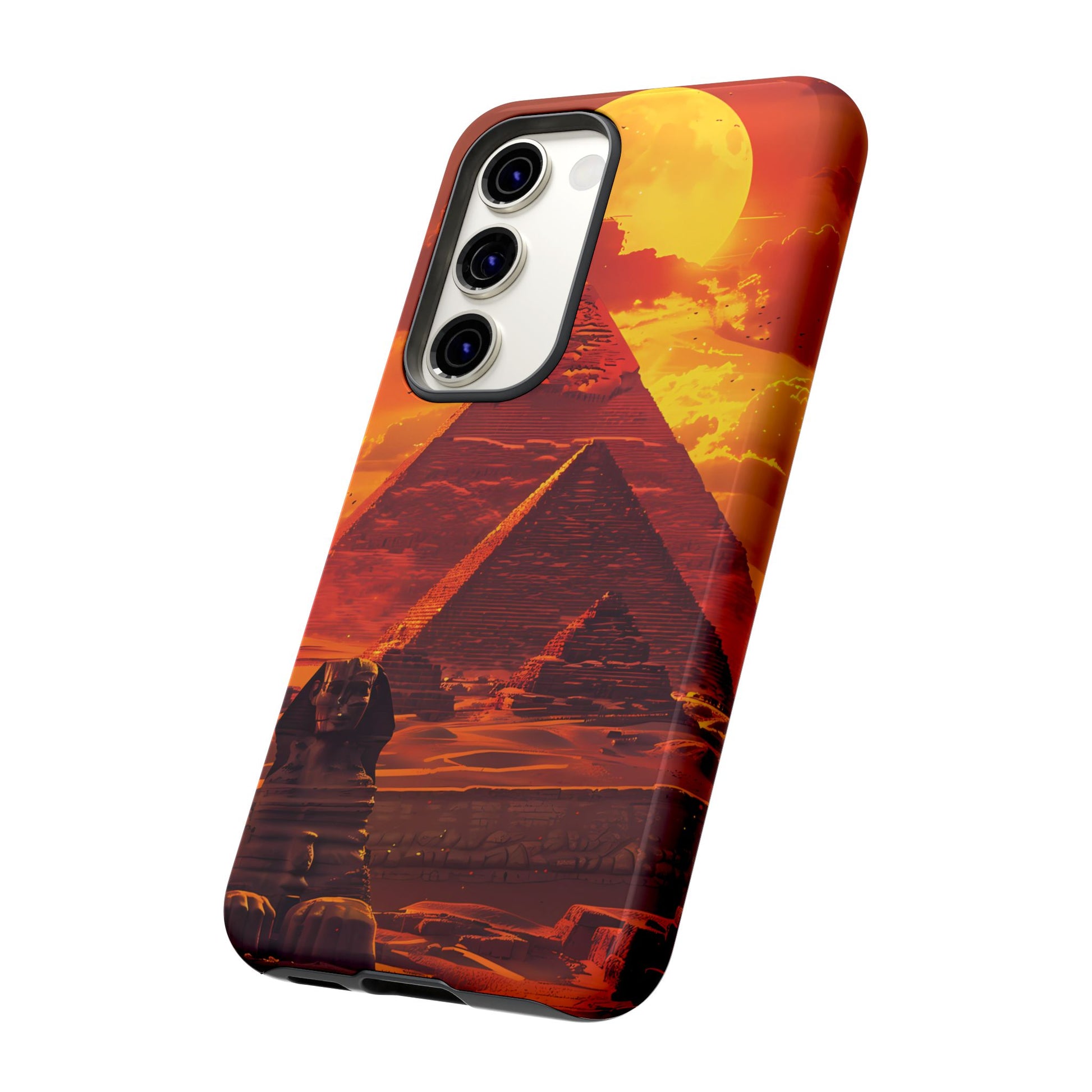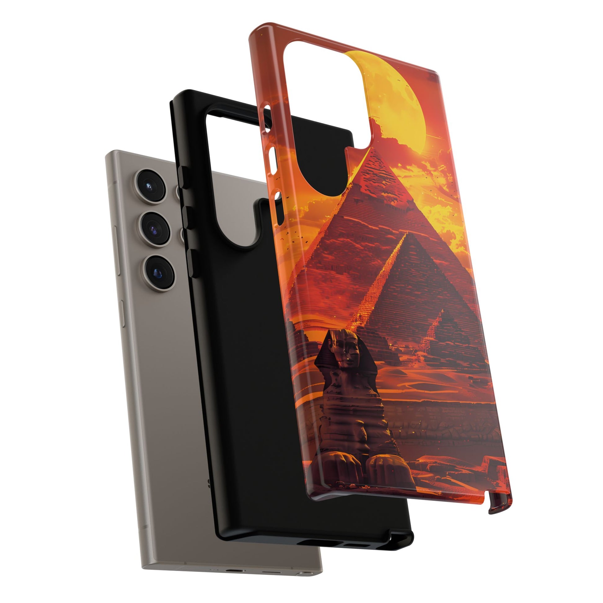 Experience the breathtaking beauty of Egypt’s most famous landmarks with the Pharaoh's Twilight cell phone cover. This illustration showcases the Pyramids of Giza bathed in the warm glow of sunset, with the Sphinx adding to the timeless appeal of this ancient scene.