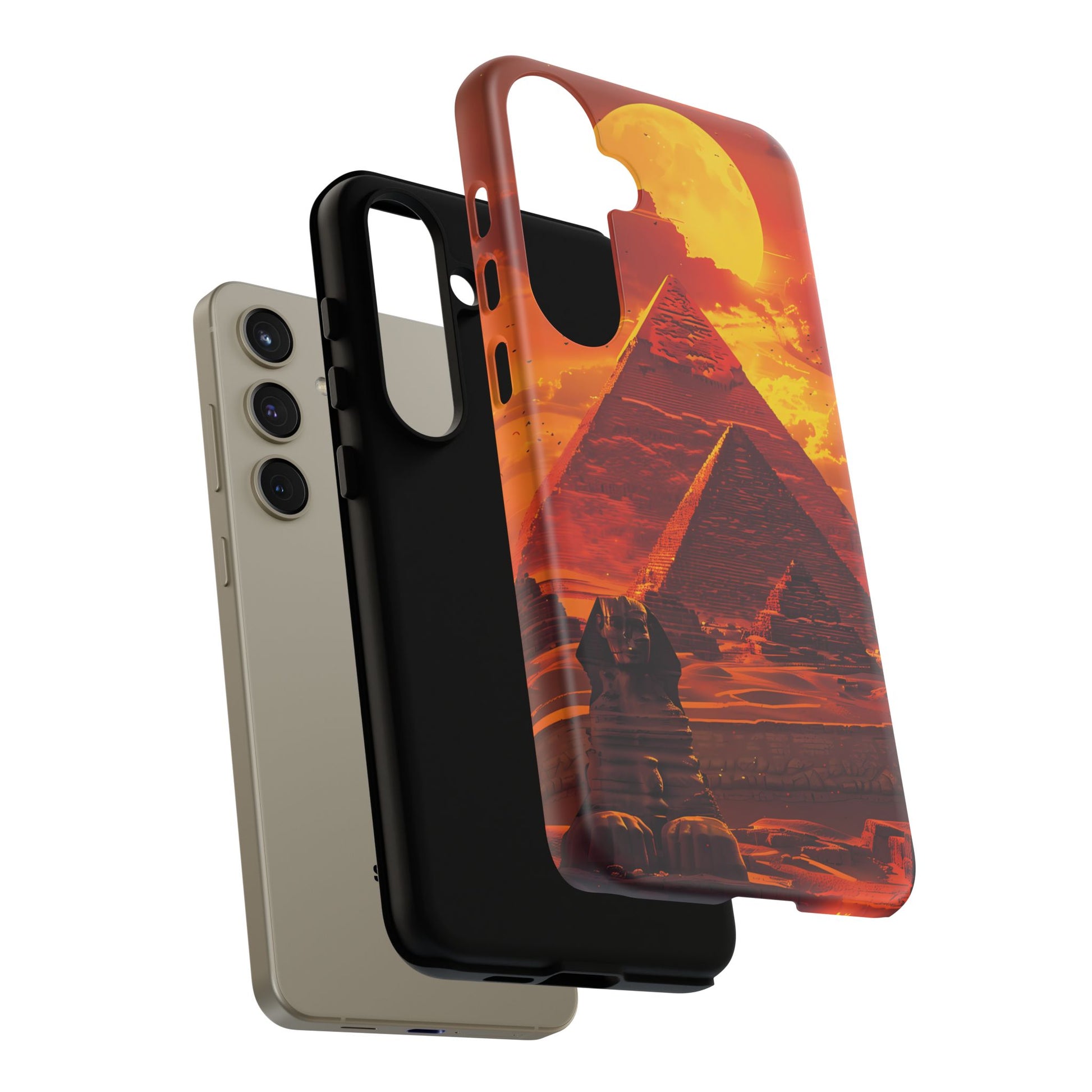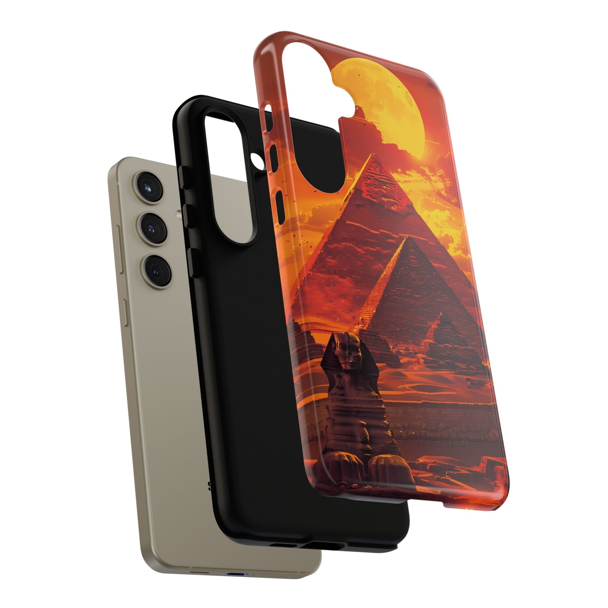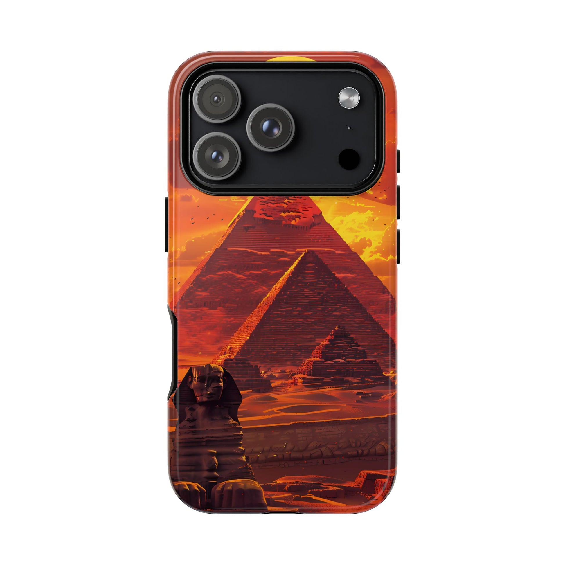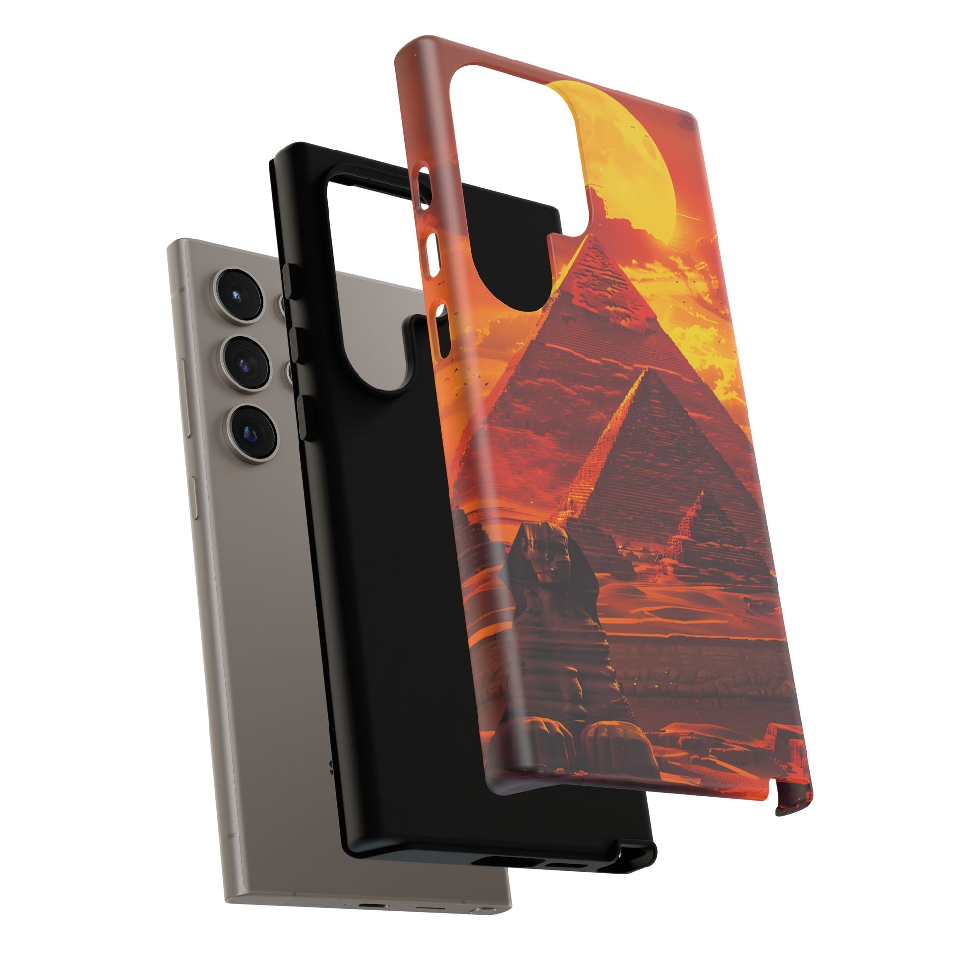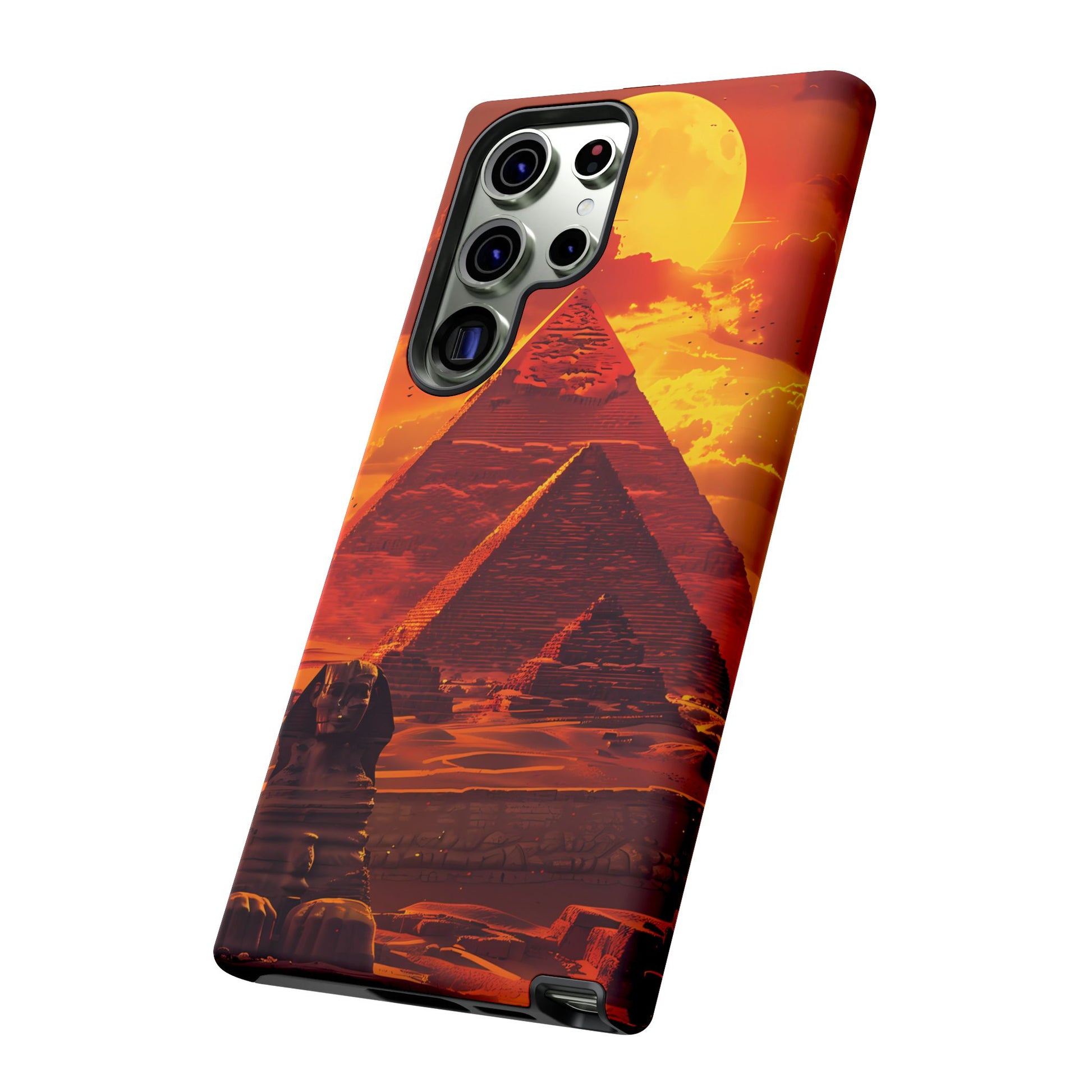 Experience the breathtaking beauty of Egypt’s most famous landmarks with the Pharaoh's Twilight cell phone cover. This illustration showcases the Pyramids of Giza bathed in the warm glow of sunset, with the Sphinx adding to the timeless appeal of this ancient scene.