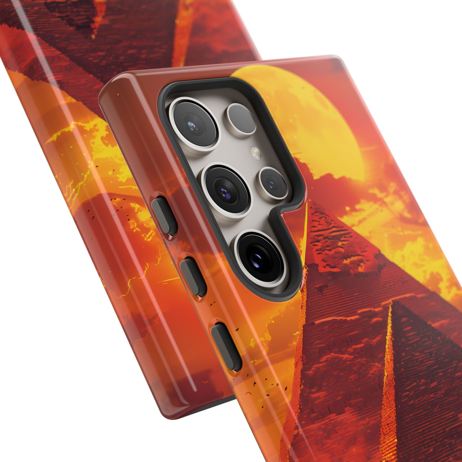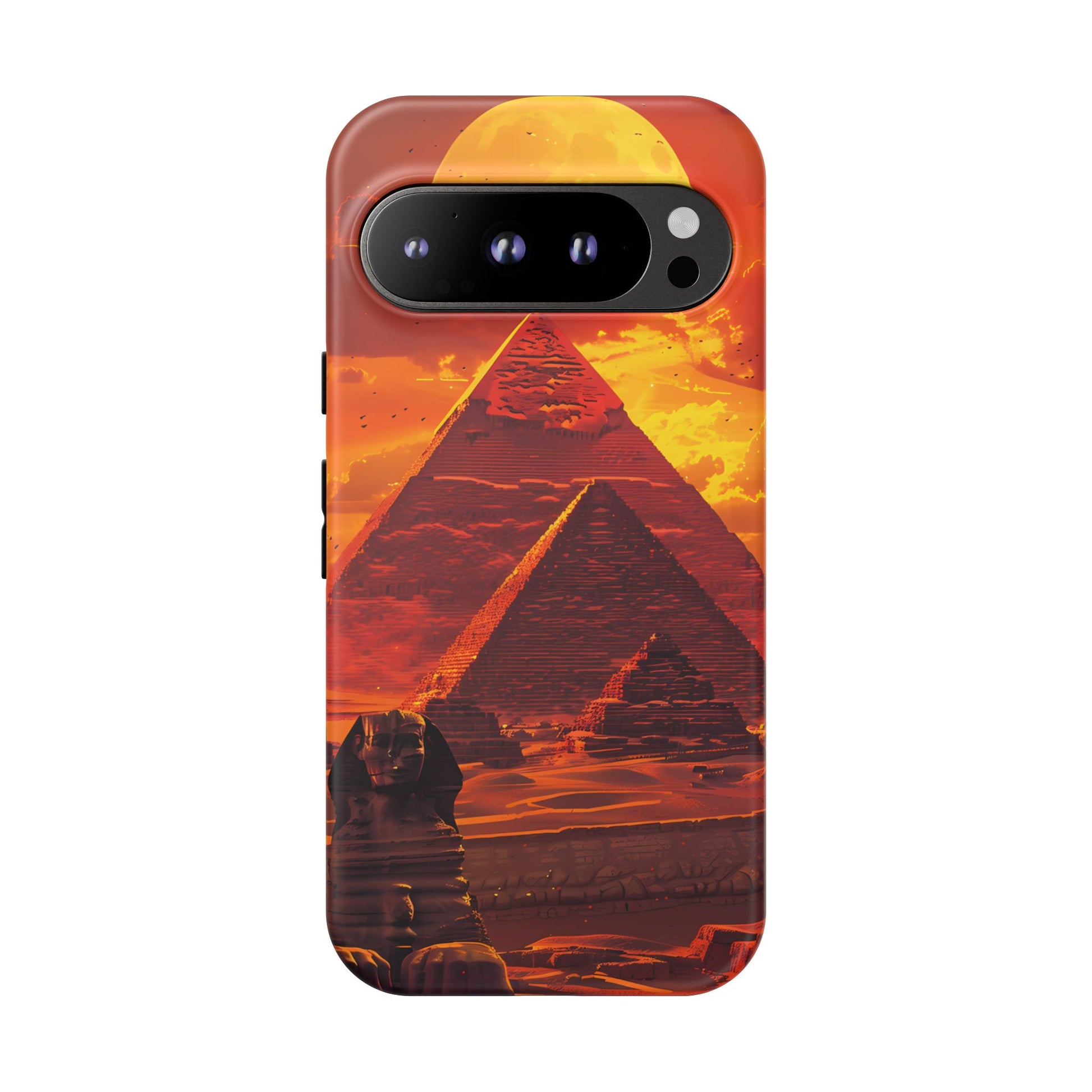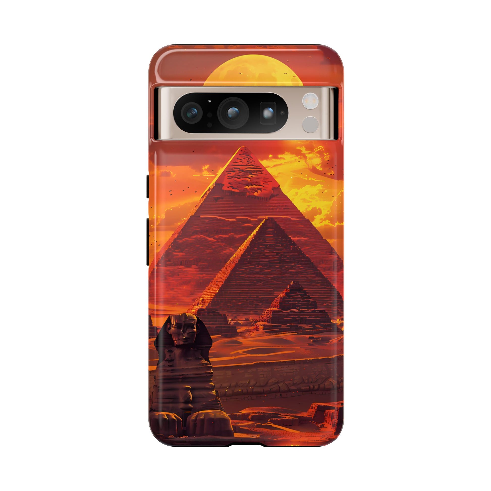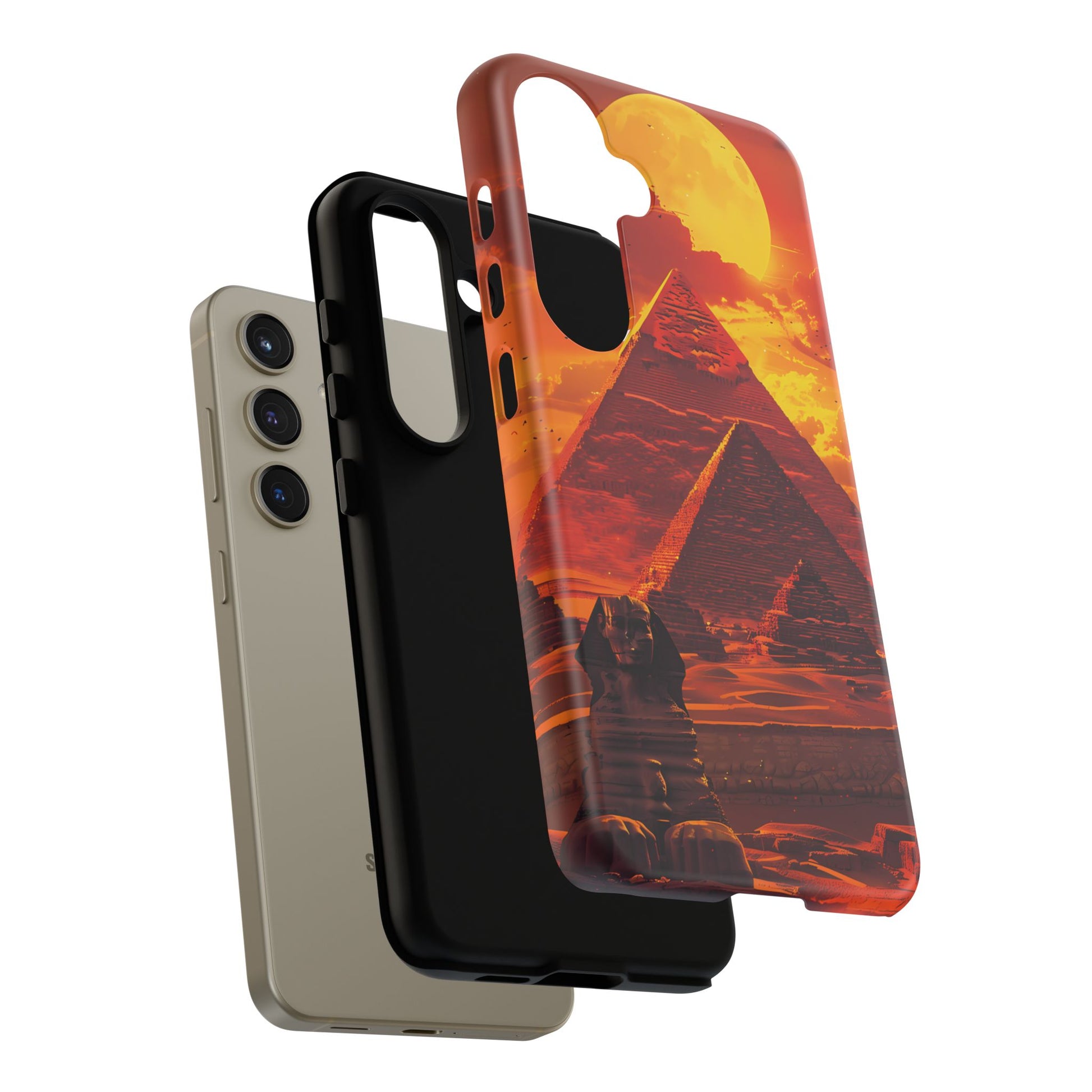 Experience the breathtaking beauty of Egypt’s most famous landmarks with the Pharaoh's Twilight cell phone cover. This illustration showcases the Pyramids of Giza bathed in the warm glow of sunset, with the Sphinx adding to the timeless appeal of this ancient scene.